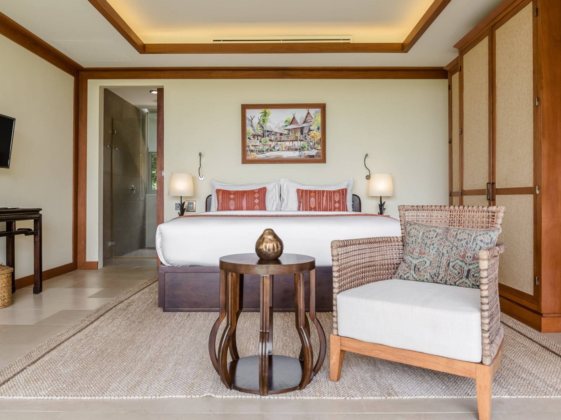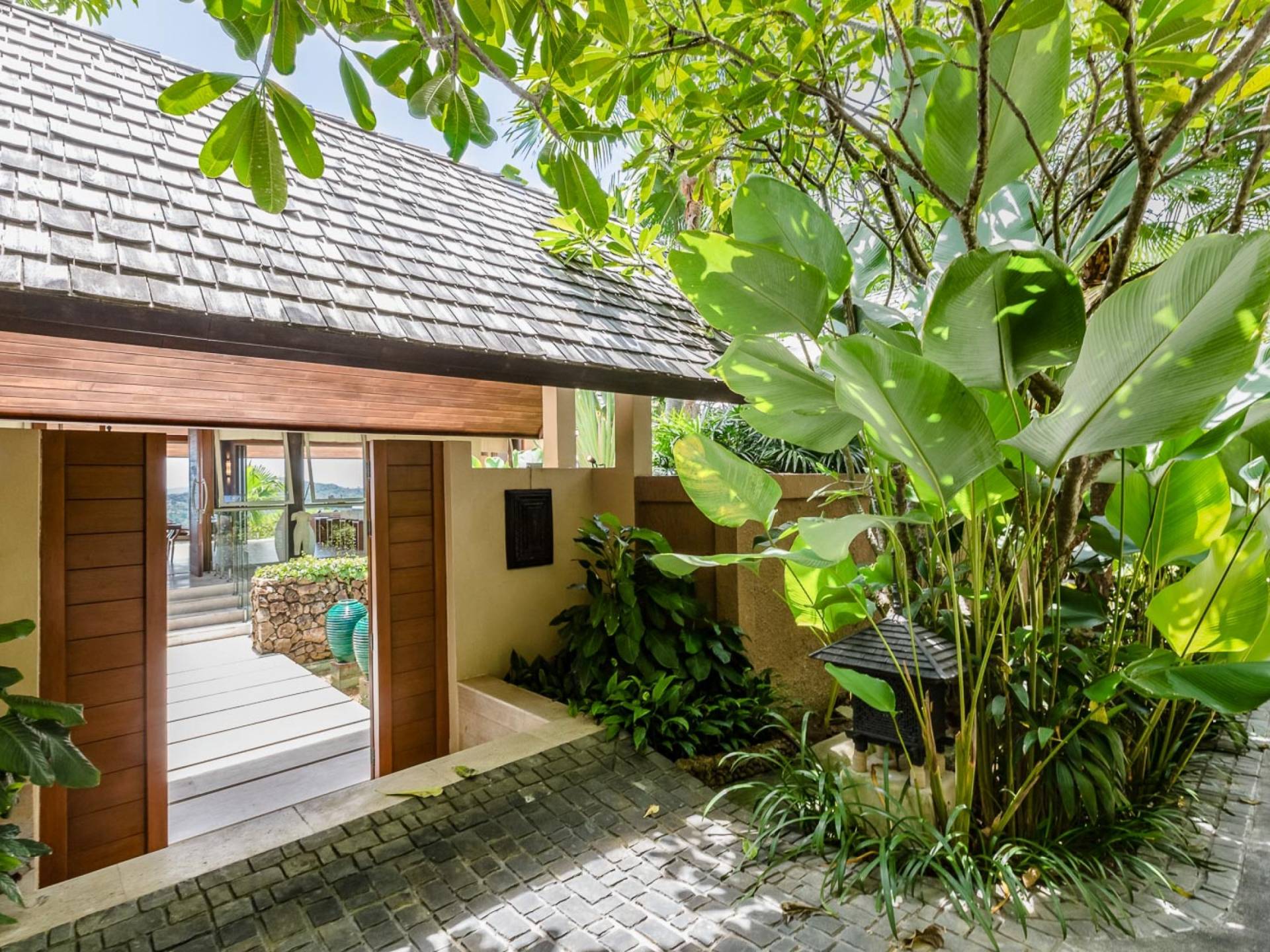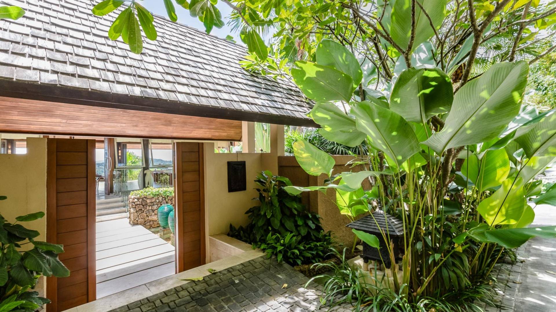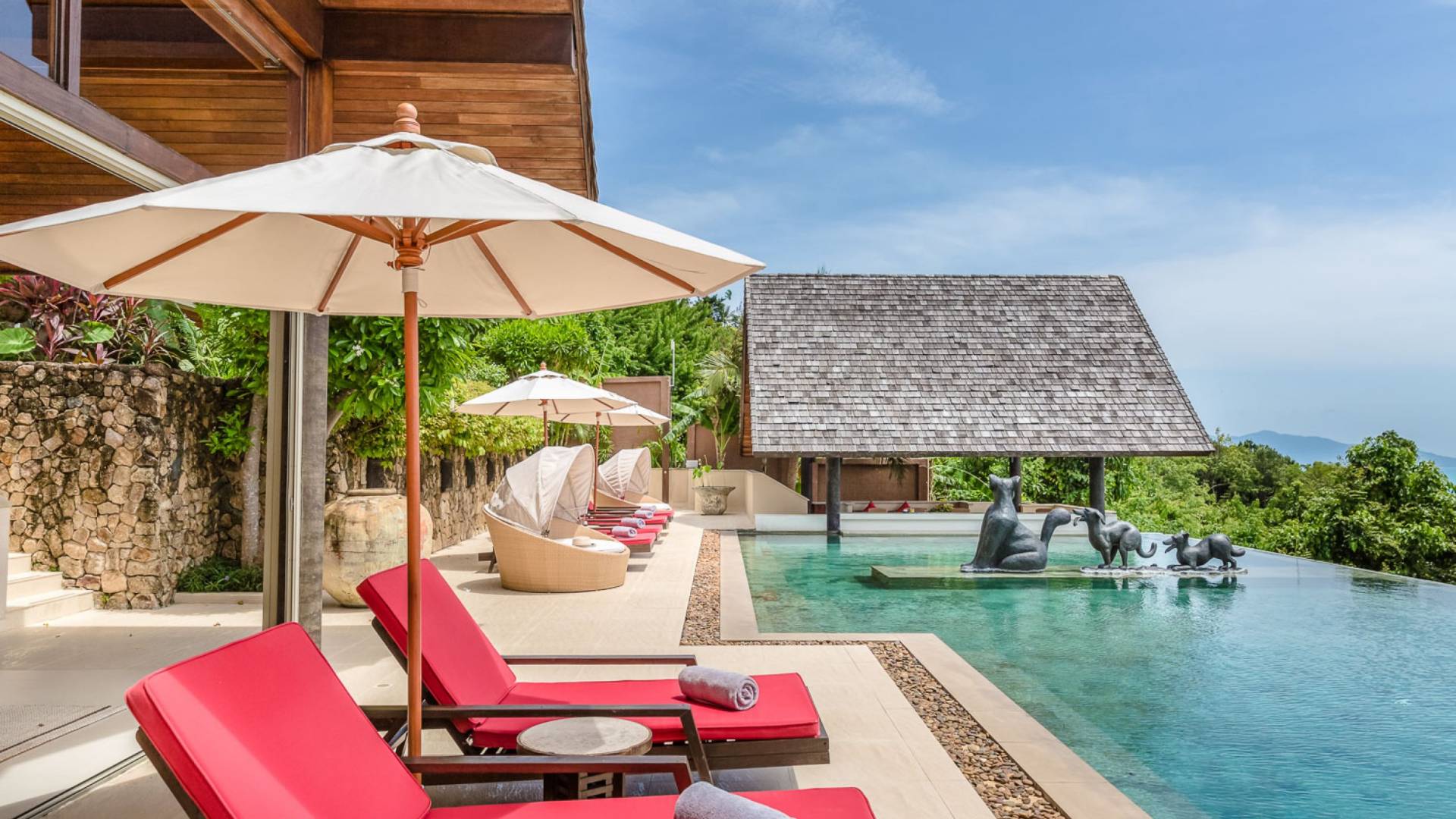 Große Holztüren öffnen sich in einen erstaunlich erhöhten Wohnbereich. Dieser weitläufige Raum erstreckt sich praktisch über die gesamte Breite des Anwesens und verfügt über eine sehr hohe, holzverkleidete Gewölbedecke mit Fenstern auf beiden Seiten, die das Raumgefühl erhöhen und die Gesamterhabenheit eines bereits beeindruckenden Raumes noch verstärken. Den Türen gegenüber ist eine Wand aus zweifach klappbaren Glastüren, die dafür sorgen, dass der Panoramablick über die bewaldeten Täler, die Bucht von Bophut und die Insel Koh Phangan immer sichtbar ist und Ihre Aufmerksamkeit auf sich zieht.
