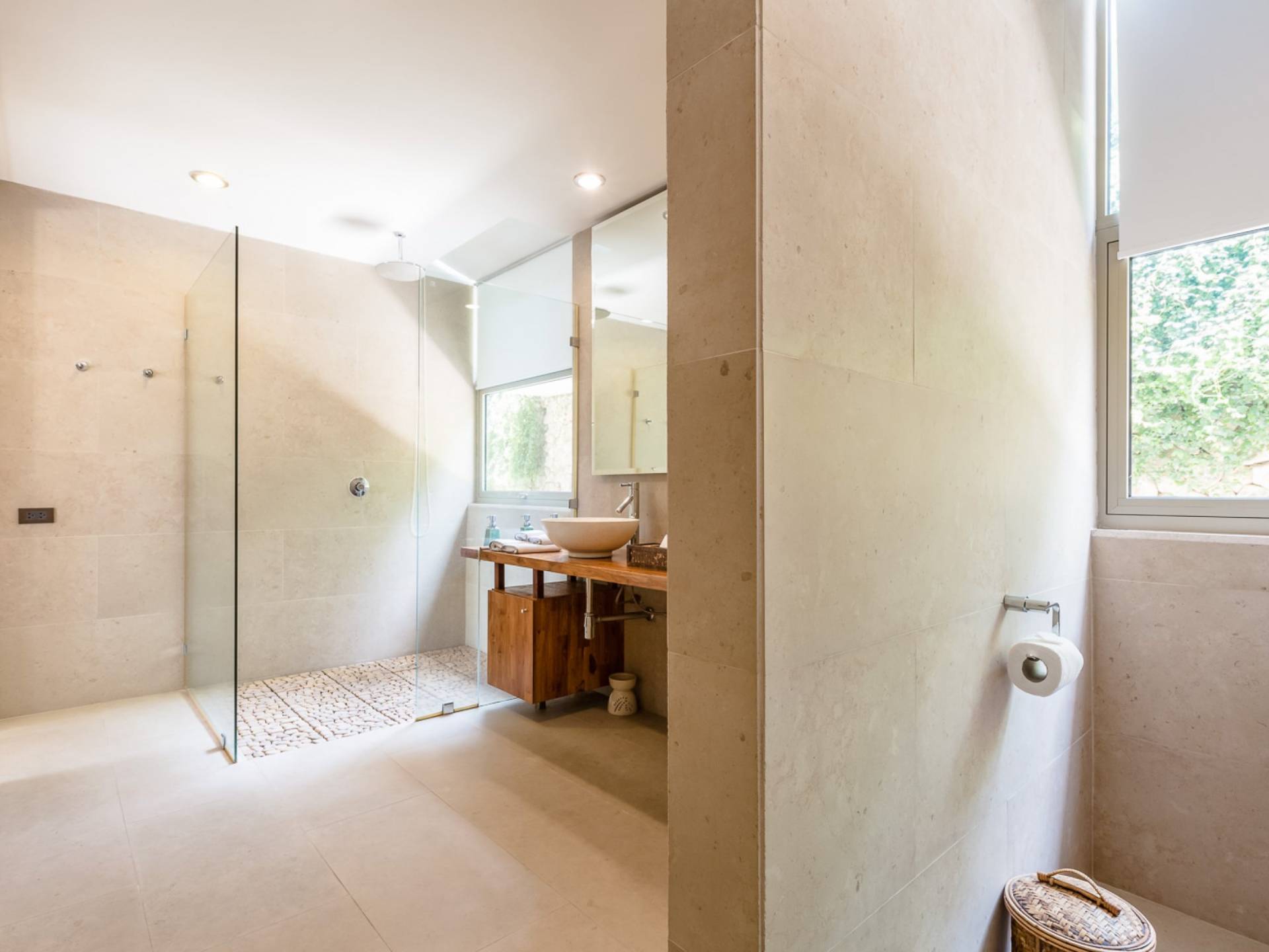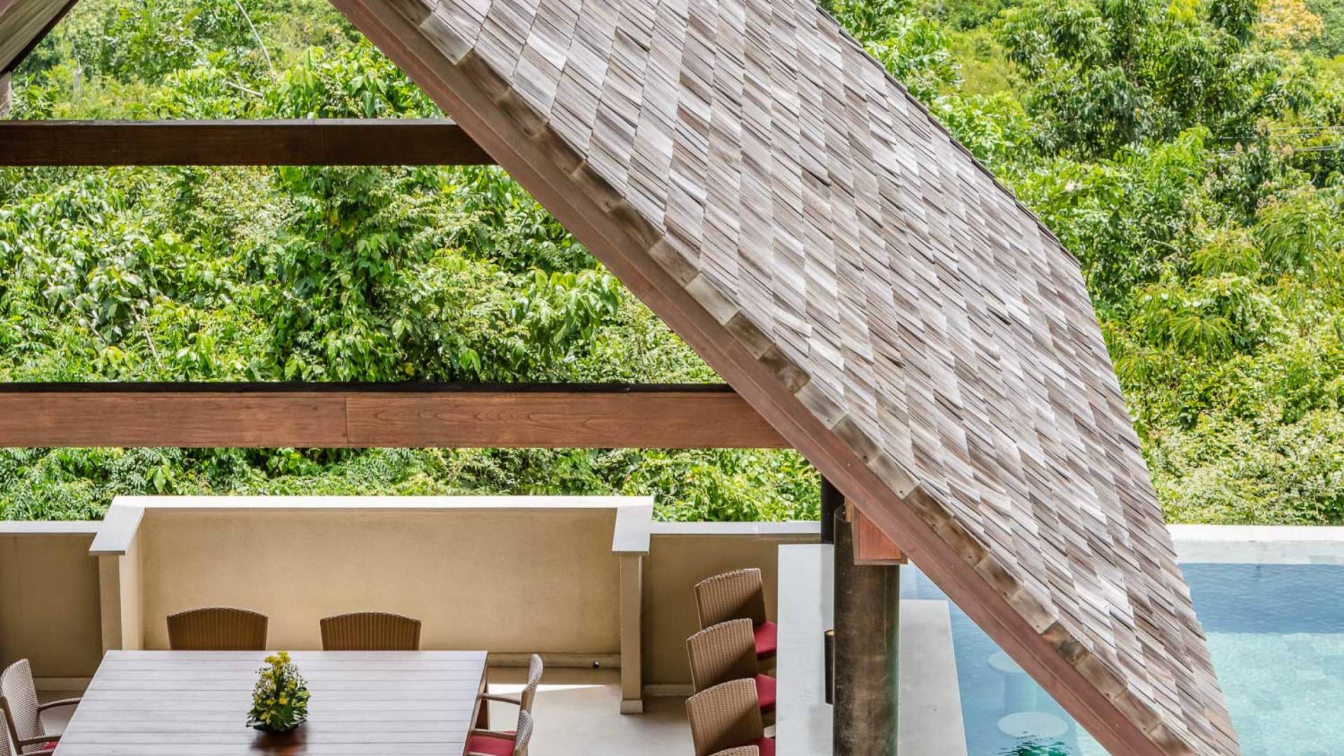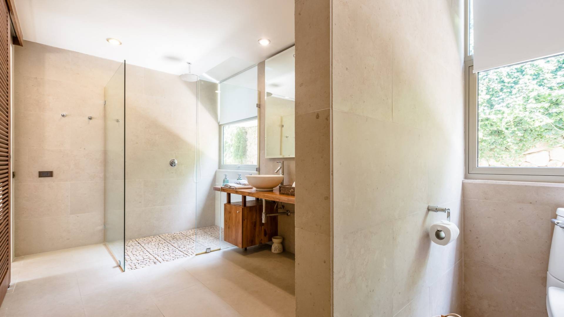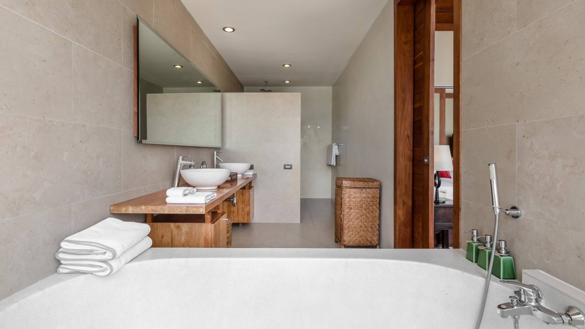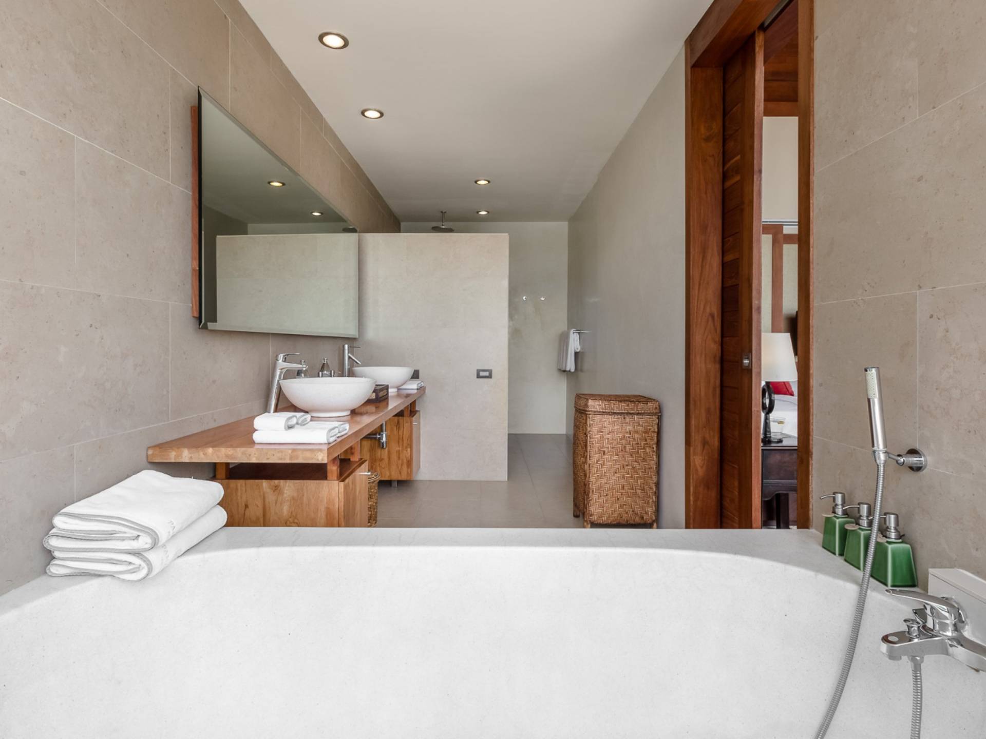 Rechts vom Pool befindet sich die Master Suite. Der Aufenthalt hier wird zu einem unvergesslichen Erlebnis. Eine gewölbte Holzdecke mit Glas vorne und hinten schafft eine luftig-leichte Atmosphäre. Türen öffnen sich direkt auf die Poolterrasse und genießen die spektakuläre Aussicht. Es gibt einen separaten Ankleidebereich und ein eigenes Bad mit zwei Waschbecken, einer Regendusche und einer luxuriösen Terrazzo-Badewanne mit Fenstern mit direktem Blick auf den Pool und das Meer.