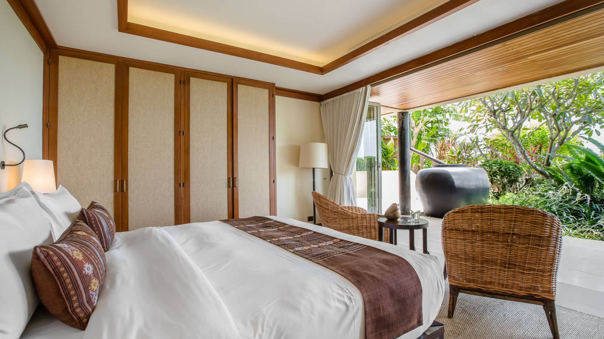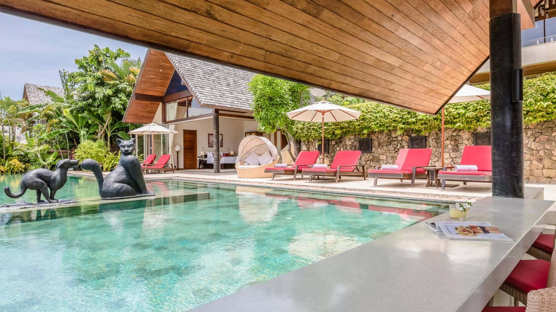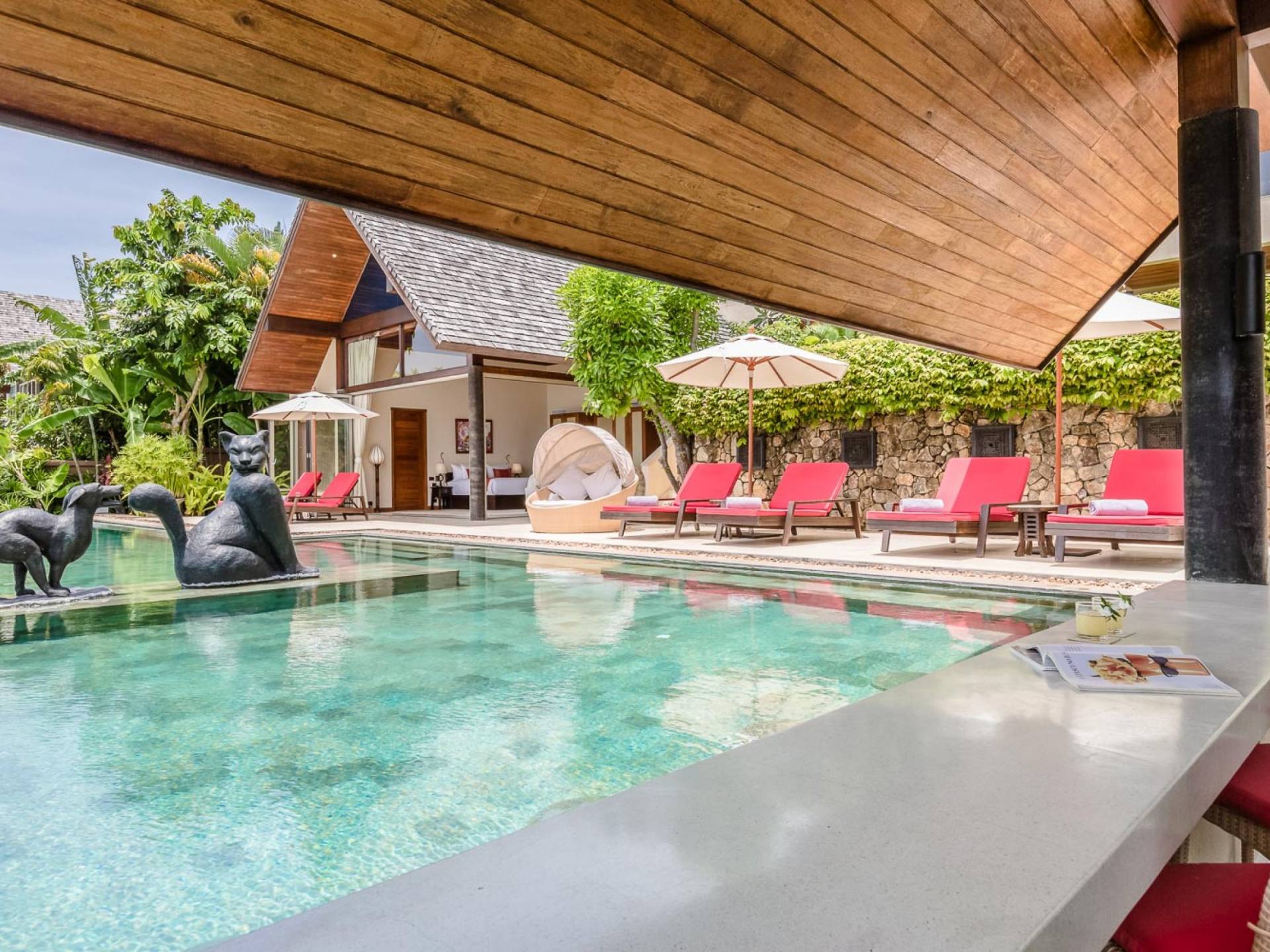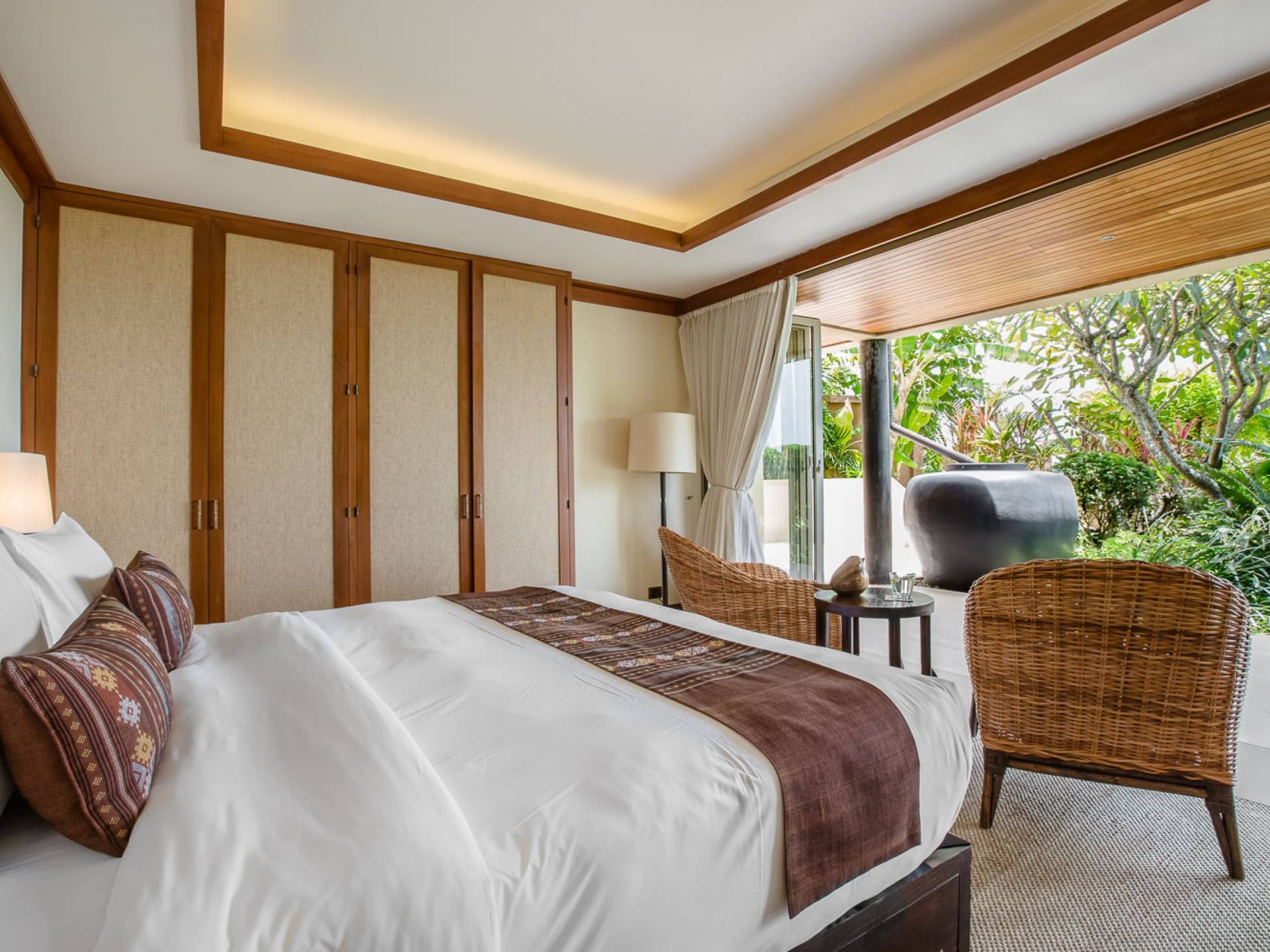Jedes dieser drei Schlafzimmer verfügt über Einbauschränke und ein hinteres en-suite Duschbad mit Blick auf das Wasserspiel und die komplizierte und schöne Natursteinmauer, die hinter dem Grundstück und bis zur darüber liegenden Ebene verläuft. Alle Zimmer verfügen über Kingsize-Doppelbetten, was dies zu einer idealen Familien- oder Gruppenvilla macht. Vor diesem Schlafzimmer befindet sich ein Rasen und ein Garten, der mit einer großen Anzahl tropischer Bäume und Pflanzen gut bepflanzt ist. Ganz vorne auf dem Grundstück befindet sich der große blau geflieste Pool. Auf der linken Seite des Pools befinden sich unter Wasser versenkte Hocker am Rand der Bar, die in eine Sala integriert ist, die auch einen Esstisch und Sitzbänke beherbergt.