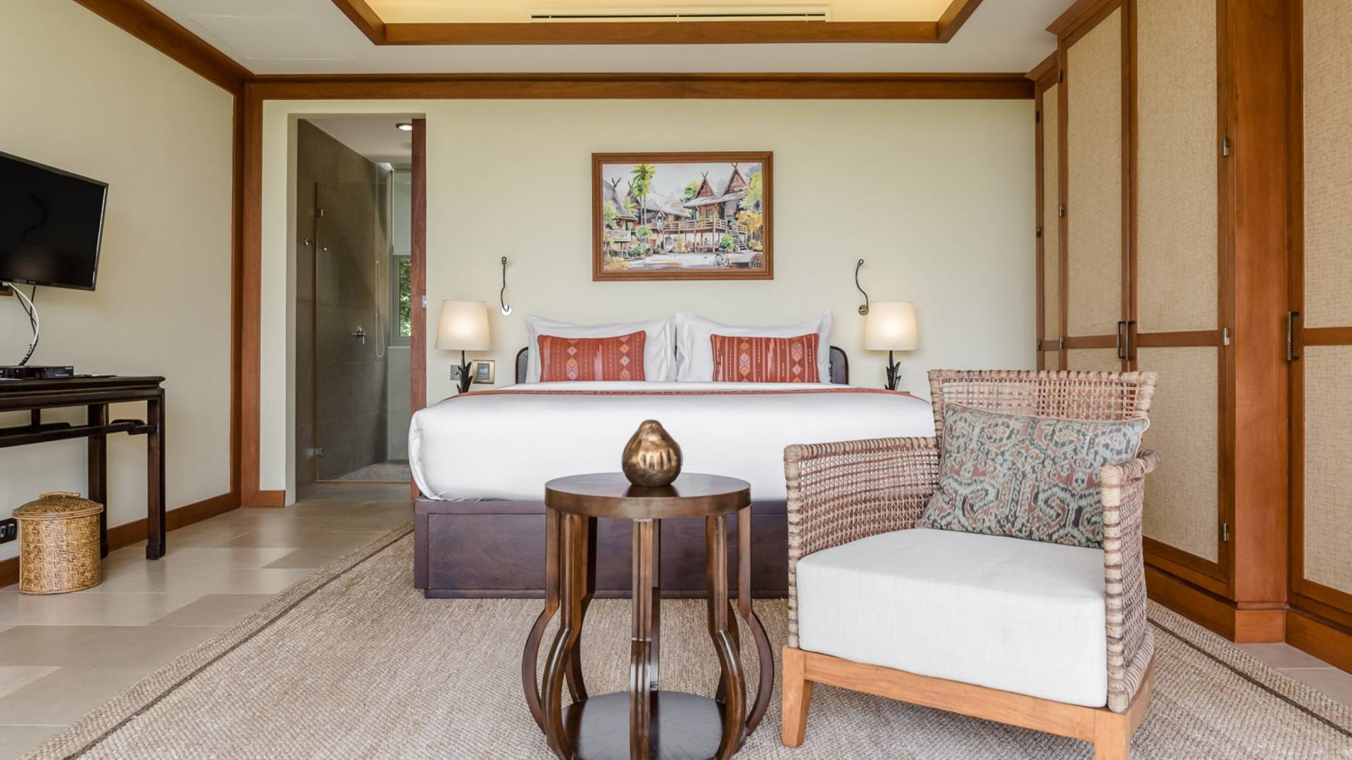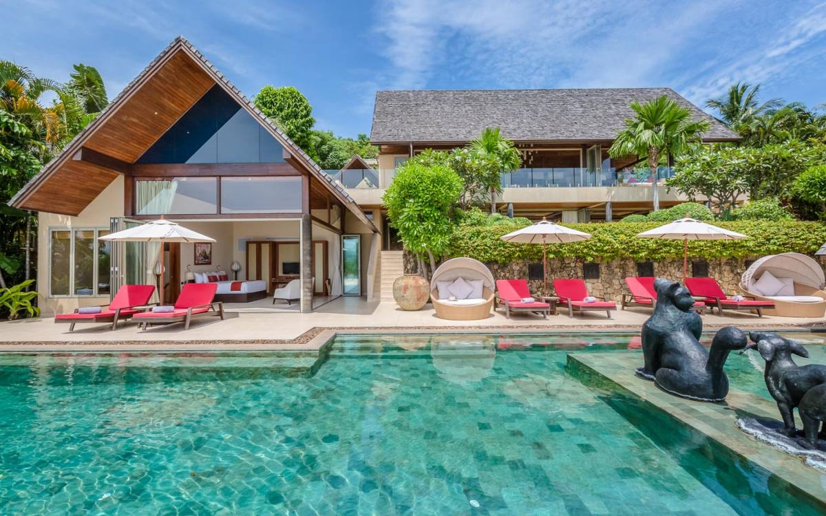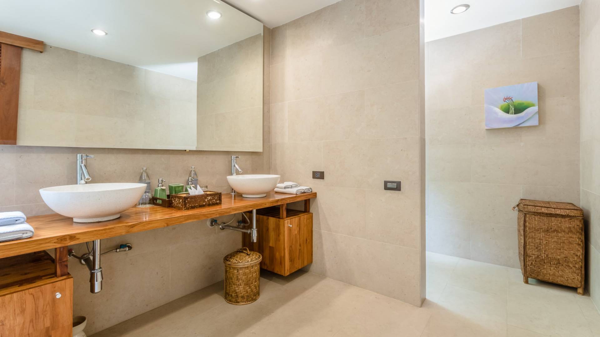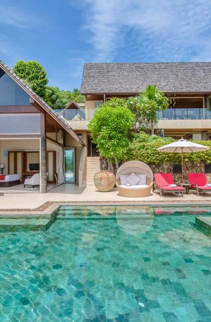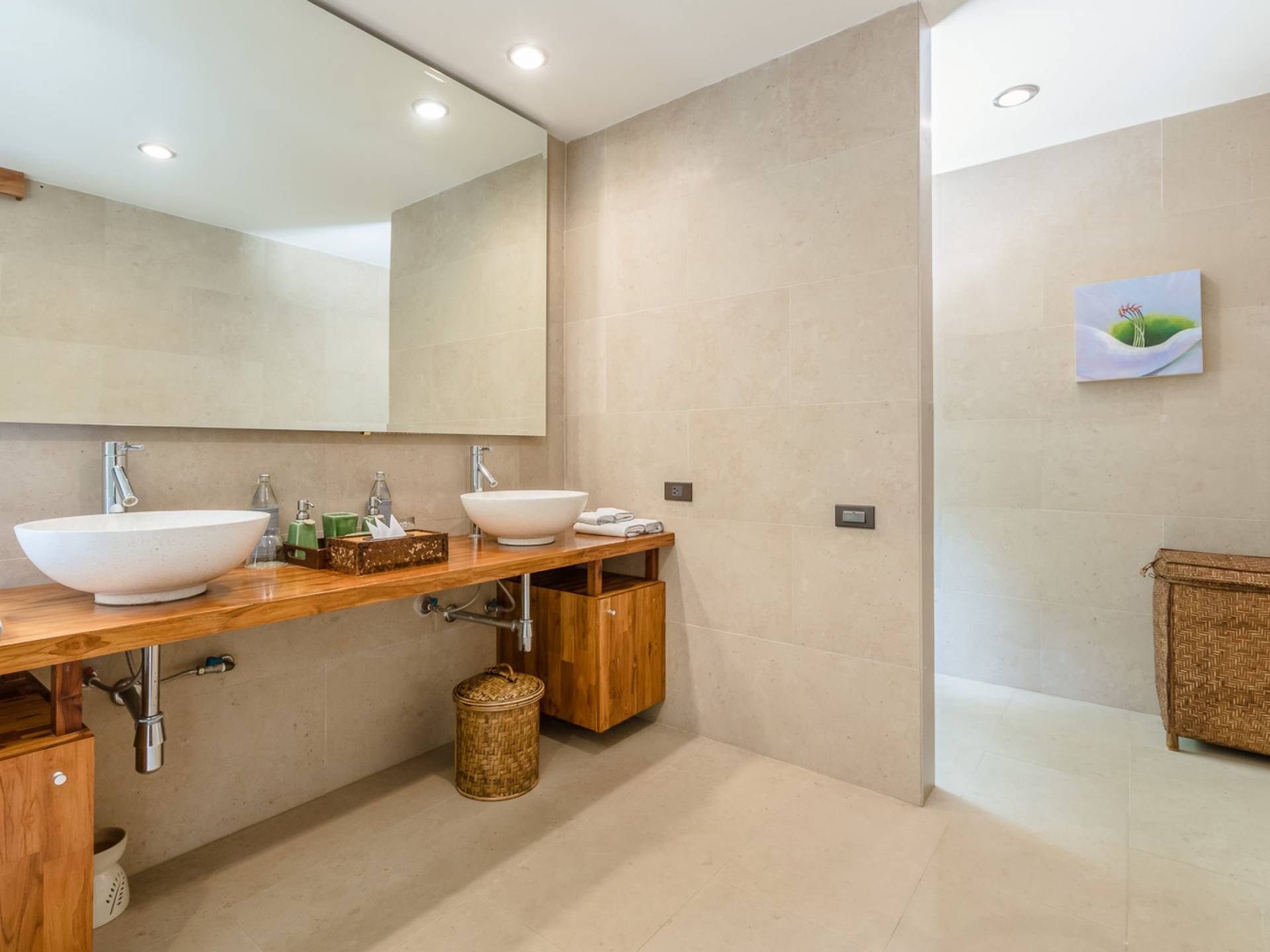 Jedes dieser drei Schlafzimmer verfügt über Einbauschränke und ein hinteres en-suite Duschbad mit Blick auf das Wasserspiel und die komplizierte und schöne Natursteinmauer, die hinter dem Grundstück und bis zur darüber liegenden Ebene verläuft. Alle Zimmer verfügen über Kingsize-Doppelbetten, was dies zu einer idealen Familien- oder Gruppenvilla macht. Vor diesem Schlafzimmer befindet sich ein Rasen und ein Garten, der mit einer großen Anzahl tropischer Bäume und Pflanzen gut bepflanzt ist. Ganz vorne auf dem Grundstück befindet sich der große blau geflieste Pool. Auf der linken Seite des Pools befinden sich unter Wasser versenkte Hocker am Rand der Bar, die in eine Sala integriert ist, die auch einen Esstisch und Sitzbänke beherbergt.
