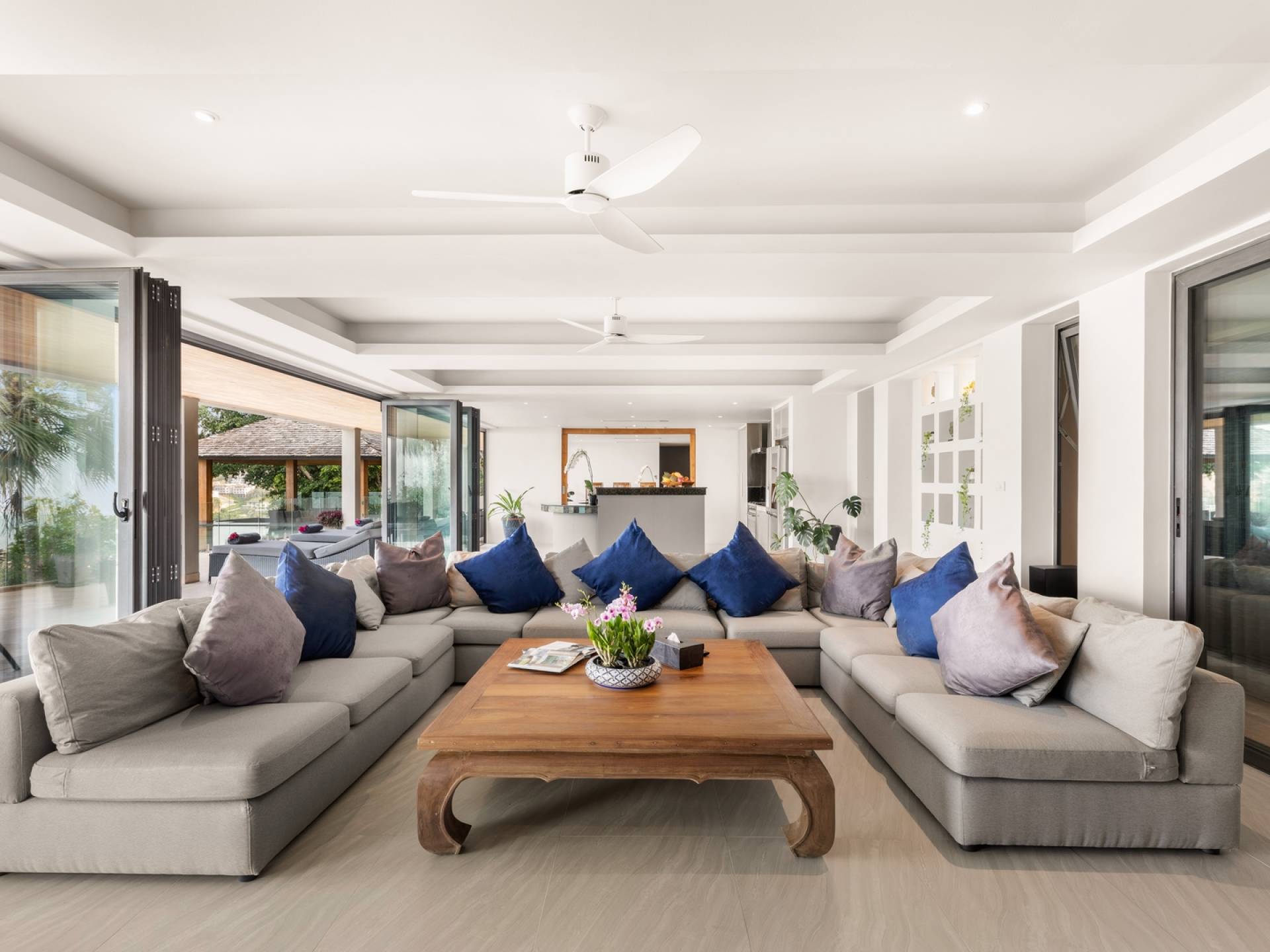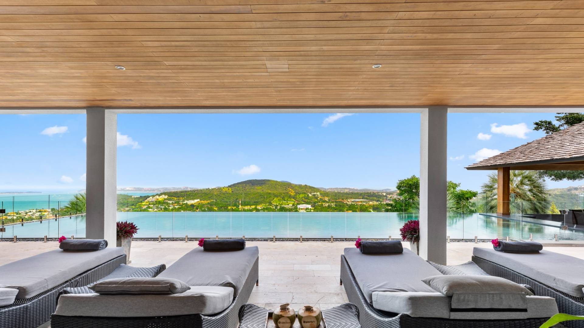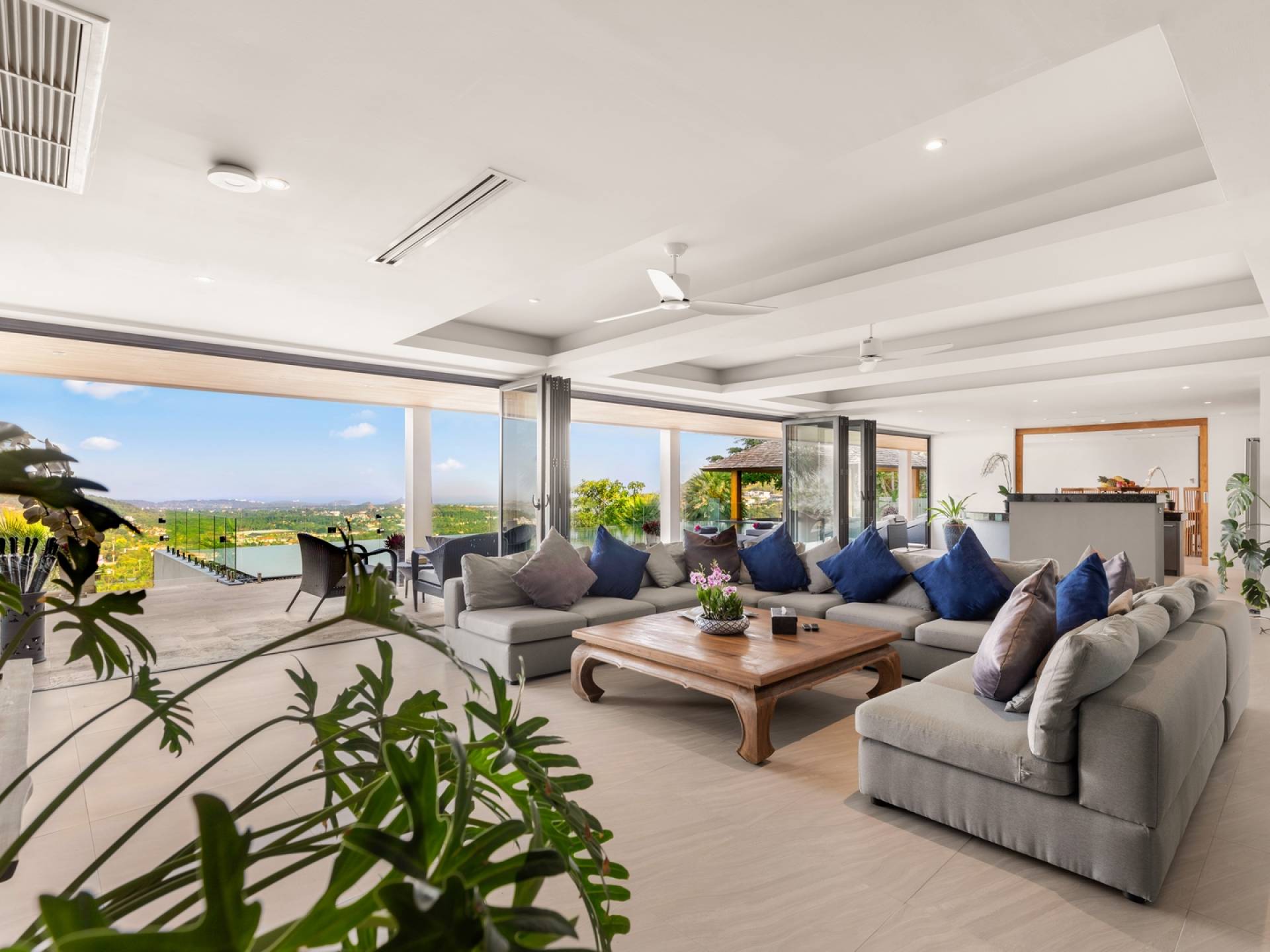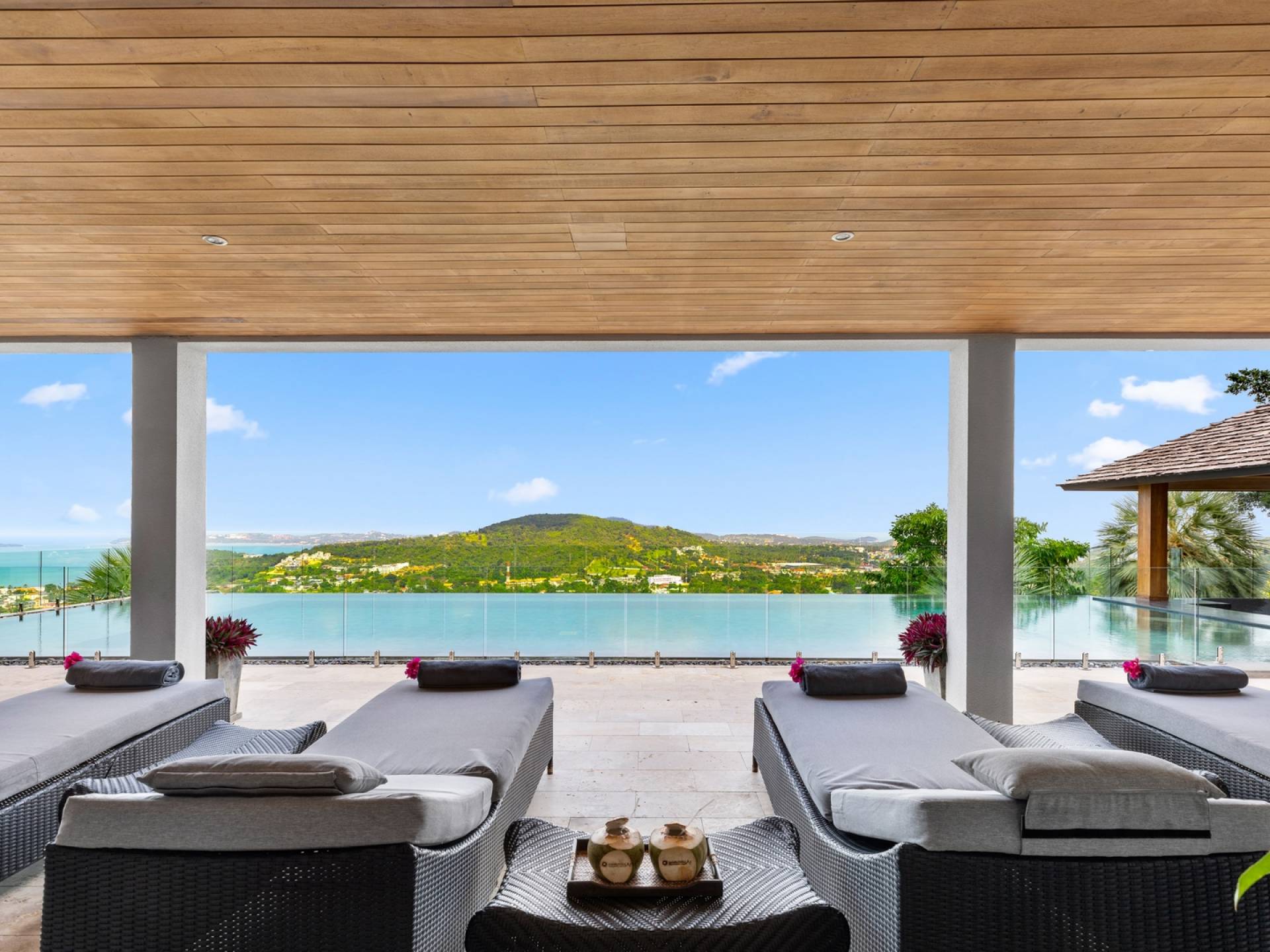 Villa Grand View Samui wurde von einem preisgekrönten Architekten aus Hongkong entworfen, um den idealen offenen Lebensstil zu schaffen und gleichzeitig ein hohes Maß an Privatsphäre zu wahren. Auf dem Bophut Hill gelegen und vom öffentlichen Zugang abgeschottet, haben die Gäste die Möglichkeit, sich zu entspannen und ungestört zu entspannen, weit weg von der Hektik der belebten Straßen. Eine atemberaubende Vielfalt an tropischem Gartenleben kann in der gesamten Villa gedeihen, die von Wasserfällen und einem Kaktusgarten ergänzt wird.