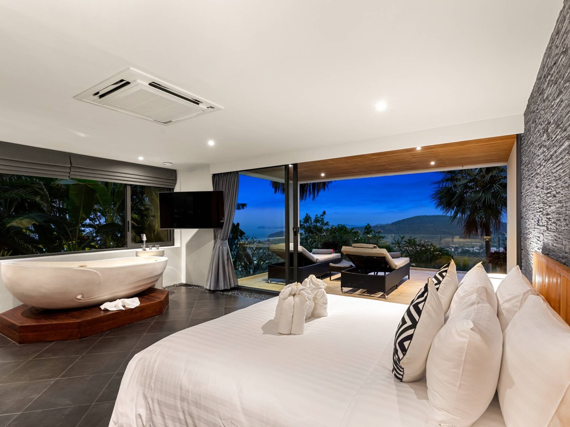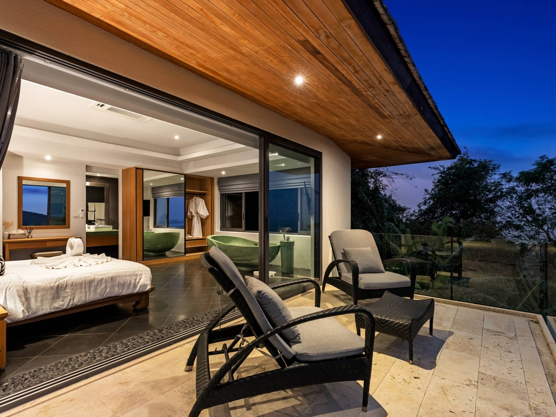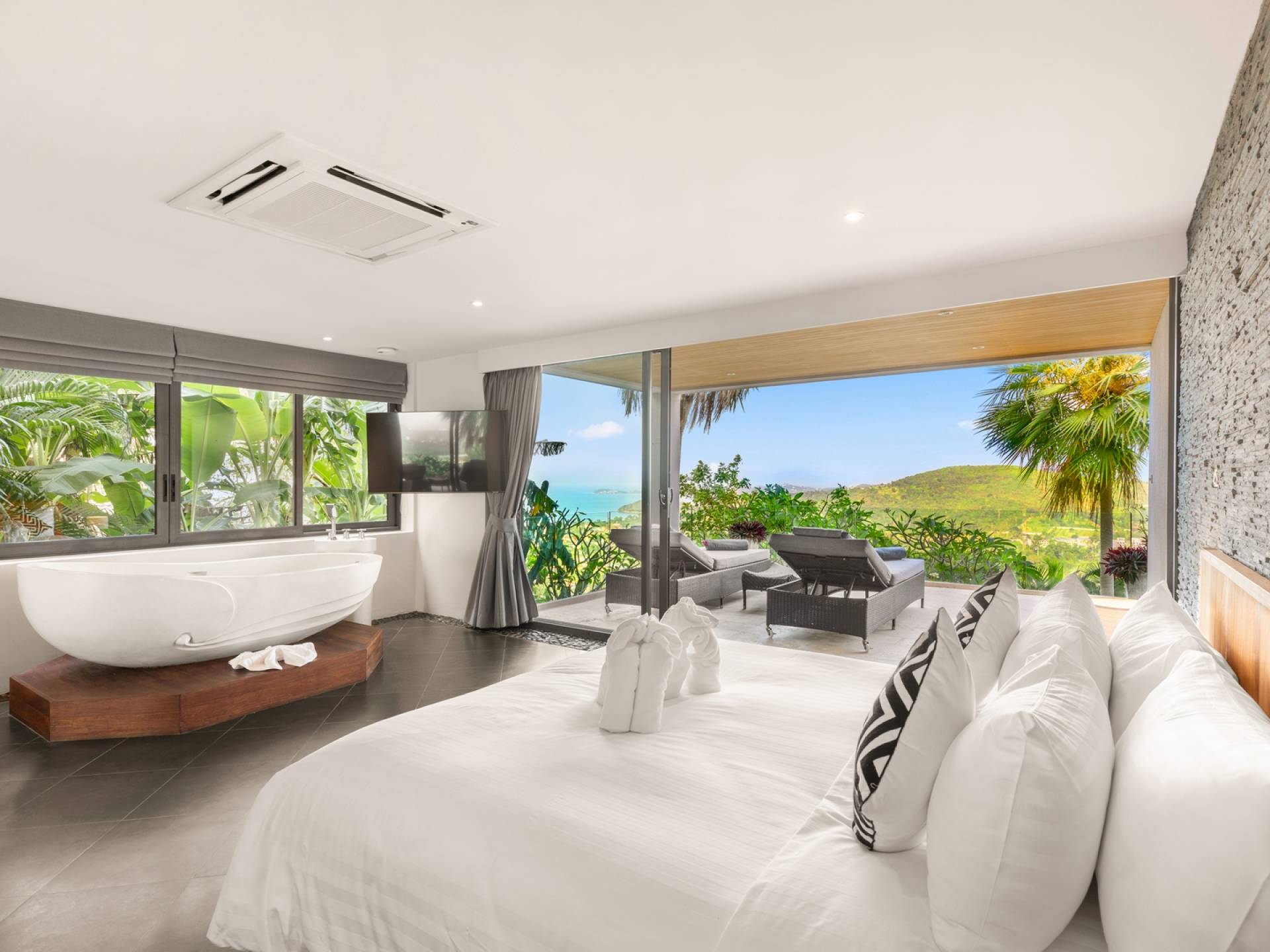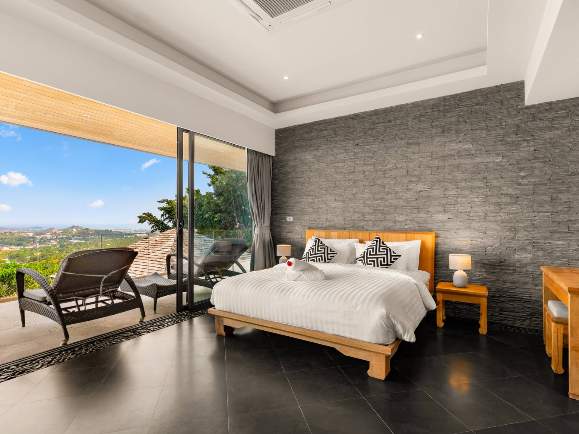 Alle 5 Schlafzimmer sind mit luxuriösen Kingsize-Betten, Klimaanlage, Safe, Mini-Kühlschrank ausgestattet und mit schicken thailändischen Ornamenten und Kunstwerken ausgestattet. Alle atemberaubenden En-Suiten verfügen über frei fließende Regenduschen und Terrazzo-Badewannen sowie Armaturen aus poliertem Edelstahl.
