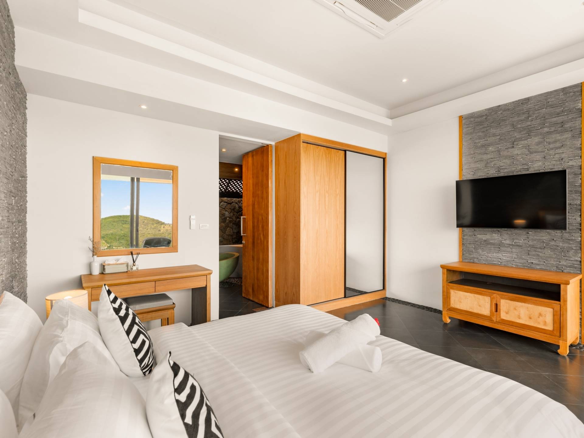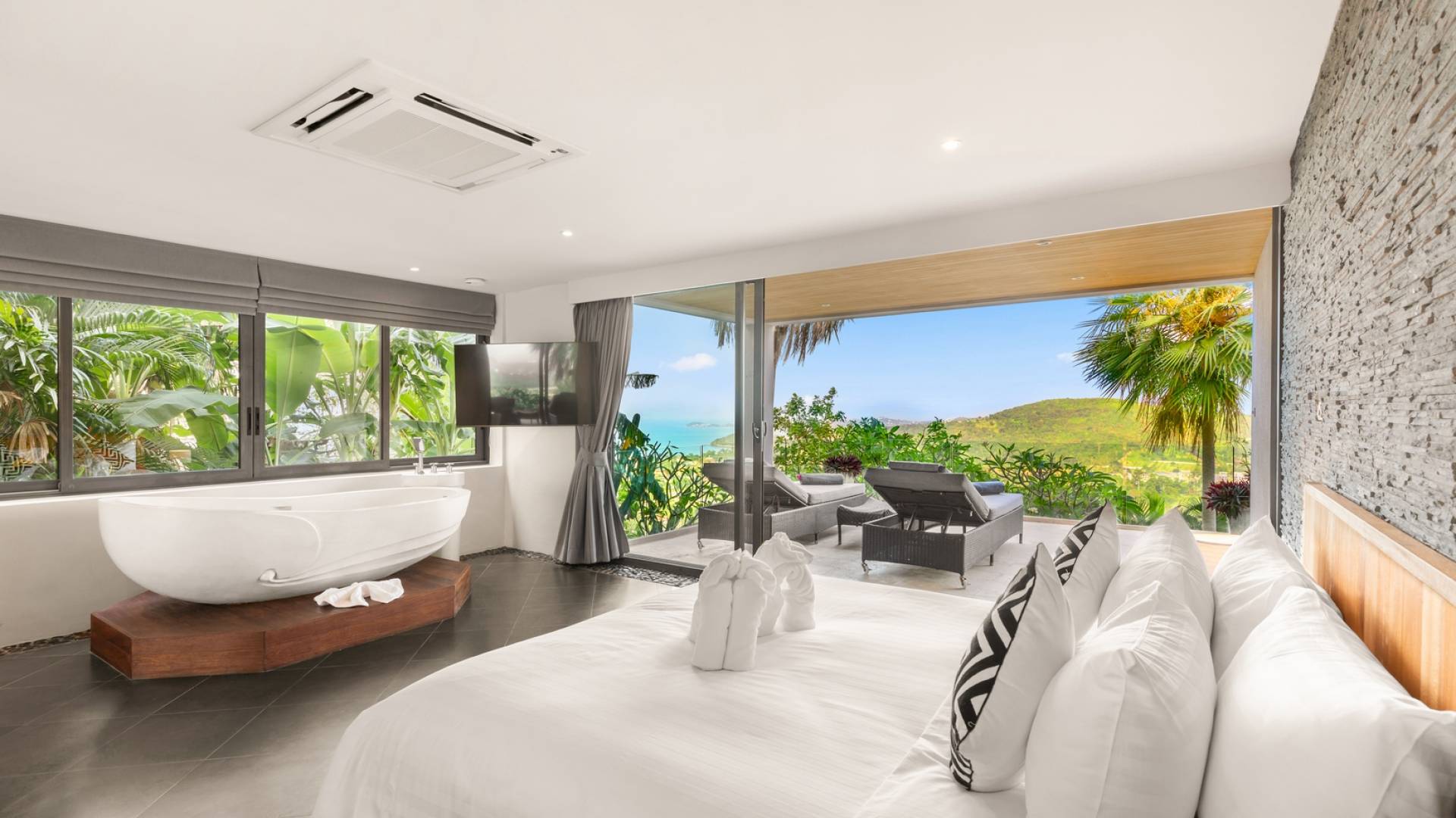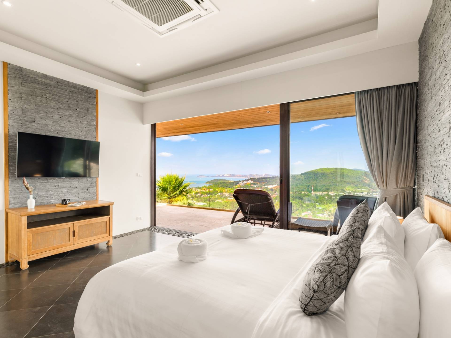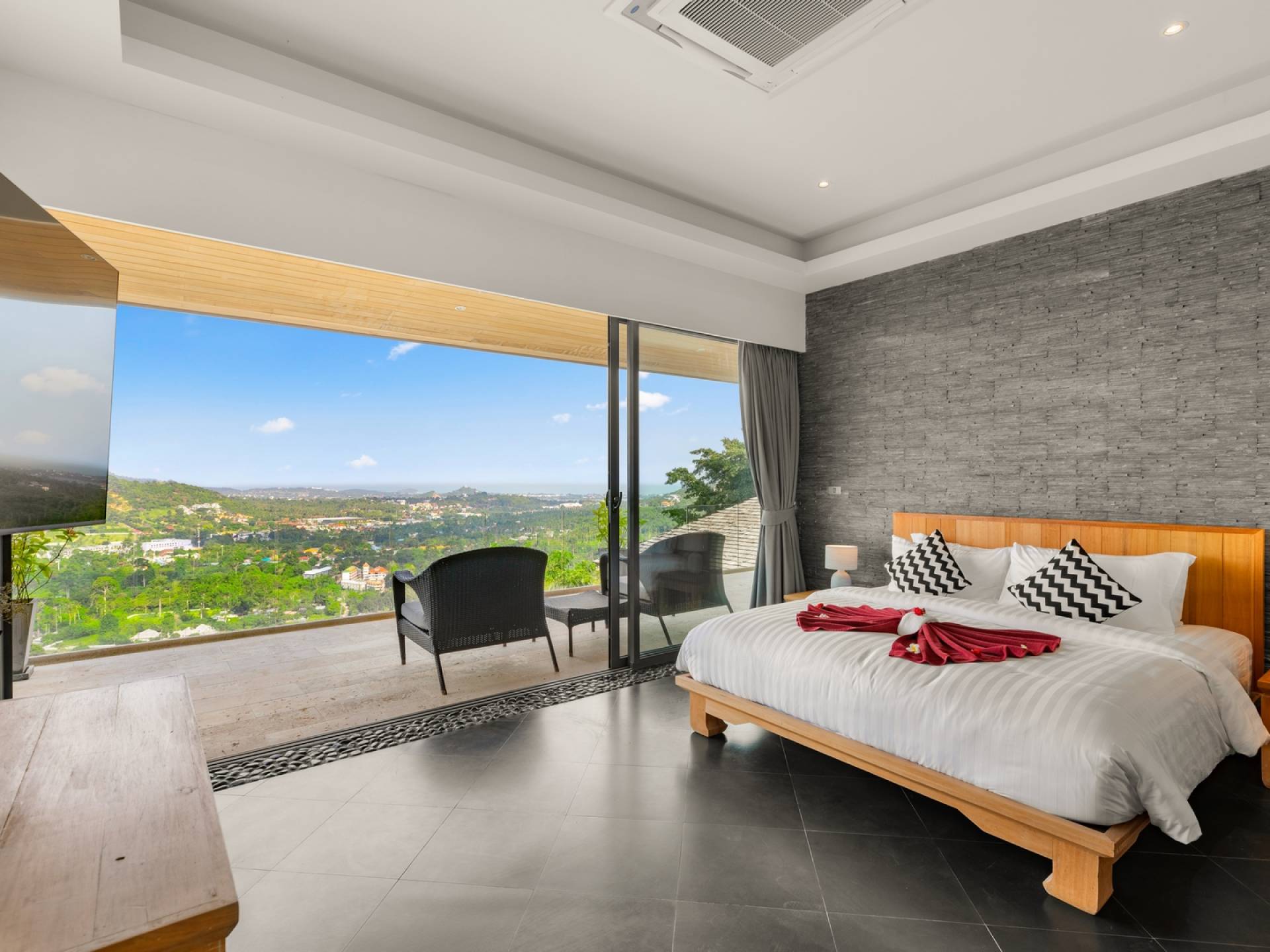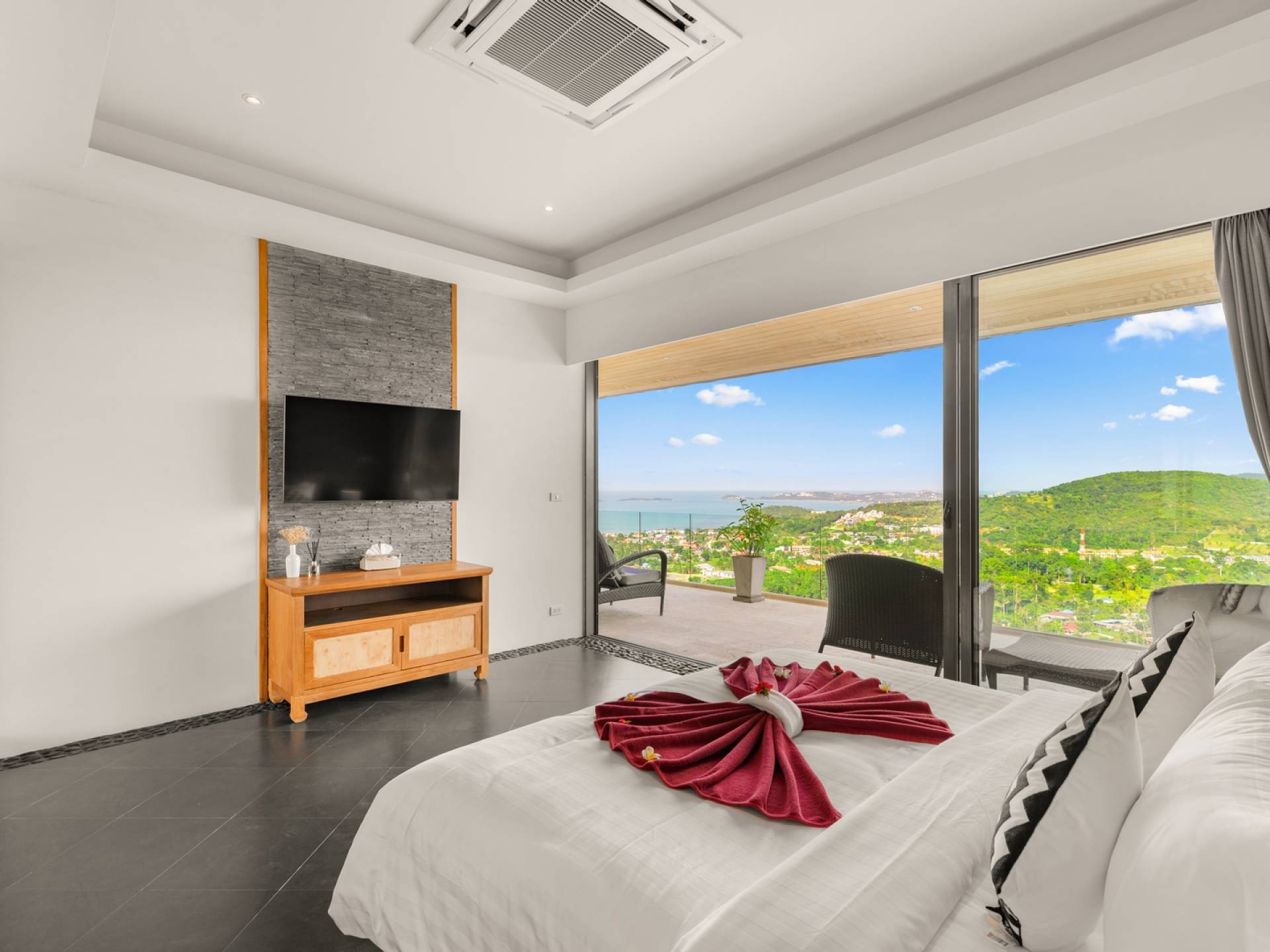 Alle 5 Schlafzimmer sind mit luxuriösen Kingsize-Betten, Klimaanlage, Safe, Mini-Kühlschrank ausgestattet und mit schicken thailändischen Ornamenten und Kunstwerken ausgestattet. Alle atemberaubenden En-Suiten verfügen über frei fließende Regenduschen und Terrazzo-Badewannen sowie Armaturen aus poliertem Edelstahl.