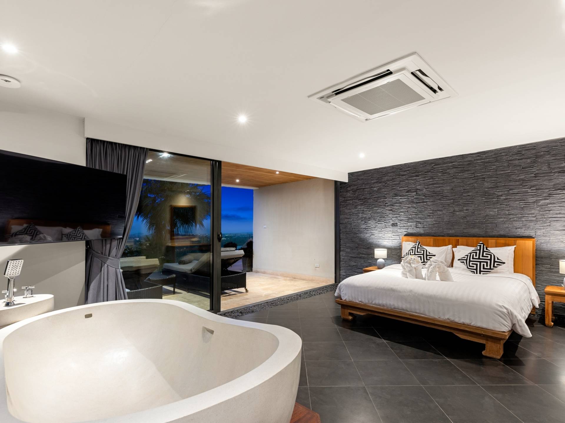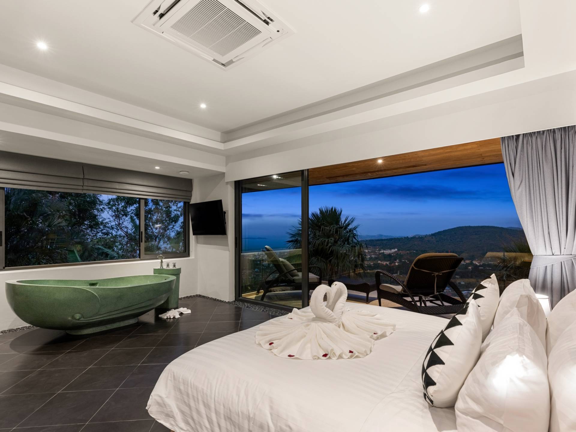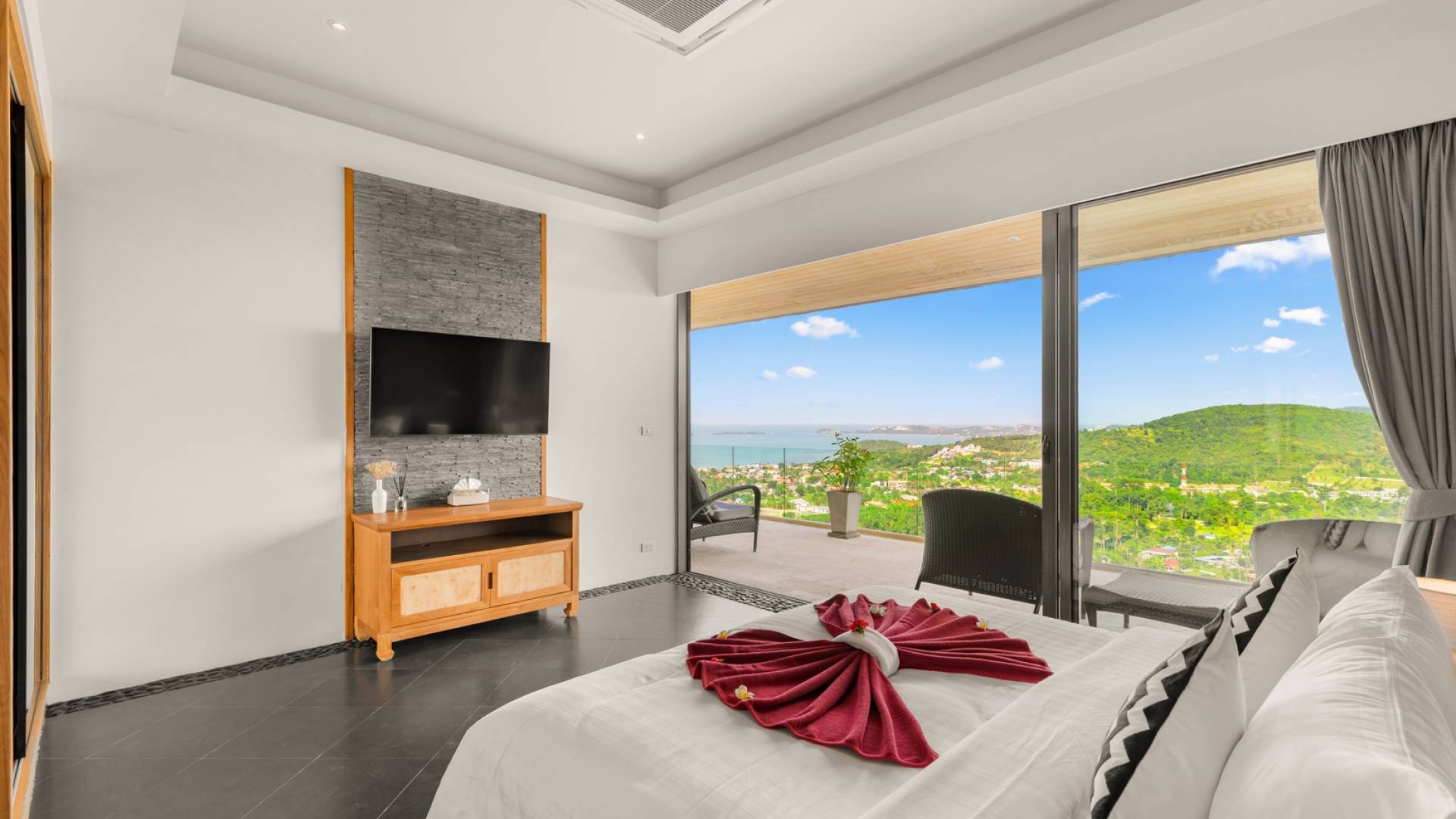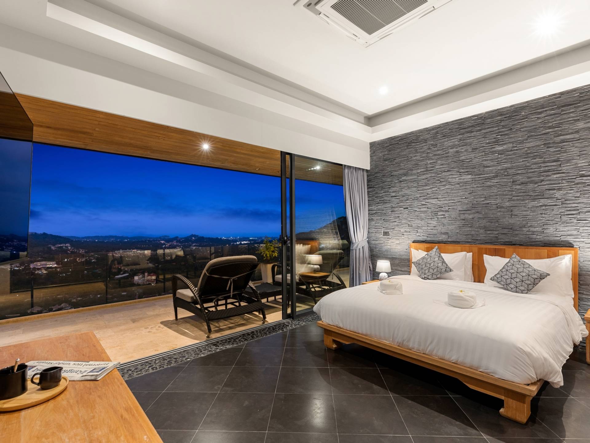 Alle 5 Schlafzimmer sind mit luxuriösen Kingsize-Betten, Klimaanlage, Safe, Mini-Kühlschrank ausgestattet und mit schicken thailändischen Ornamenten und Kunstwerken ausgestattet. Alle atemberaubenden En-Suiten verfügen über frei fließende Regenduschen und Terrazzo-Badewannen sowie Armaturen aus poliertem Edelstahl.