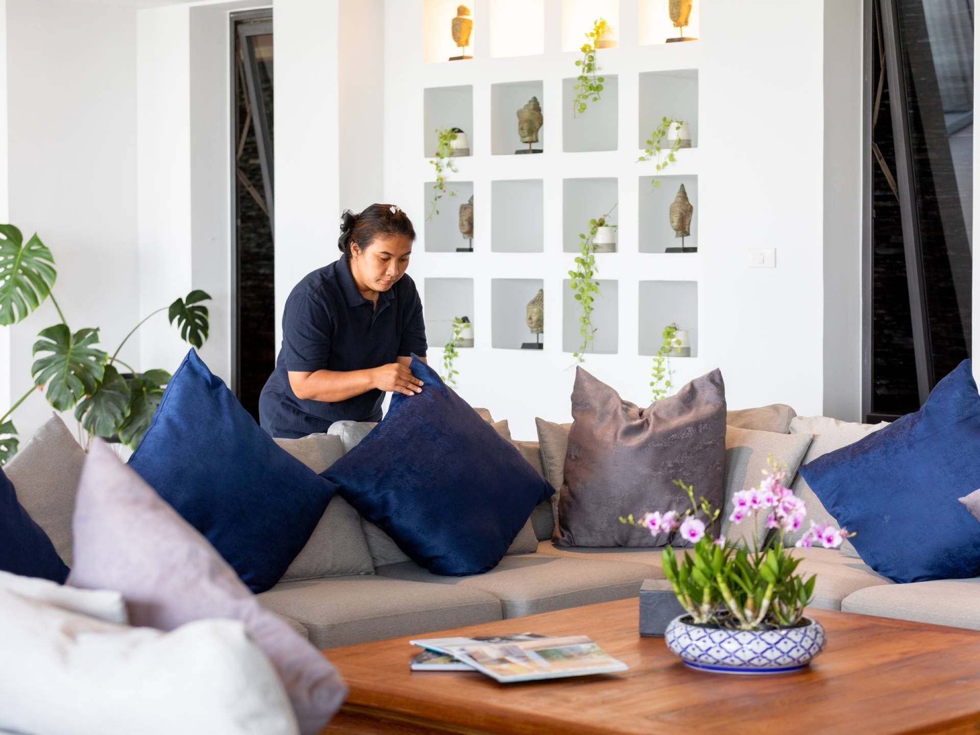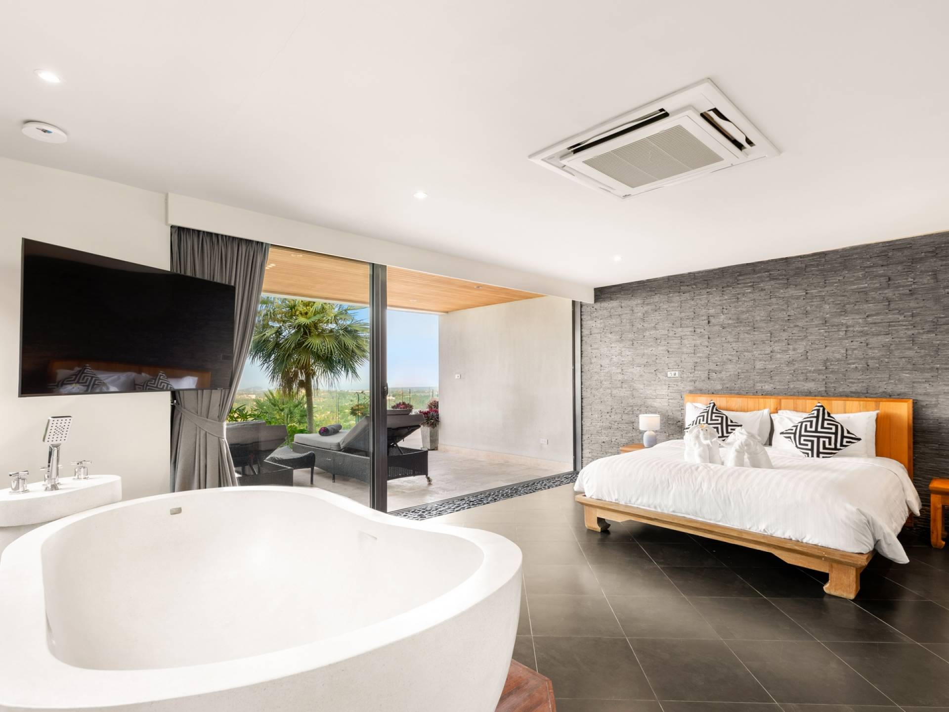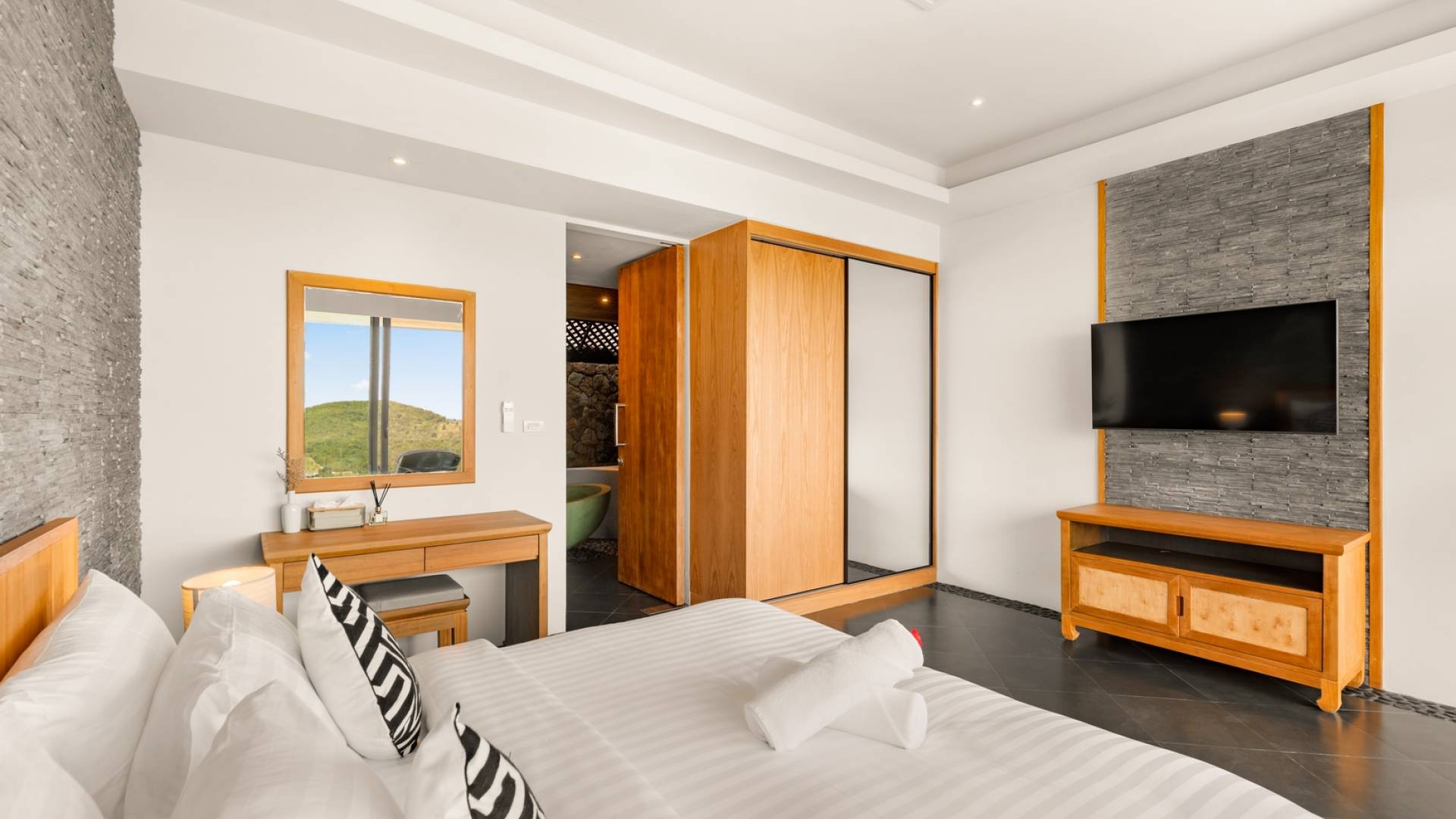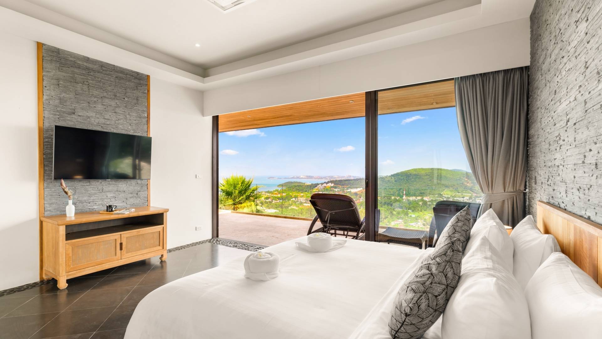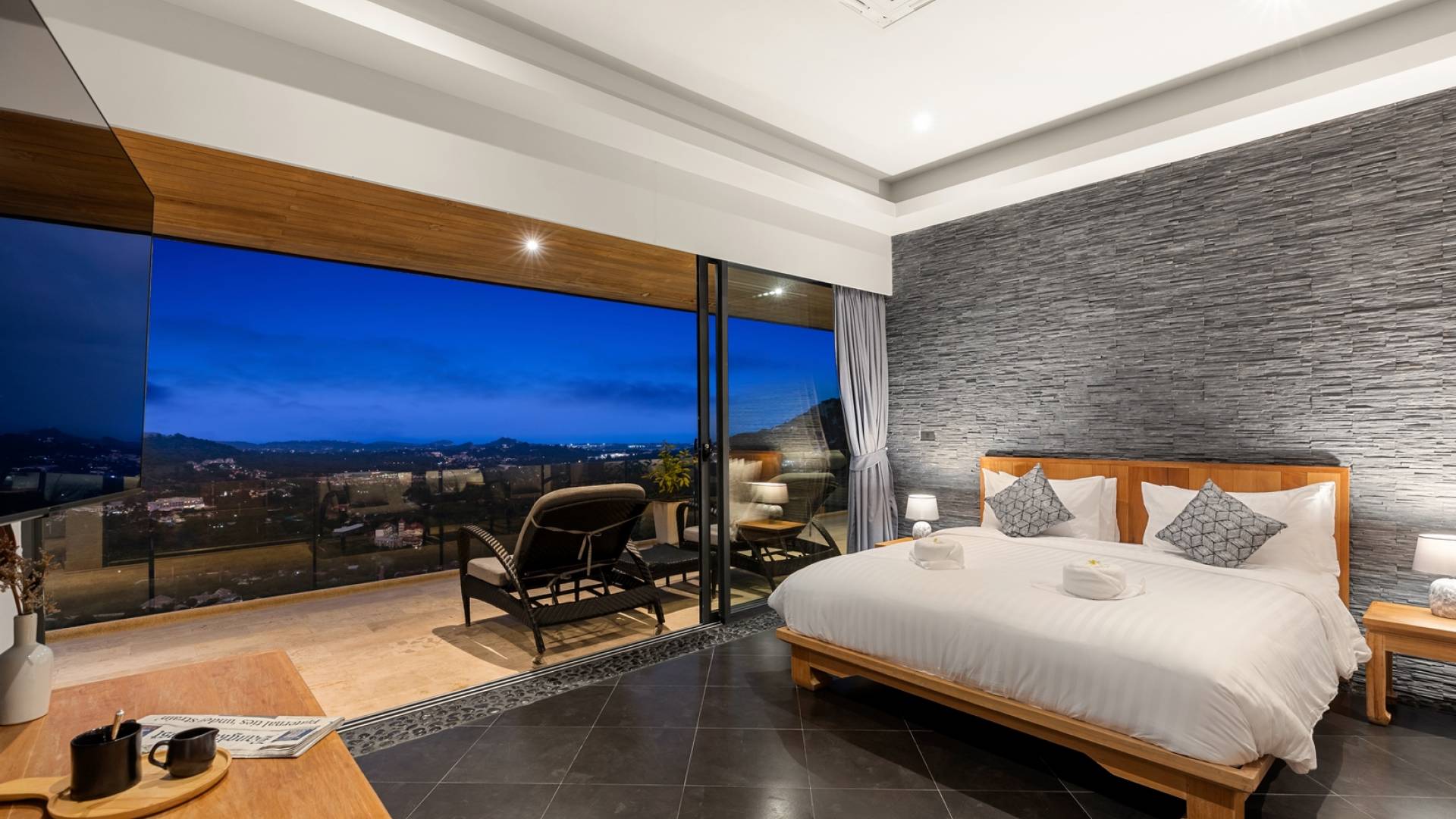 Alle 5 Schlafzimmer sind mit luxuriösen Kingsize-Betten, Klimaanlage, Safe, Mini-Kühlschrank ausgestattet und mit schicken thailändischen Ornamenten und Kunstwerken ausgestattet. Alle atemberaubenden En-Suiten verfügen über frei fließende Regenduschen und Terrazzo-Badewannen sowie Armaturen aus poliertem Edelstahl.