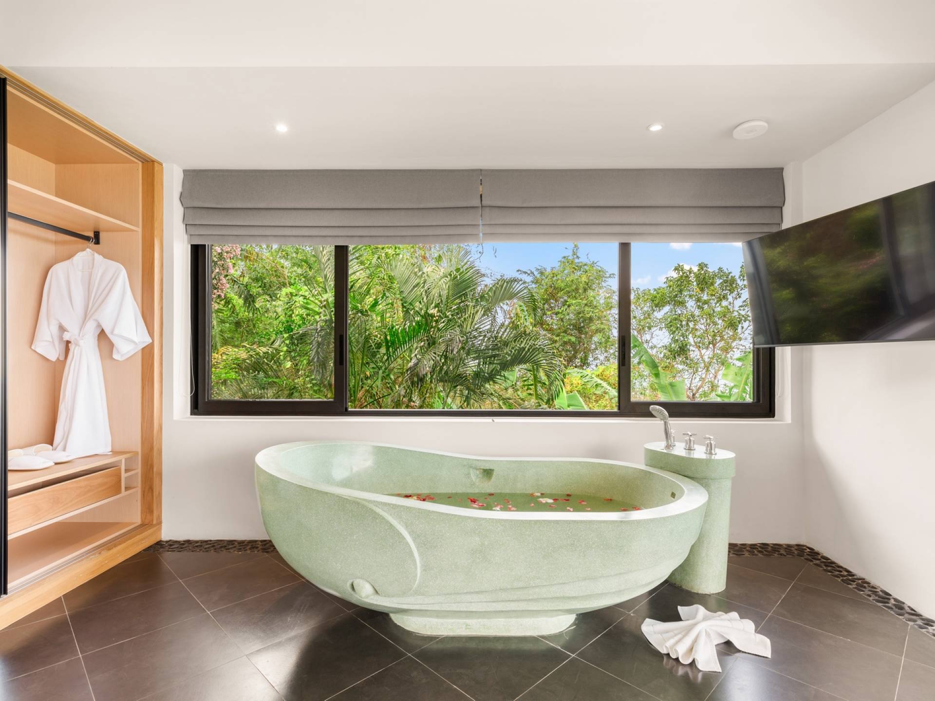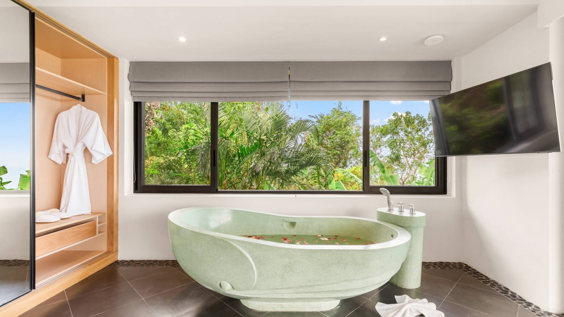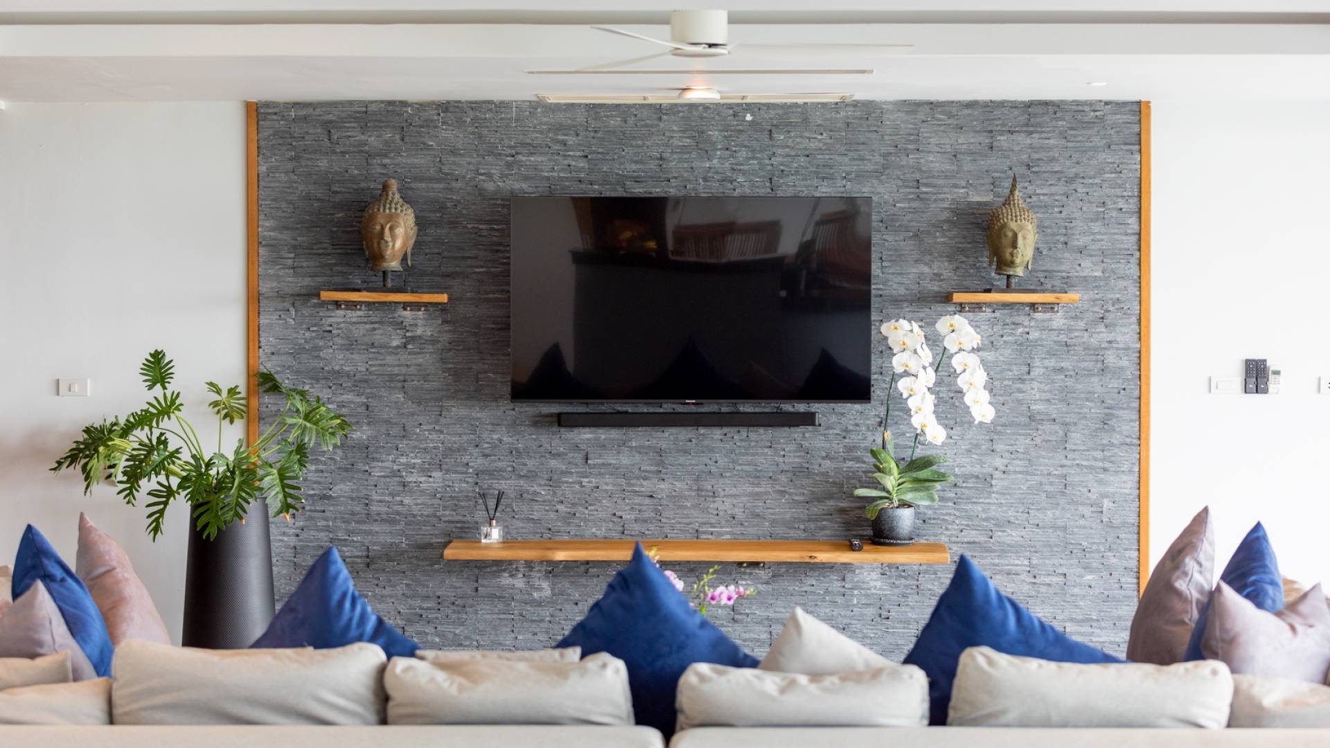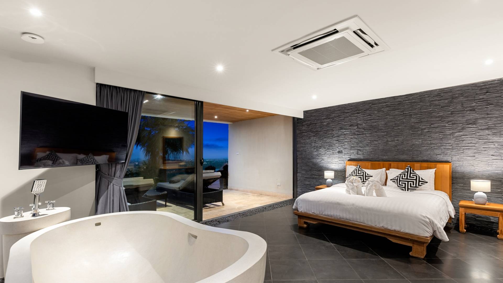 Alle 5 Schlafzimmer sind mit luxuriösen Kingsize-Betten, Klimaanlage, Safe, Mini-Kühlschrank ausgestattet und mit schicken thailändischen Ornamenten und Kunstwerken ausgestattet. Alle atemberaubenden En-Suiten verfügen über frei fließende Regenduschen und Terrazzo-Badewannen sowie Armaturen aus poliertem Edelstahl.