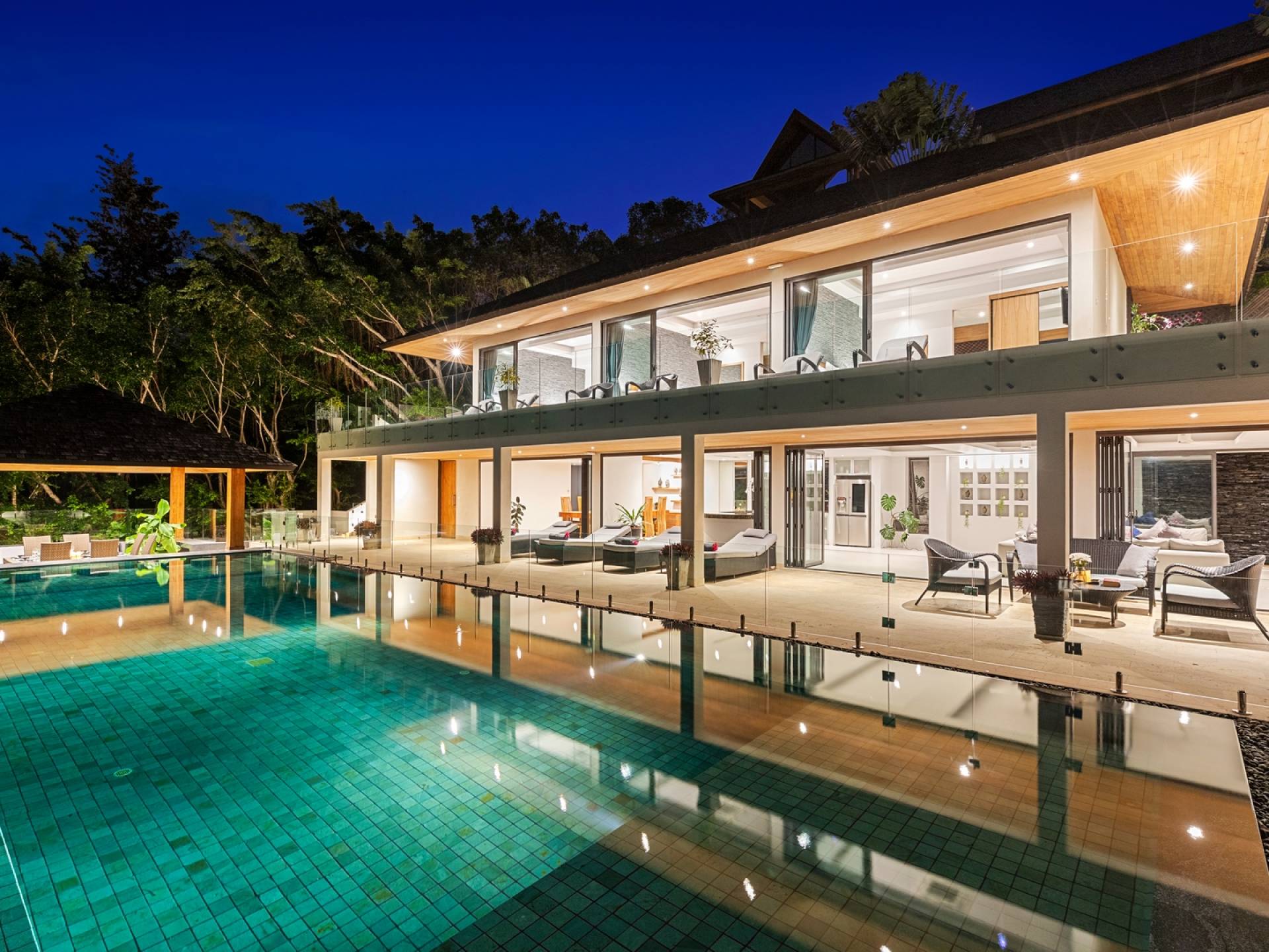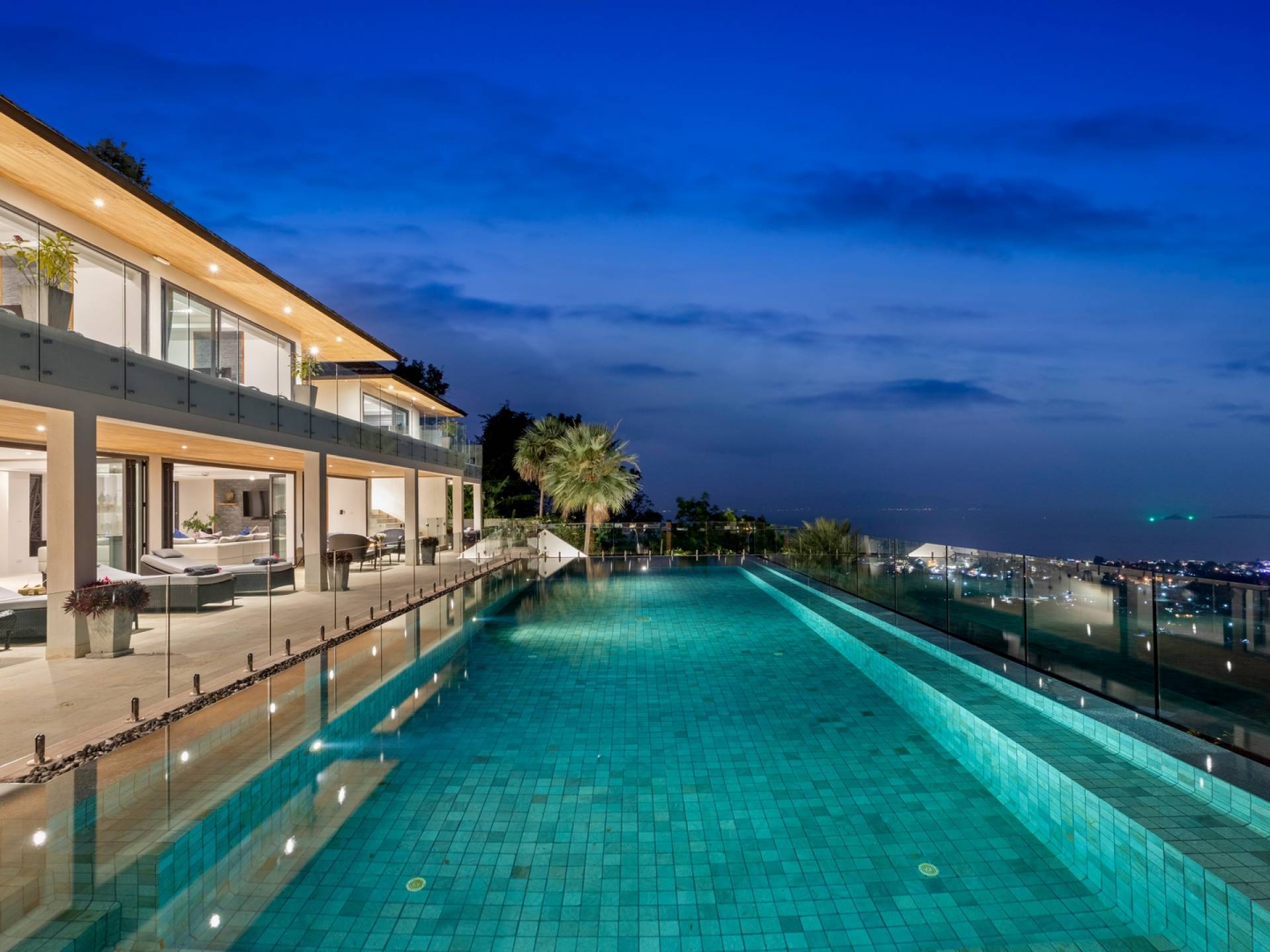 Darüber hinaus gibt es in den gesamten Wohnbereichen ein digitales Stimmungslichtsystem, mit dem Sie die Szene Ihrer Wahl in Szene setzen können. Die Villa Grand View Samui ist ideal für große Familienfeiern, da ihre Schwester Villa Grand Vista Samui in unmittelbarer Nähe liegt und zwei Villen mit insgesamt 10 Schlafzimmern und 2 Pools bietet, die perfekt für Großfamilien und Freunde sind.