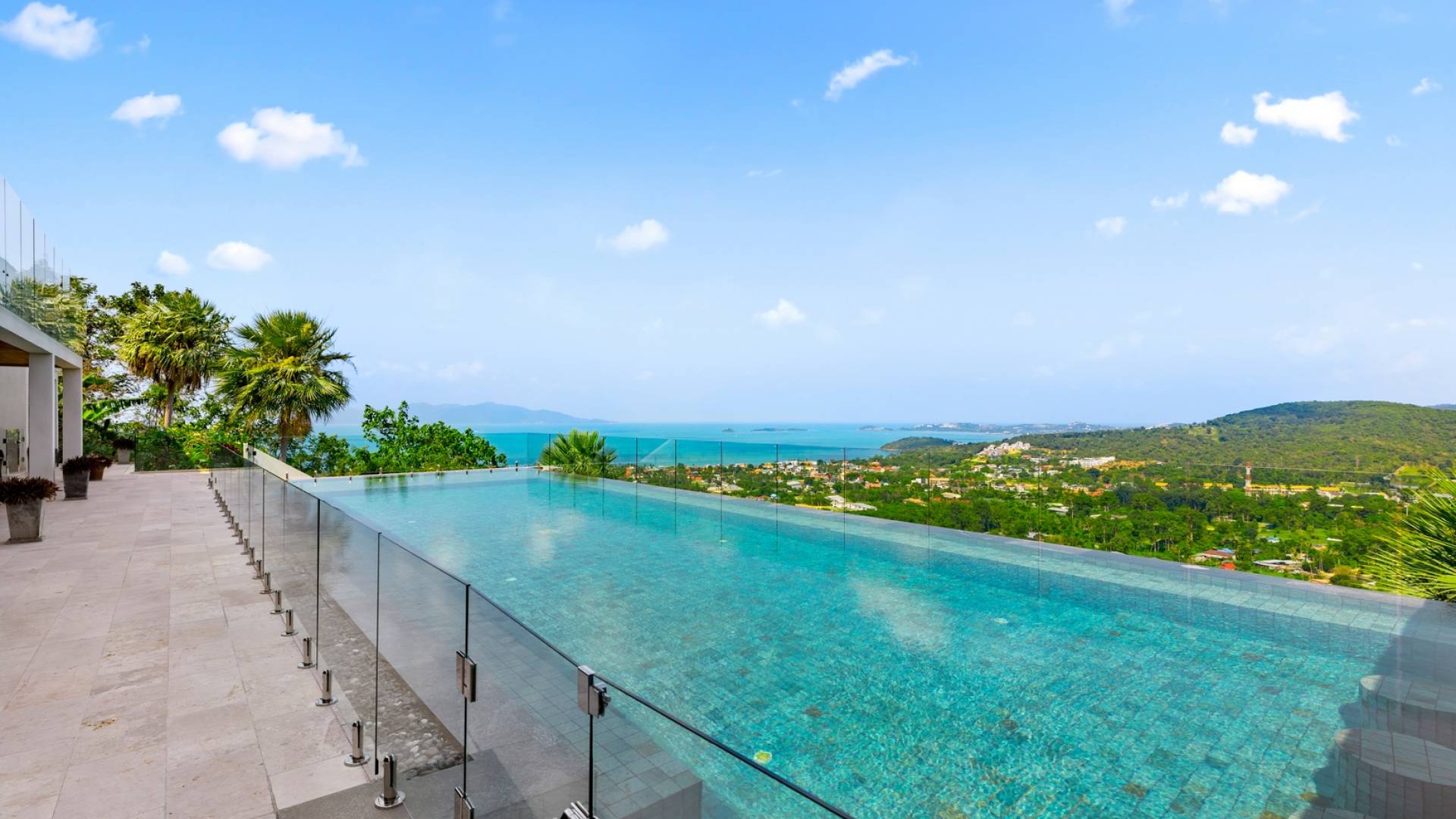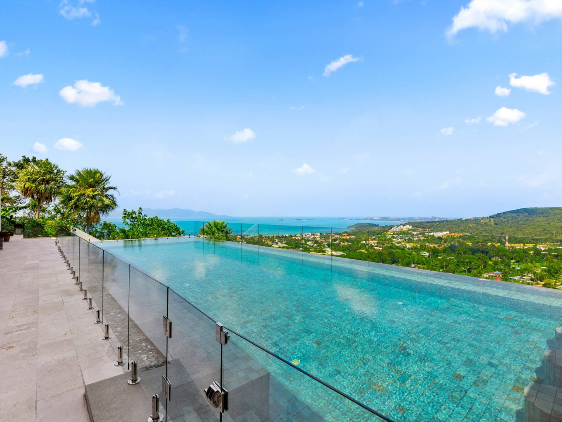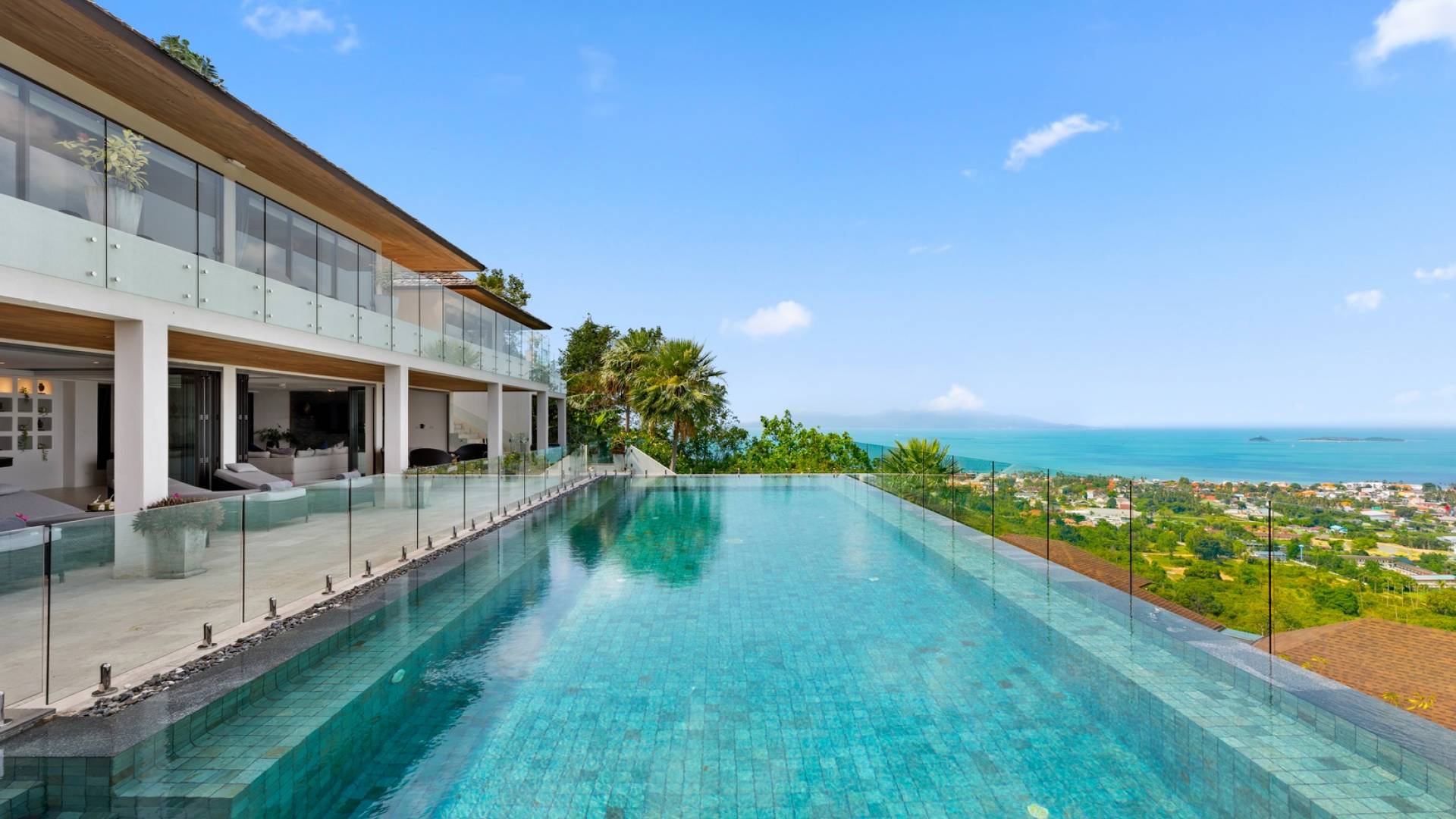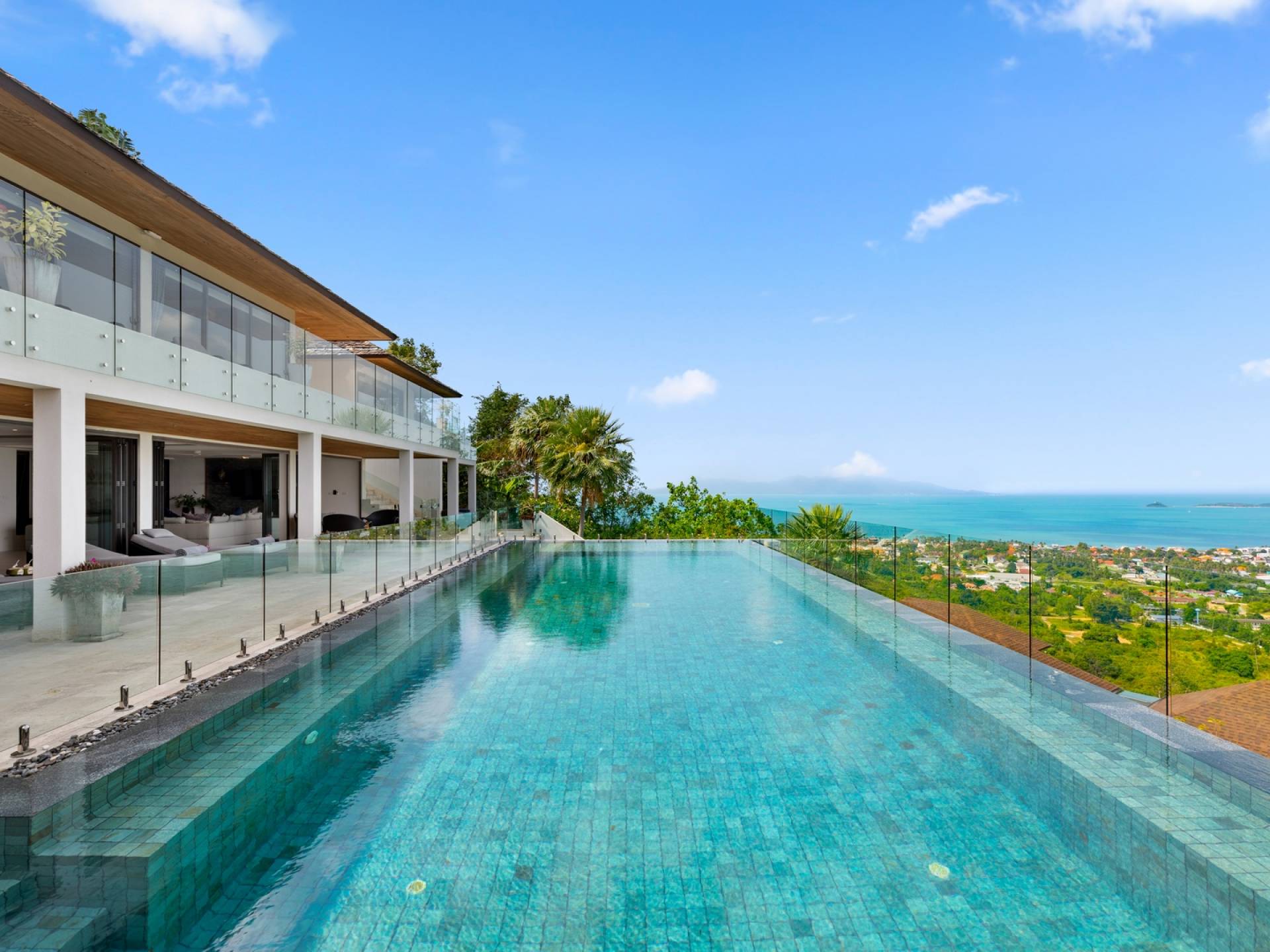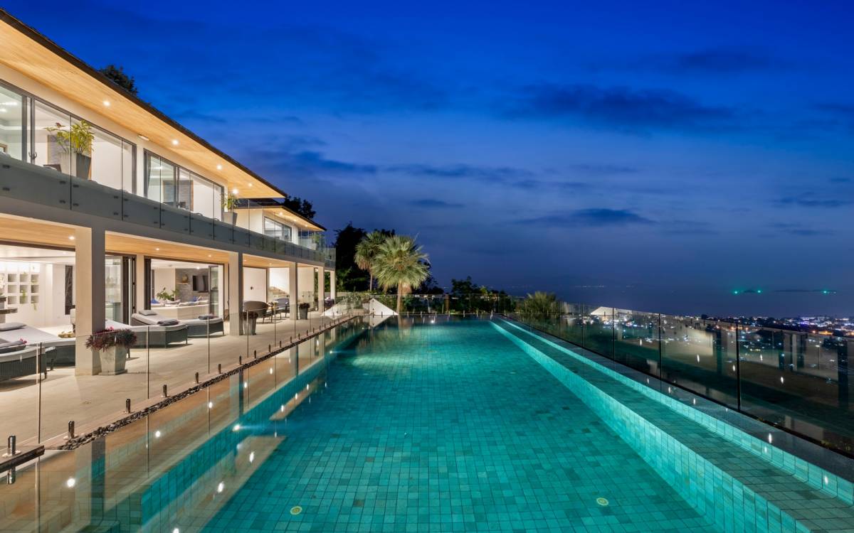 Villa Grand View Samui ist eine Superior-Villa auf einem Berggipfel mit 5 Schlafzimmern inmitten der malerischen Hügel von Bo Phut, die einen stilvollen Lebensstandard mit herrlichem Panoramablick auf das Meer bietet. Legen Sie Ihre Füße auf eine geräumige und wunderschön dekorierte Terrasse oder nehmen Sie ein Bad im 16 Meter langen Infinity-Pool, umgeben von der Aussicht von Koh Samuis verseuchtem Blumenleben auf das kristallklare Wasser und die weißen Sandstrände von Koh Phangan.