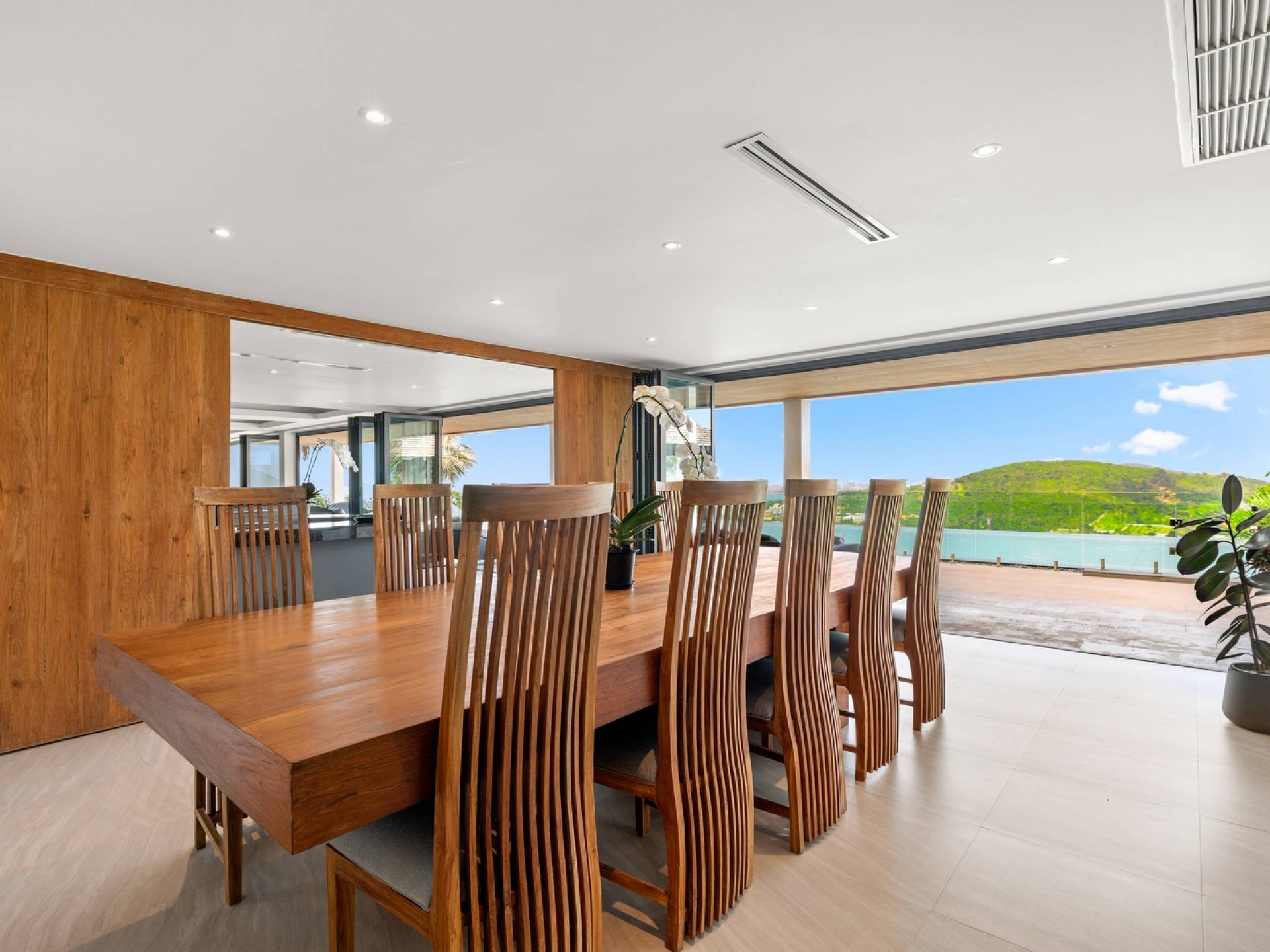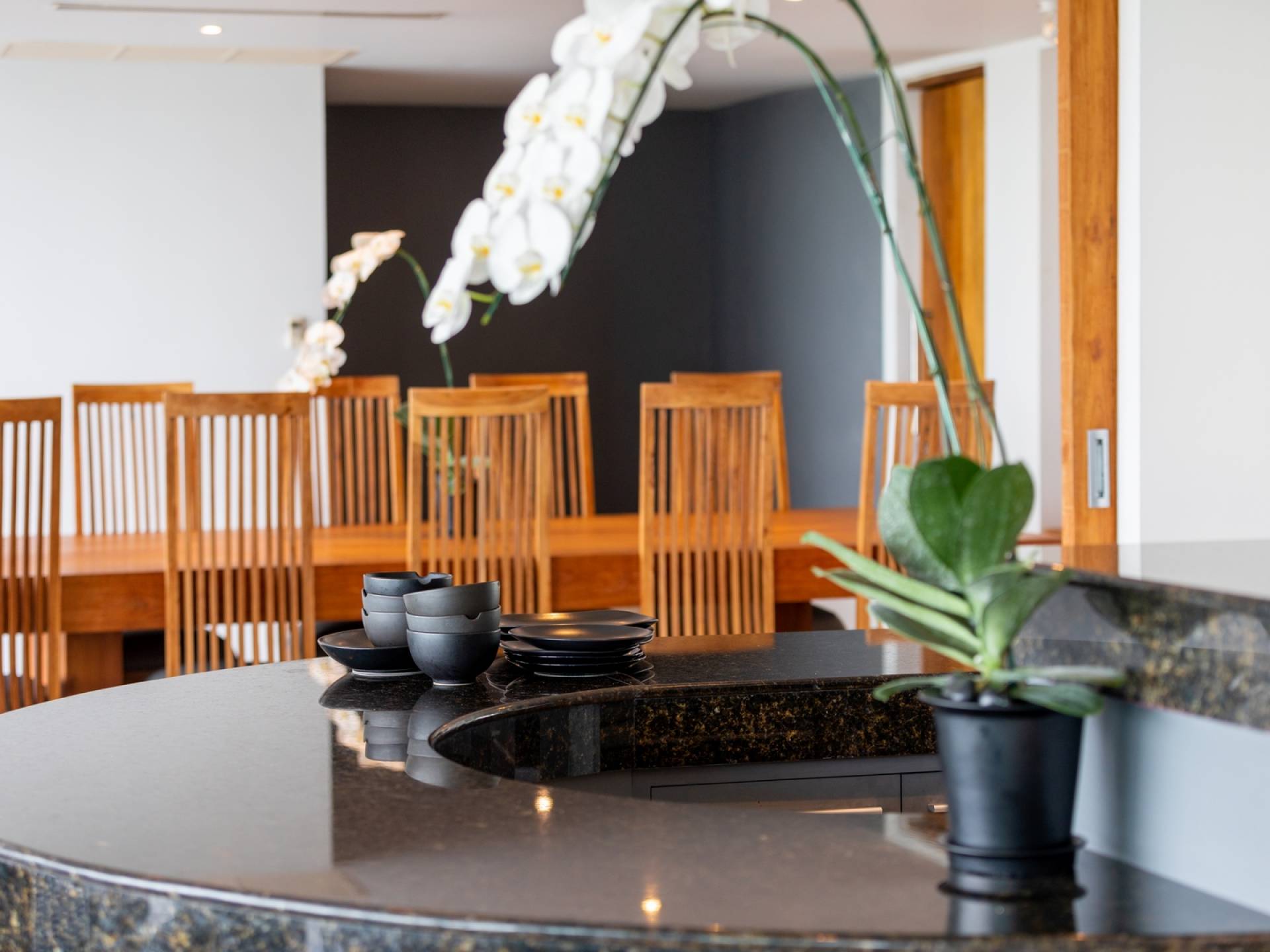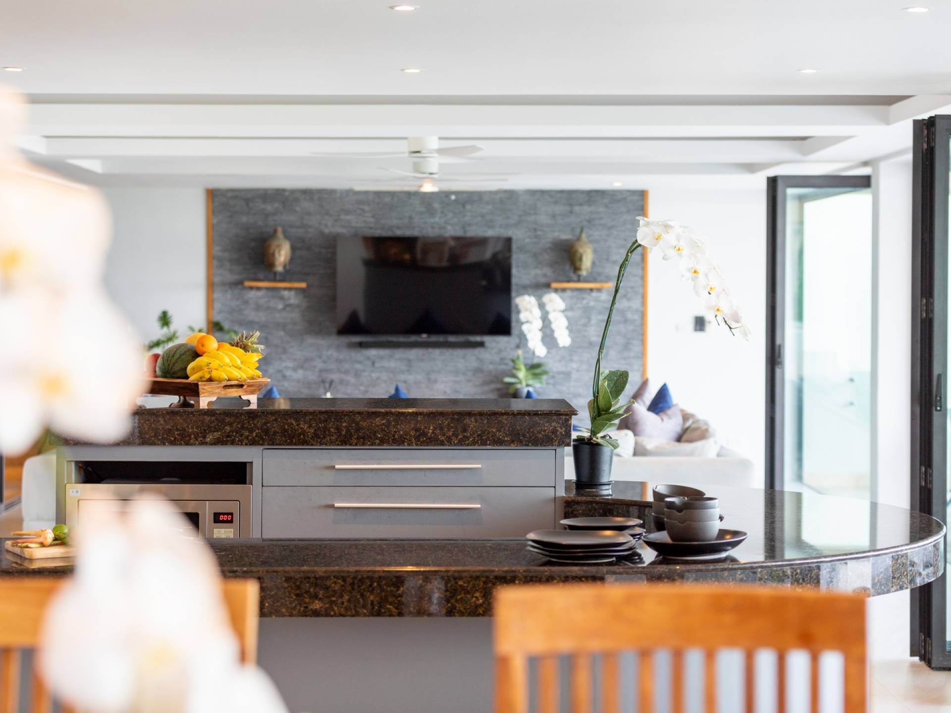 Ein geräumiger Küchenbereich mit Weinkühler, Granitarbeitsplatten, Kochinsel, Herd, Backofen und Doppelwaschbecken ergänzt einen Essbereich mit einem schönen großen Esstisch aus Teakholz (bequem Platz für bis zu zwölf Personen), erleuchtet von einem atemberaubenden Kronleuchter, der das Herzstück des Raumes ist, macht es ideal für private Unterhaltung. Der Unterhaltungssaal am Berg bietet die Möglichkeit, weitere 10 Personen zu bewirten und wird von einem hochmodernen Surround-Sound-System, Weinkühler, Kühlschrank und Elektrokochfeldern begleitet.