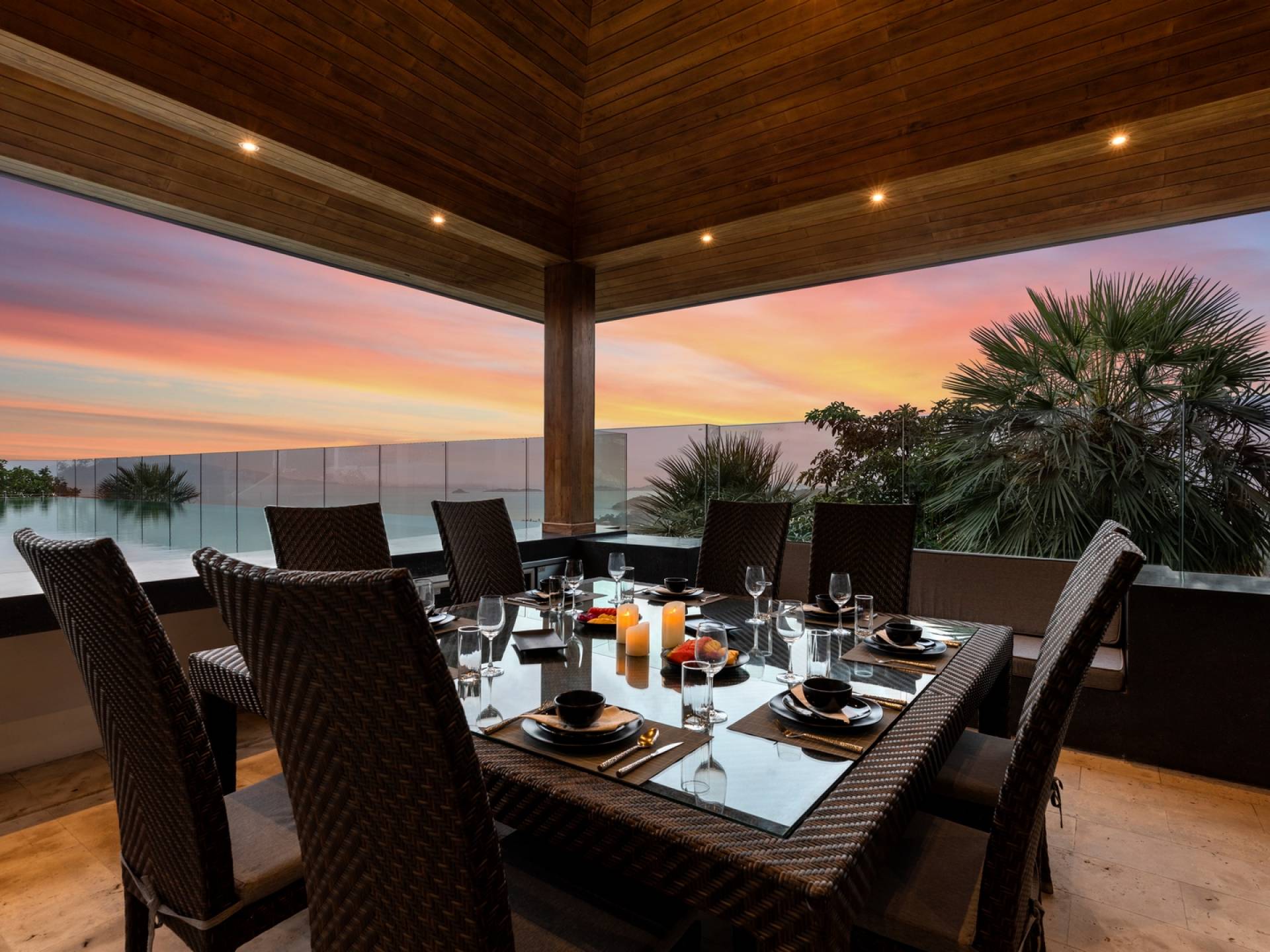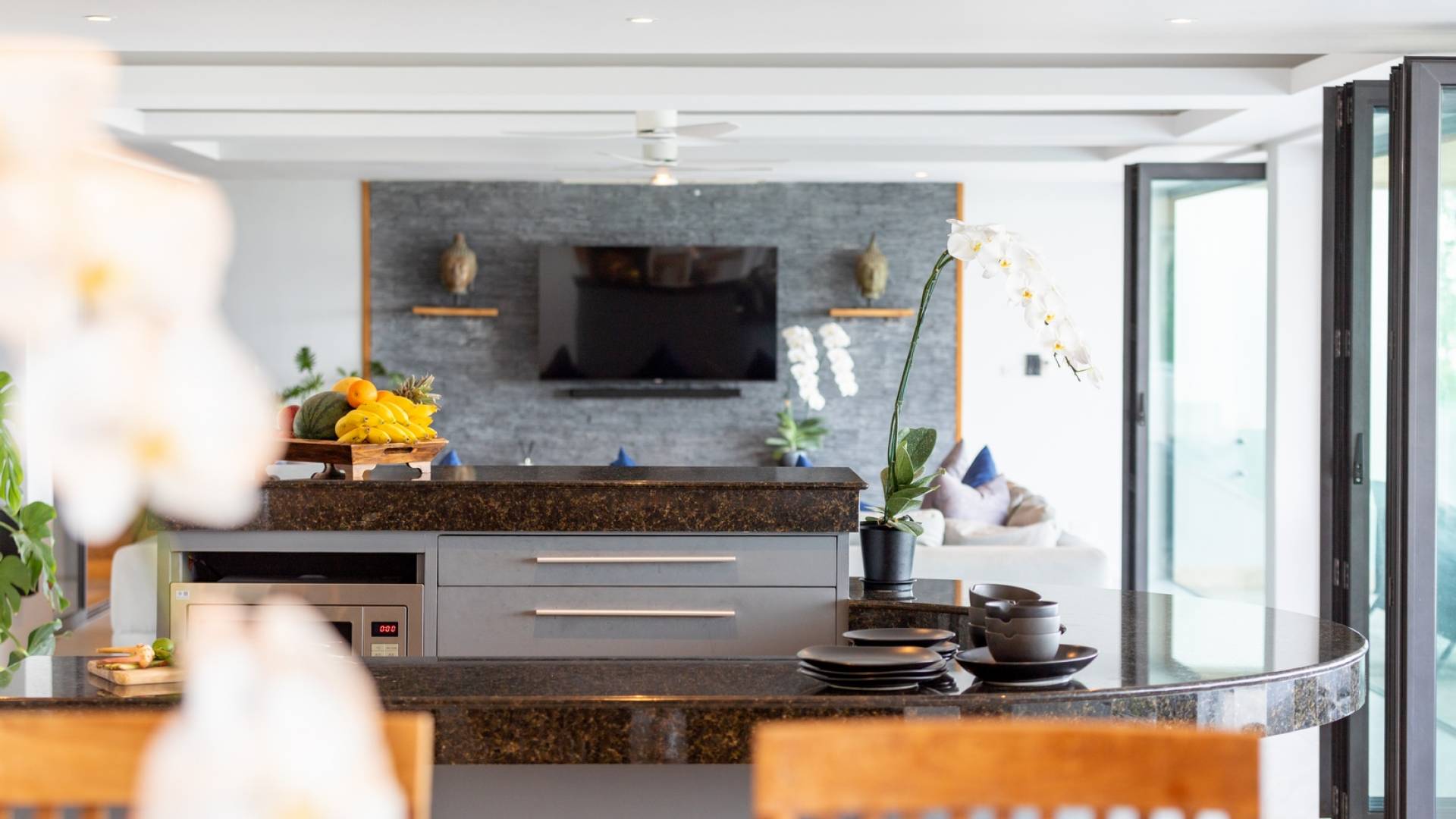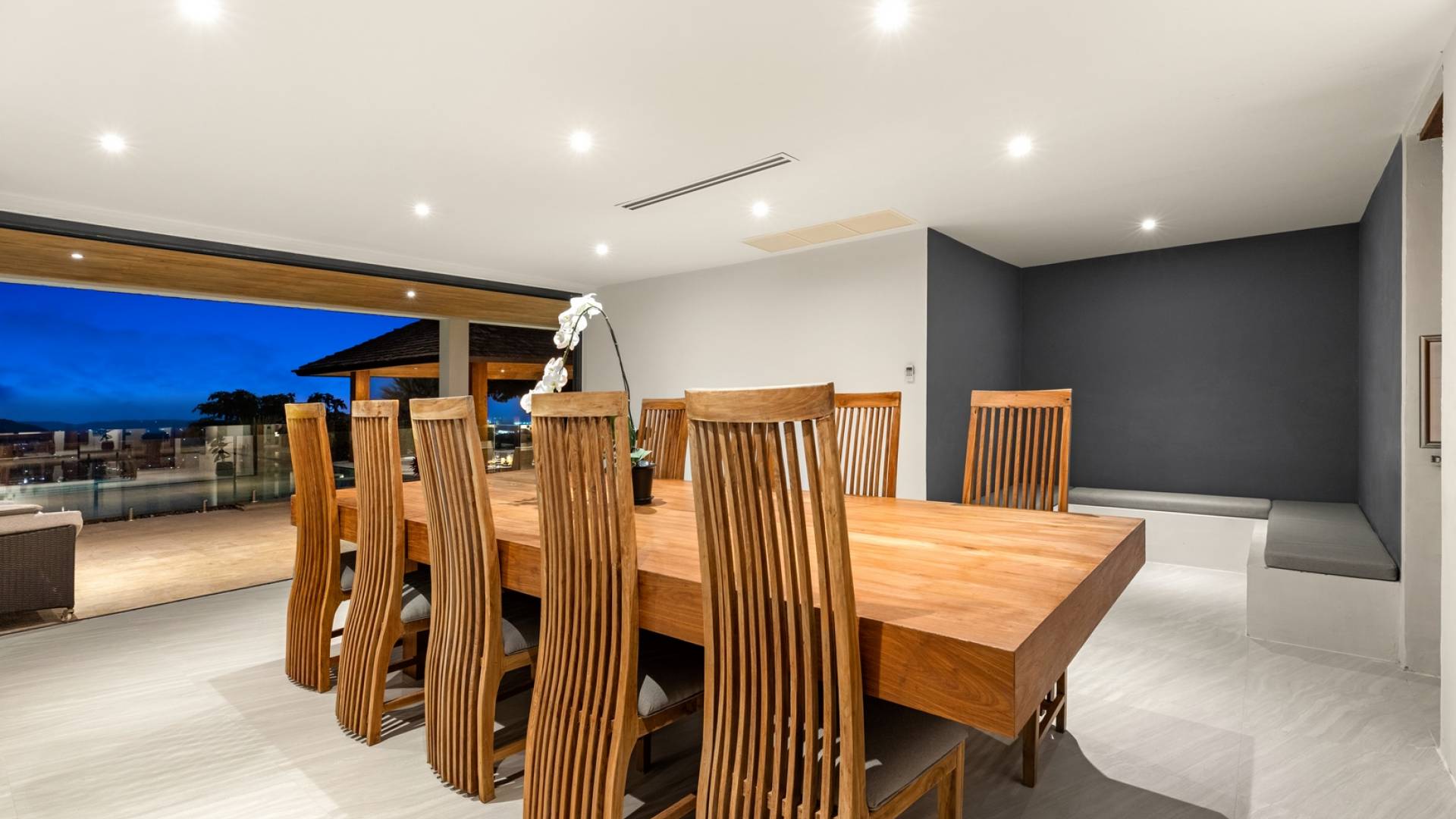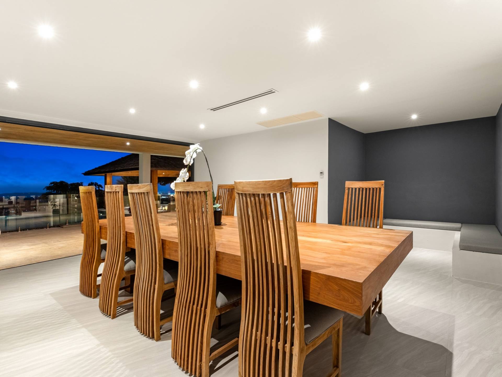 Ein geräumiger Küchenbereich mit Weinkühler, Granitarbeitsplatten, Kochinsel, Herd, Backofen und Doppelwaschbecken ergänzt einen Essbereich mit einem schönen großen Esstisch aus Teakholz (bequem Platz für bis zu zwölf Personen), erleuchtet von einem atemberaubenden Kronleuchter, der das Herzstück des Raumes ist, macht es ideal für private Unterhaltung. Der Unterhaltungssaal am Berg bietet die Möglichkeit, weitere 10 Personen zu bewirten und wird von einem hochmodernen Surround-Sound-System, Weinkühler, Kühlschrank und Elektrokochfeldern begleitet.