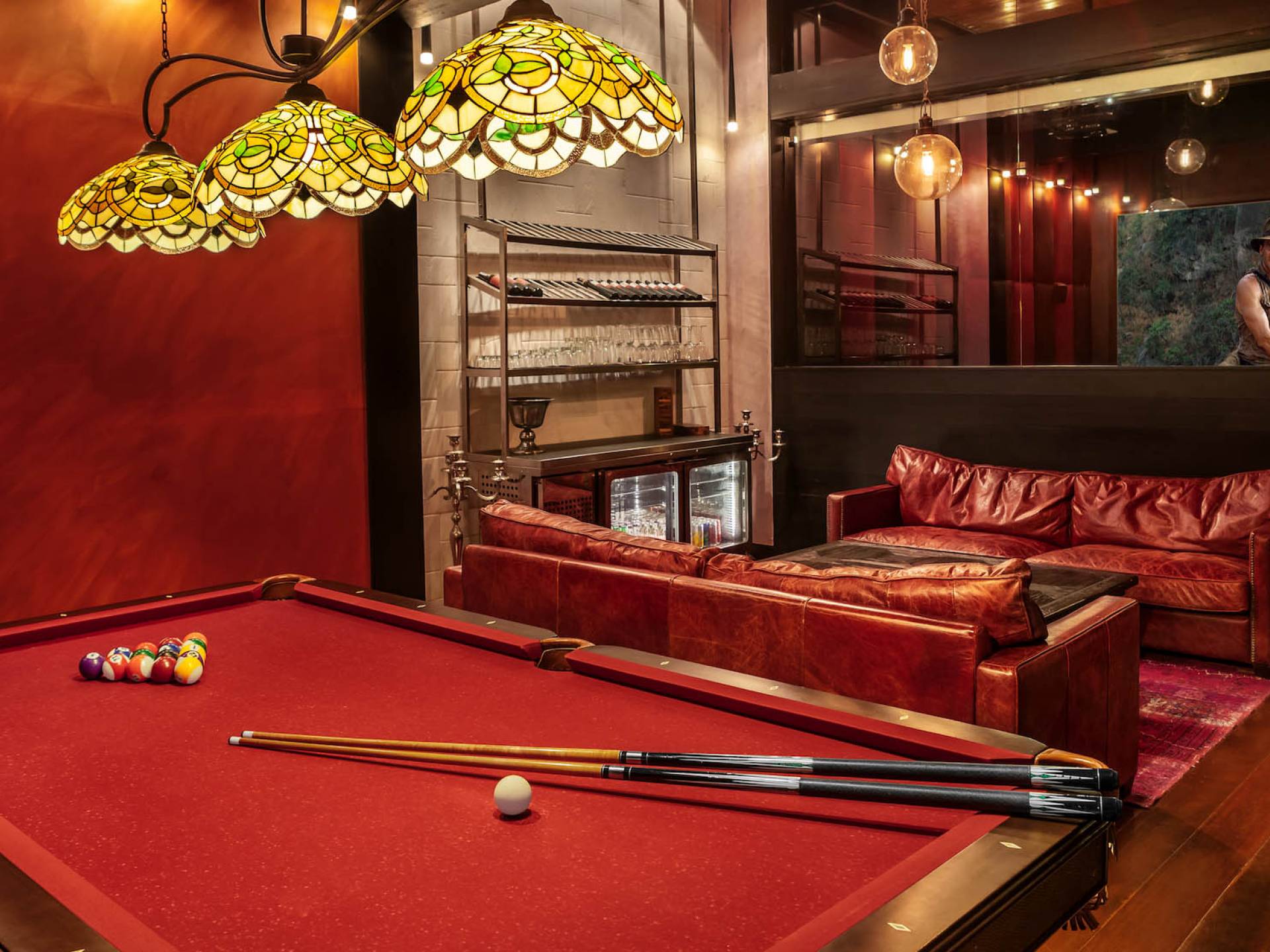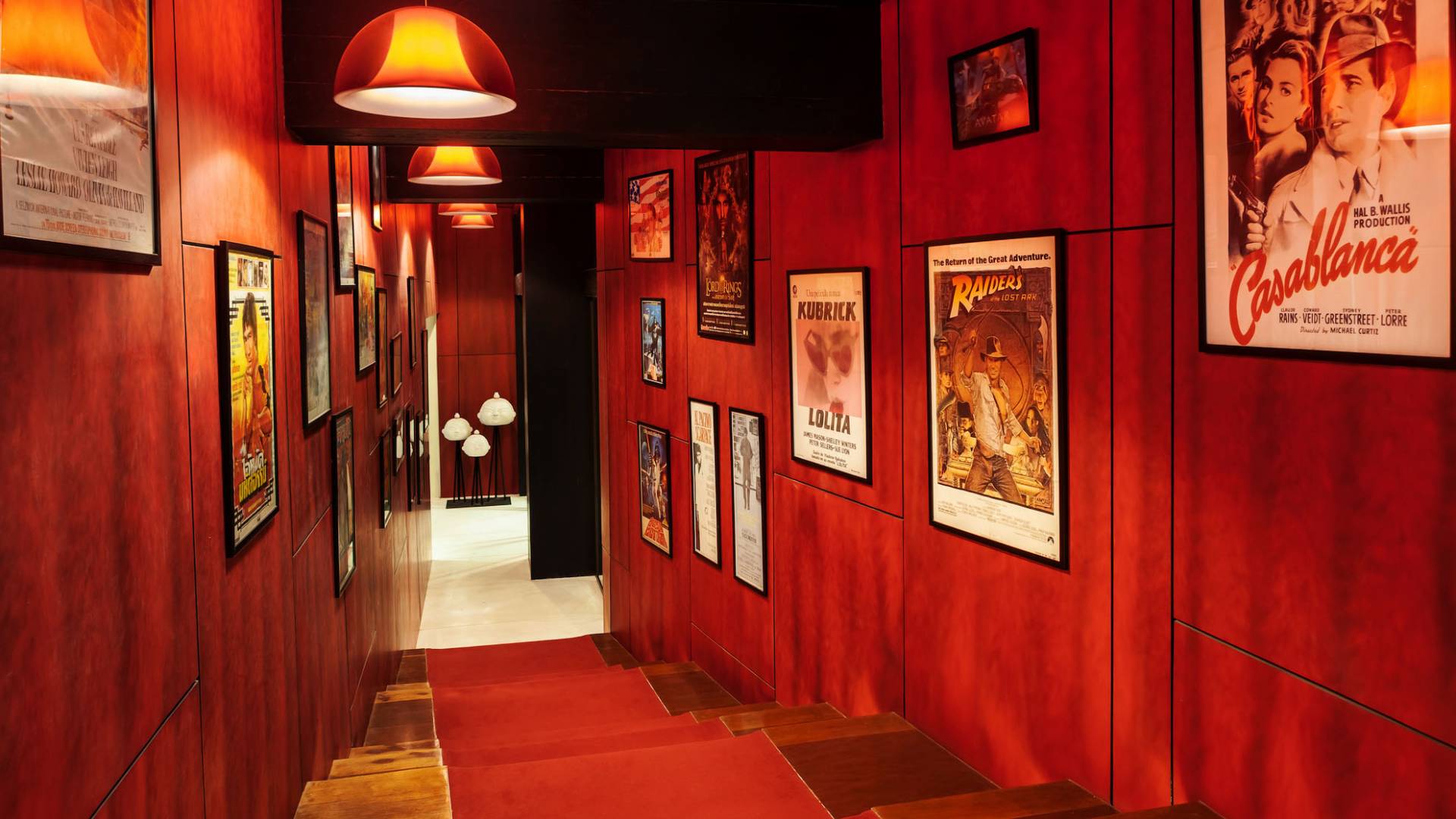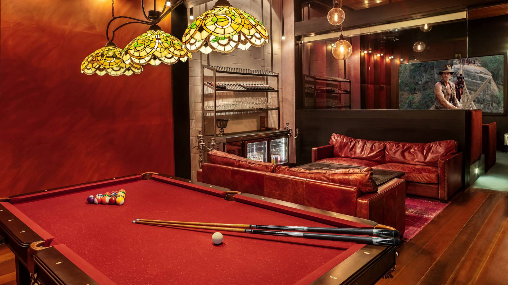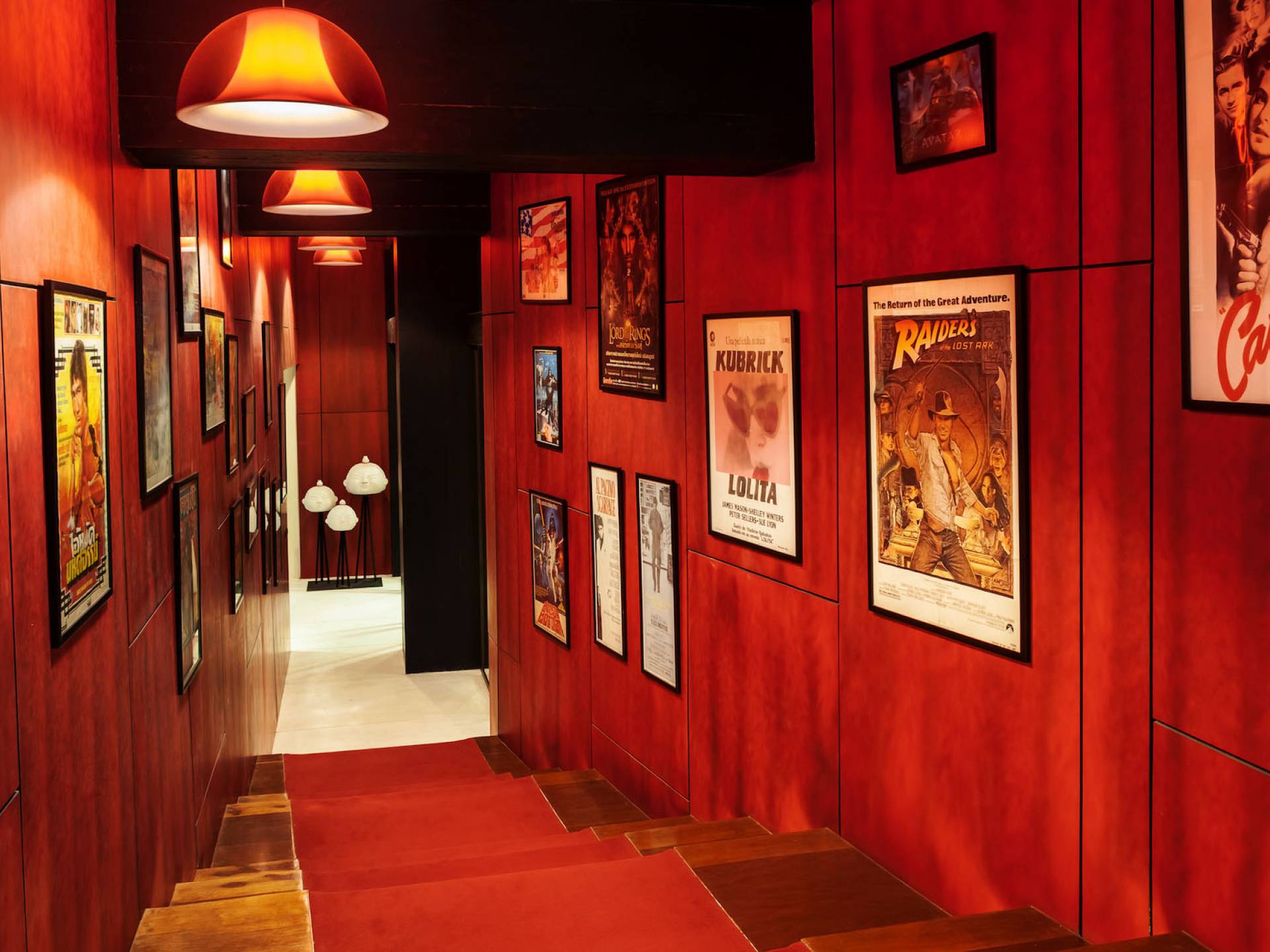 Sie kommen an Schlafzimmer 2 vorbei und gehen über den roten Teppich durch die archivierten Filmplakate hinunter zum Unterhaltungsbereich. Weinkeller, Ledersofas, Billardtisch, sinnliche Damentoilette und natürlich das 8-Sitzer-Theater, dieser Bereich wurde als Rückzugsort von der Hitze oder für nächtliche Unterhaltung konzipiert, aber wenn man einmal drinnen ist, ist es sehr schwer, ihn zu verlassen. Direkt außerhalb des Unterhaltungsbereichs befinden sich die Betten 3 und 4, die durch ein Fenster in der Decke oder ein Bullauge durch den Pool getrennt sind, die im Pool schwimmen und den Himmel dahinter.