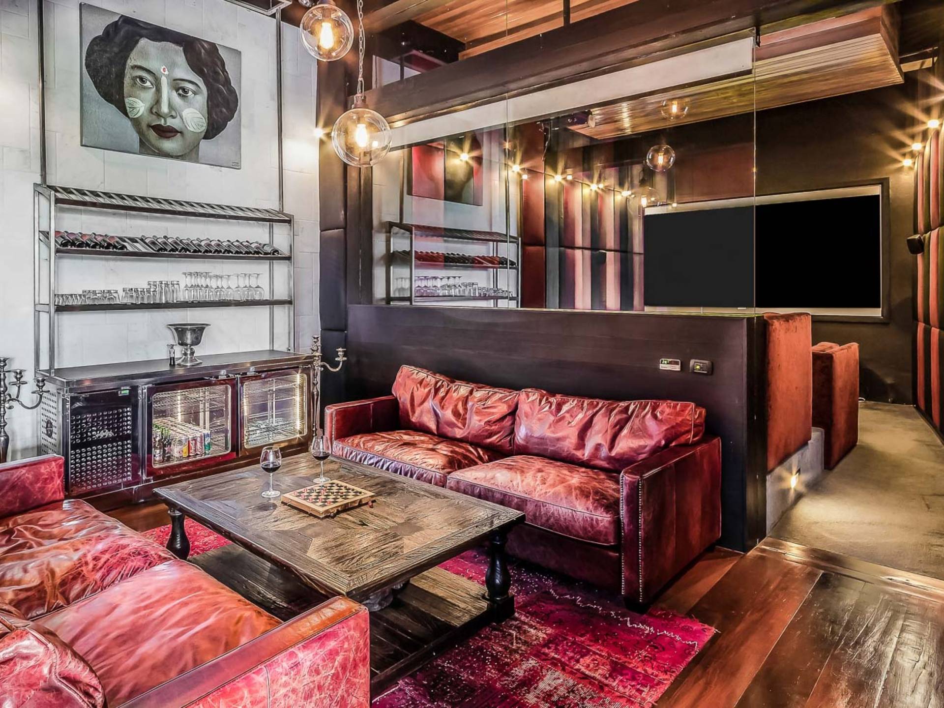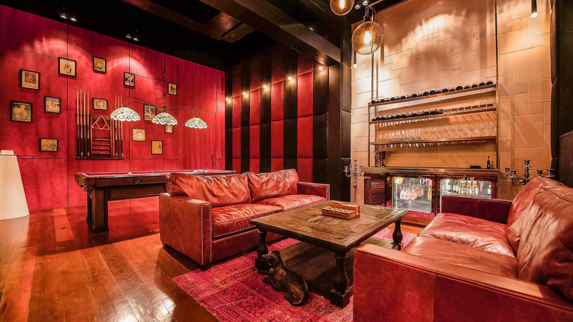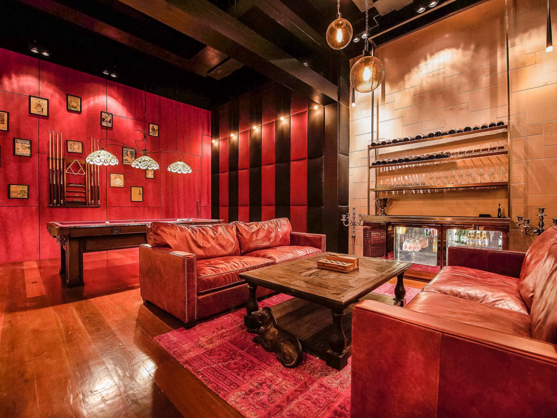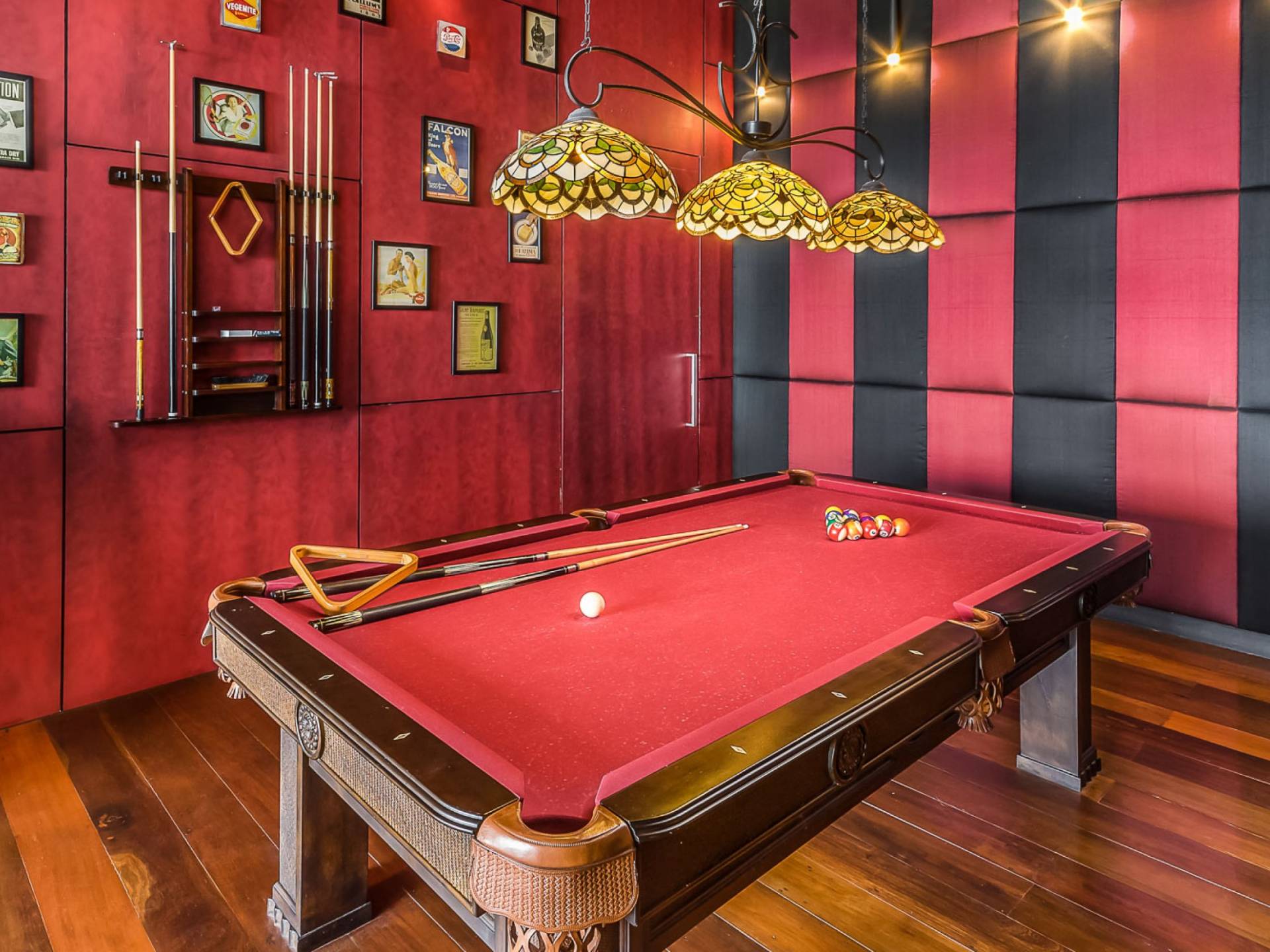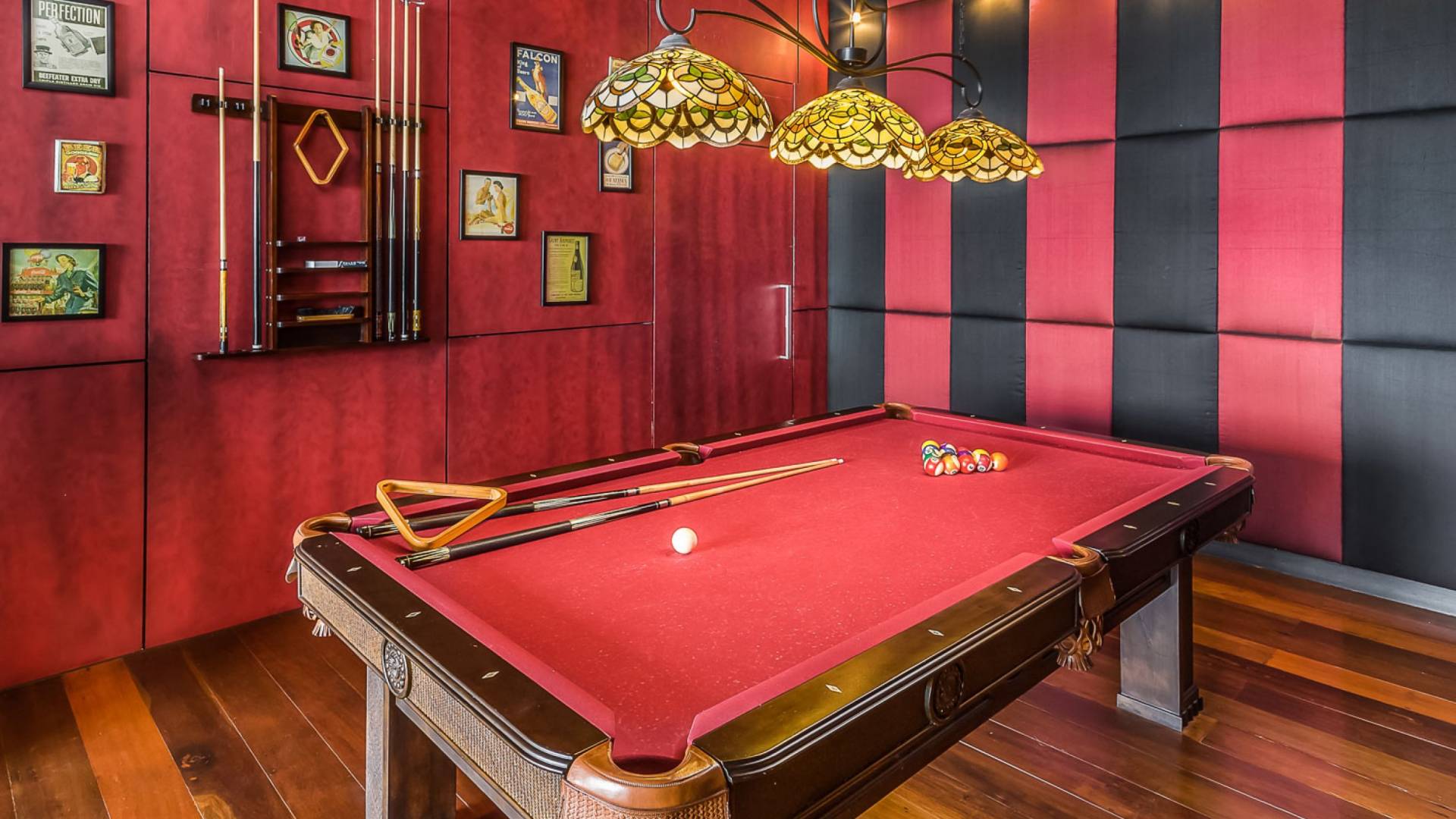 Sie kommen an Schlafzimmer 2 vorbei und gehen über den roten Teppich durch die archivierten Filmplakate hinunter zum Unterhaltungsbereich. Weinkeller, Ledersofas, Billardtisch, sinnliche Damentoilette und natürlich das 8-Sitzer-Theater, dieser Bereich wurde als Rückzugsort von der Hitze oder für nächtliche Unterhaltung konzipiert, aber wenn man einmal drinnen ist, ist es sehr schwer, ihn zu verlassen. Direkt außerhalb des Unterhaltungsbereichs befinden sich die Betten 3 und 4, die durch ein Fenster in der Decke oder ein Bullauge durch den Pool getrennt sind, die im Pool schwimmen und den Himmel dahinter.