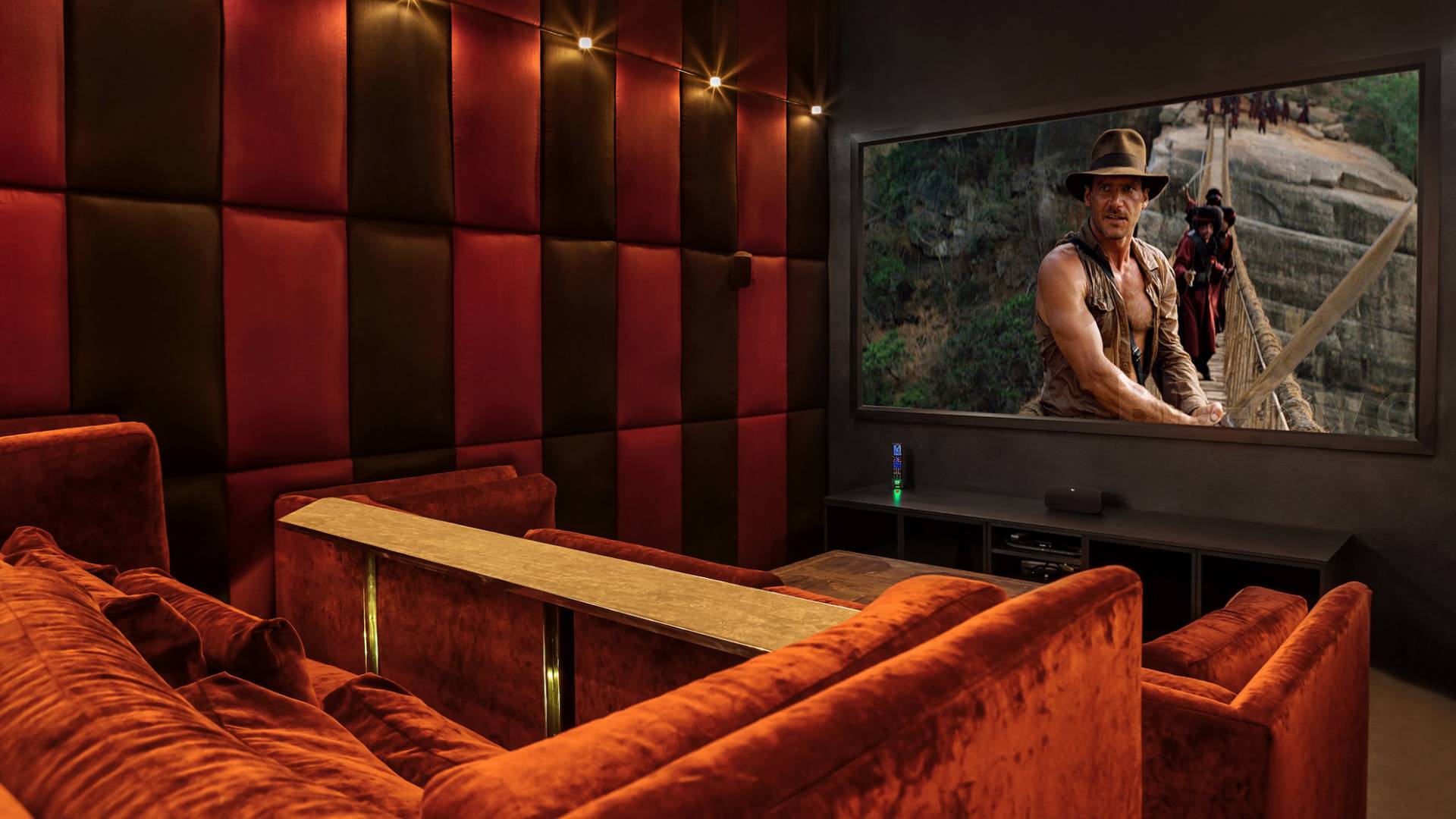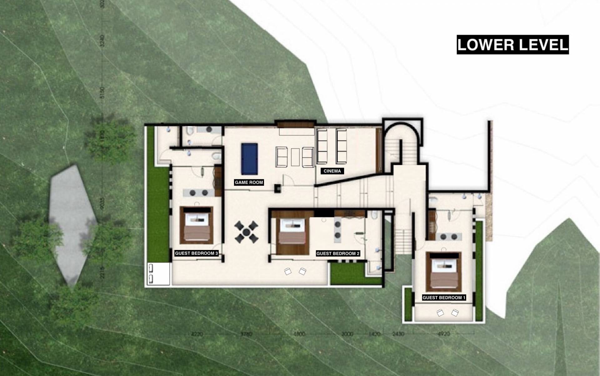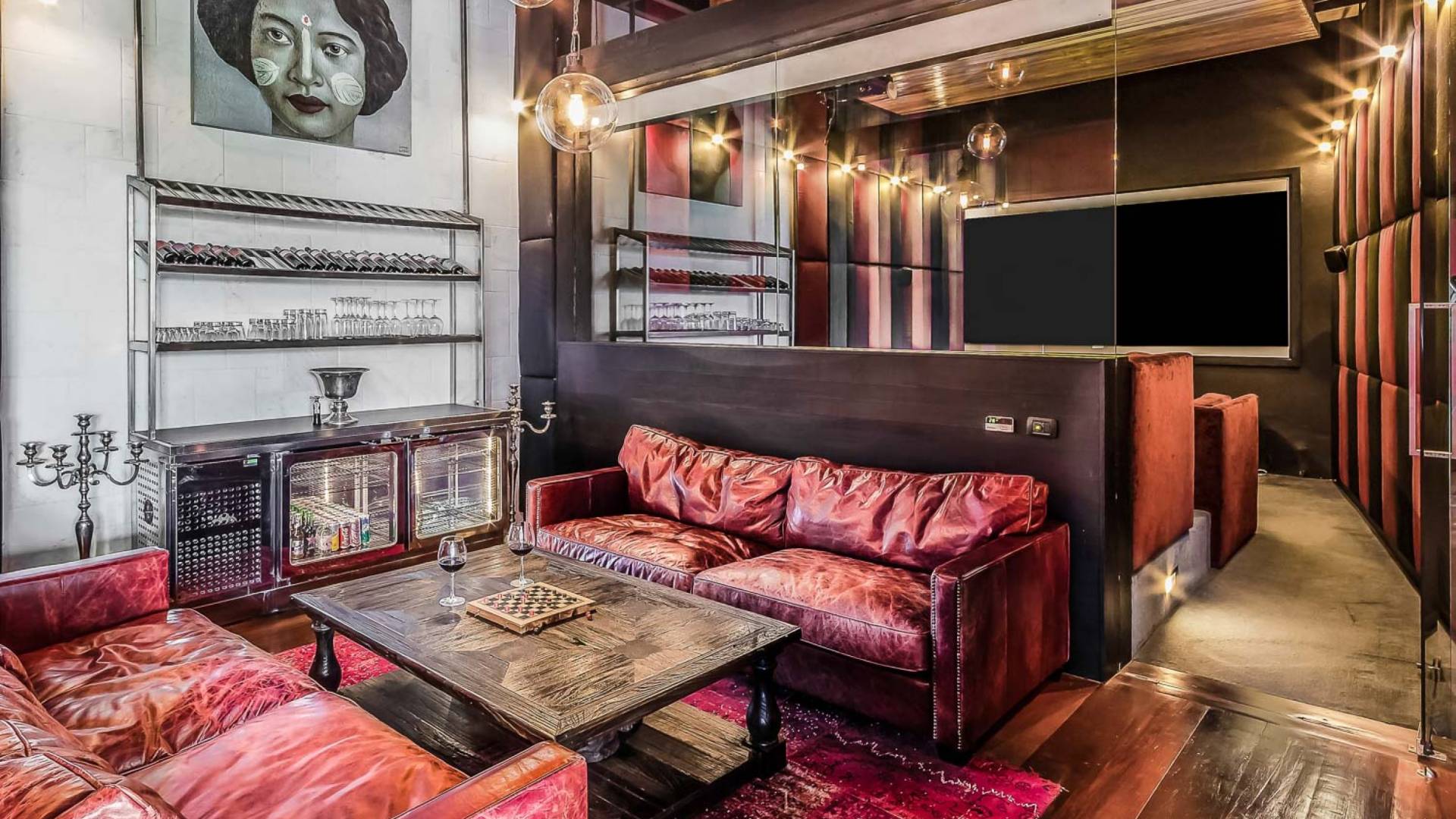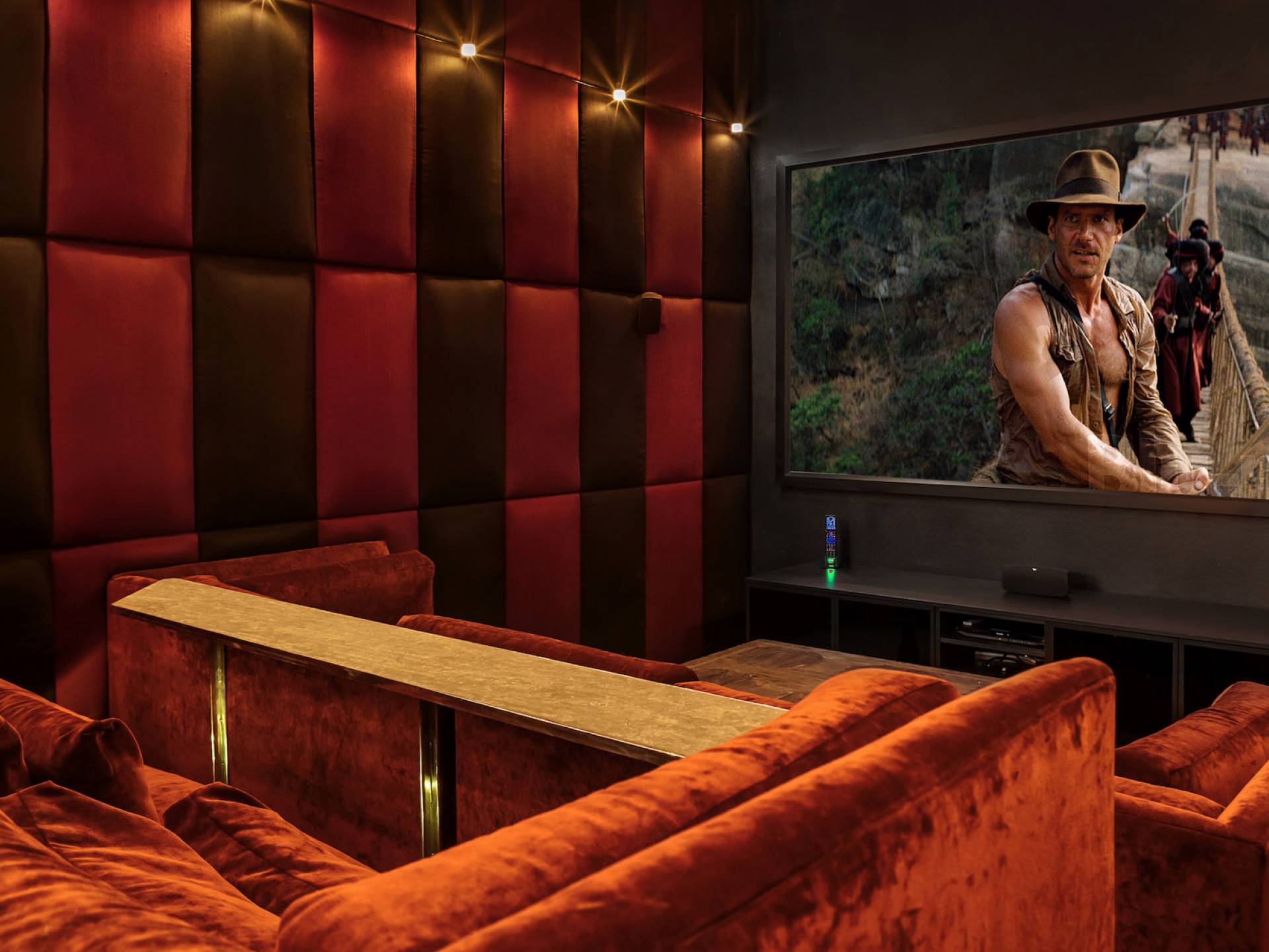 Sie kommen an Schlafzimmer 2 vorbei und gehen über den roten Teppich durch die archivierten Filmplakate hinunter zum Unterhaltungsbereich. Weinkeller, Ledersofas, Billardtisch, sinnliche Damentoilette und natürlich das 8-Sitzer-Theater, dieser Bereich wurde als Rückzugsort von der Hitze oder für nächtliche Unterhaltung konzipiert, aber wenn man einmal drinnen ist, ist es sehr schwer, ihn zu verlassen. Direkt außerhalb des Unterhaltungsbereichs befinden sich die Betten 3 und 4, die durch ein Fenster in der Decke oder ein Bullauge durch den Pool getrennt sind, die im Pool schwimmen und den Himmel dahinter.