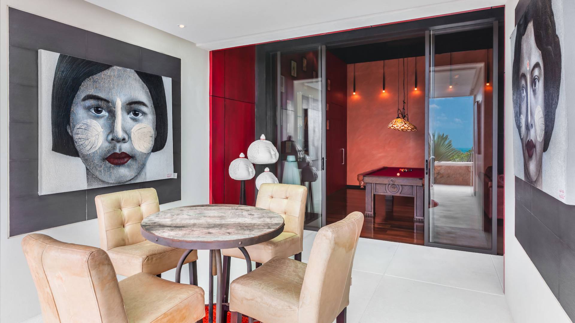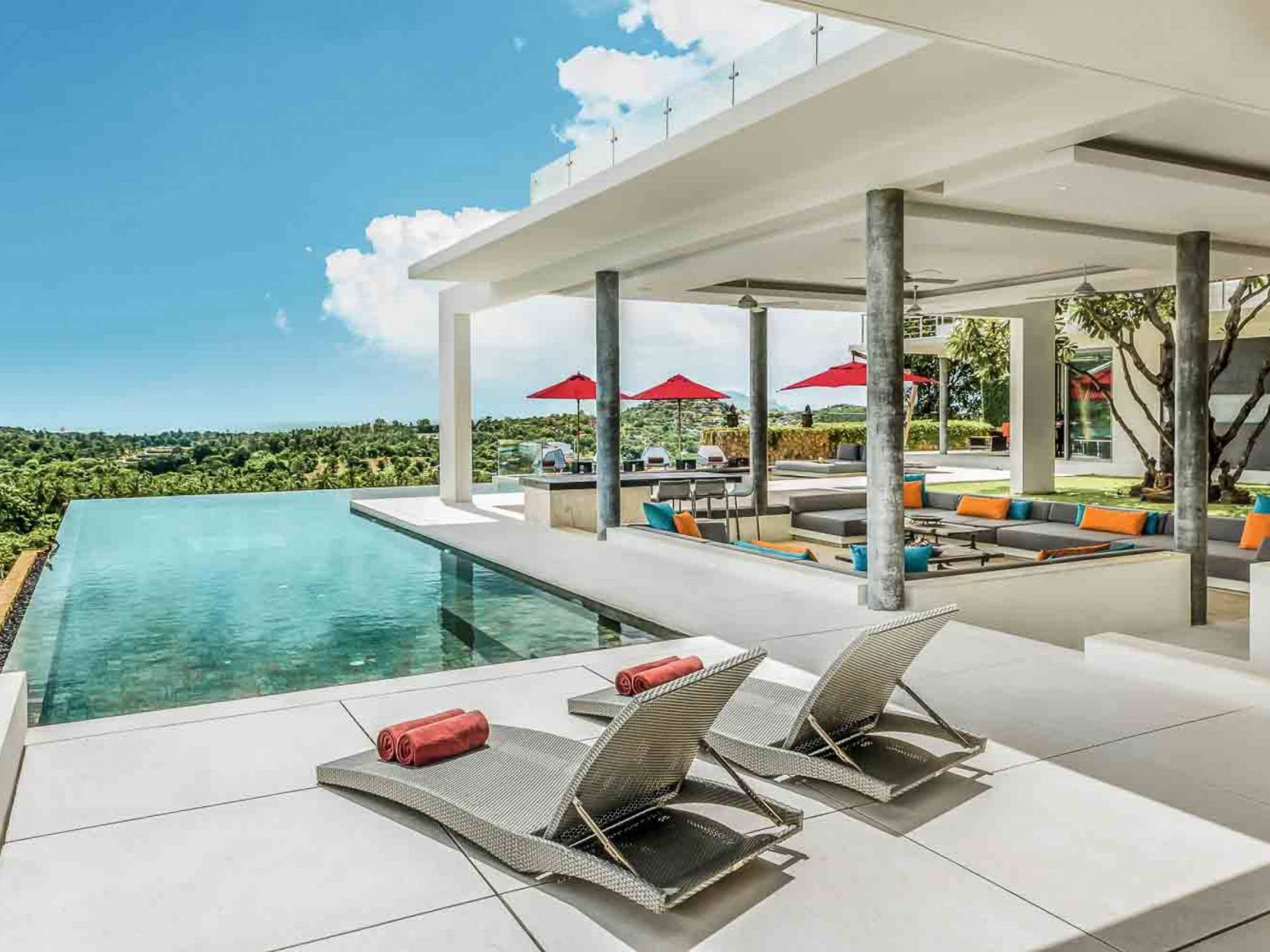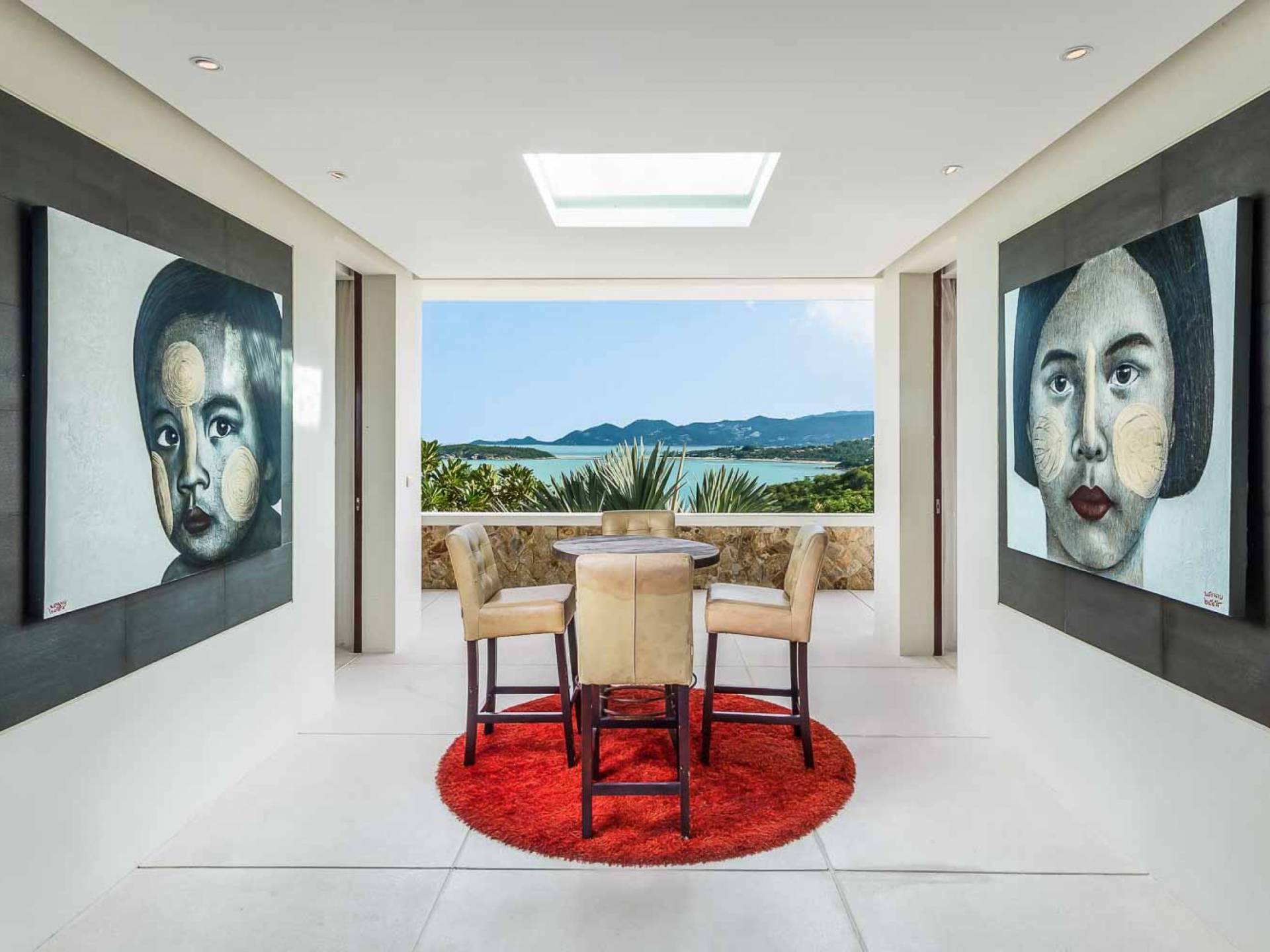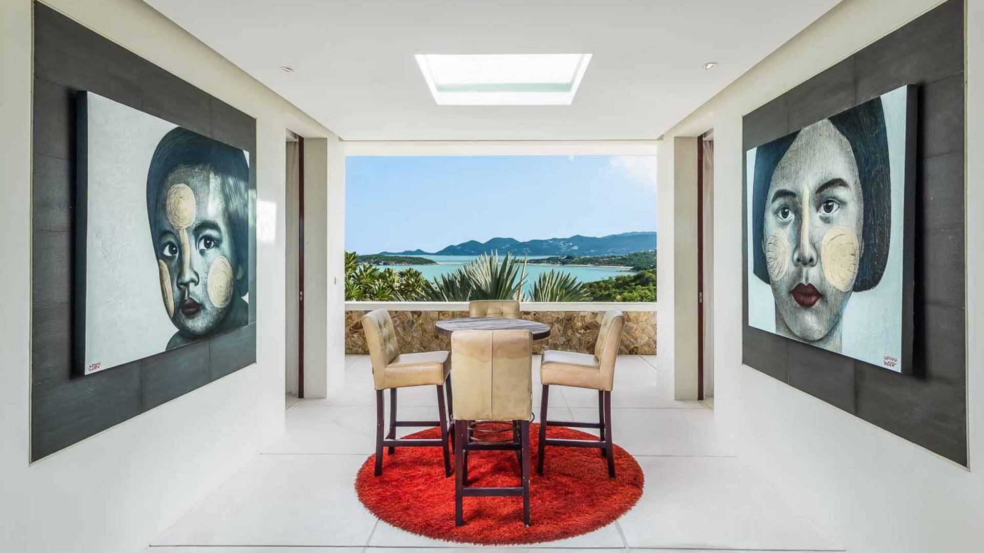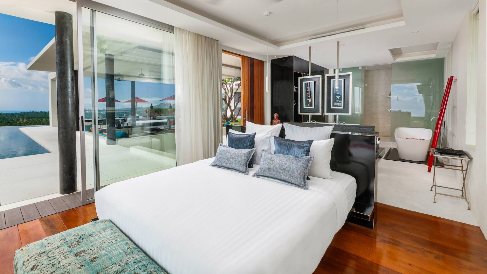 Der prächtige Eingang führt Sie in die Hauptebene oder „Pool-Ebene“ der Villa. Wenn Sie also durch die Vordertüren gehen, werden Sie mit einem atemberaubenden Blick konfrontiert, der Ihre Augen über den begrünten Innenhof, durch den Frangipani-Baum, über das versunkene Wohnzimmer und einen Teil des Pools in die herrliche Bucht und den dahinter liegenden Ozean führt . Das Esszimmer befindet sich auf einem Teil des Pools, der sich dann um die Bar und das Wohnzimmer windet und auf der Terrasse von Bett 1 endet. Sonnendecks sind um den Pool herum angeordnet, alle mit 180-Grad-Blick auf das Meer, die Berge und die Kokosnuss Felder, die man am besten liegend auf der riesigen, auf dem Wasser schwimmenden Liegeinsel genießt. Das versunkene Wohnzimmer ist von Tagesbetten umgeben, wobei die Bar an einem Ende über der Terrasse am Pool thront. Das voll ausgestattete Fitnessstudio blickt auf den Innenhof und den Pool und ist so positioniert, dass Sie sich angemessen schuldig fühlen, wenn Sie mit einem Cocktail in Reichweite am Pool liegen.