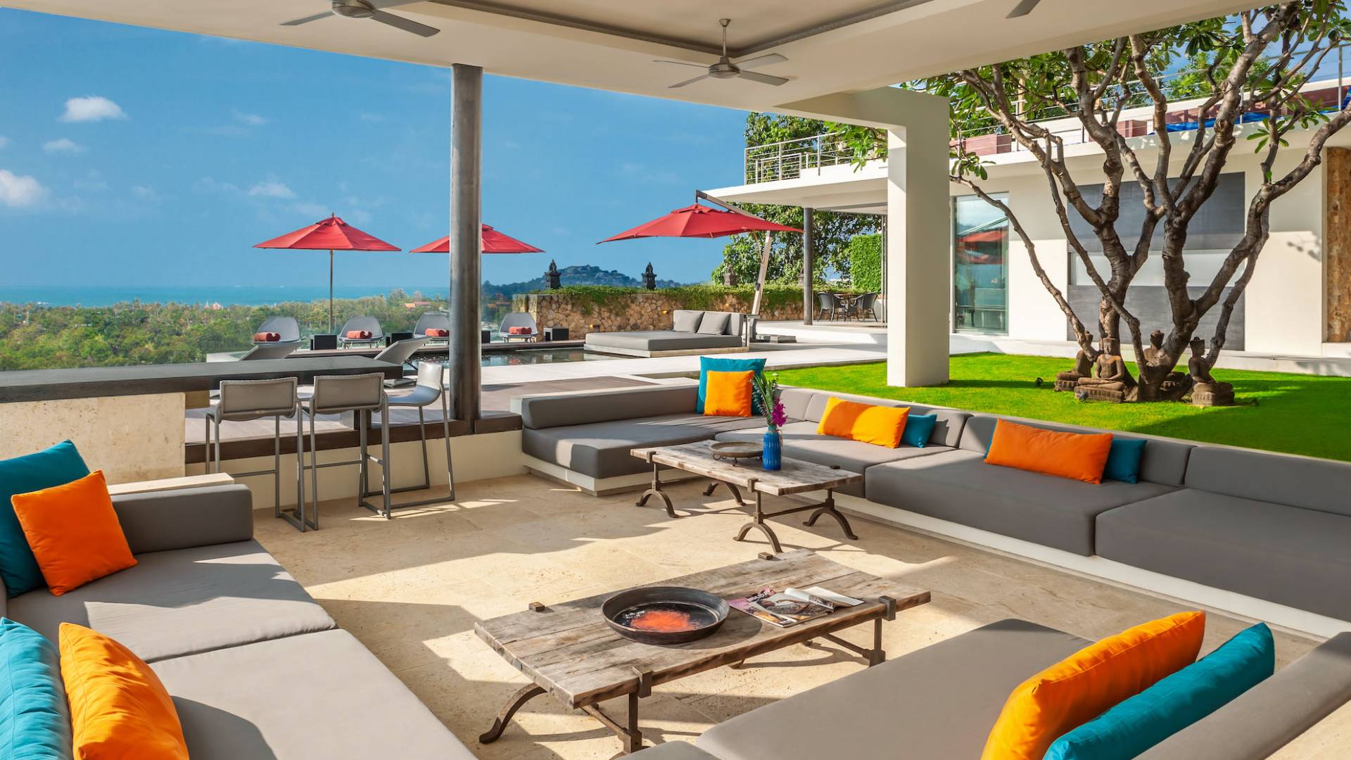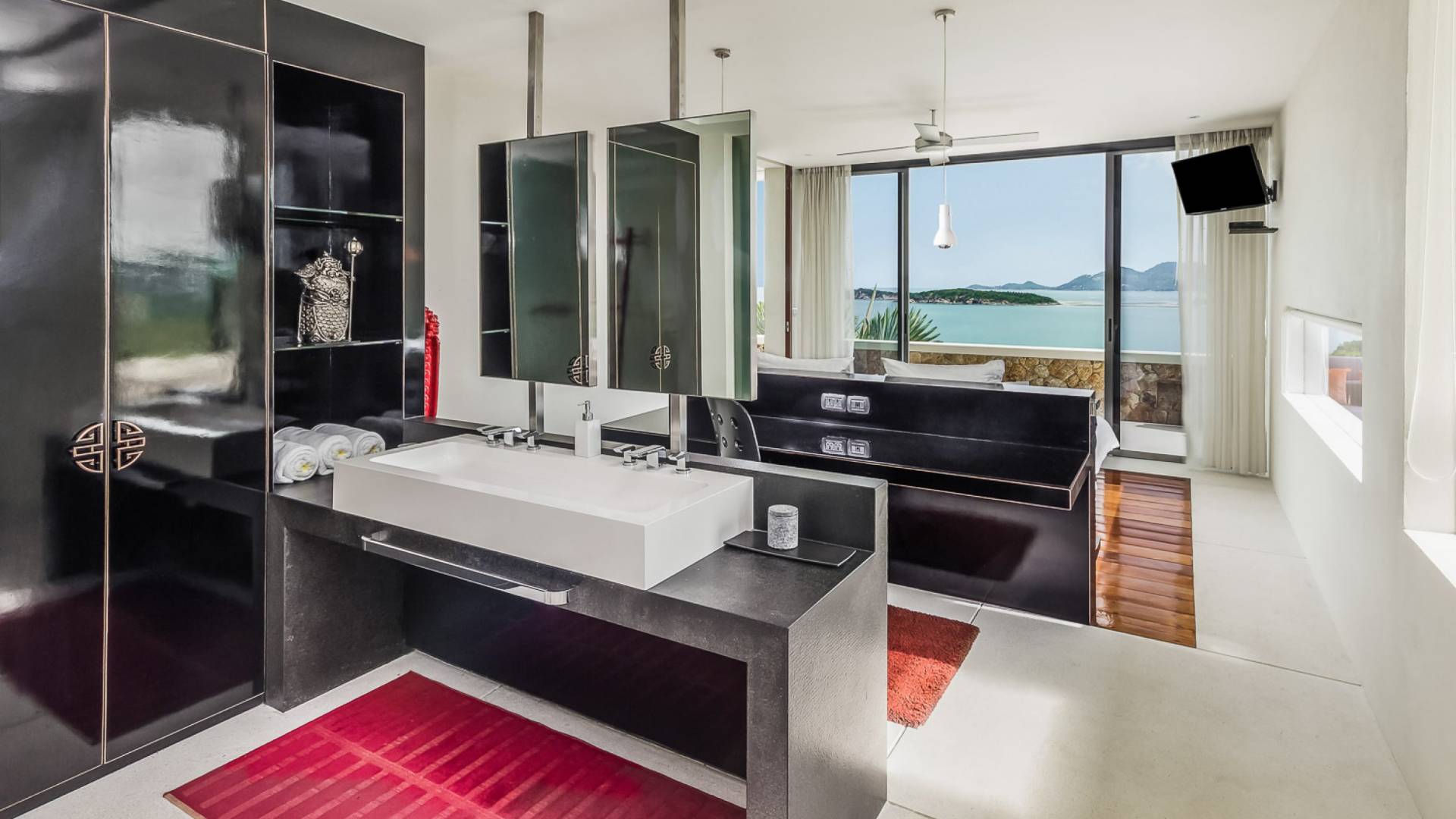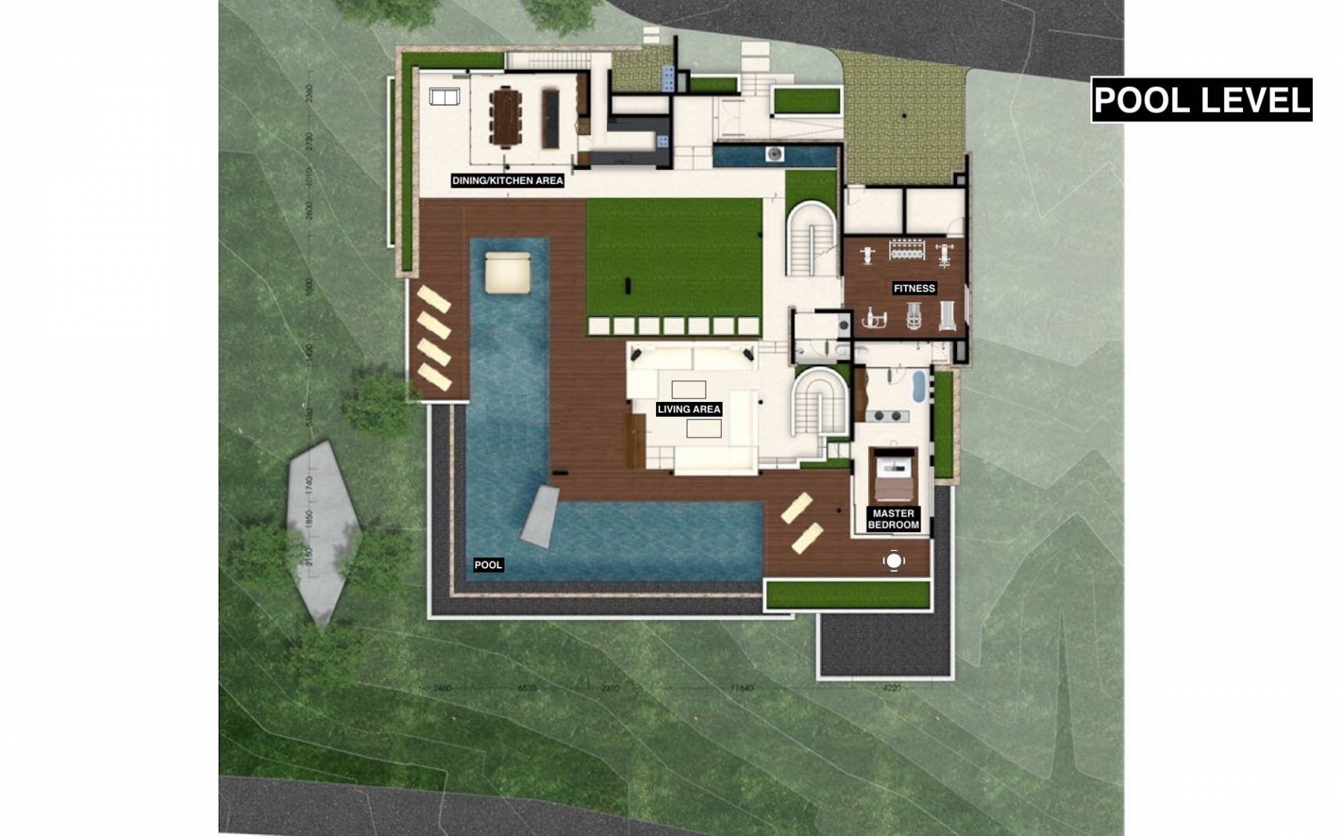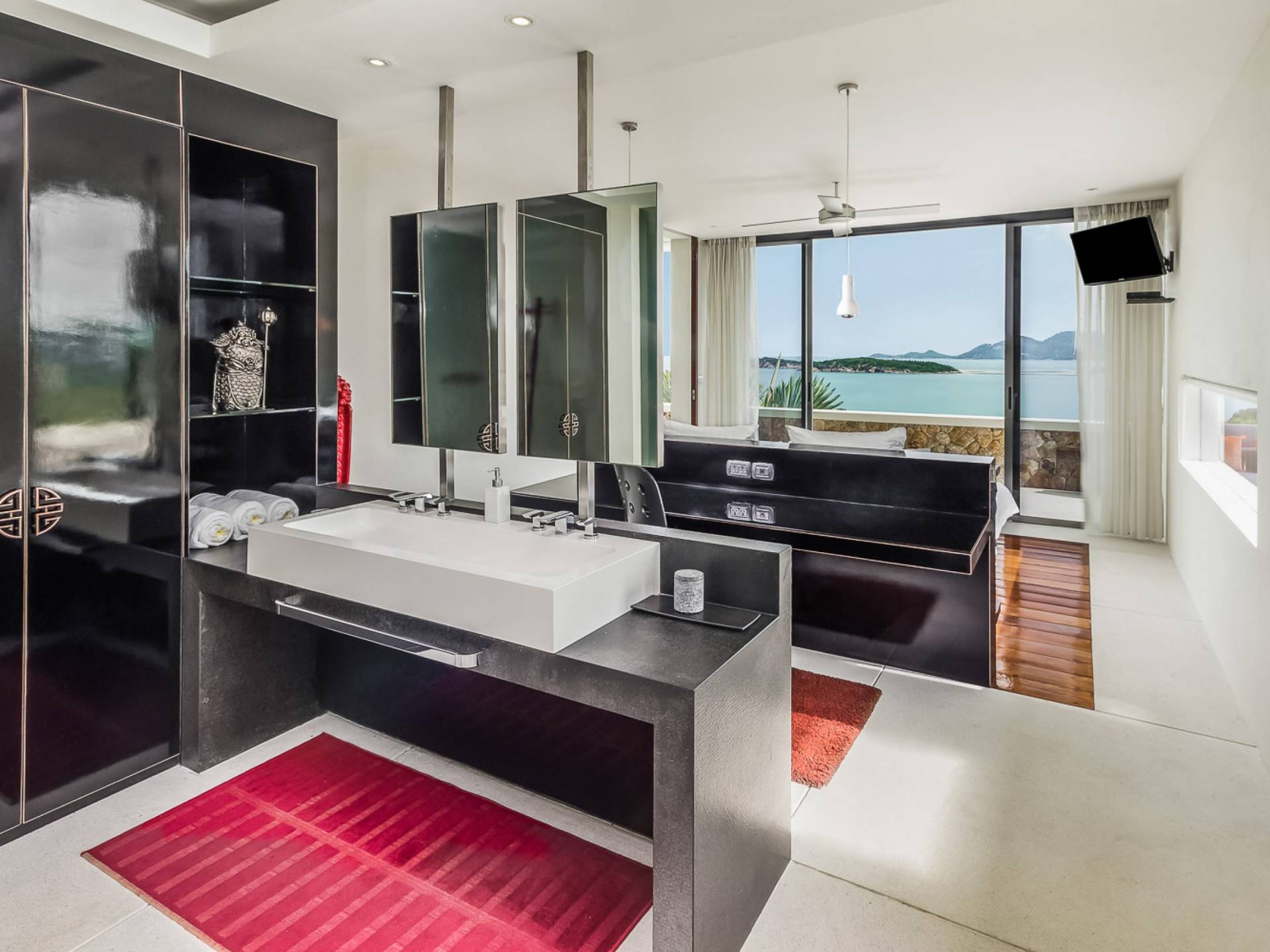 Der prächtige Eingang führt Sie in die Hauptebene oder „Pool-Ebene“ der Villa. Wenn Sie also durch die Vordertüren gehen, werden Sie mit einem atemberaubenden Blick konfrontiert, der Ihre Augen über den begrünten Innenhof, durch den Frangipani-Baum, über das versunkene Wohnzimmer und einen Teil des Pools in die herrliche Bucht und den dahinter liegenden Ozean führt . Das Esszimmer befindet sich auf einem Teil des Pools, der sich dann um die Bar und das Wohnzimmer windet und auf der Terrasse von Bett 1 endet. Sonnendecks sind um den Pool herum angeordnet, alle mit 180-Grad-Blick auf das Meer, die Berge und die Kokosnuss Felder, die man am besten liegend auf der riesigen, auf dem Wasser schwimmenden Liegeinsel genießt. Das versunkene Wohnzimmer ist von Tagesbetten umgeben, wobei die Bar an einem Ende über der Terrasse am Pool thront. Das voll ausgestattete Fitnessstudio blickt auf den Innenhof und den Pool und ist so positioniert, dass Sie sich angemessen schuldig fühlen, wenn Sie mit einem Cocktail in Reichweite am Pool liegen.