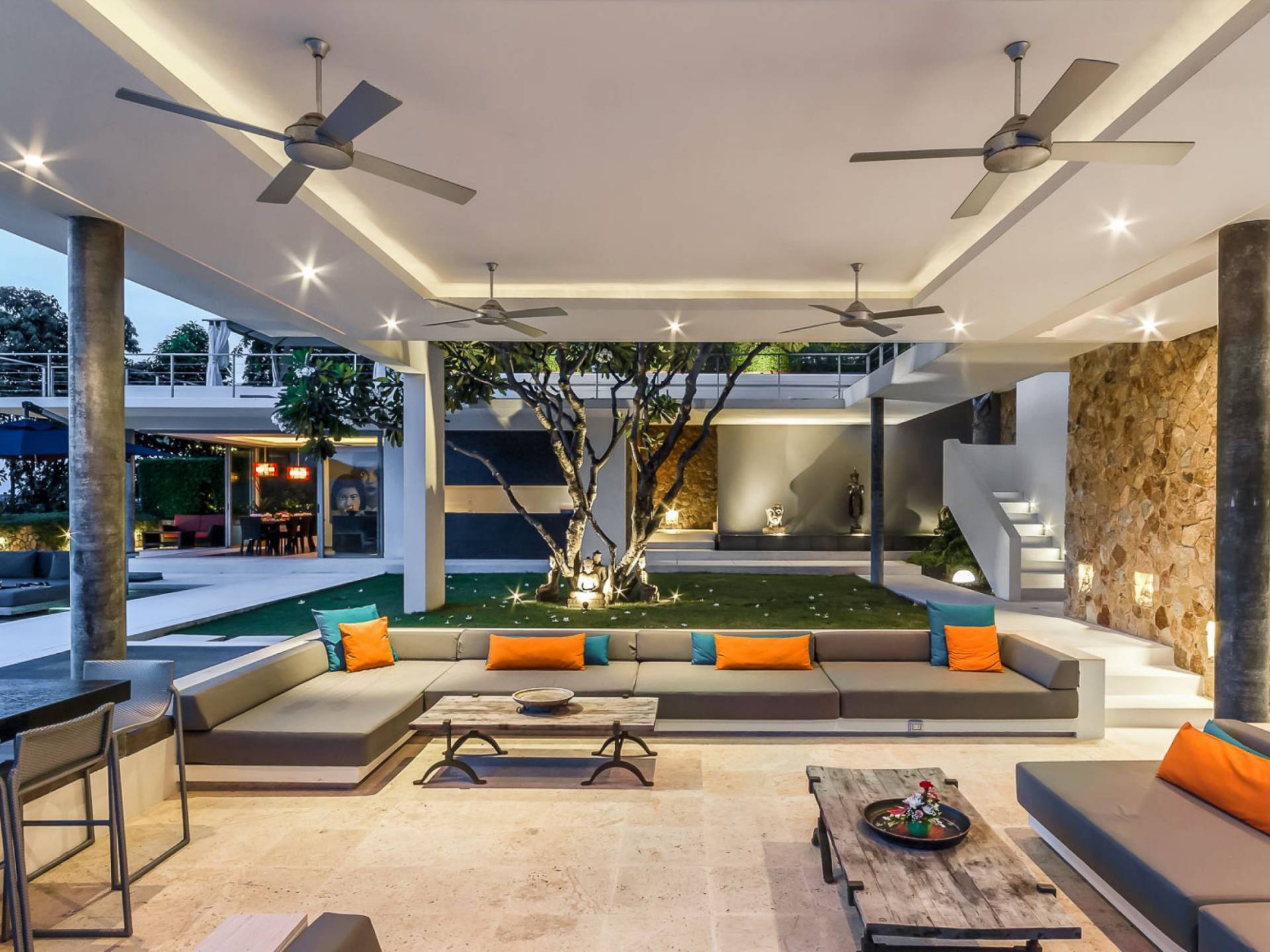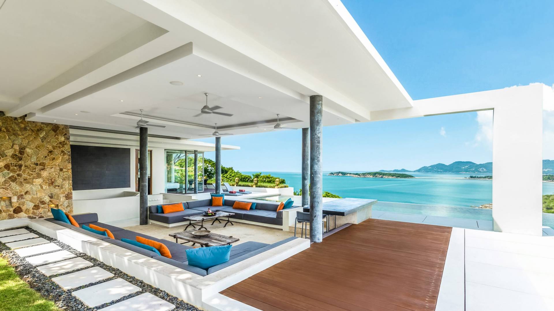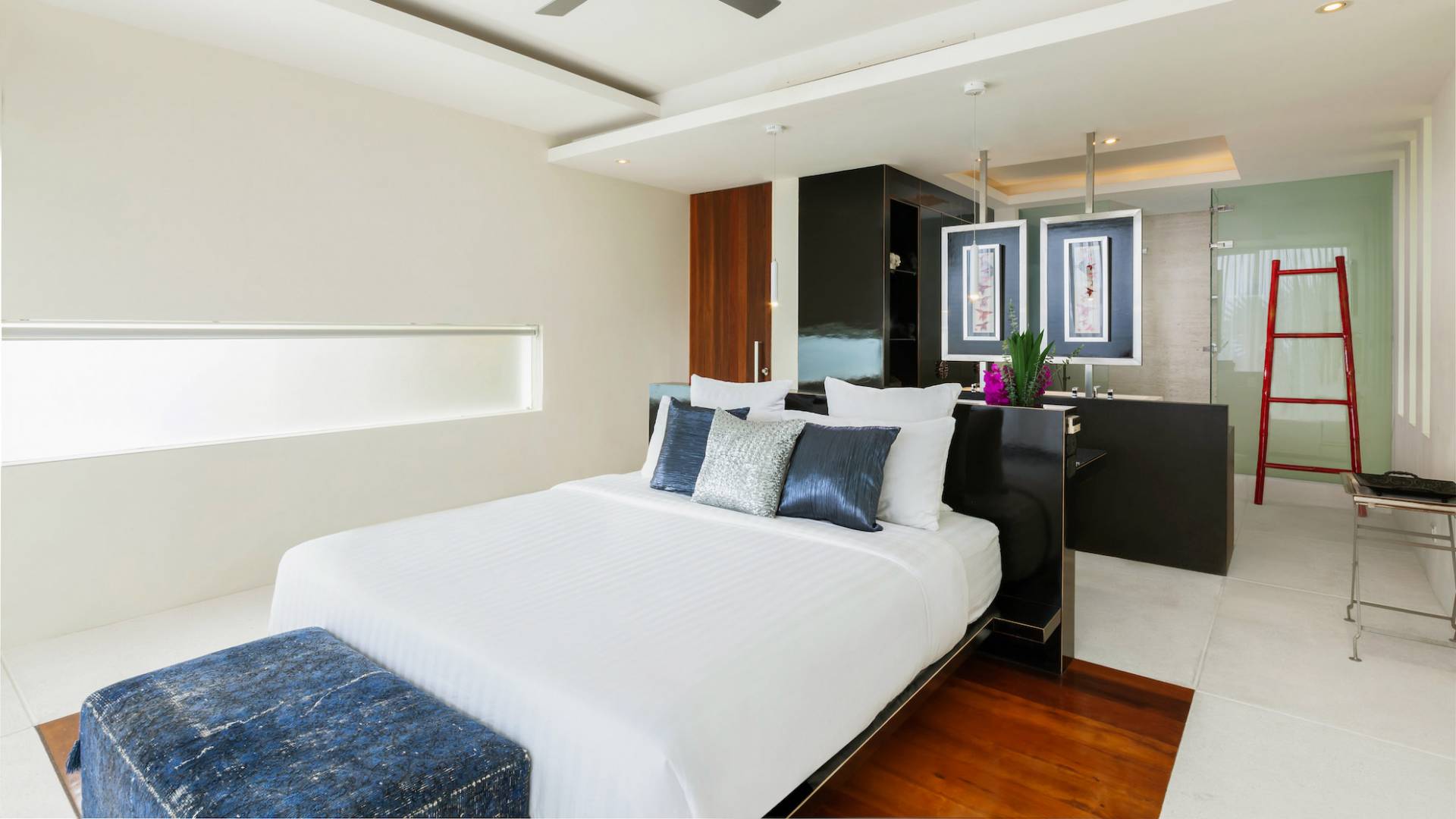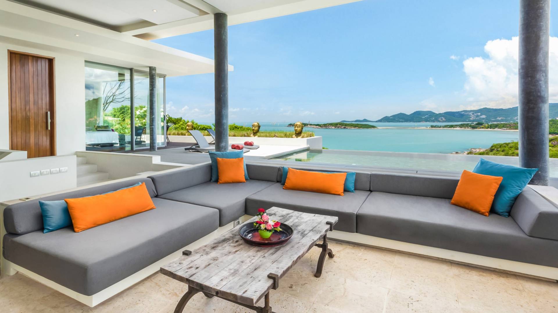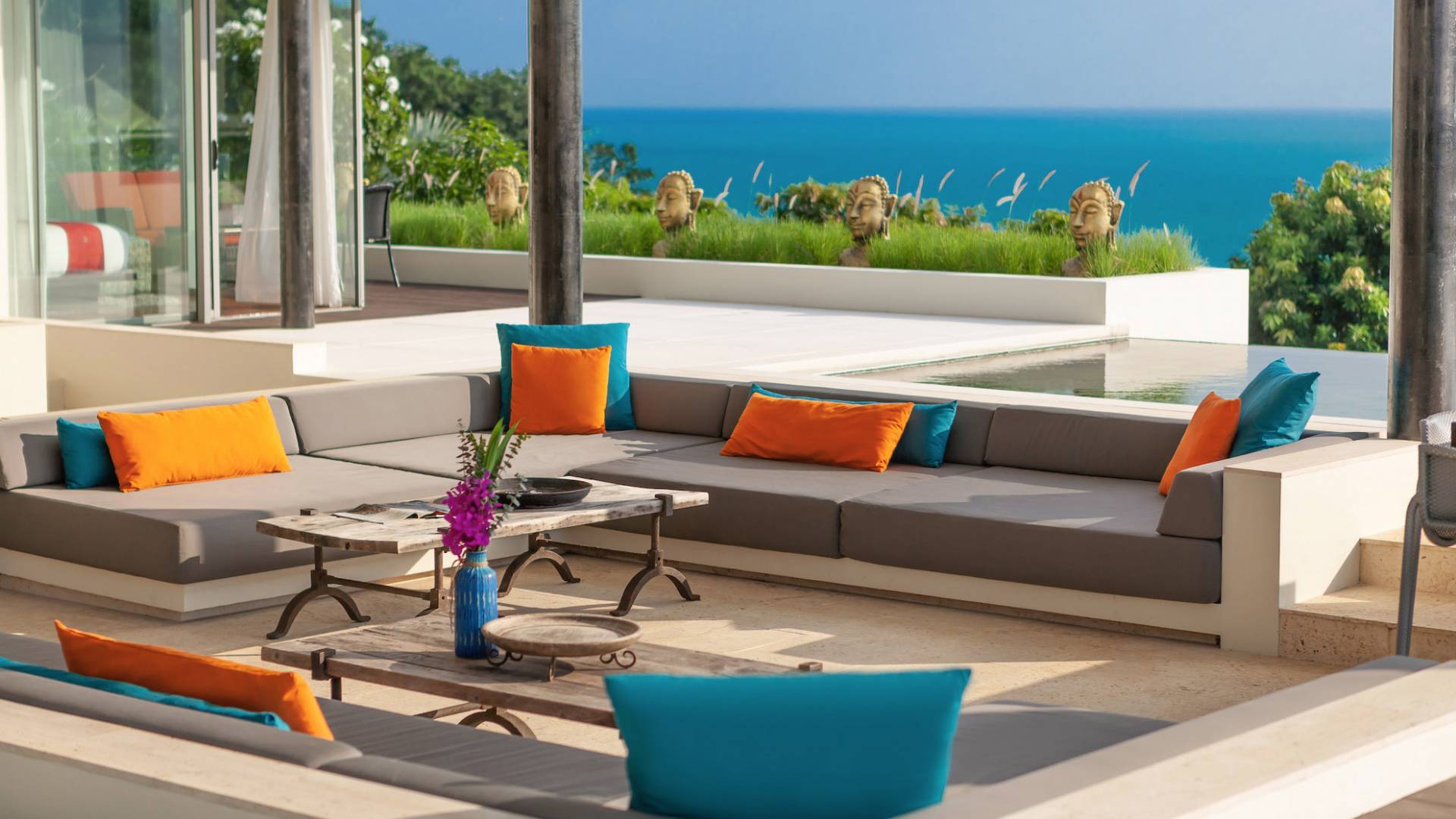 Der prächtige Eingang führt Sie in die Hauptebene oder „Pool-Ebene“ der Villa. Wenn Sie also durch die Vordertüren gehen, werden Sie mit einem atemberaubenden Blick konfrontiert, der Ihre Augen über den begrünten Innenhof, durch den Frangipani-Baum, über das versunkene Wohnzimmer und einen Teil des Pools in die herrliche Bucht und den dahinter liegenden Ozean führt . Das Esszimmer befindet sich auf einem Teil des Pools, der sich dann um die Bar und das Wohnzimmer windet und auf der Terrasse von Bett 1 endet. Sonnendecks sind um den Pool herum angeordnet, alle mit 180-Grad-Blick auf das Meer, die Berge und die Kokosnuss Felder, die man am besten liegend auf der riesigen, auf dem Wasser schwimmenden Liegeinsel genießt. Das versunkene Wohnzimmer ist von Tagesbetten umgeben, wobei die Bar an einem Ende über der Terrasse am Pool thront. Das voll ausgestattete Fitnessstudio blickt auf den Innenhof und den Pool und ist so positioniert, dass Sie sich angemessen schuldig fühlen, wenn Sie mit einem Cocktail in Reichweite am Pool liegen.