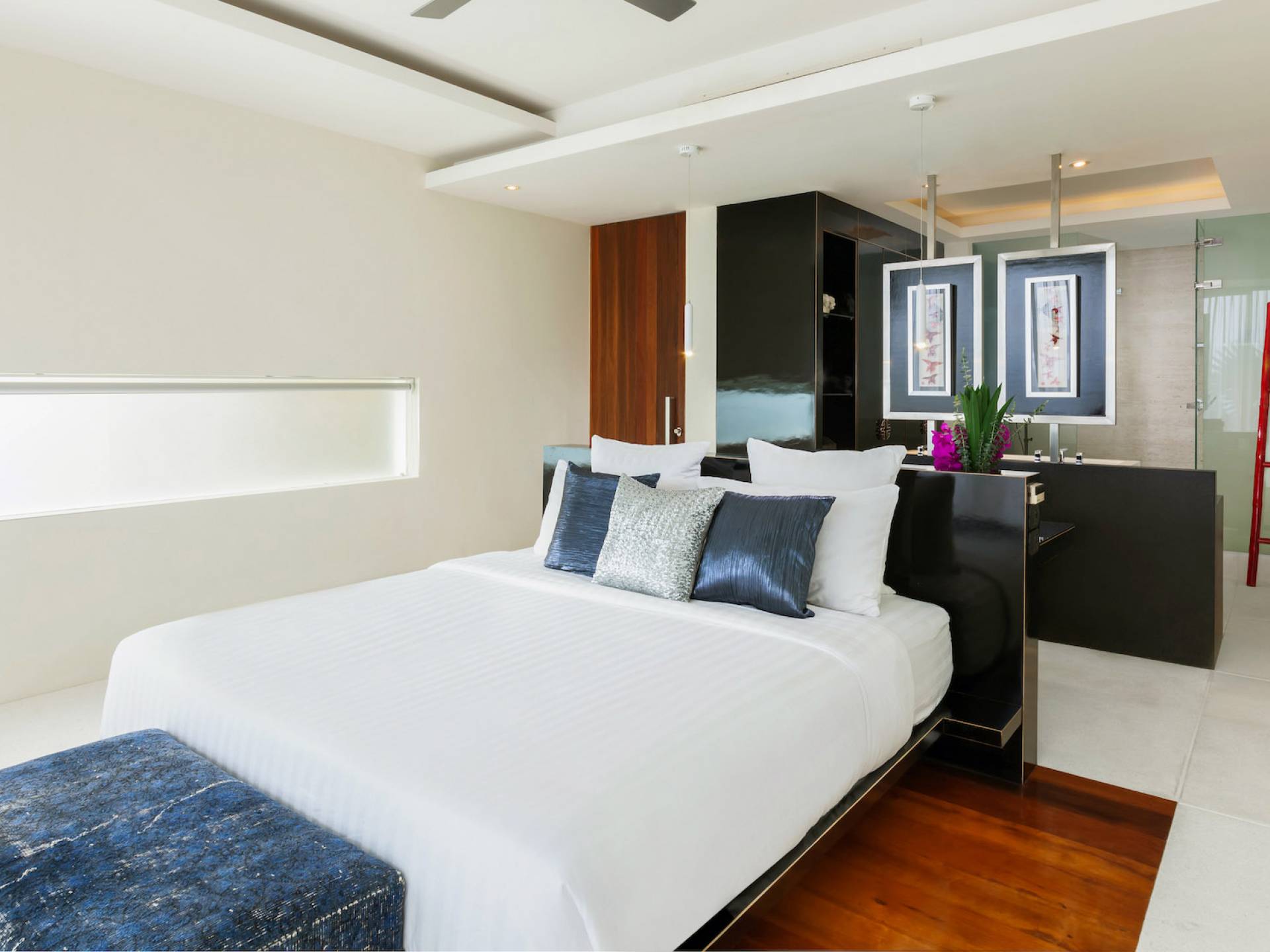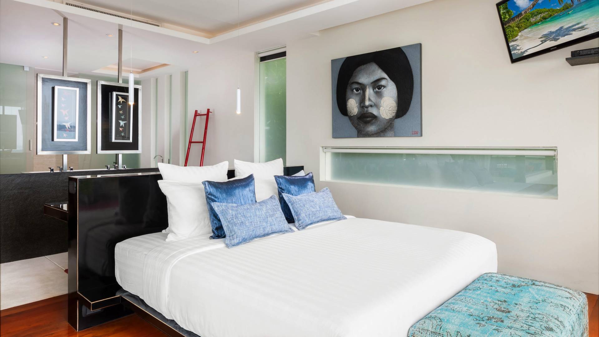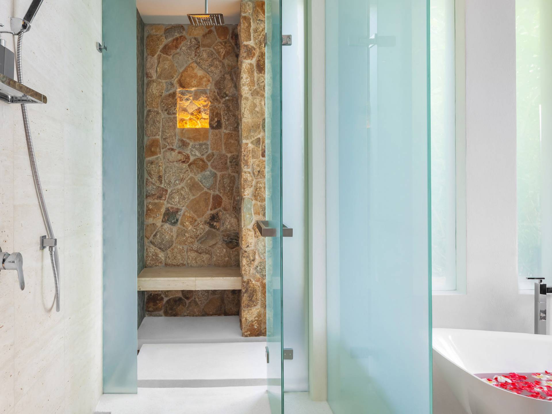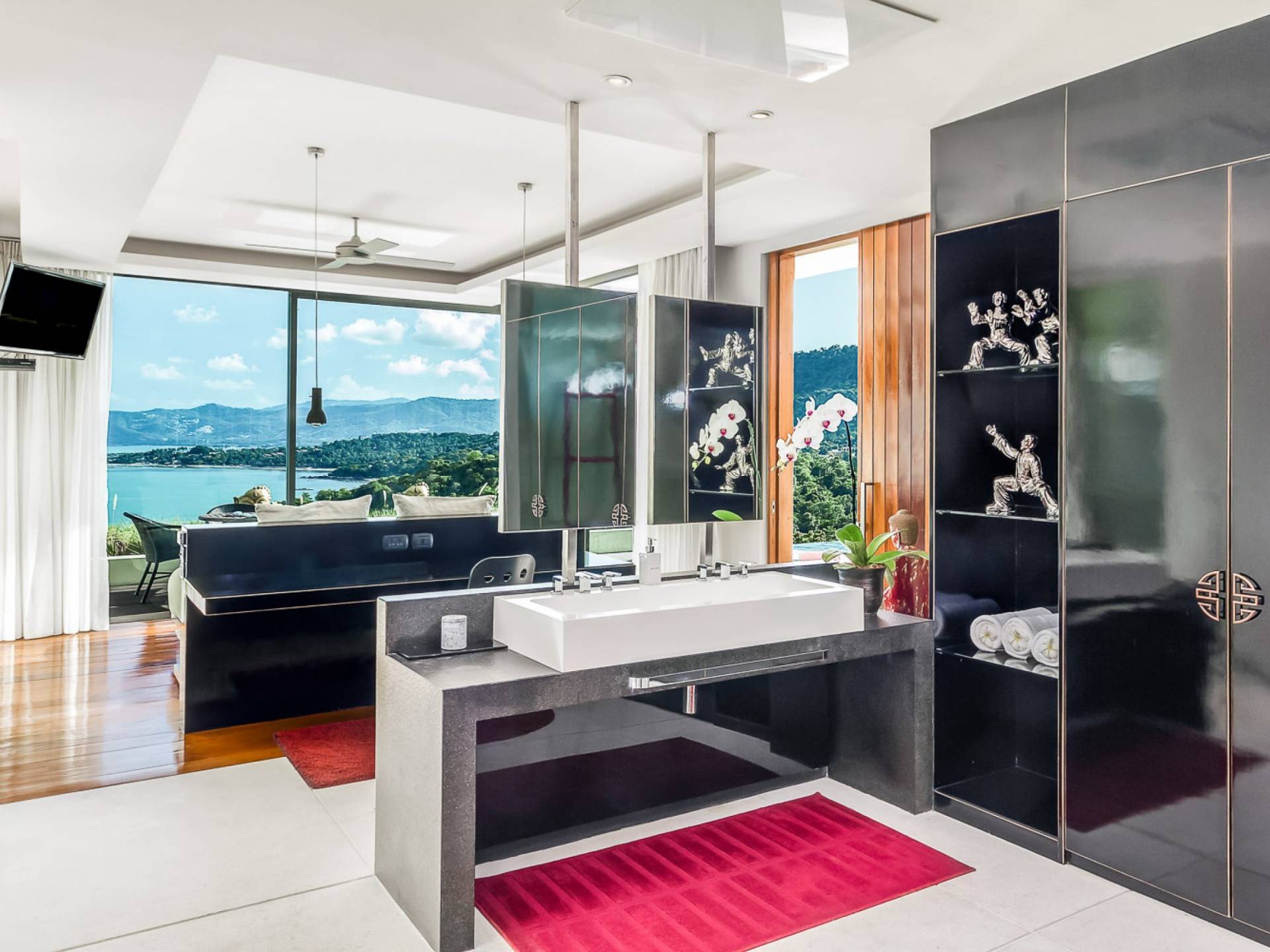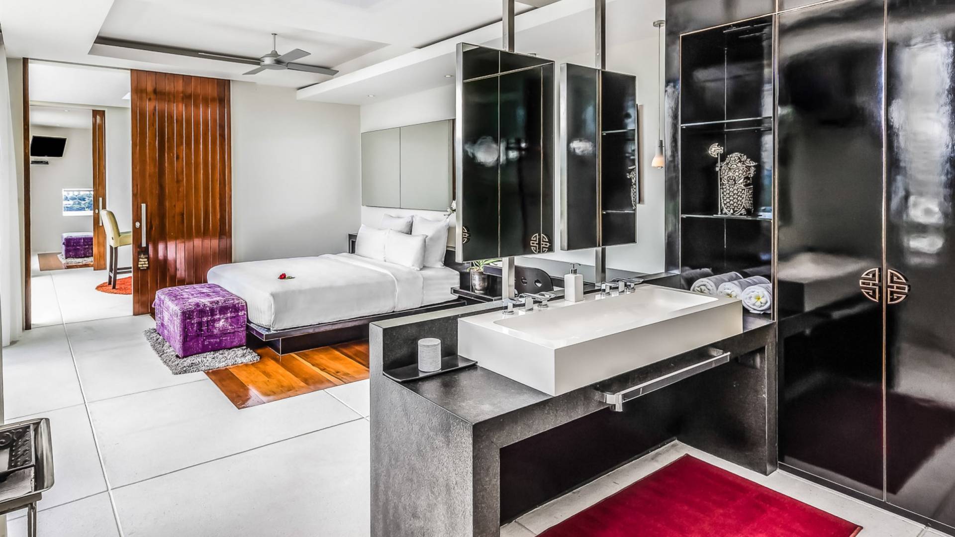 Der prächtige Eingang führt Sie in die Hauptebene oder „Pool-Ebene“ der Villa. Wenn Sie also durch die Vordertüren gehen, werden Sie mit einem atemberaubenden Blick konfrontiert, der Ihre Augen über den begrünten Innenhof, durch den Frangipani-Baum, über das versunkene Wohnzimmer und einen Teil des Pools in die herrliche Bucht und den dahinter liegenden Ozean führt . Das Esszimmer befindet sich auf einem Teil des Pools, der sich dann um die Bar und das Wohnzimmer windet und auf der Terrasse von Bett 1 endet. Sonnendecks sind um den Pool herum angeordnet, alle mit 180-Grad-Blick auf das Meer, die Berge und die Kokosnuss Felder, die man am besten liegend auf der riesigen, auf dem Wasser schwimmenden Liegeinsel genießt. Das versunkene Wohnzimmer ist von Tagesbetten umgeben, wobei die Bar an einem Ende über der Terrasse am Pool thront. Das voll ausgestattete Fitnessstudio blickt auf den Innenhof und den Pool und ist so positioniert, dass Sie sich angemessen schuldig fühlen, wenn Sie mit einem Cocktail in Reichweite am Pool liegen.