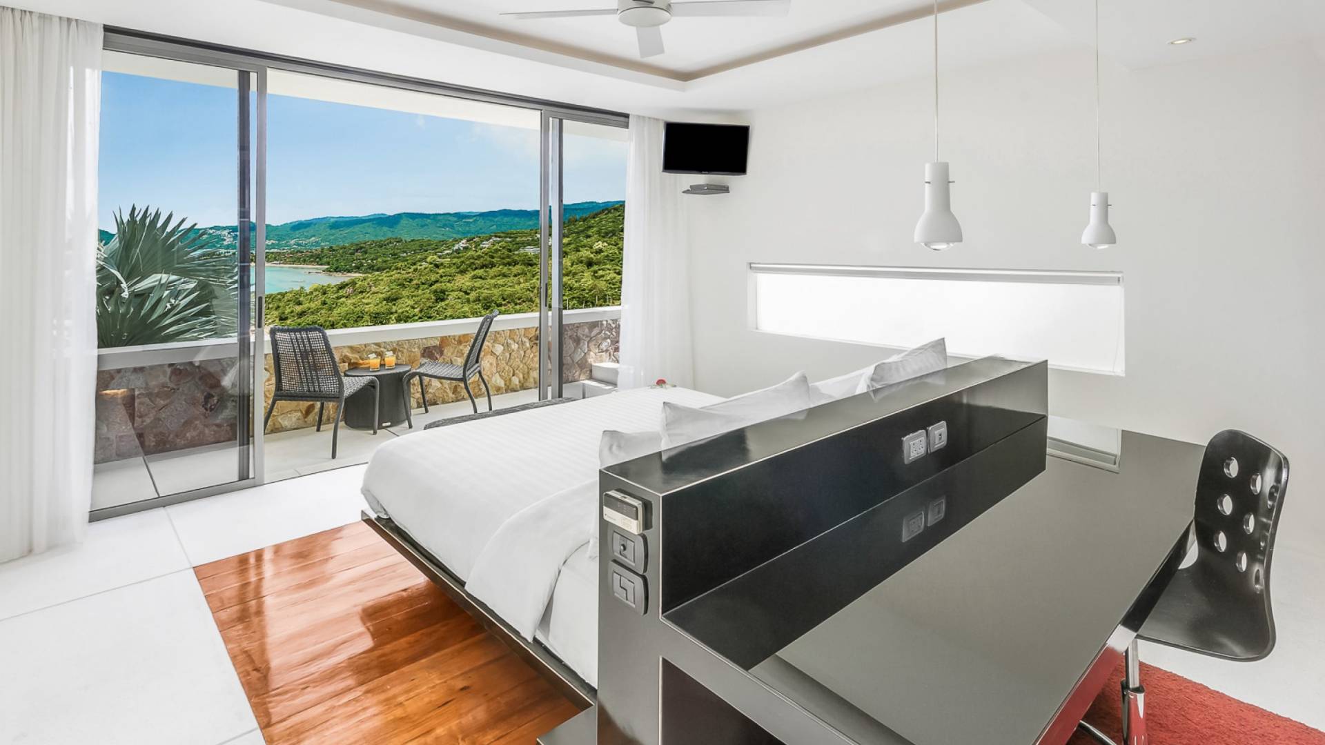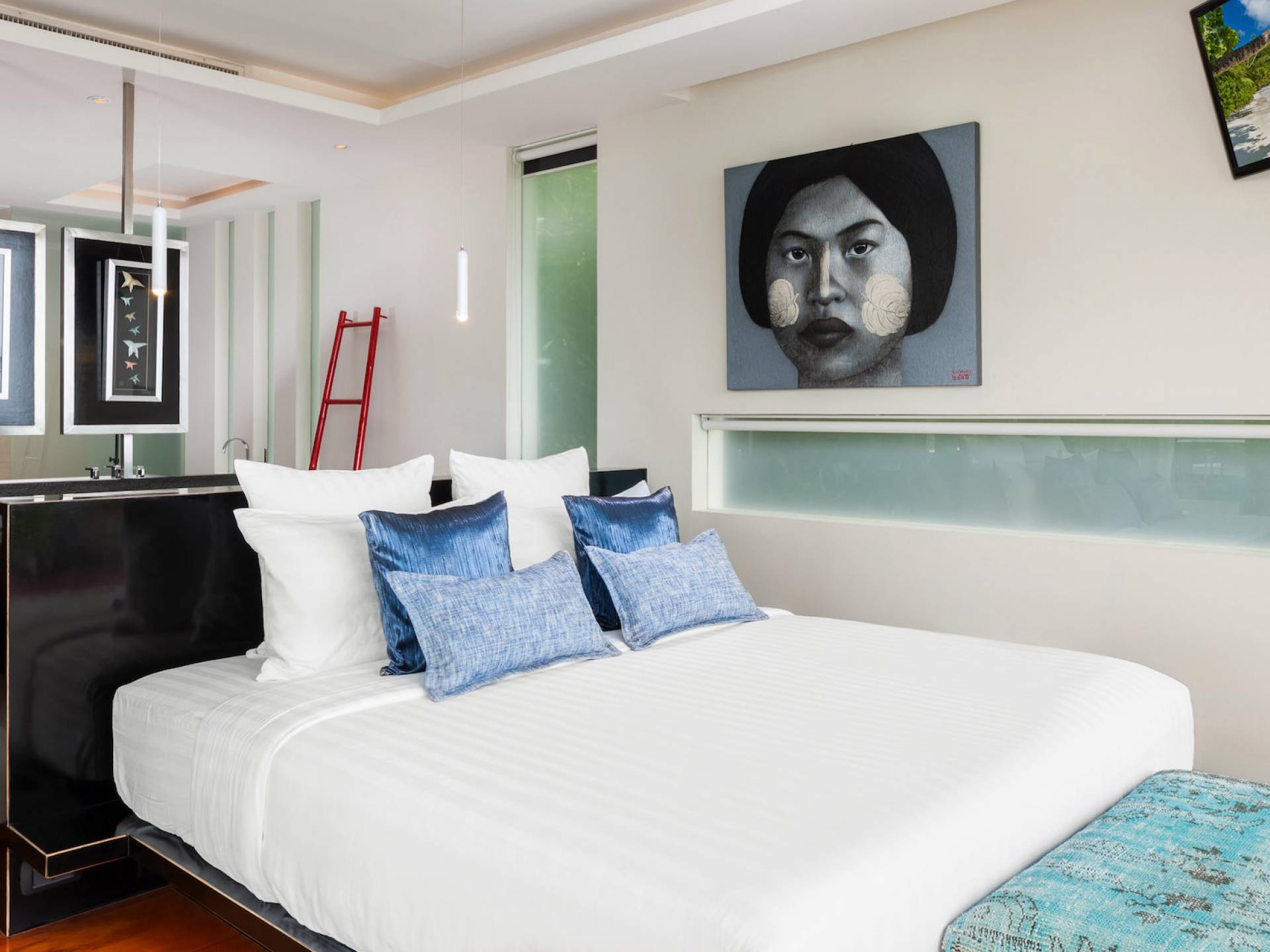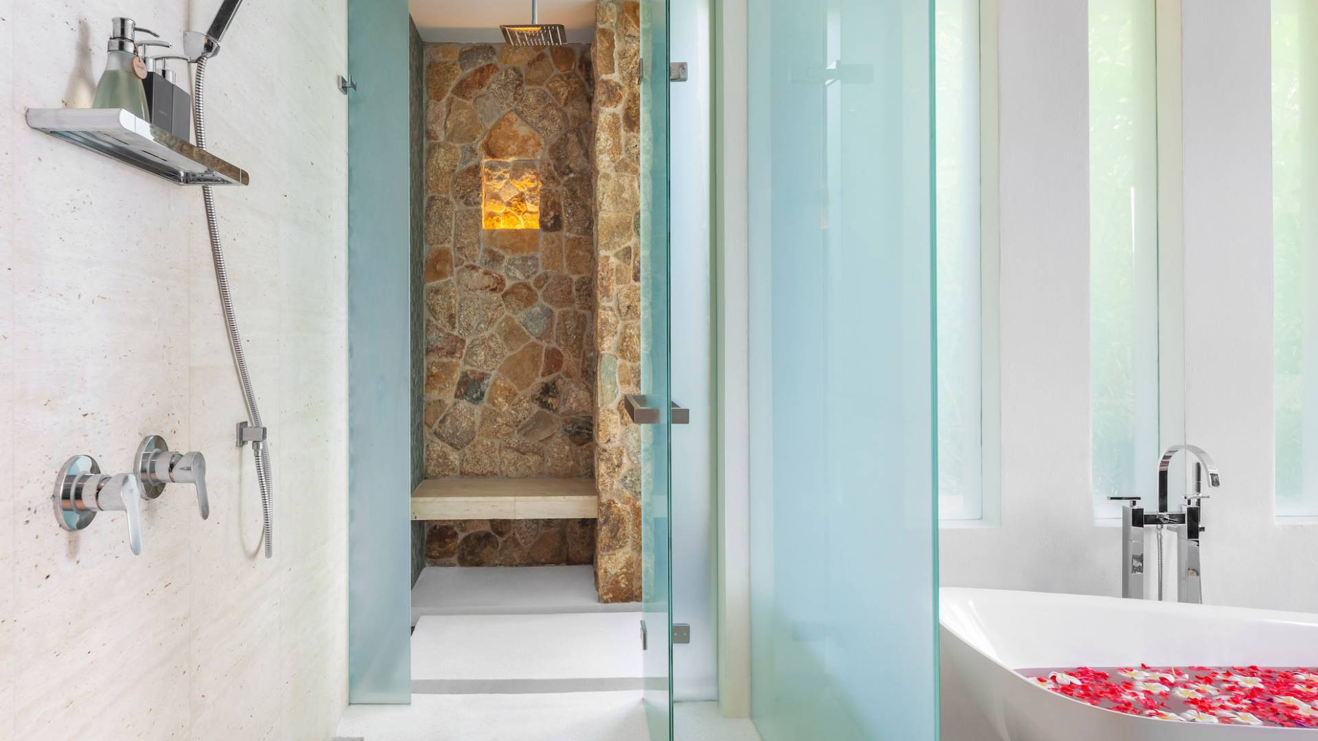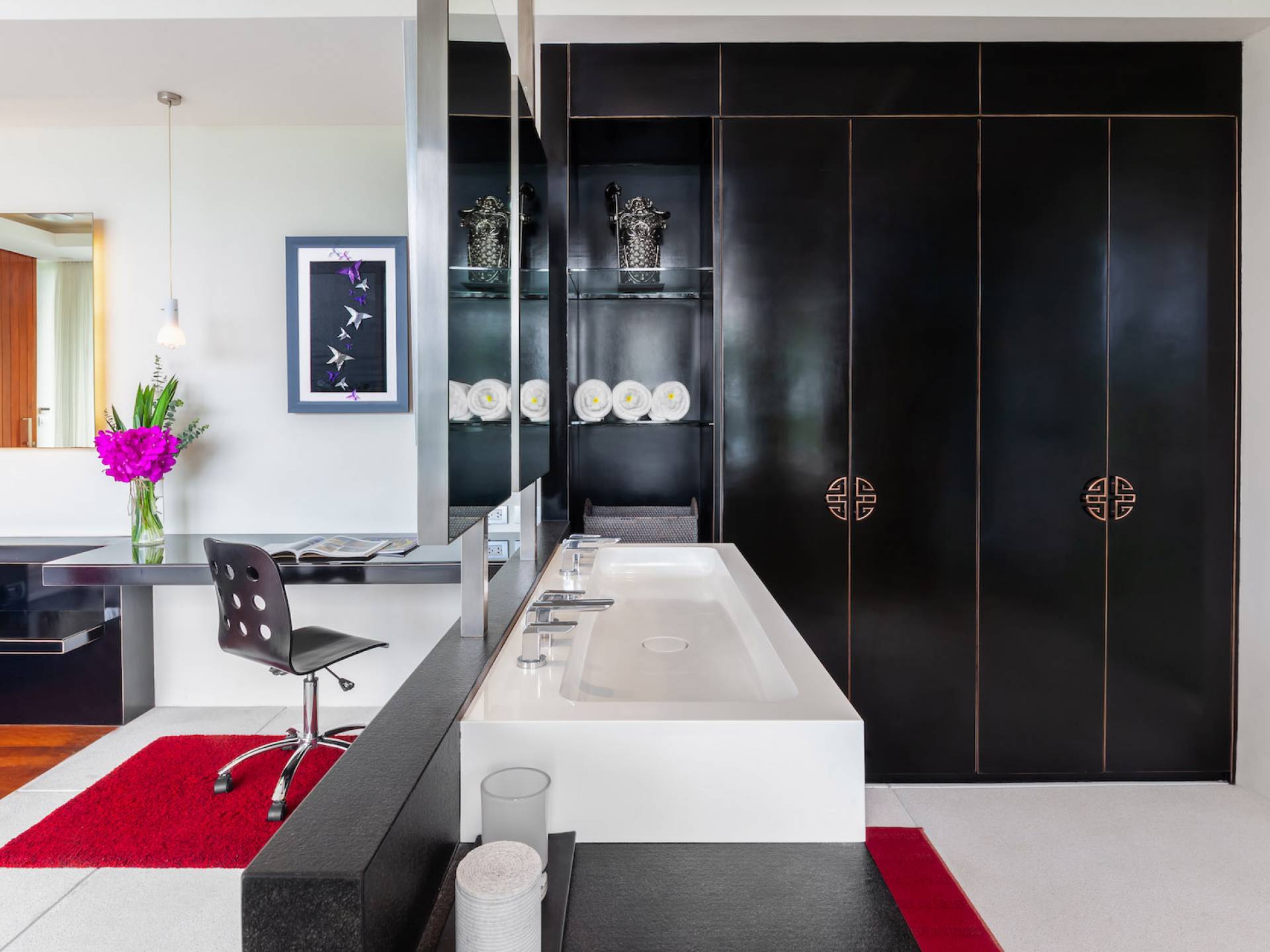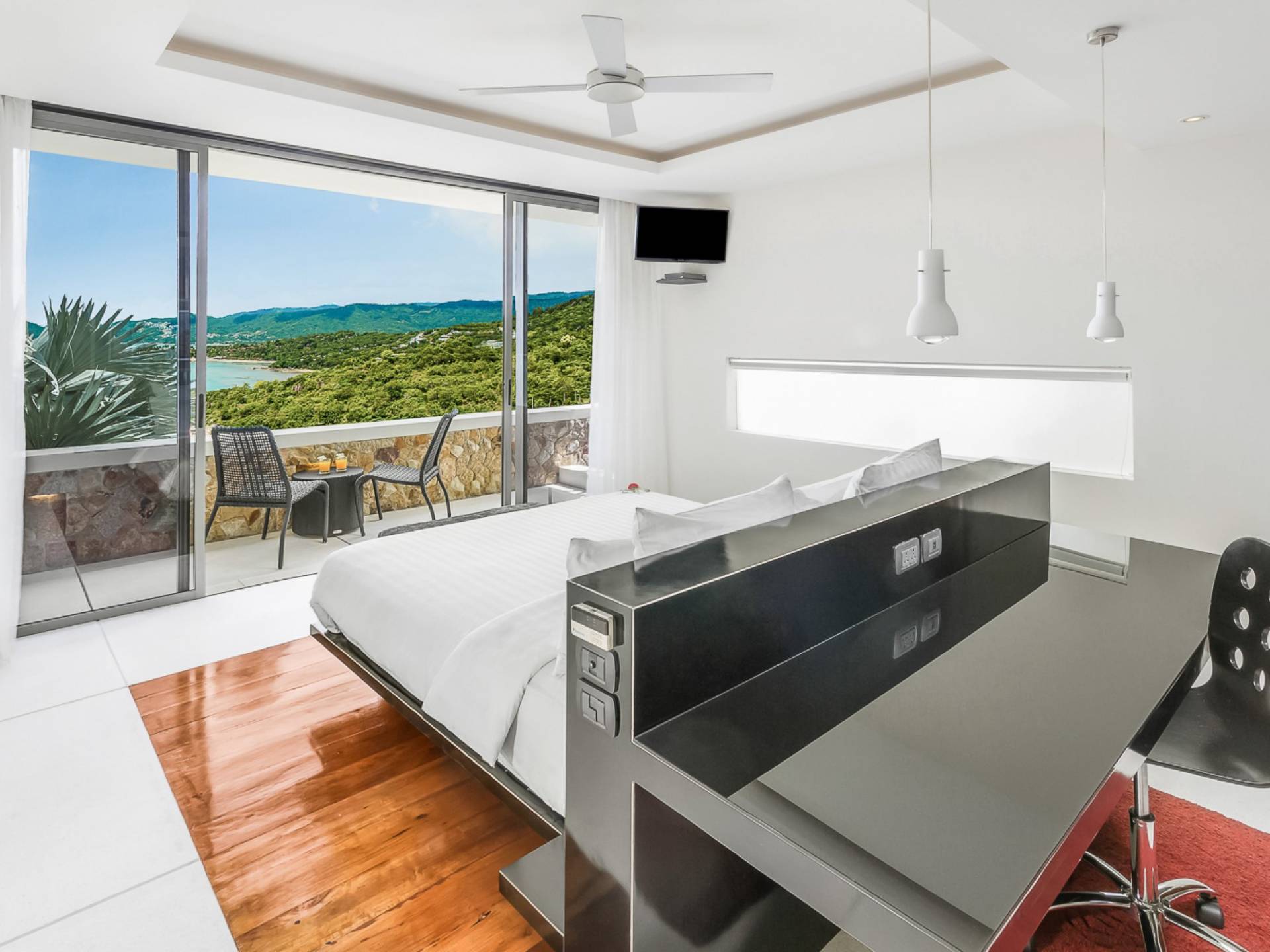 Der prächtige Eingang führt Sie in die Hauptebene oder „Pool-Ebene“ der Villa. Wenn Sie also durch die Vordertüren gehen, werden Sie mit einem atemberaubenden Blick konfrontiert, der Ihre Augen über den begrünten Innenhof, durch den Frangipani-Baum, über das versunkene Wohnzimmer und einen Teil des Pools in die herrliche Bucht und den dahinter liegenden Ozean führt . Das Esszimmer befindet sich auf einem Teil des Pools, der sich dann um die Bar und das Wohnzimmer windet und auf der Terrasse von Bett 1 endet. Sonnendecks sind um den Pool herum angeordnet, alle mit 180-Grad-Blick auf das Meer, die Berge und die Kokosnuss Felder, die man am besten liegend auf der riesigen, auf dem Wasser schwimmenden Liegeinsel genießt. Das versunkene Wohnzimmer ist von Tagesbetten umgeben, wobei die Bar an einem Ende über der Terrasse am Pool thront. Das voll ausgestattete Fitnessstudio blickt auf den Innenhof und den Pool und ist so positioniert, dass Sie sich angemessen schuldig fühlen, wenn Sie mit einem Cocktail in Reichweite am Pool liegen.