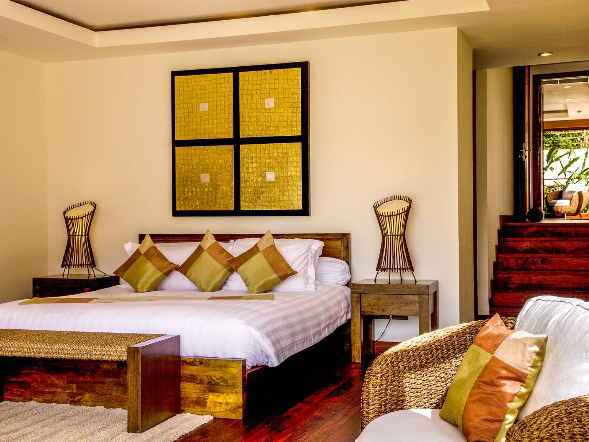 Rechts vom Esstisch befindet sich der Hauptschlafpavillon. Ein Schlafzimmer im Erdgeschoss hat auf zwei Seiten zu öffnende Türen, die in den begrünten Eingangsbereich führen. Dieses Zimmer verfügt über 2 Einzelbetten im modernen Stil und bequeme Korbstühle. Modische Accessoires wie Kunstwerke und Kissen haben ein lila Thema, das gut mit den weißen Laken kontrastiert. Das en-suite Badezimmer verfügt über ein Waschbecken aus beigem Marmor und ein Duschbad mit blauen Mosaikfliesen.