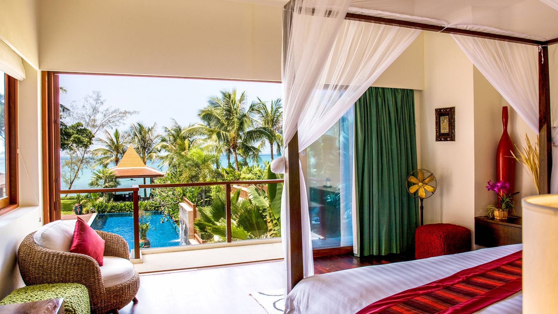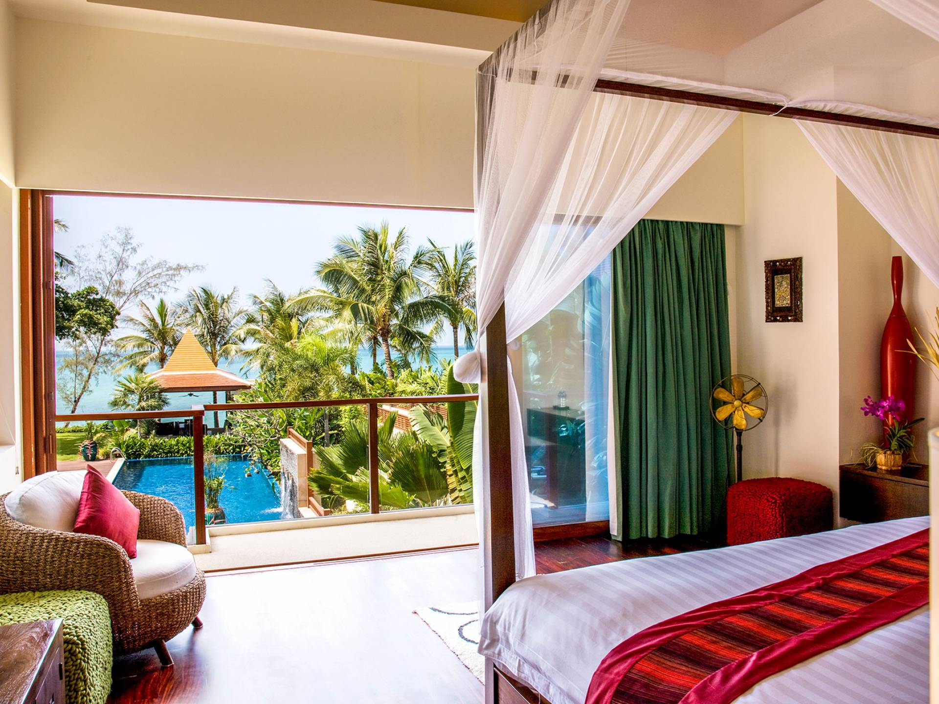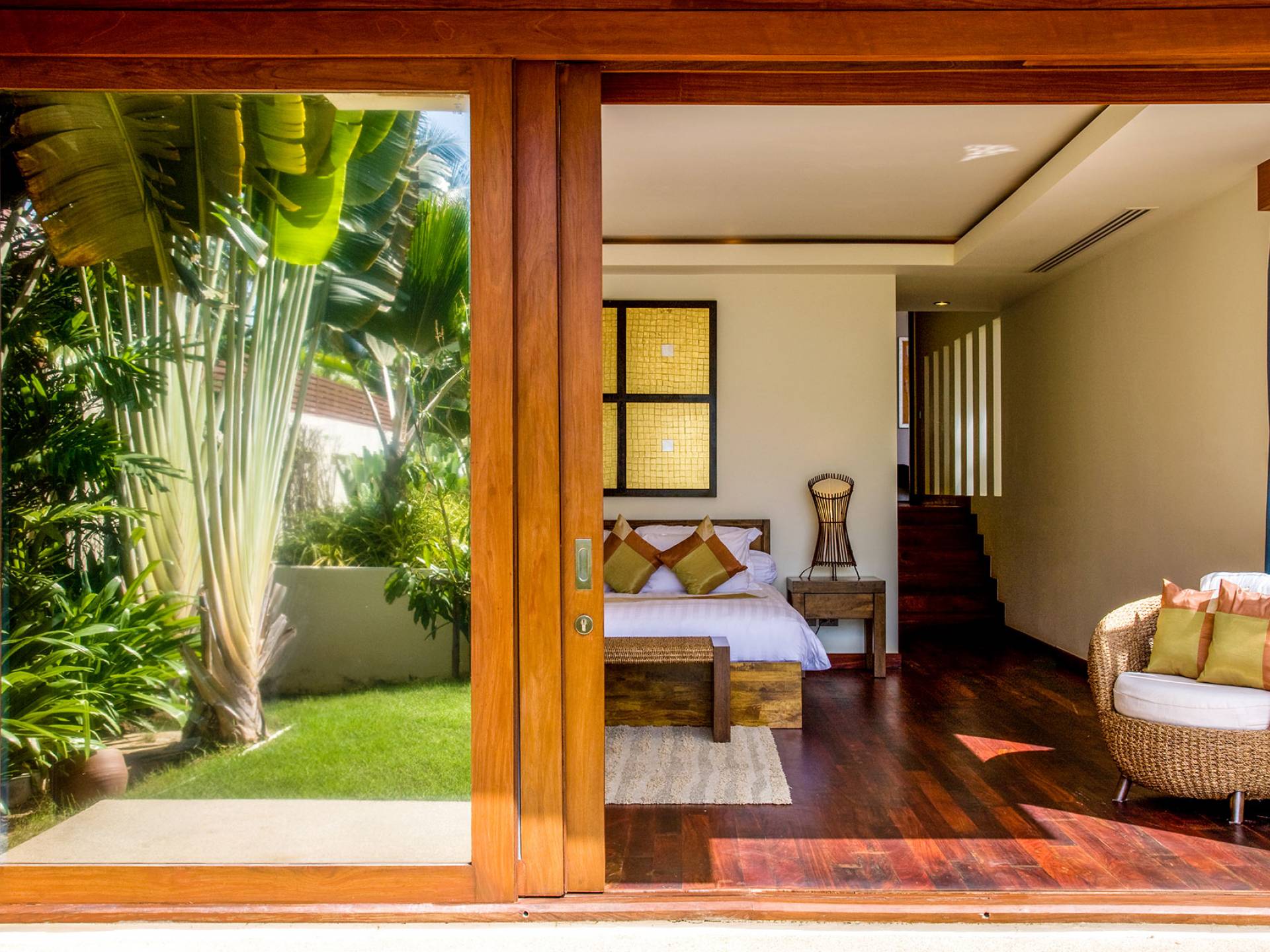 Das nächste Schlafzimmer im Erdgeschoss befindet sich an der Vorderseite mit Blick auf den Garten, den Pool und das Meer. Dieses Zimmer verfügt über ein Doppelbett und Stühle im Stil der anderen. Dieses Zimmer ist jedoch mit Kissen und Überwürfen aus grüner und pfirsichfarbener Seide ausgestattet. Ein Flachbildfernseher und ein begehbarer Ankleidebereich sind vorhanden und im Badezimmer gibt es ein Duschbad, zwei Waschbecken, eine freistehende Badewanne und einen Innengarten mit einer Außendusche.