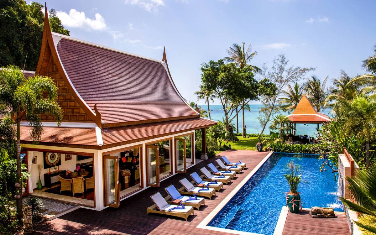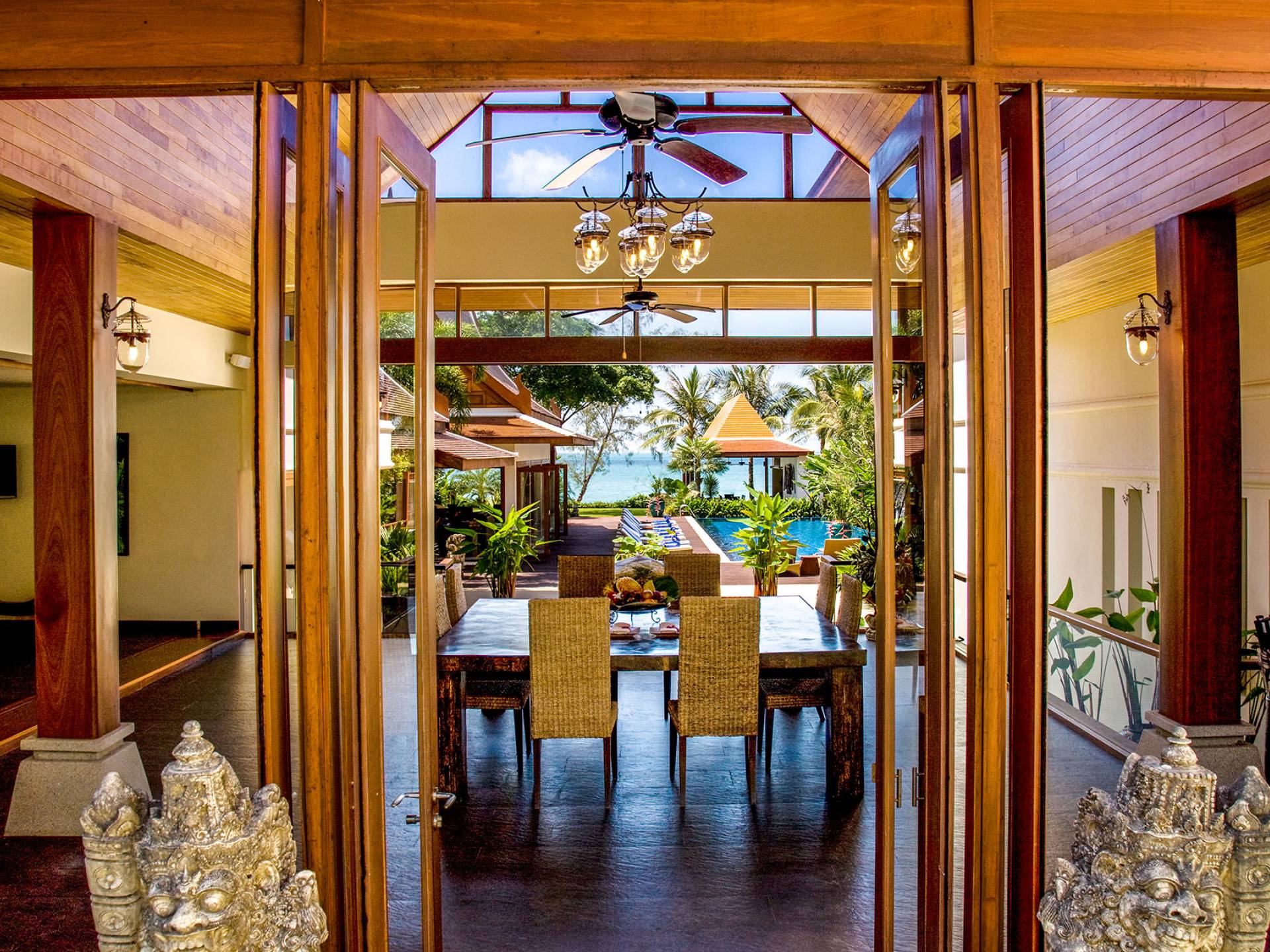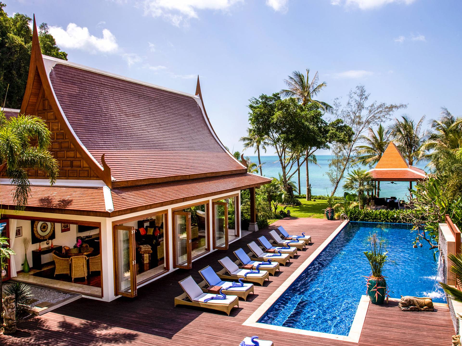 Rechts von diesem Pavillon befindet sich der riesige, blau geflieste Swimmingpool mit Wasserfall, der sich in einem überdachten Bereich mit Allwetter-Liegen und Sonnenschirmen befindet. Ein Weg führt zur Sala mit Bad, Küche und Grill, einem Massivholz-Esstisch mit Sitzbänken und Allwetter-Gartenmöbeln. Von hier führen Stufen an der Außendusche zu einem weiteren Garten und einem privaten Zugang zu einem unberührten weißen Sandstrand. Die Villa befindet sich in Sichtweite der Raja-Fähre, wo die Einheimischen von der Insel zum Festland pendeln. Der Fähranleger kann auch eine anständige Erinnerung daran sein, dass andere, wenn Sie in dieser friedlichen Umgebung leben, im geschäftigen Paralleluniversum reisen.