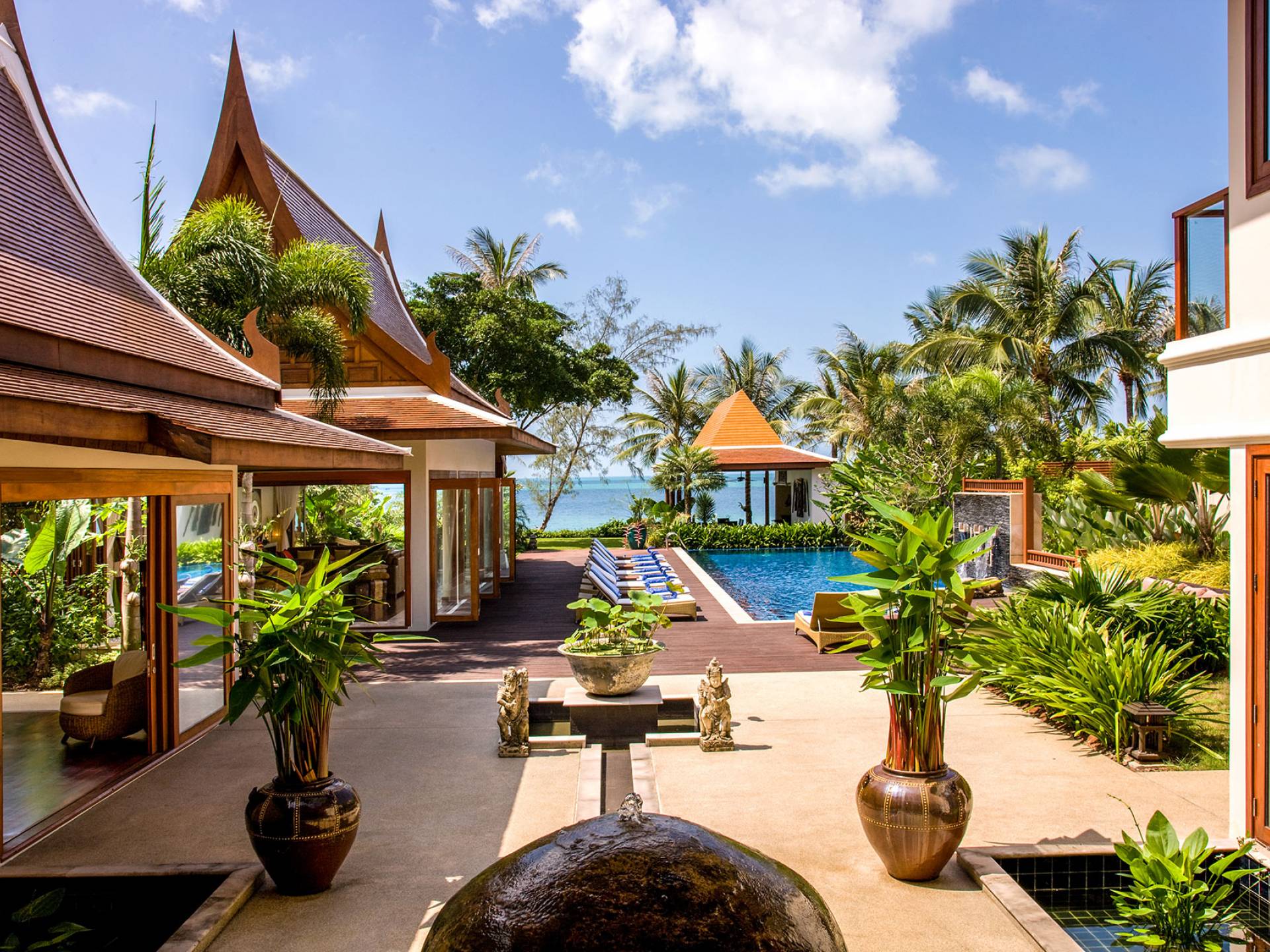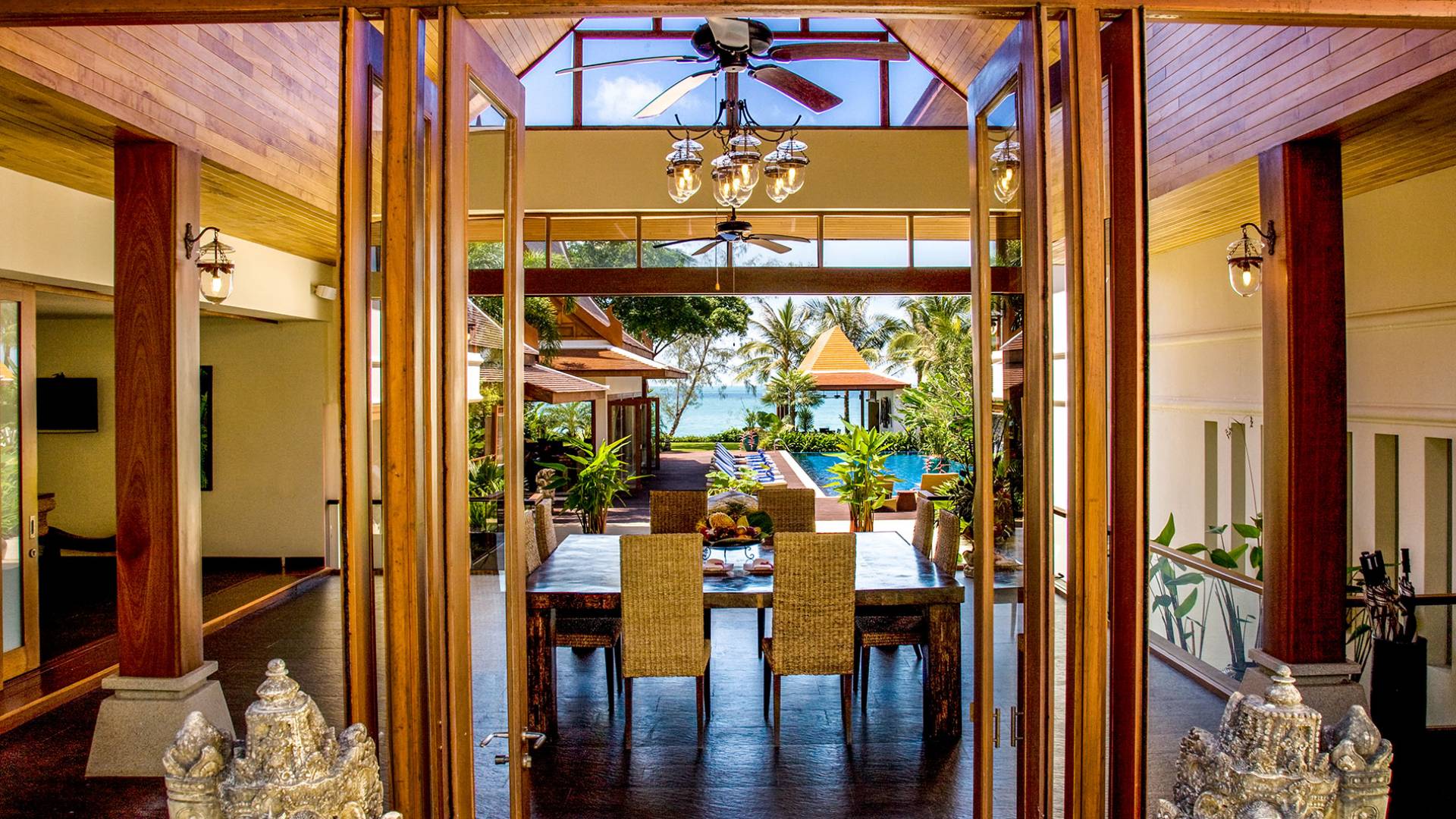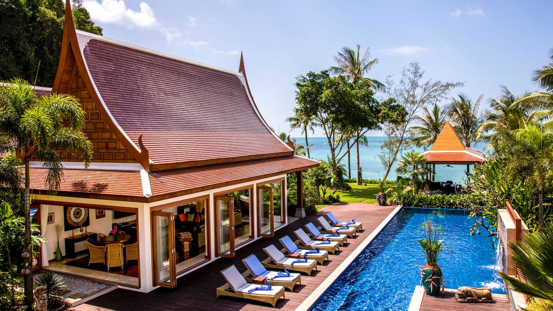 Rechts von diesem Pavillon befindet sich der riesige, blau geflieste Swimmingpool mit Wasserfall, der sich in einem überdachten Bereich mit Allwetter-Liegen und Sonnenschirmen befindet. Ein Weg führt zur Sala mit Bad, Küche und Grill, einem Massivholz-Esstisch mit Sitzbänken und Allwetter-Gartenmöbeln. Von hier führen Stufen an der Außendusche zu einem weiteren Garten und einem privaten Zugang zu einem unberührten weißen Sandstrand. Die Villa befindet sich in Sichtweite der Raja-Fähre, wo die Einheimischen von der Insel zum Festland pendeln. Der Fähranleger kann auch eine anständige Erinnerung daran sein, dass andere, wenn Sie in dieser friedlichen Umgebung leben, im geschäftigen Paralleluniversum reisen.