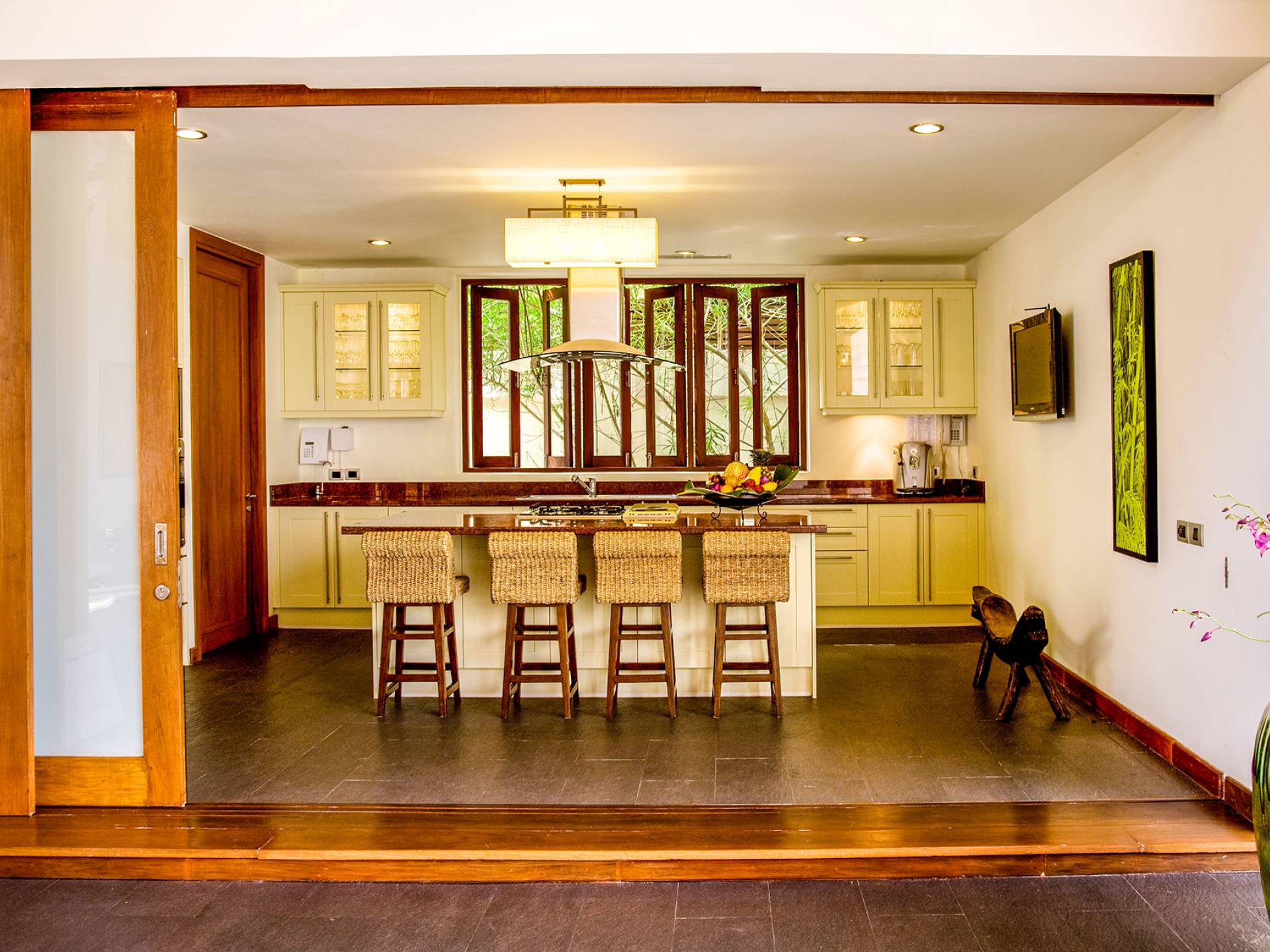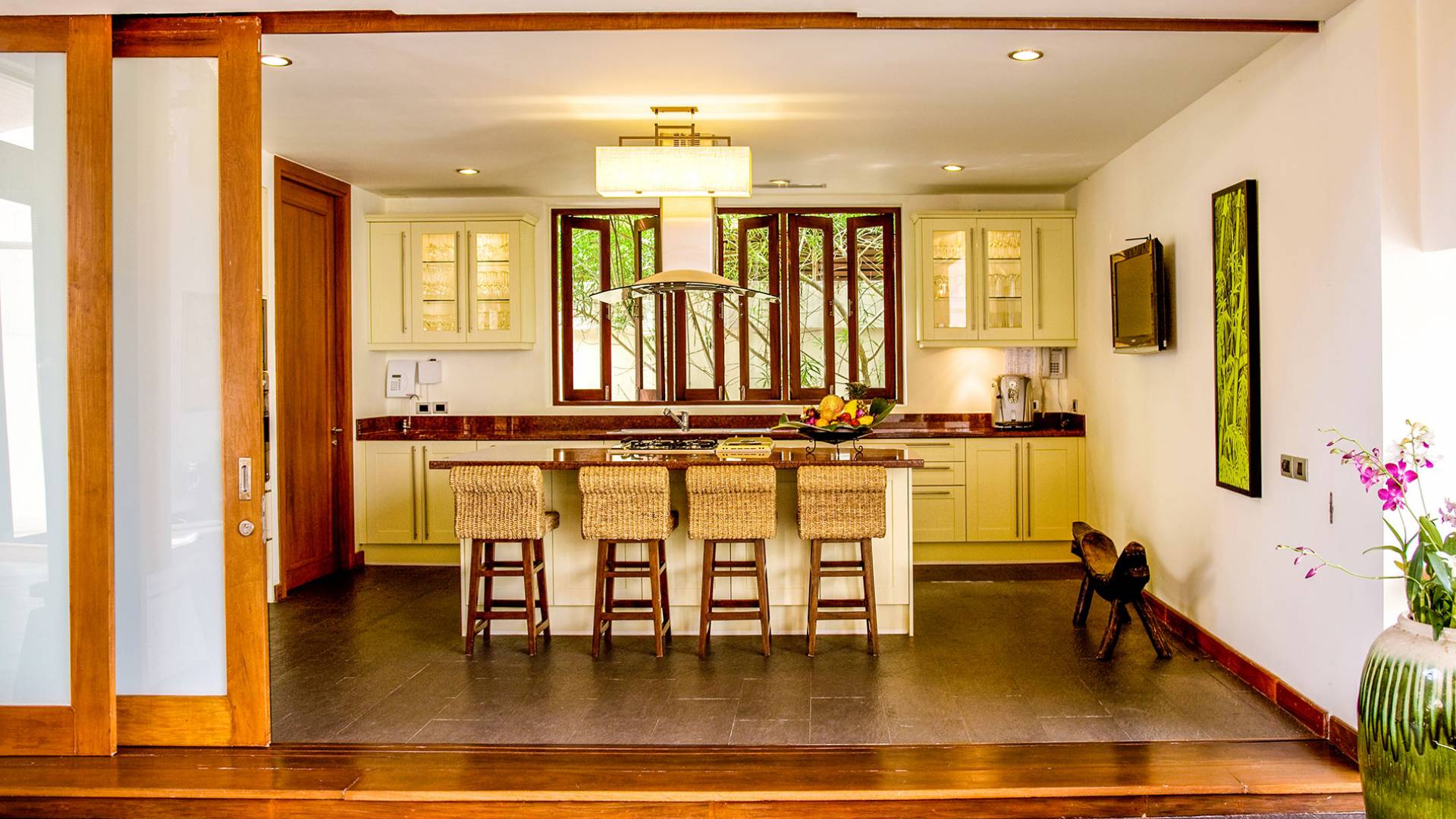 Der Essbereich wird von einem großen ovalen Esstisch aus dunklem Holz und Stühlen mit cremefarbenen Sitzkissen dominiert, die alle unter einer beeindruckenden Hängelampe aus Metall und Glas stehen. Links vom Tisch befindet sich eine sehr gut ausgestattete Küche mit Sahneschränken. Eine Mittelinsel enthält das Kochfeld und eine Frühstückstheke mit vier stilvoll gestalteten Hockern aus Holz und Wasserhyazinthe. Die Küche ist mit einem Flachbild-TV ausgestattet.