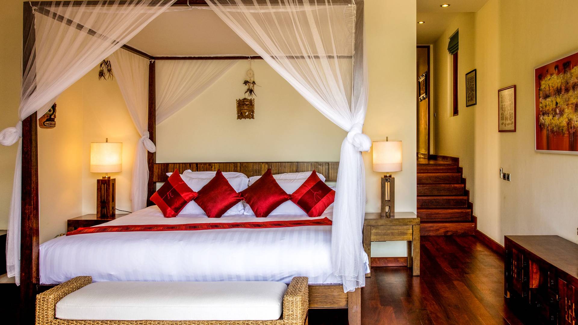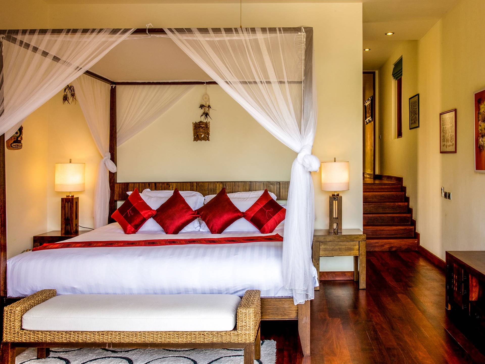 Eine Holztreppe zwischen diesen beiden Schlafzimmern führt vorbei an einem großen Buntglasfenster unter einer kunstvollen Hängelampe zu zwei weiteren Schlafzimmern. Links befindet sich ein weiteres Doppelzimmer mit Balkon und Blick auf den Eingangsgarten. Dieses Zimmer ist ebenfalls mit dem gleichen Möbelstil ausgestattet und verfügt über ein braunes und cremefarbenes Farbschema. Im Badezimmer ist die Dusche mit lila und lila Mosaikfliesen ausgestattet.