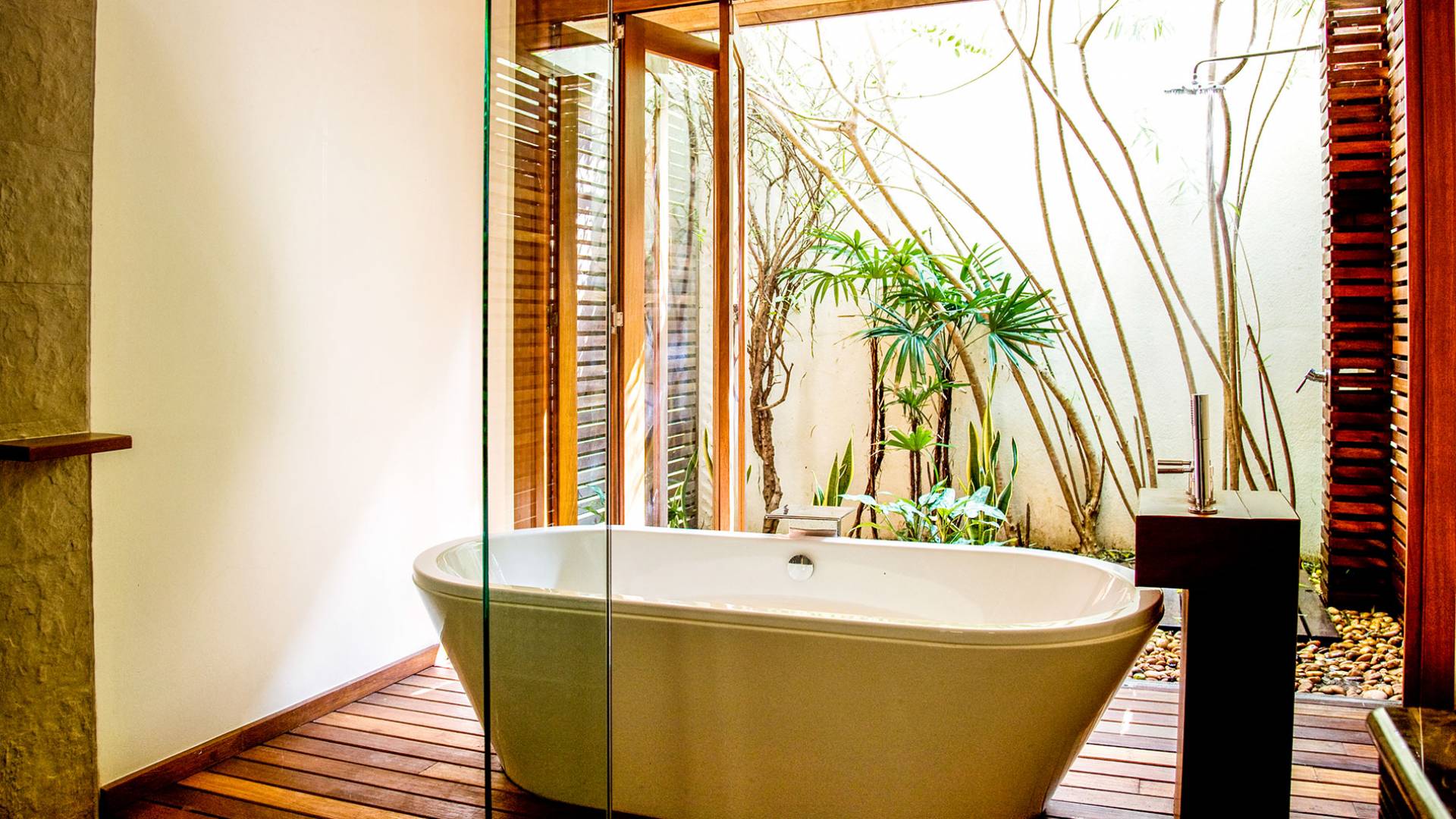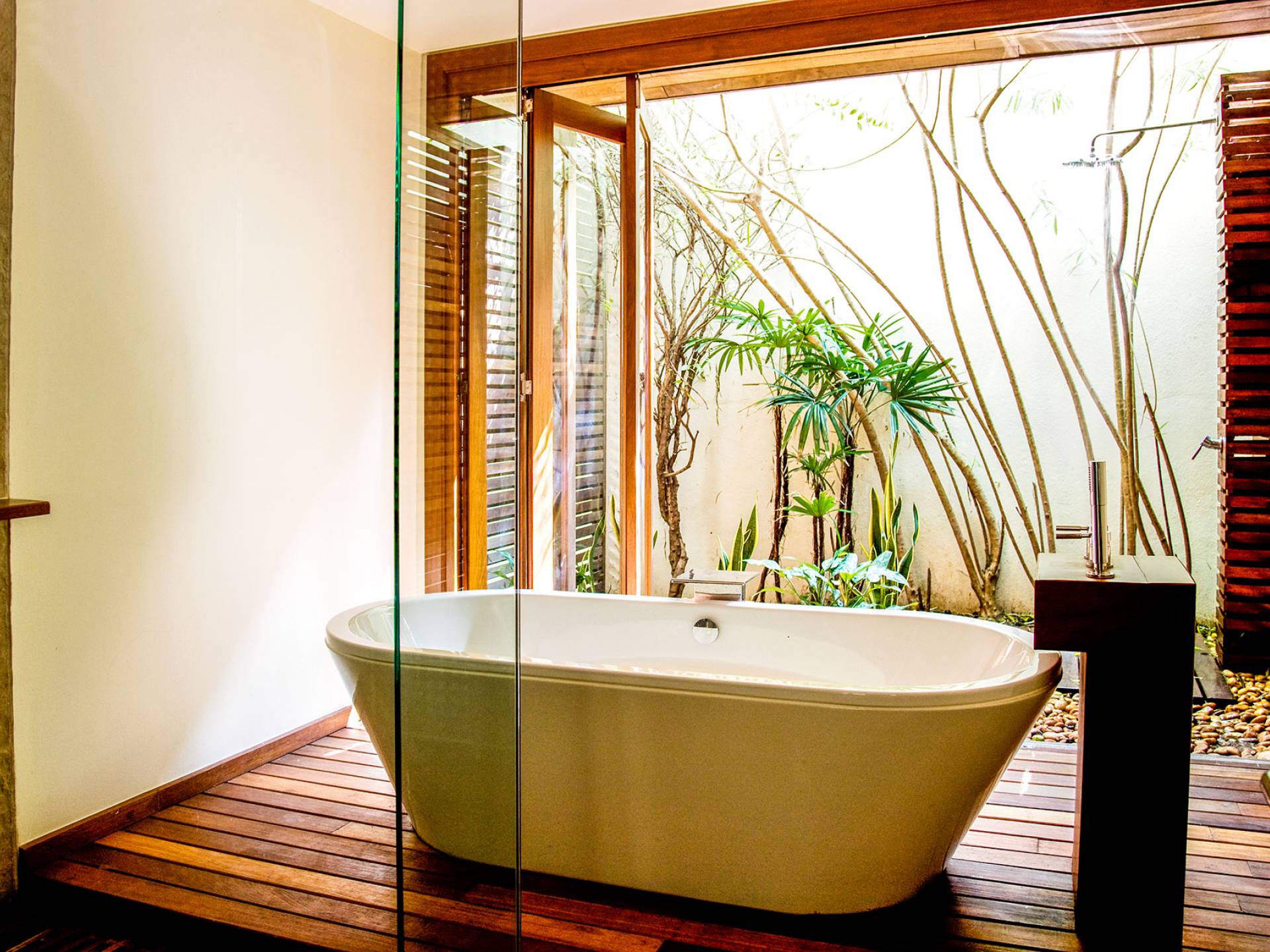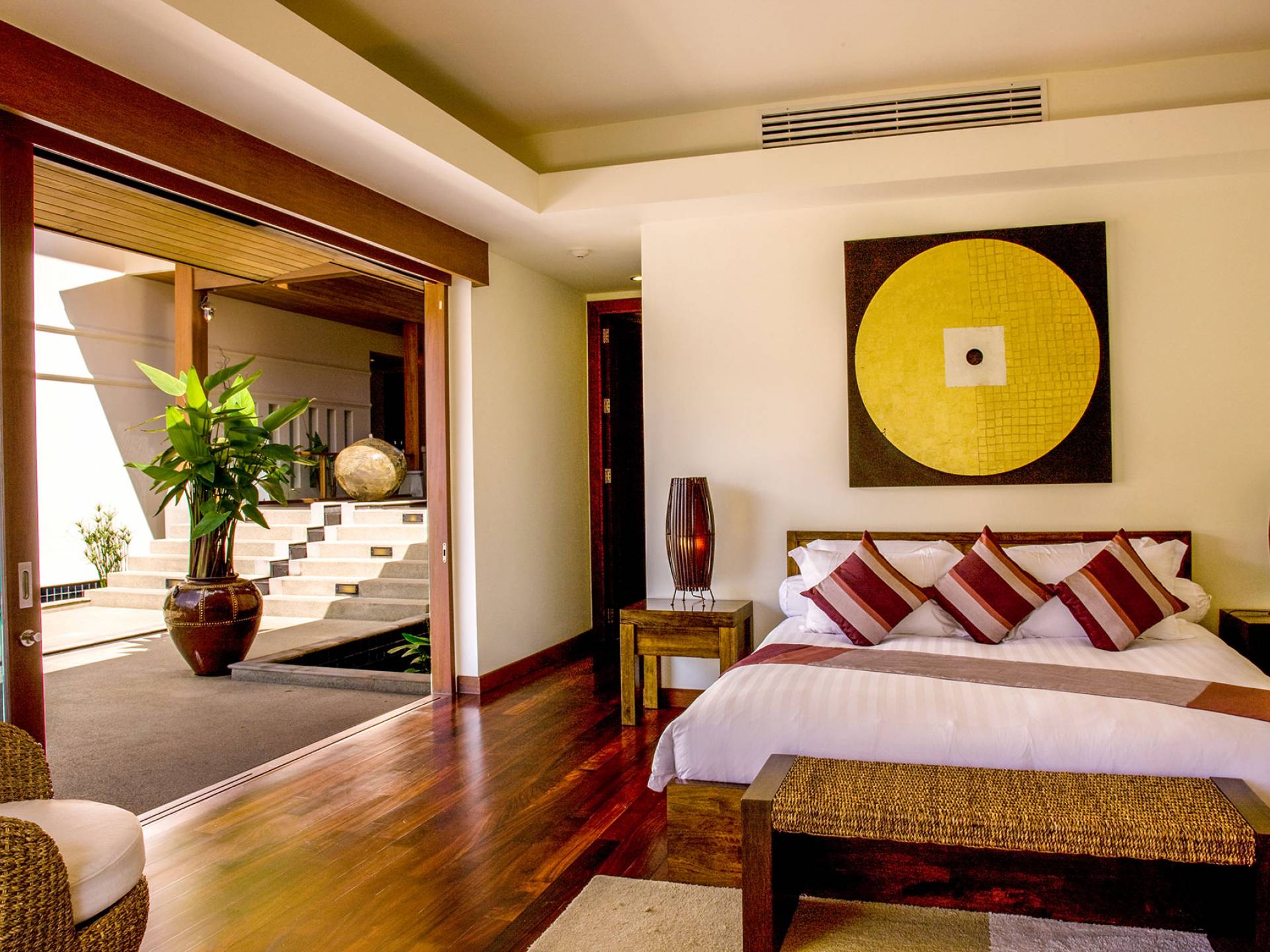Hinter dem Essbereich befindet sich eine große Steinterrasse mit einem zentralen Wasserspiel. Auf der linken Seite befindet sich ein weiteres Schlafzimmer mit Doppelbett, wieder mit modernen Möbeln, Flachbild-TV und mit mauve- und lilafarbenen Accessoires. Ein begehbarer Ankleidebereich und ein en-suite Badezimmer mit Doppelwaschbecken, Duschbad, freistehender Badewanne und Innengarten mit Außendusche vervollständigen dieses gepflegte Zimmer.