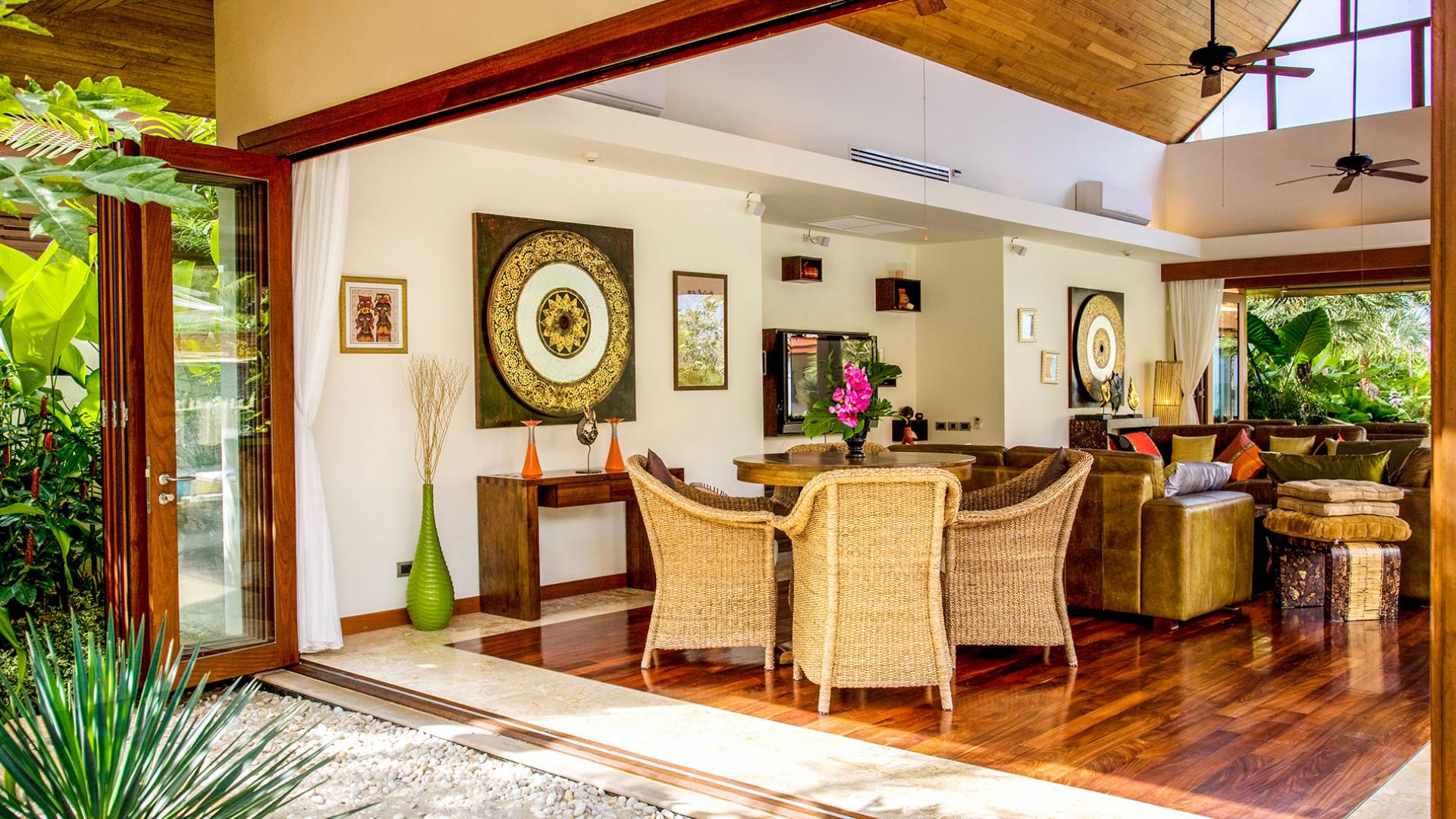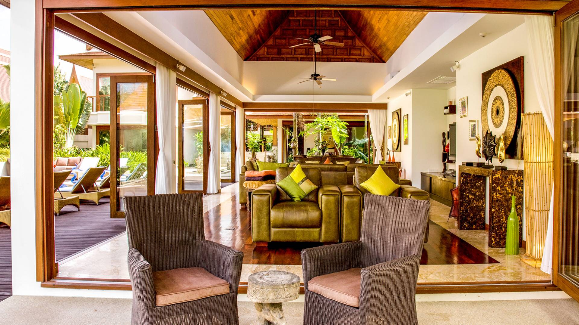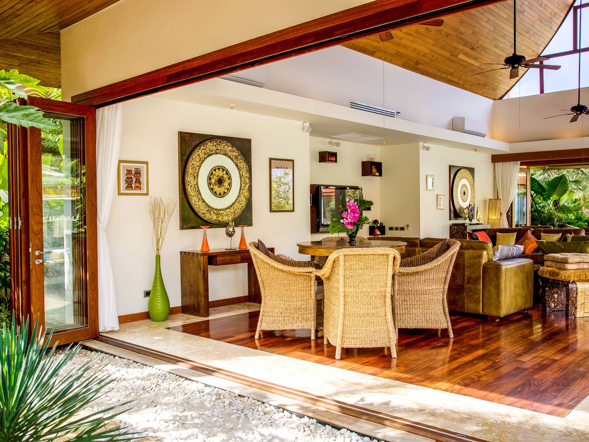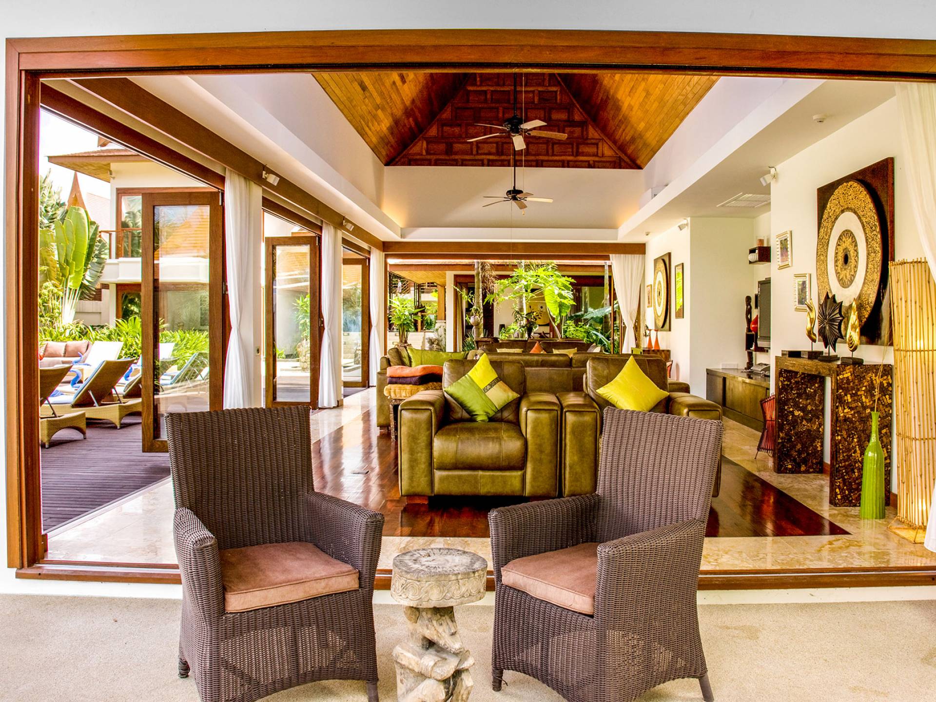 Im exquisiten Loungebereich kommt das echte Gefühl von Stil, Komfort und purem Luxus zum Tragen. An einem Ende dieses offenen Raumes stehen ein Tisch und Stühle aus Naturmaterialien. Ein atemberaubender polierter Holzboden, eingefasst mit beigem Marmor, passt perfekt zu den braunen Accessoires und den großen hellbraunen Ledersofas, die die Mitte des Wohnbereichs um einen erstaunlich niedrigen Teakholztisch mit dekorativen Bambuseinlagen einnehmen. In einer Nische befinden sich schwebende Regale, die einen Plasma-TV umgeben. Und am anderen Ende stehen zwei Ledersessel mit Blick über den großen Garten auf das Meer.