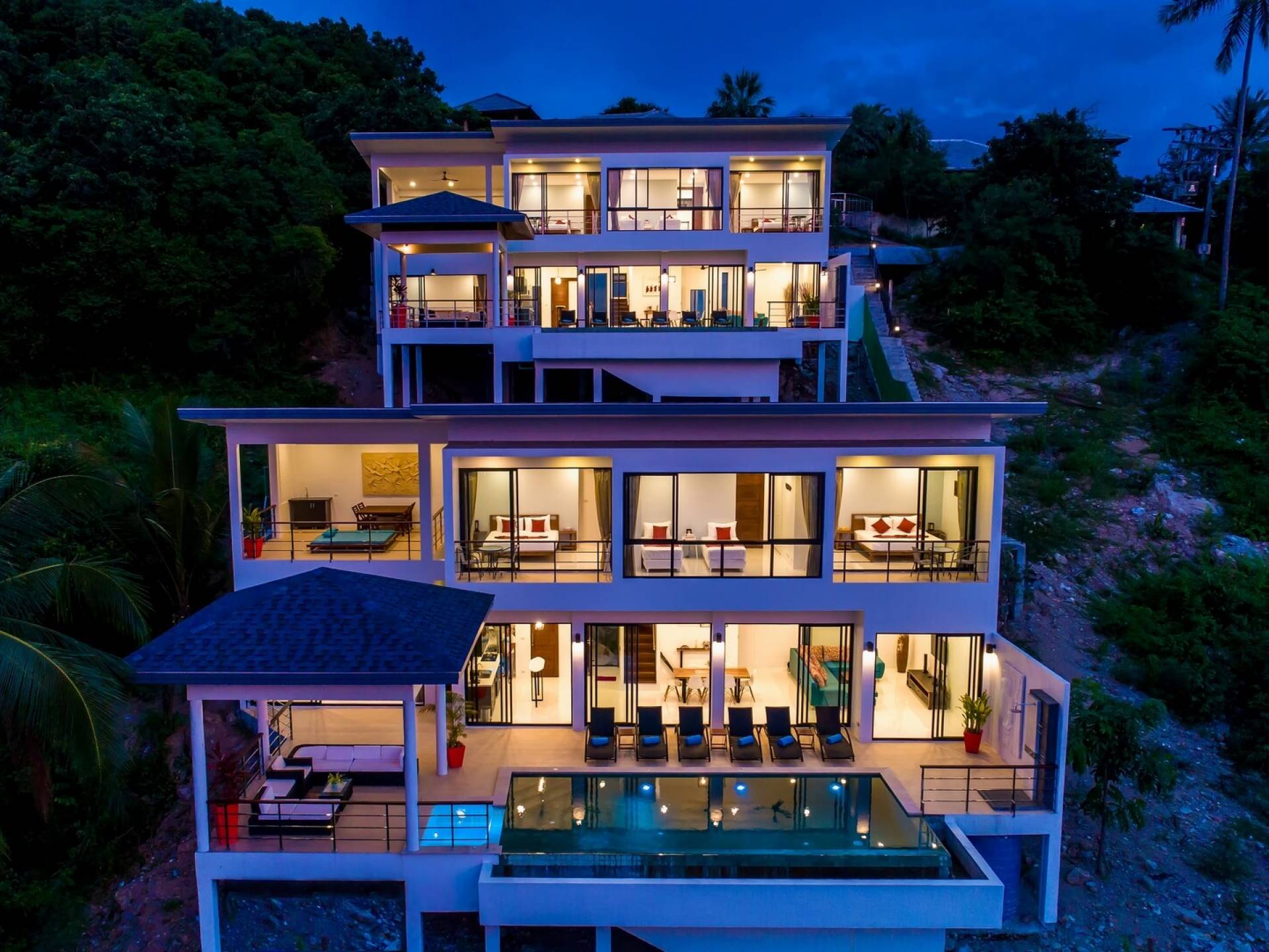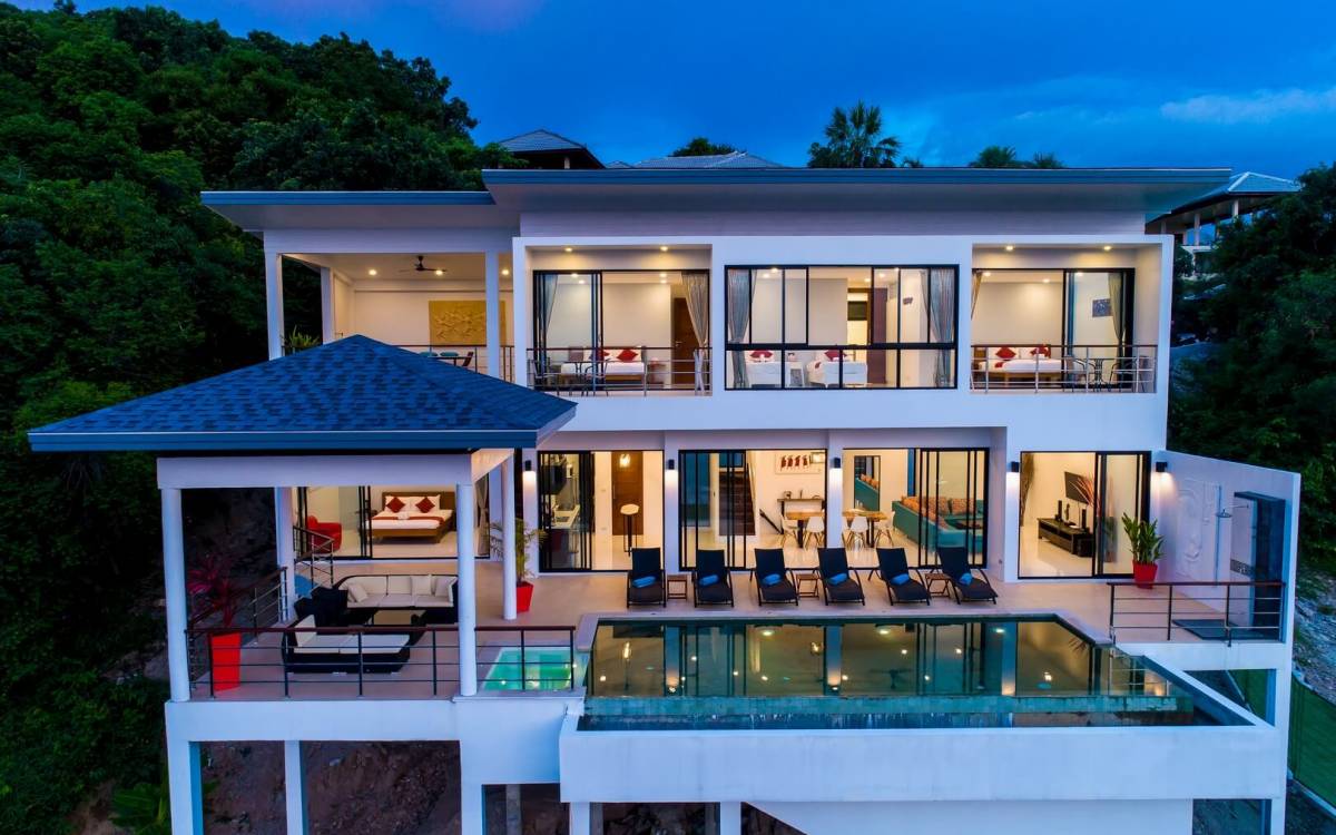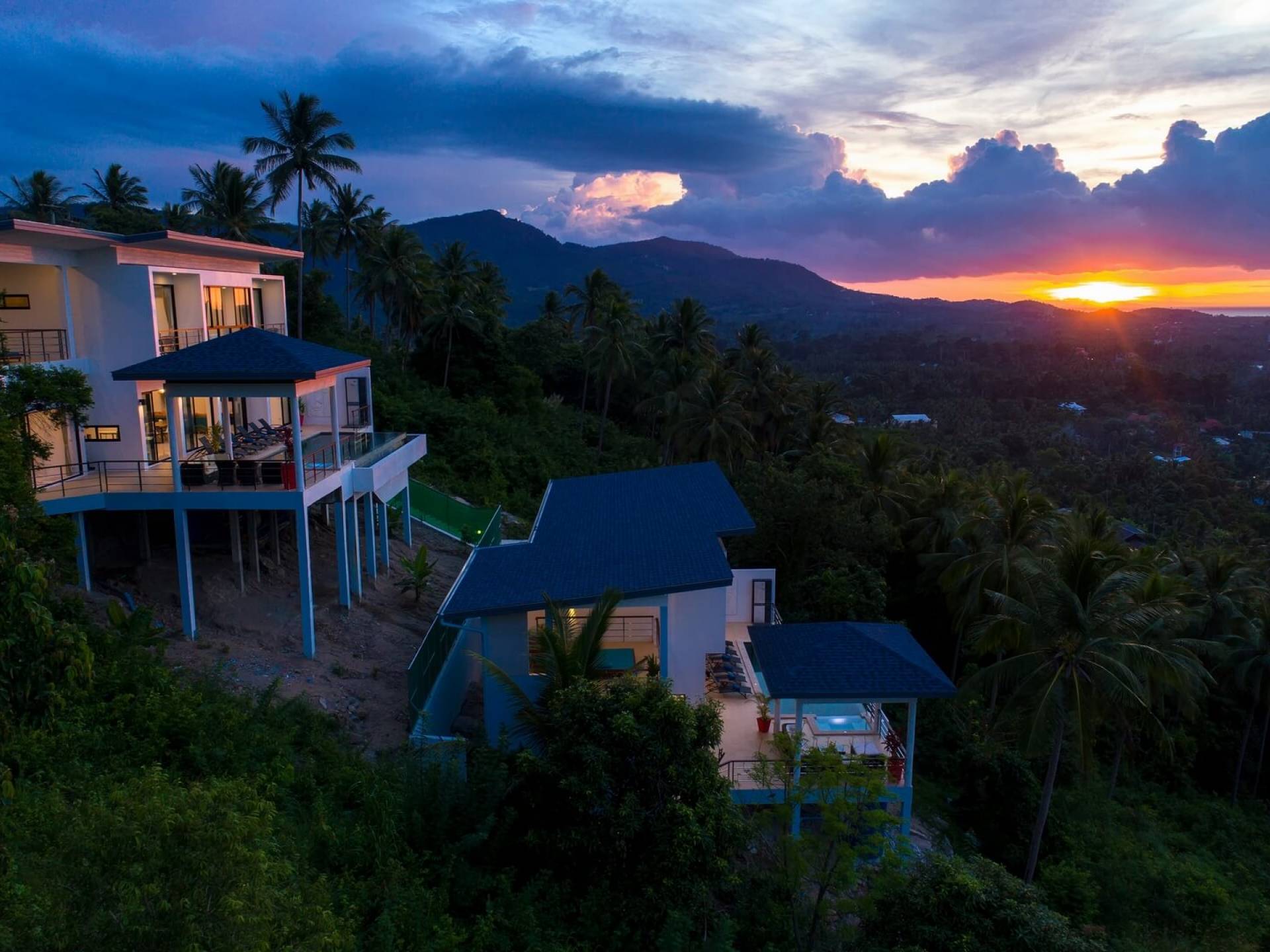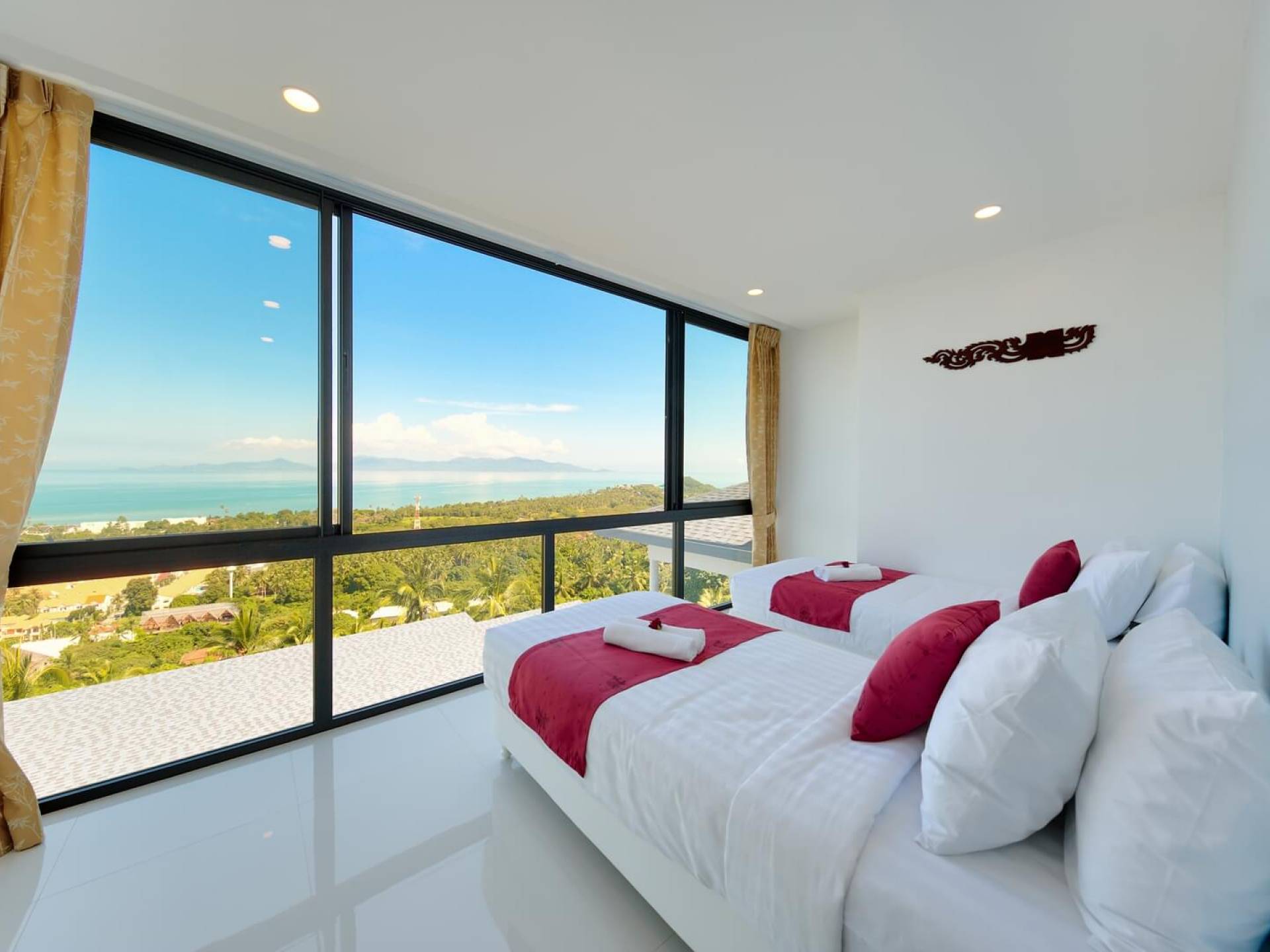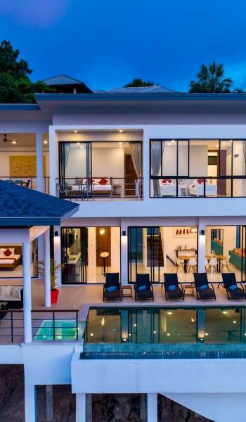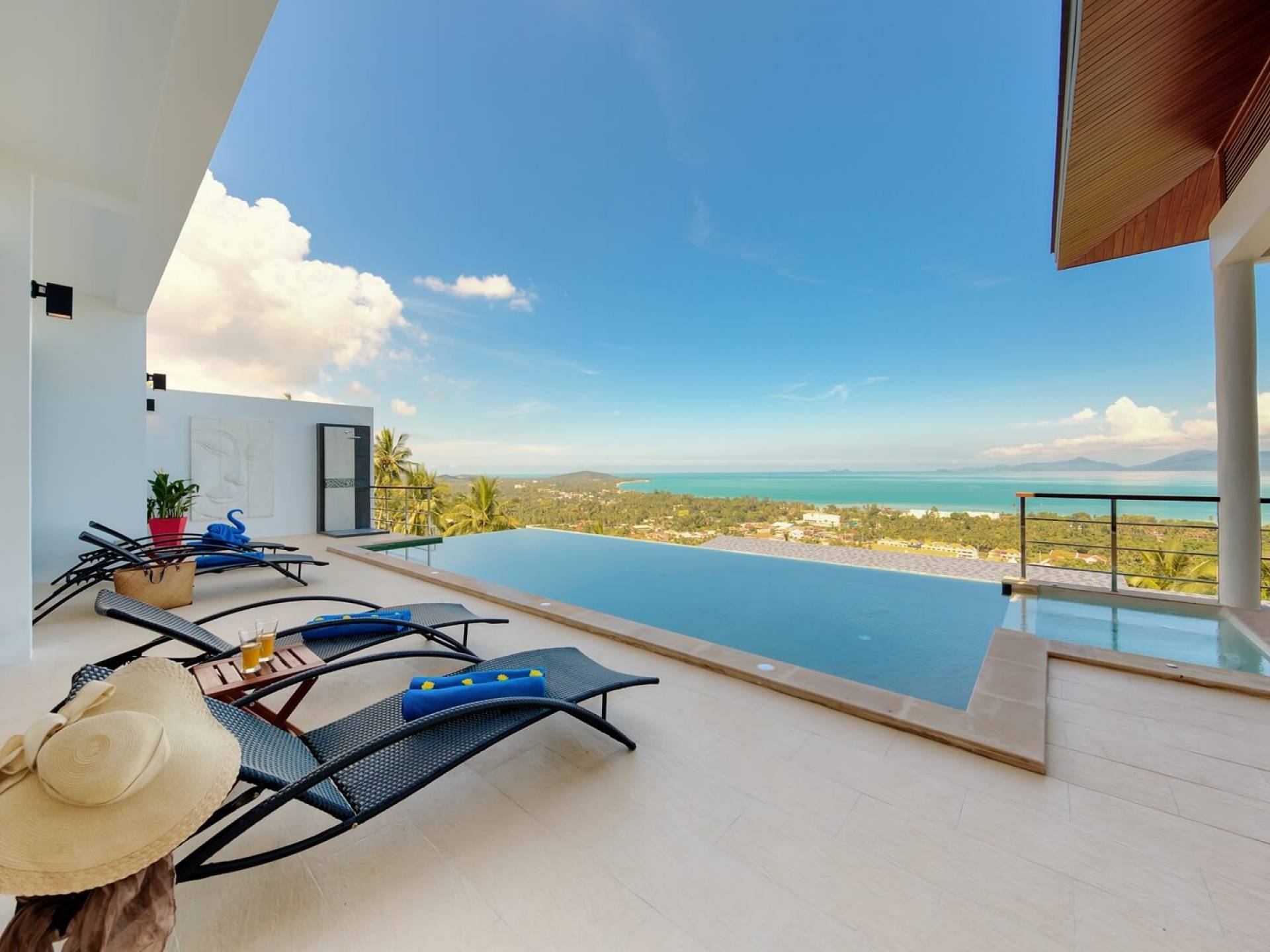 Alina Flora Villas Samui ist ein Set aus 2 identischen Luxusvillen mit 4 Schlafzimmern, eingebettet in den Hügeln von Maenam, in einer atemberaubenden Lage an der Nordküste von Koh Samui und genießt einen unglaublichen Panoramablick auf das Meer. Die spektakuläre Aussicht bietet seinen Gästen so viel und ist ein herausragendes Merkmal dieses Anwesens (das nicht viele seiner Konkurrenten erreichen können). Die atemberaubende Aussicht bietet atemberaubende Sonnenuntergänge, die benachbarten Inseln Koh Pha Ngan und Koh Tao und sogar den lokalen Angthong Marine Park.