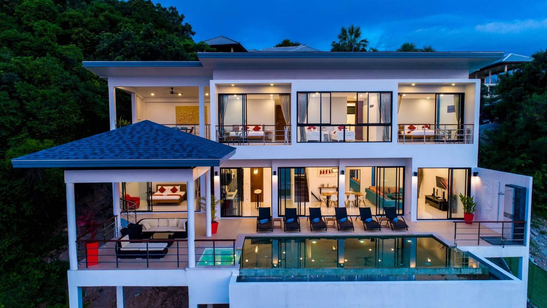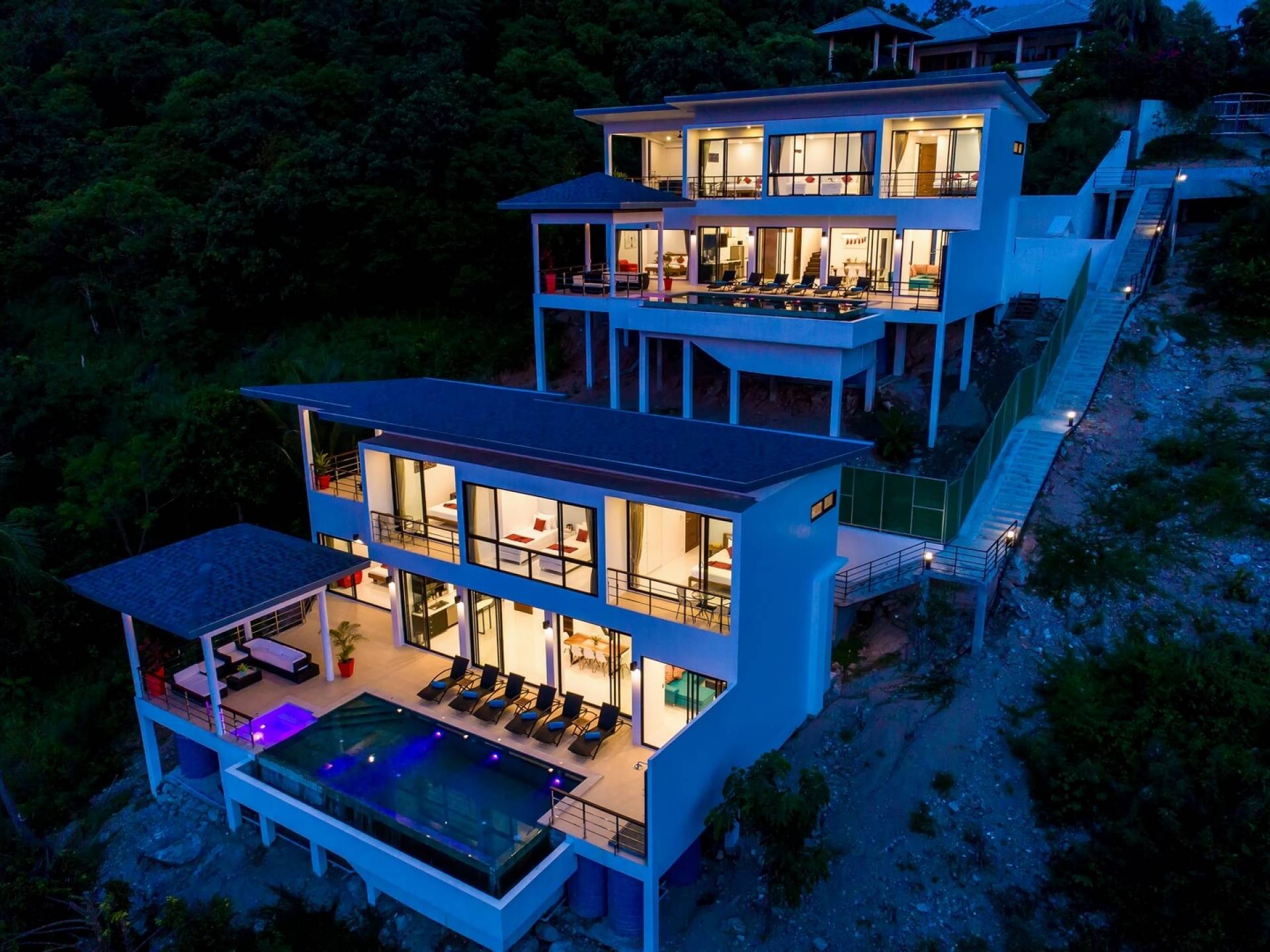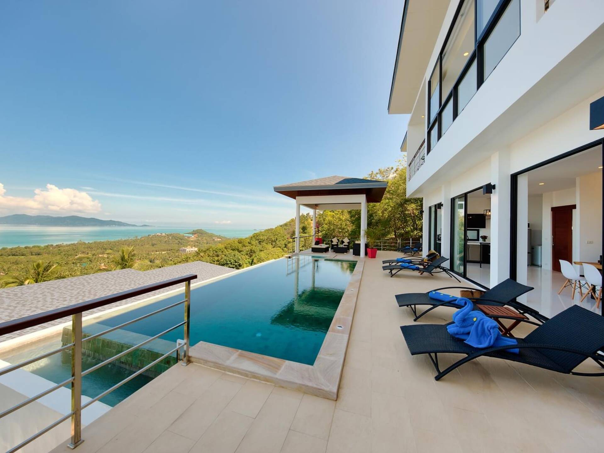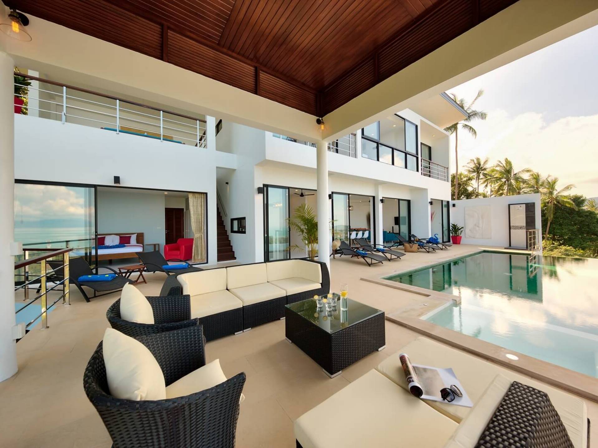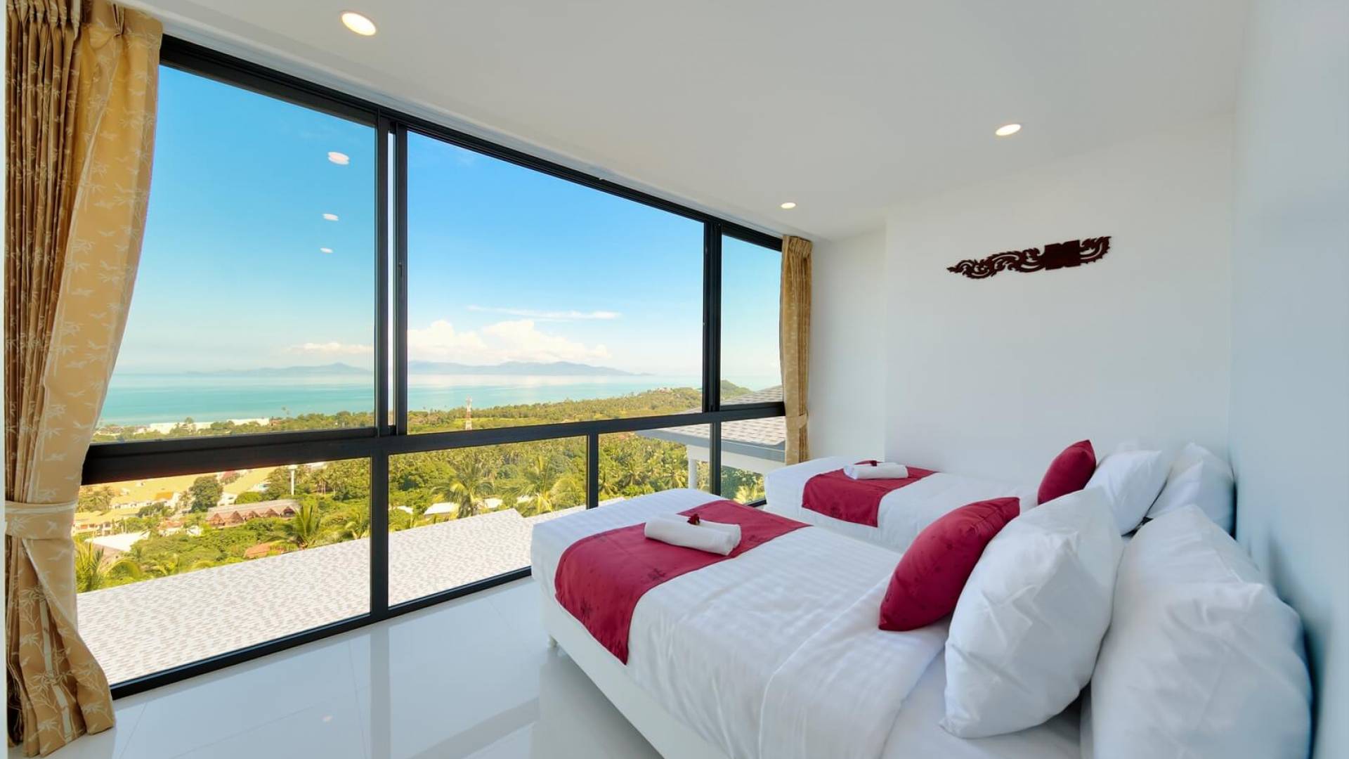 Alina Flora Villas Samui ist ein Set aus 2 identischen Luxusvillen mit 4 Schlafzimmern, eingebettet in den Hügeln von Maenam, in einer atemberaubenden Lage an der Nordküste von Koh Samui und genießt einen unglaublichen Panoramablick auf das Meer. Die spektakuläre Aussicht bietet seinen Gästen so viel und ist ein herausragendes Merkmal dieses Anwesens (das nicht viele seiner Konkurrenten erreichen können). Die atemberaubende Aussicht bietet atemberaubende Sonnenuntergänge, die benachbarten Inseln Koh Pha Ngan und Koh Tao und sogar den lokalen Angthong Marine Park.