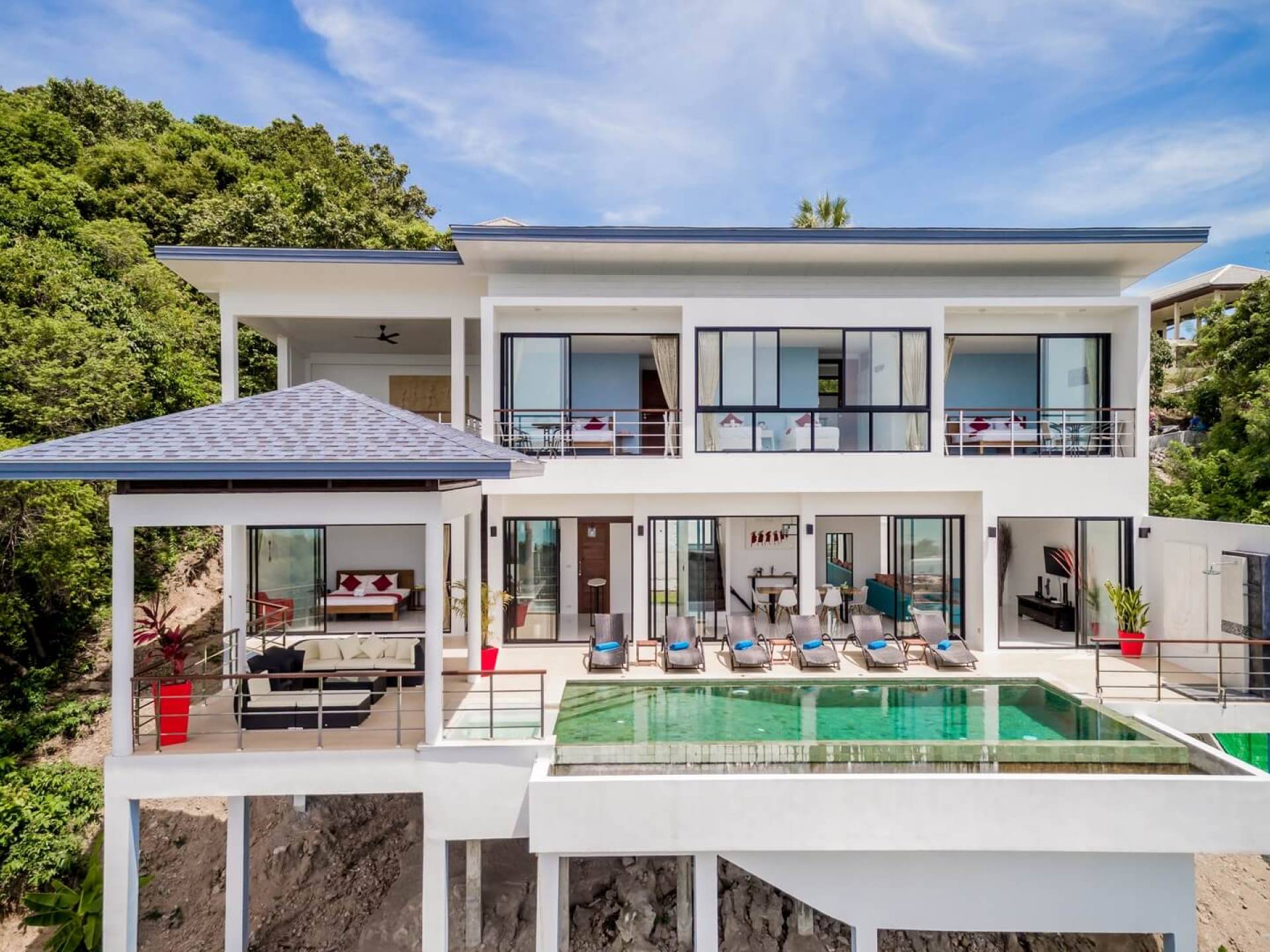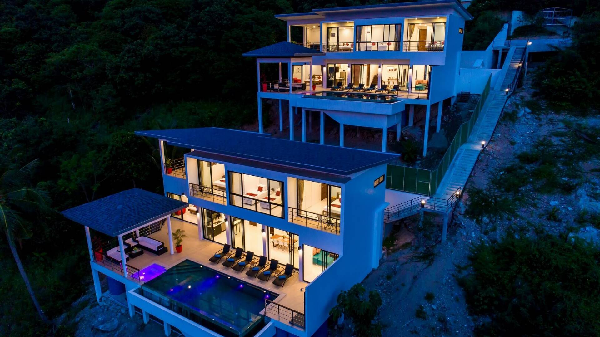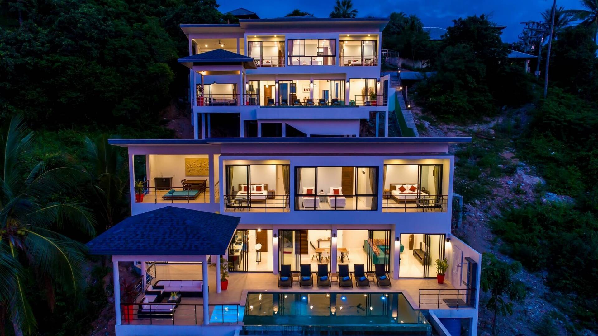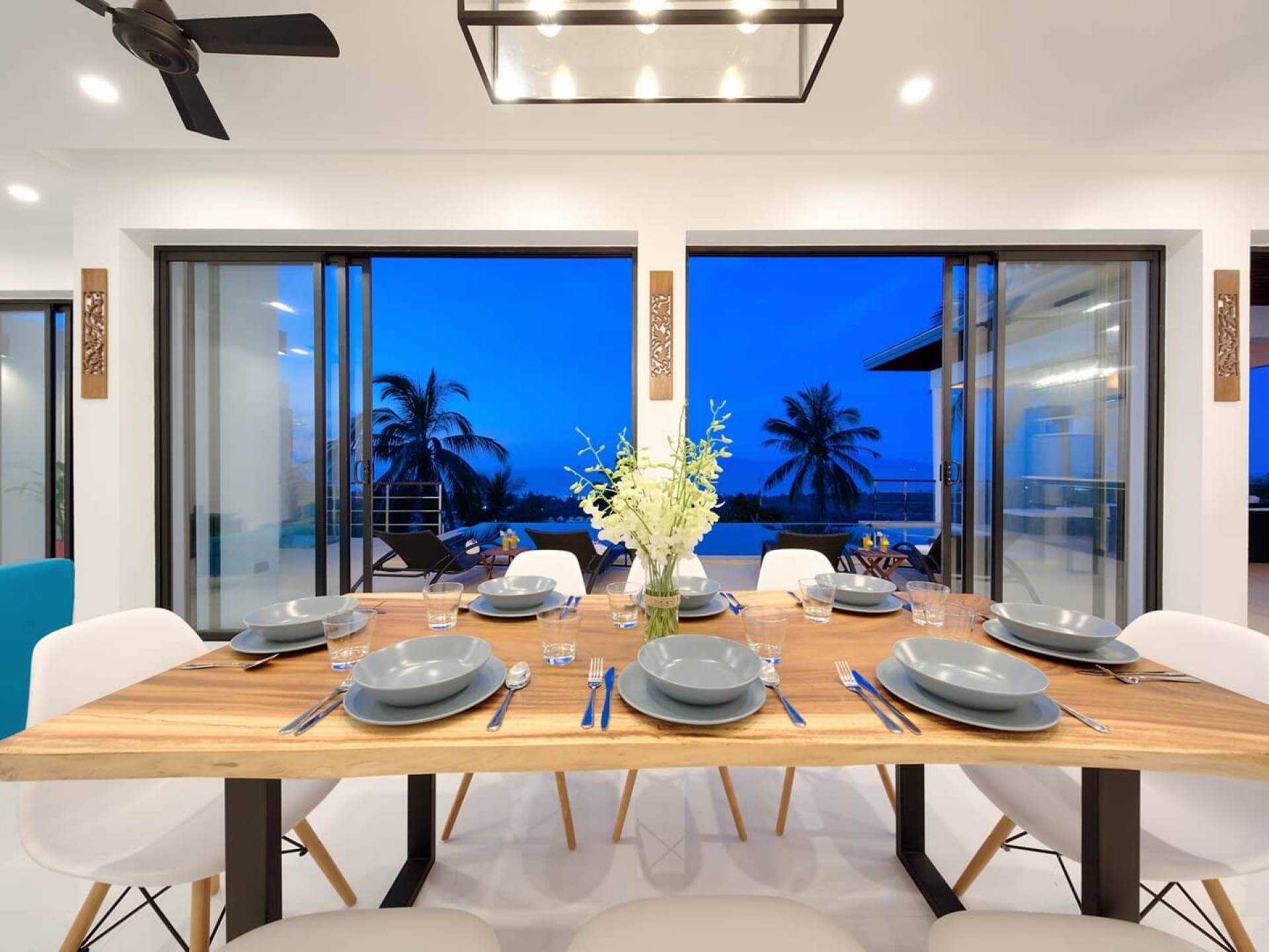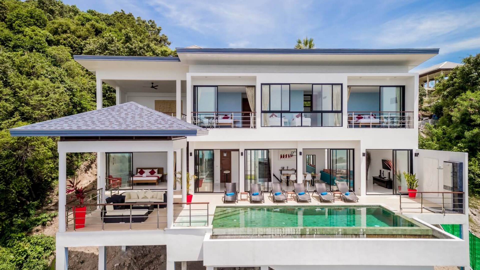 Alina Flora Villas Samui ist ein Set aus 2 identischen Luxusvillen mit 4 Schlafzimmern, eingebettet in den Hügeln von Maenam, in einer atemberaubenden Lage an der Nordküste von Koh Samui und genießt einen unglaublichen Panoramablick auf das Meer. Die spektakuläre Aussicht bietet seinen Gästen so viel und ist ein herausragendes Merkmal dieses Anwesens (das nicht viele seiner Konkurrenten erreichen können). Die atemberaubende Aussicht bietet atemberaubende Sonnenuntergänge, die benachbarten Inseln Koh Pha Ngan und Koh Tao und sogar den lokalen Angthong Marine Park.