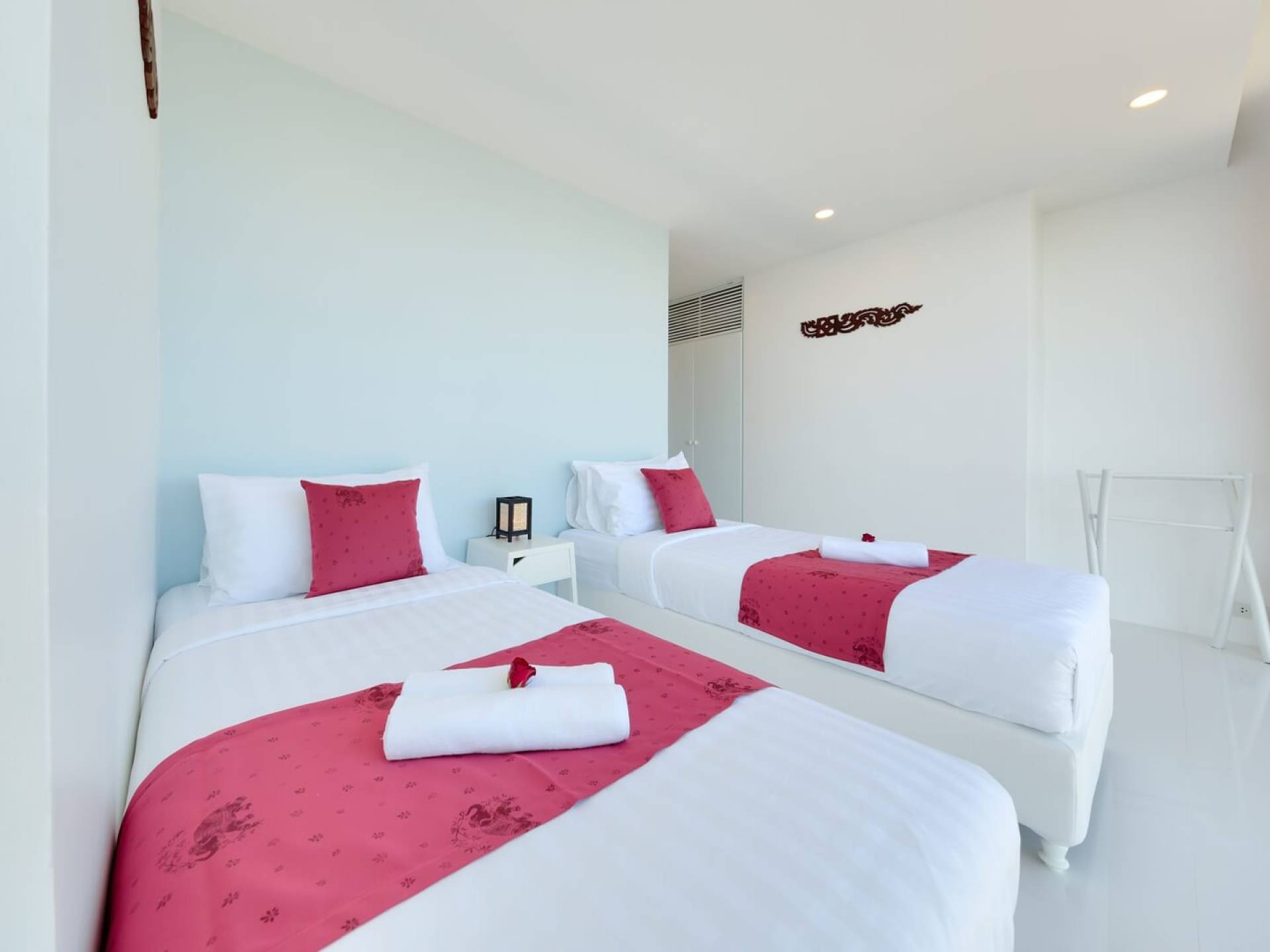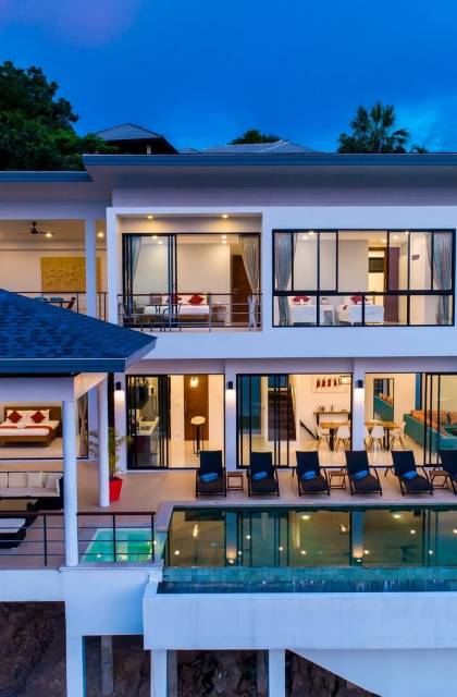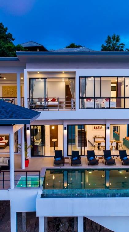 Alina Flora Villas Samui kombiniert 2 Schwestervillen in unmittelbarer Nähe, sodass bis zu 16 Gäste übernachten können, was dieses Angebot perfekt für große Familien und Gruppen macht. Beide Luxusvillen befinden sich auf demselben Privatgrundstück mit Verbindungstreppen zueinander. Alina-Flora bietet daher 2 von allem, 2 Swimmingpools, 2 Wohnbereiche, 2 Küchen und insgesamt 8 Schlafzimmer und Bäder. Was will man mehr und das alles so günstig für so große Gruppen?