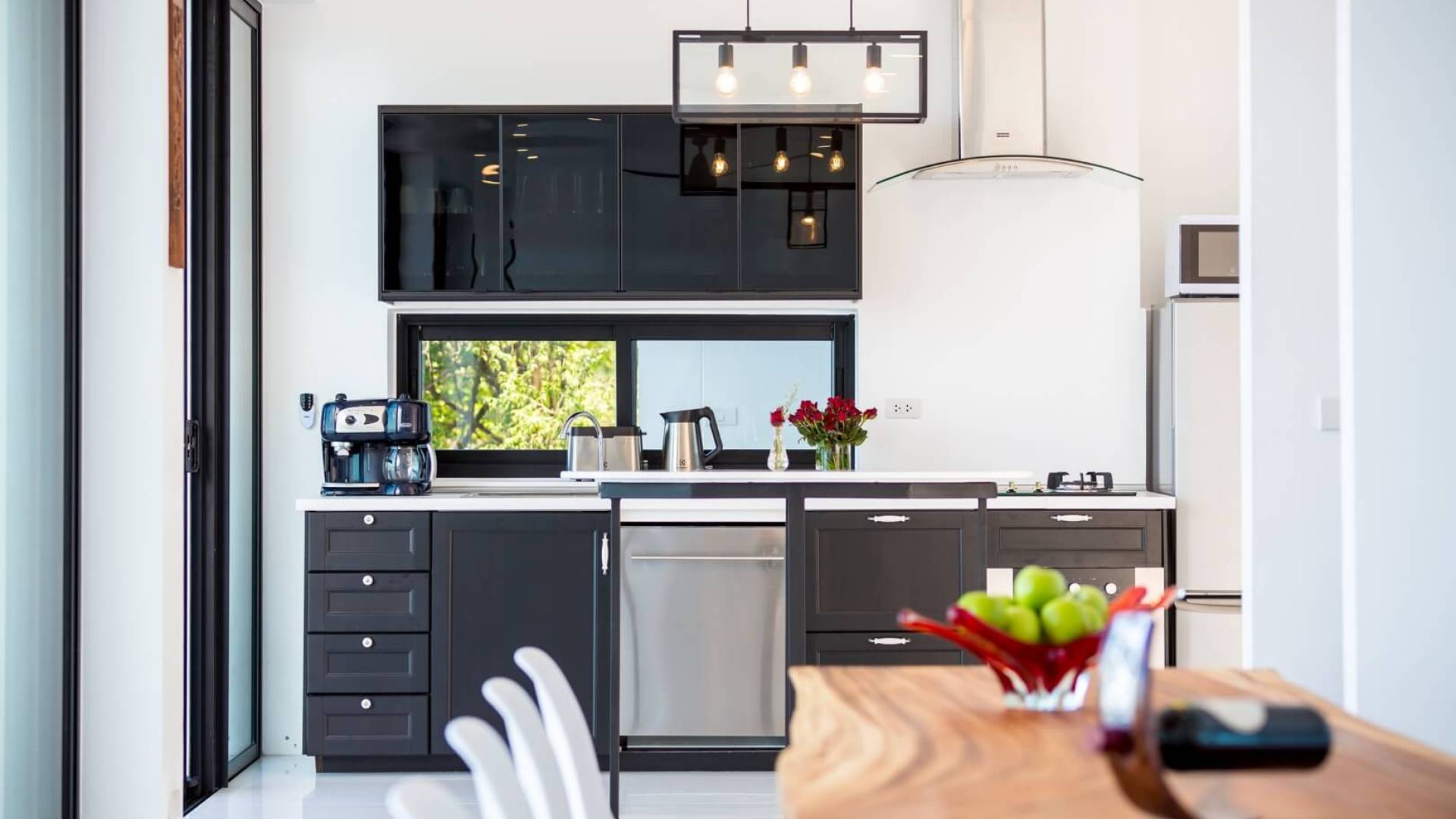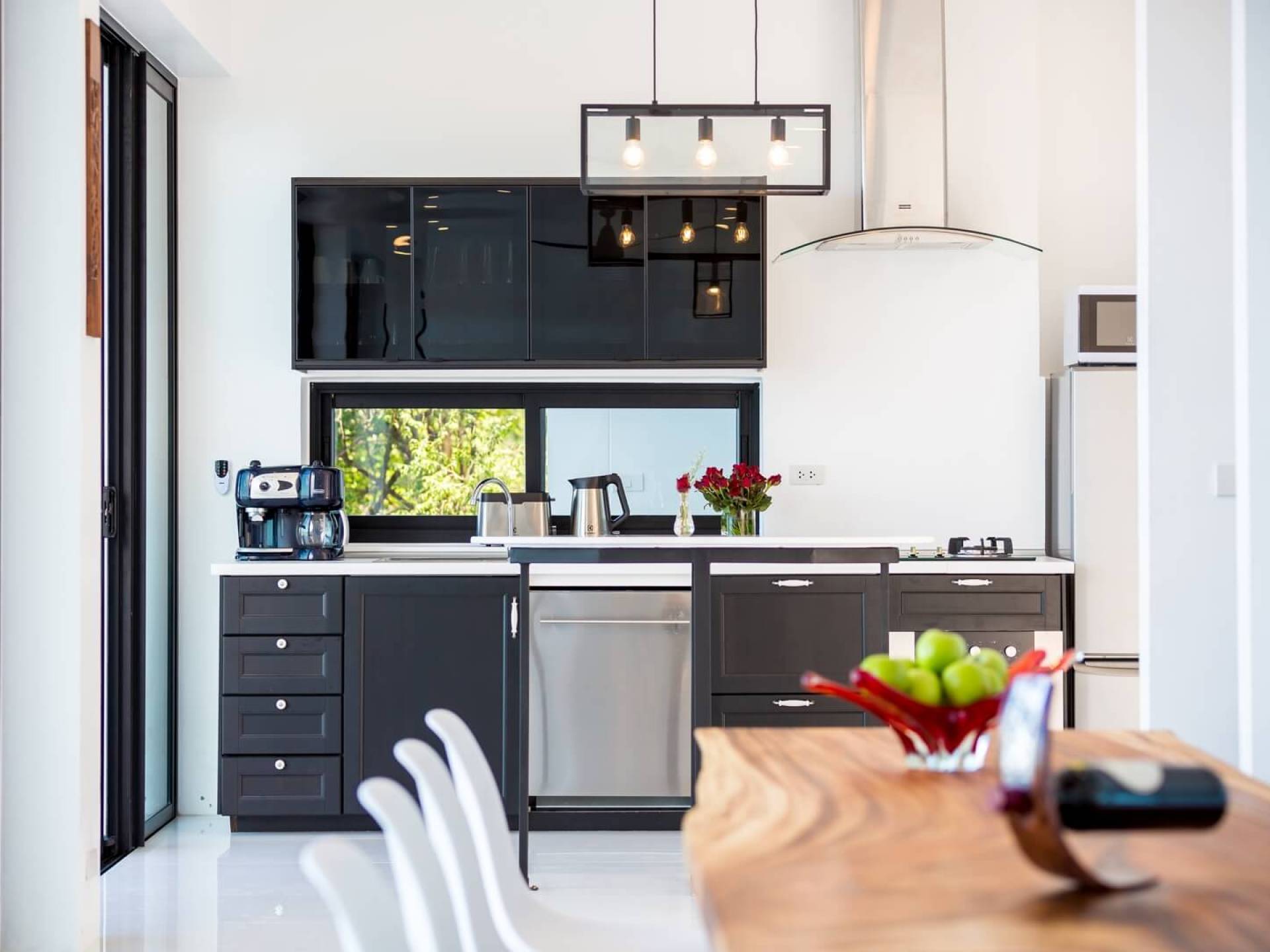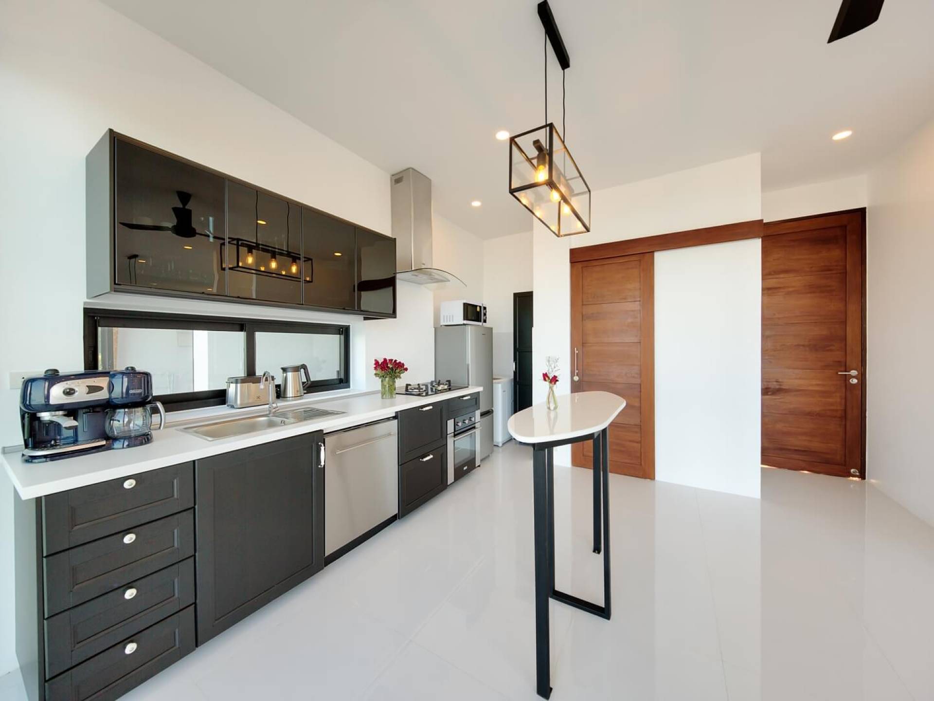 Betreten Sie den Eingang der Villa, wo Sie von einer sauberen, frischen und offenen Atmosphäre begrüßt werden. Die voll ausgestatteten modernen Küchen im westlichen Stil verfügen über einen großen Kühlschrank mit Gefrierfach, einen eingebauten elektrischen Umluftofen, eine Mikrowelle und einen Drei-Flammen-Gasherd. Die Küchen sind durch eine Frühstückstheke vom Essbereich getrennt.