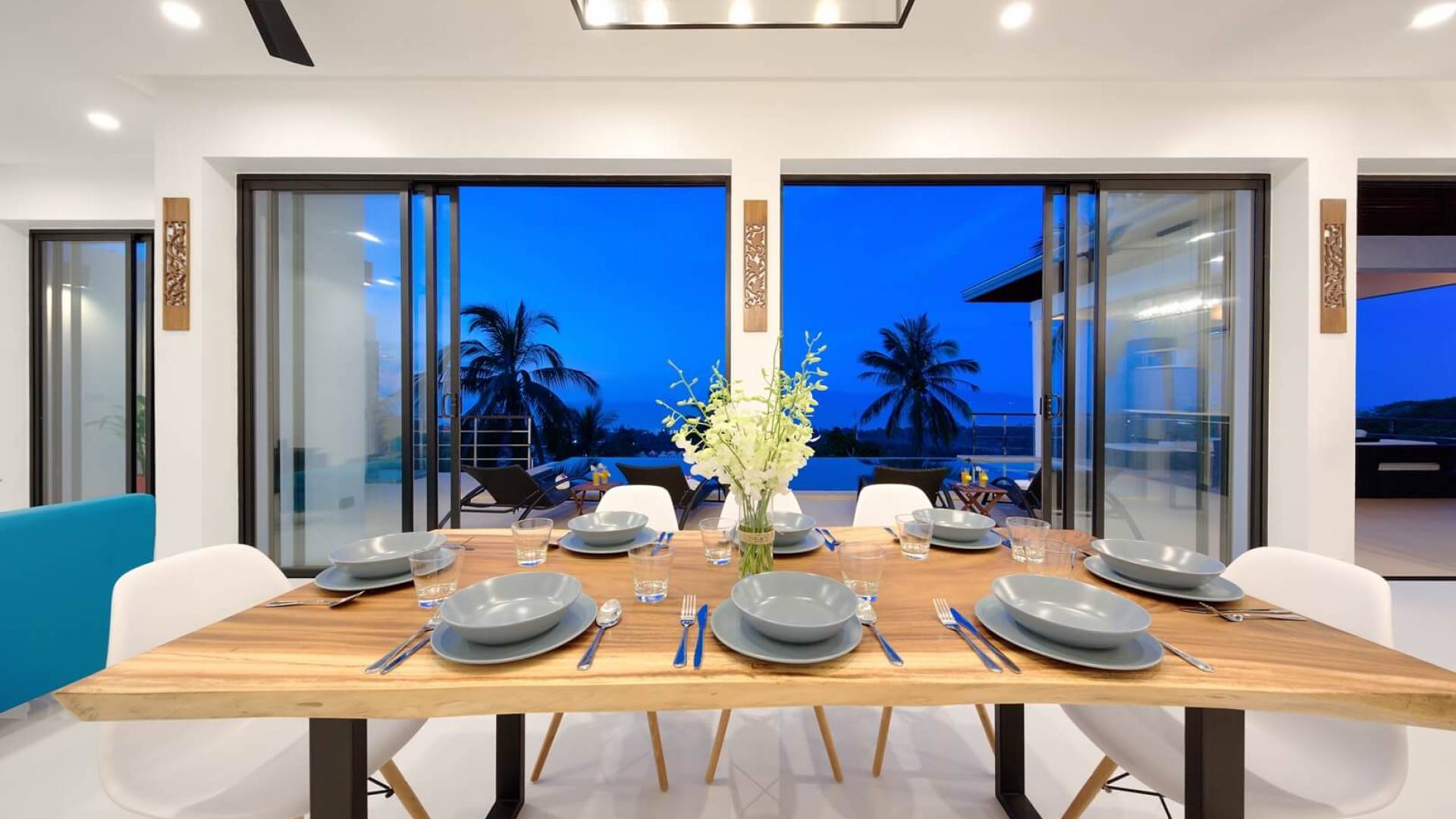 Die Essbereiche verfügen über einen großen Esstisch aus Teakholz, an dem jeweils bis zu 8 Personen (insgesamt 16) bequem Platz finden. Die Wohnbereiche verfügen über große raumhohe Glasfenster und Schiebetüren mit Blick auf den Poolbereich und die atemberaubende Aussicht, die die Villen zu bieten haben. Ein bequemes Sofa, ein Flachbild-TV mit mehreren Kanälen Sat-TV stehen für alle zur Verfügung.