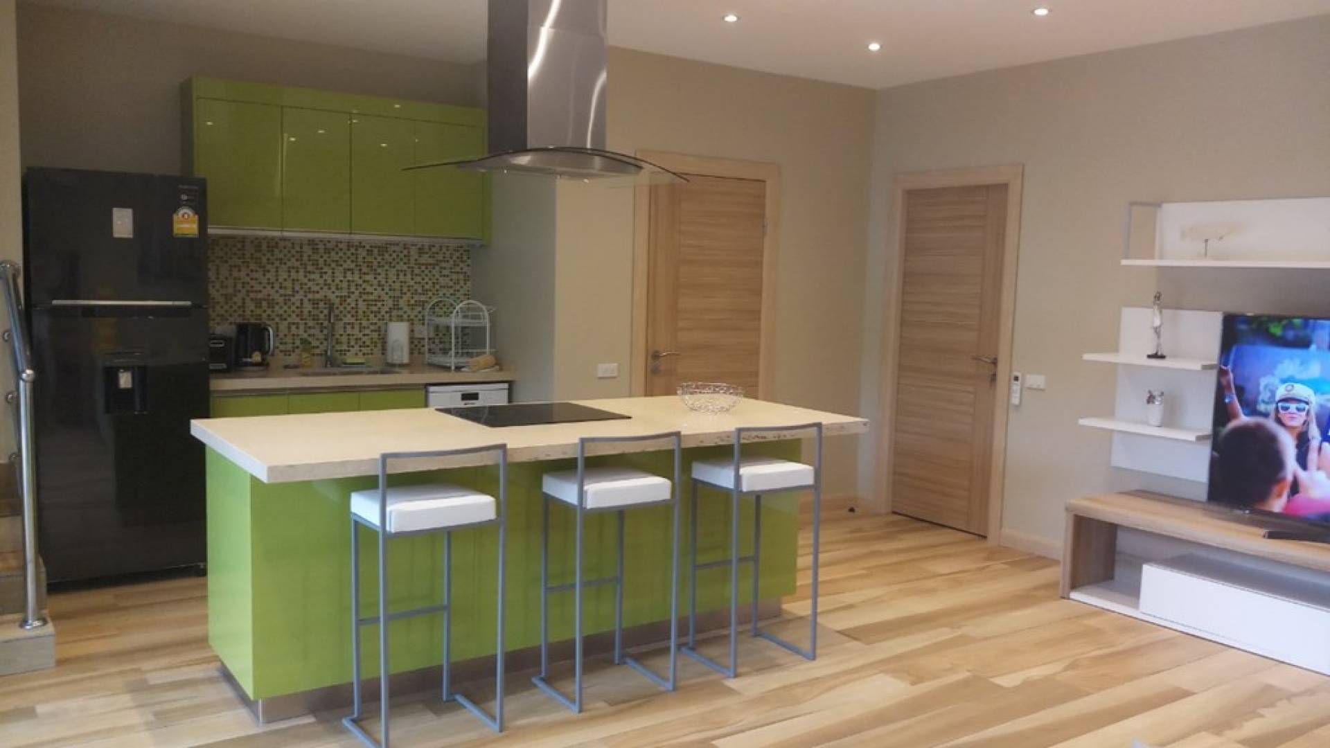 Die vorderen Schiebetüren der Villa können geöffnet werden, um Ess- und Küchenbereiche zu erweitern und zusammenzuführen. Die funky türkisfarbene Küche ist komplett mit allem Nötigen und einigen Luxusgeräten wie der Spülmaschine ausgestattet. Großer Kühlschrank, Mikrowelle und eine Frühstücksinsel – es gibt genug Platz und Werkzeuge für einen Koch, um die exquisitesten Gerichte zu kochen oder schnelle Snacks aufzuwärmen. Das Wohnzimmer beherbergt ein riesiges TV-Panel mit AppleTV und eine Eckcouch in Partygröße, falls das Wetter für das Freiluftkino nicht so einladend ist.