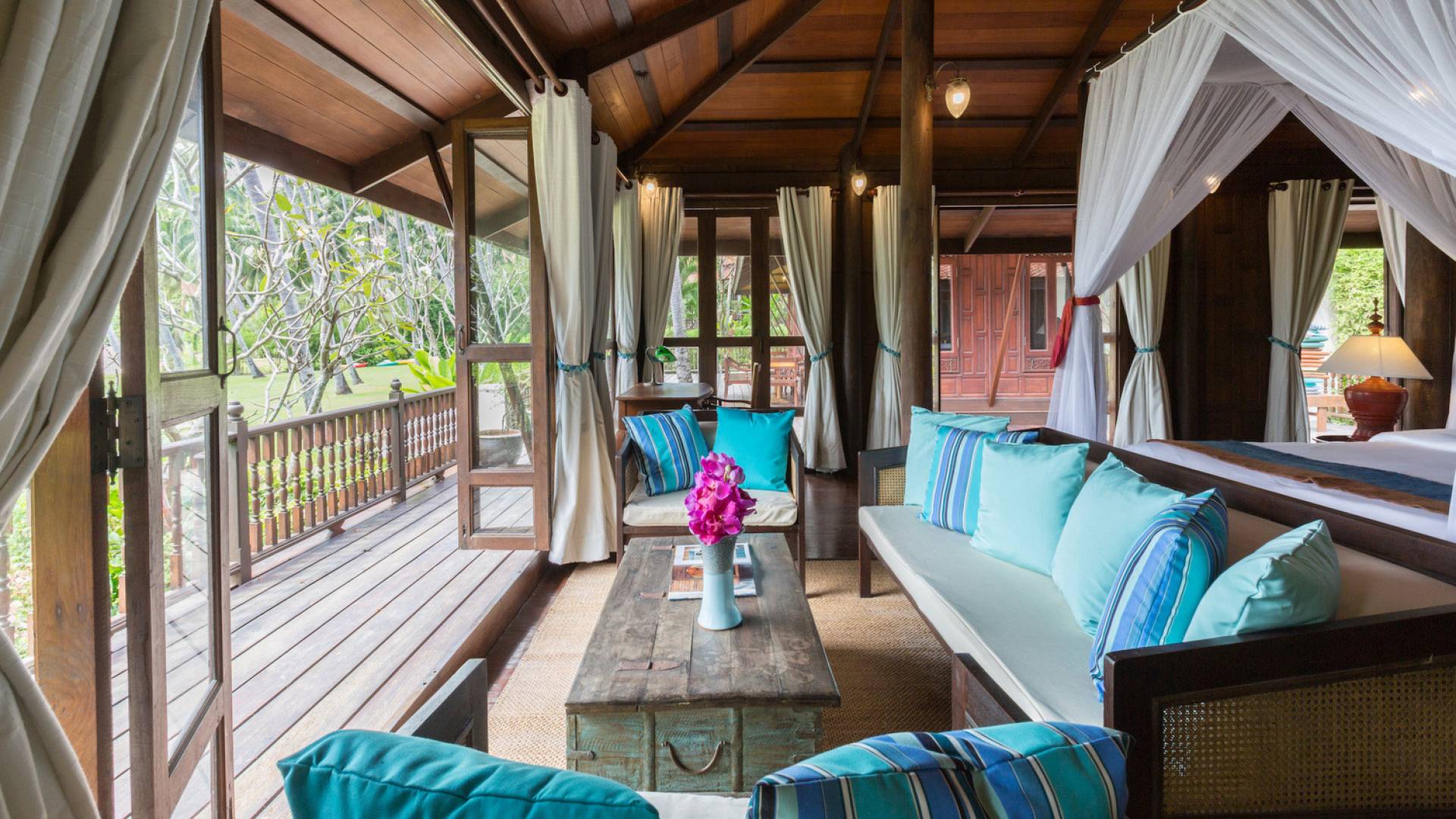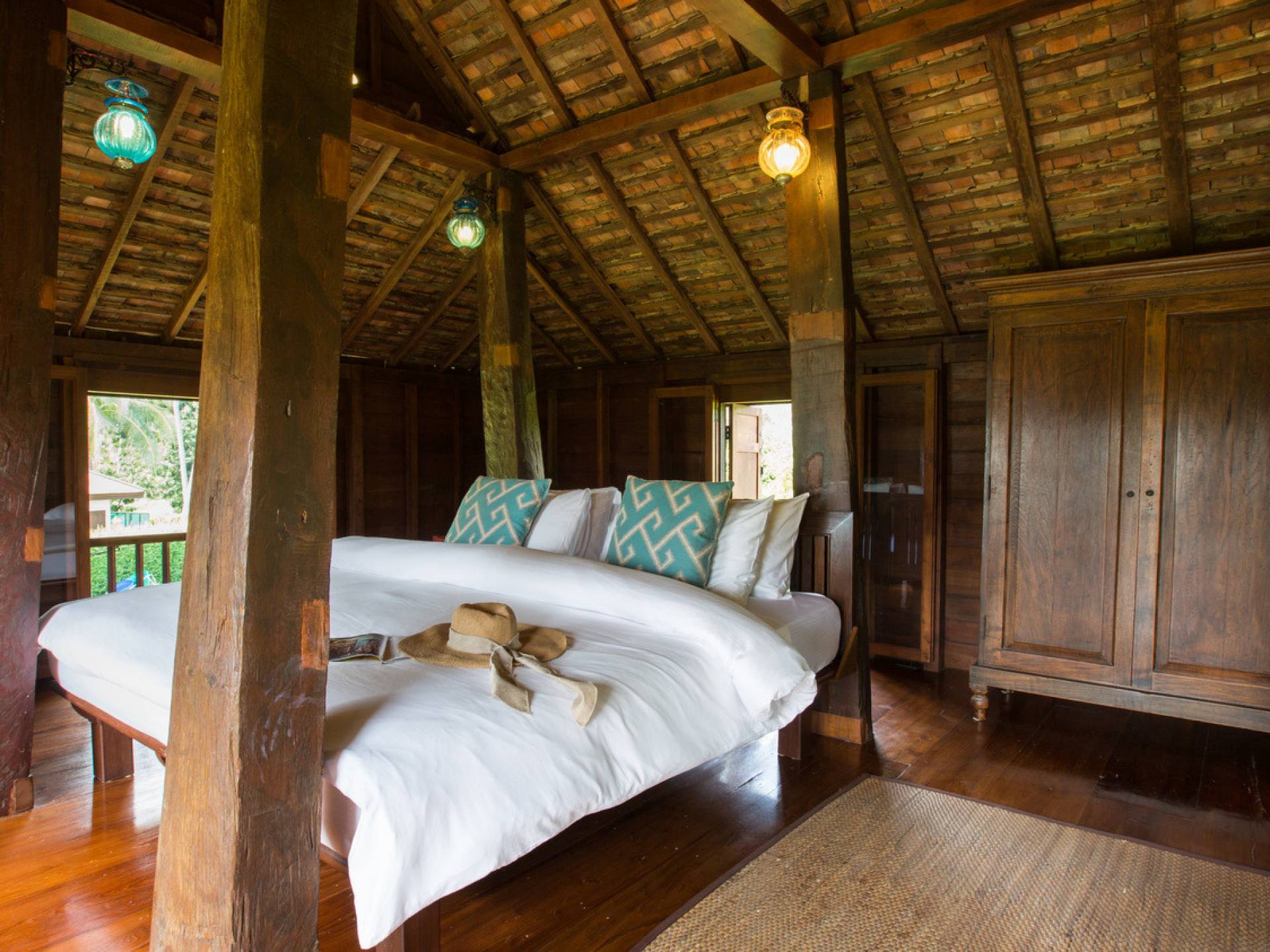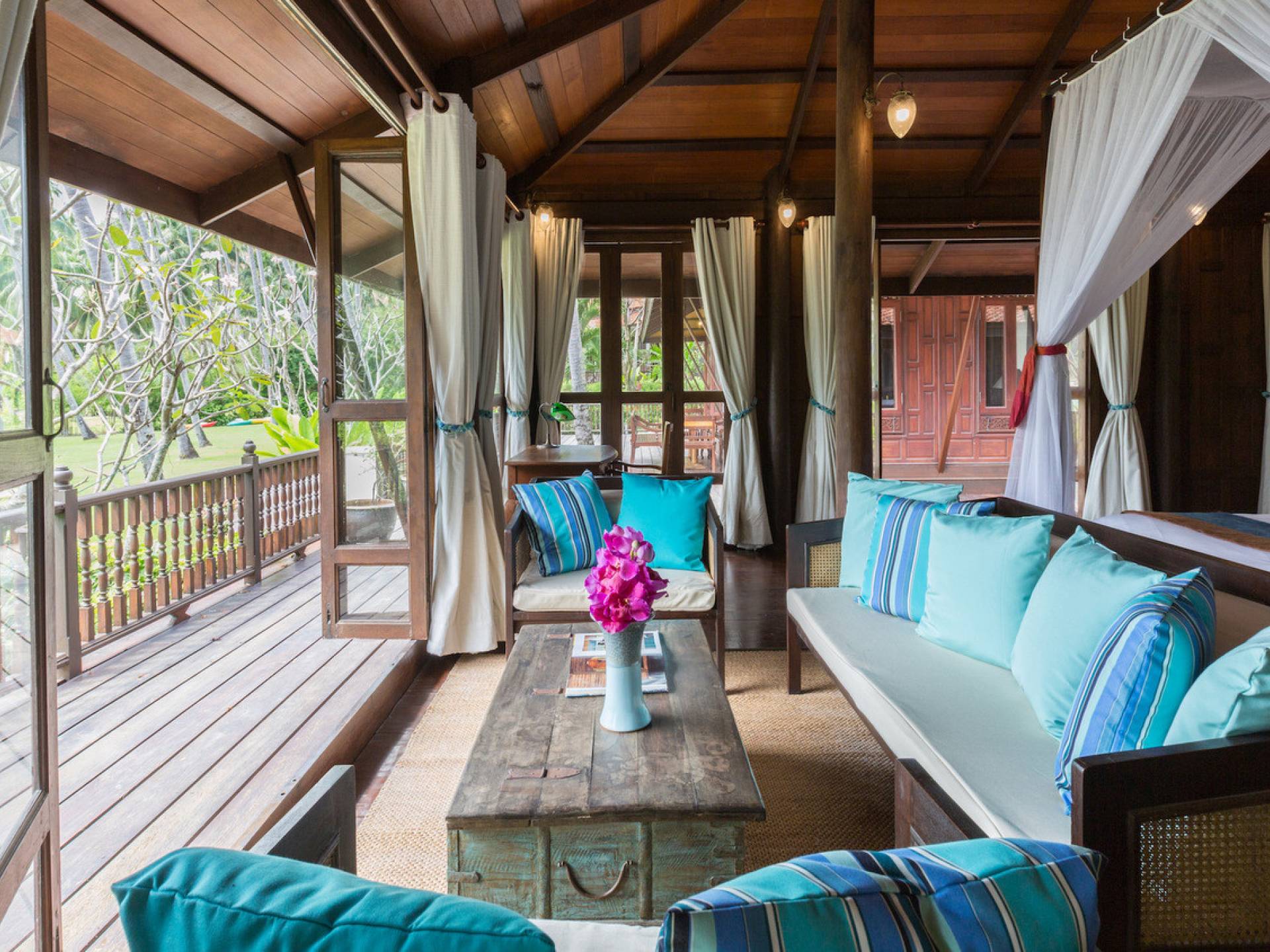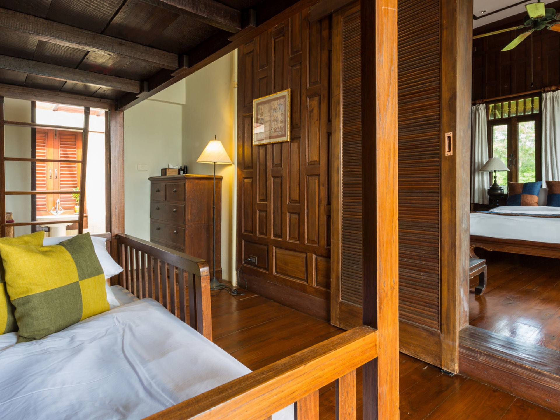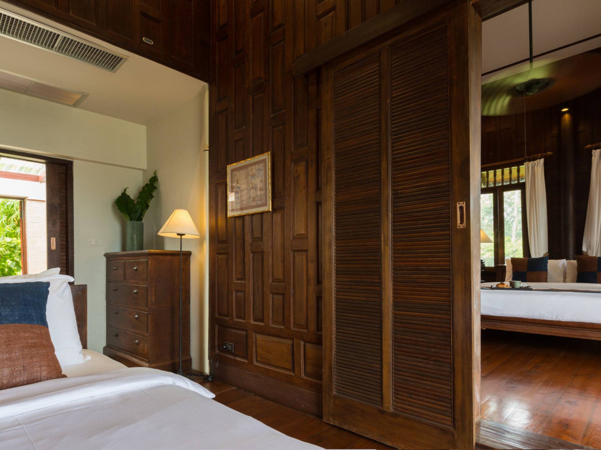 Die Hauptvilla beherbergt auch die neu renovierte Hauptsuite der Unterkunft. Gewölbte Decken mit freiliegenden Teakholzbalken und Sparren verleihen dem Raum einen authentischen thailändischen Charakter, und weiche Seidenmöbel verleihen dem Raum einen stilvollen Farbtupfer. Das Kinderzimmer in der Hauptvilla verfügt über Massivholz-Etagenbetten und ist schnell und einfach von der Master-Suite aus zugänglich und bietet einen gut angebundenen Raum für die ganze Familie. Der Schlafpavillon umfasst drei Schlafzimmer. Das erste verfügt über zwei Einzelbetten, einen geräumigen begehbaren Kleiderschrank und ein eigenes Badezimmer. Von der entspannenden Badewanne aus können Sie aussteigen und durch die Oberlichtdecke auf die umliegenden Palmen, den Mond und die Sterne blicken. Tagsüber lässt diese großflächige Überkopfverglasung auch die Sonne den Raum in natürliches Licht tauchen. Es gibt auch eine erfrischende Open-Air-Dusche. Der neu renovierte zweite Schlafbereich verfügt über zwei Einzelbetten, die zu einem Doppelbett zusammengestellt werden können. Ein brandneues Bad wurde ebenfalls integriert, wodurch diese flexible Zone perfekt für Erwachsene oder Kinder ist, die sich teilen. Angrenzend befindet sich das dritte Schlafzimmer, das über ein Doppelbett, einen begehbaren Kleiderschrank und ein komplettes Badezimmer mit einer überdachten Badewanne und einer weiteren Open-Air-Dusche verfügt. Alle Zimmer des Ban Sairee sind mit authentischen Möbeln im thailändischen Stil ausgestattet, mit einer Fülle echter Antiquitäten, die in der gesamten Unterkunft gespickt sind. Glasschiebetüren können aufgezogen werden, um den spektakulären Meerblick zu maximieren und die Gäste können die erfrischende Meeresbrise genießen, auch wenn sie sich im Haus entspannen.