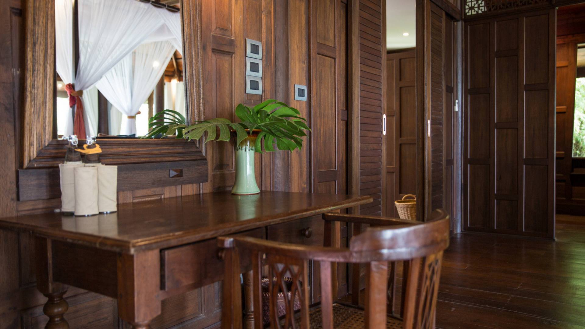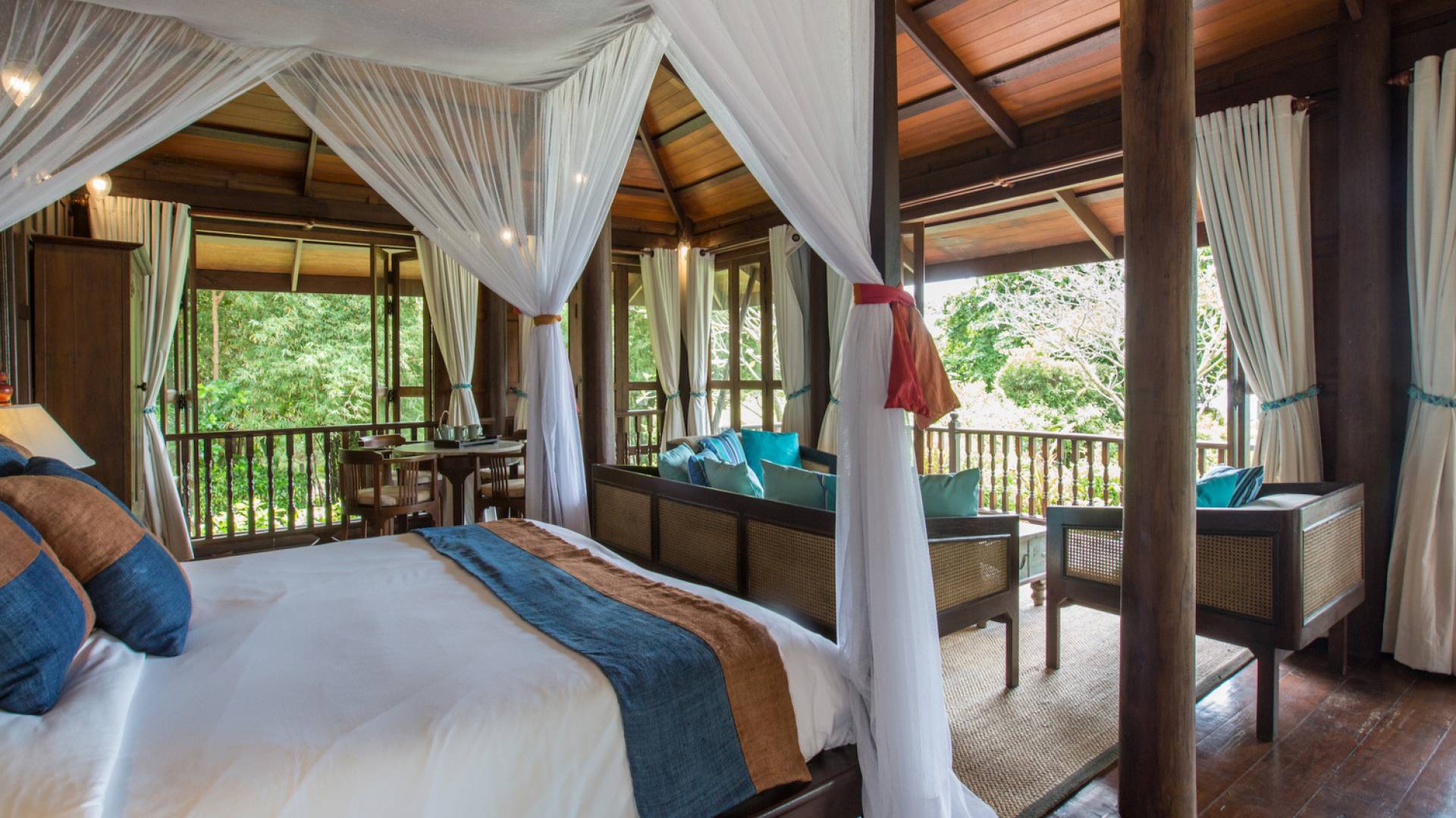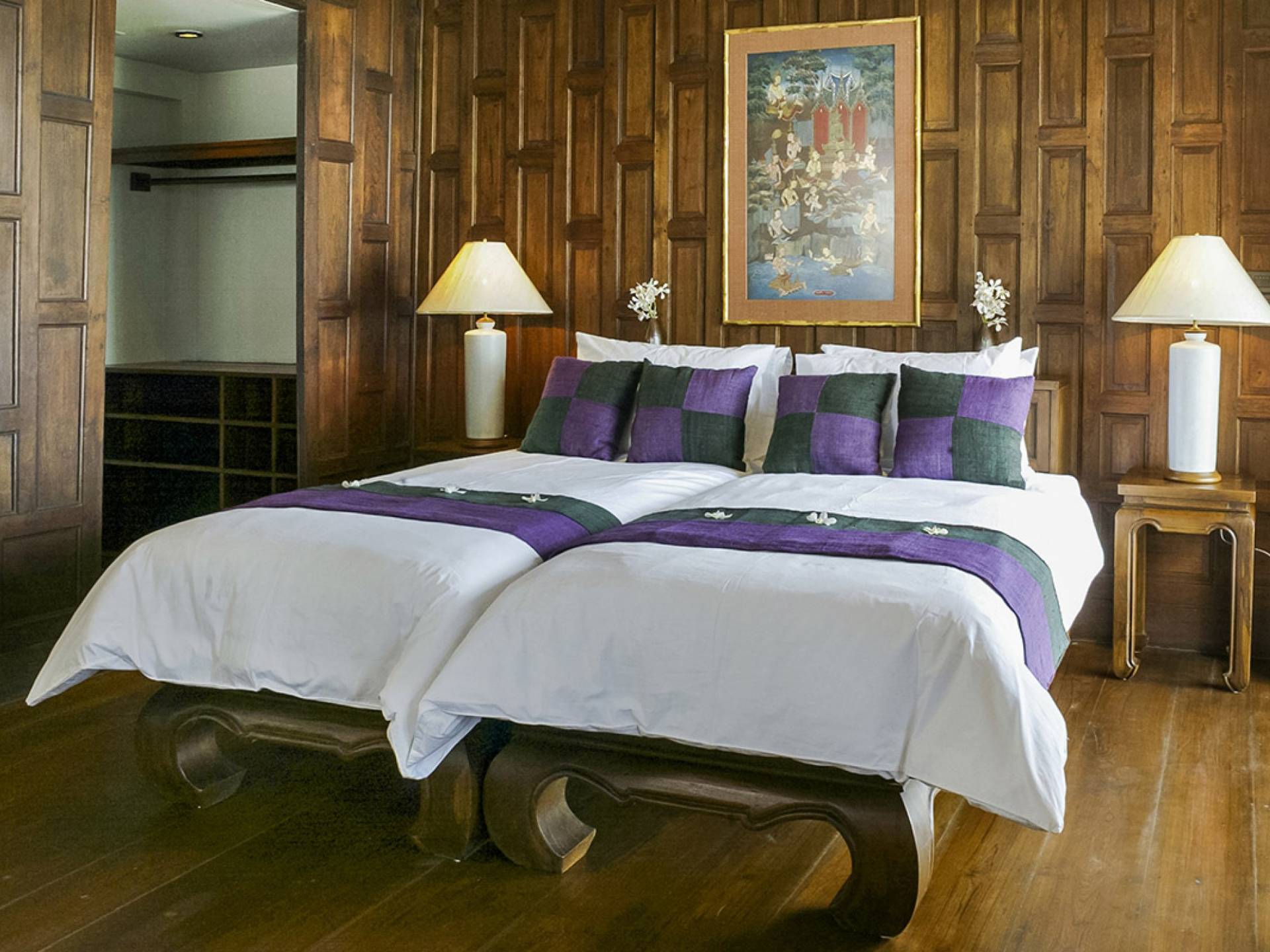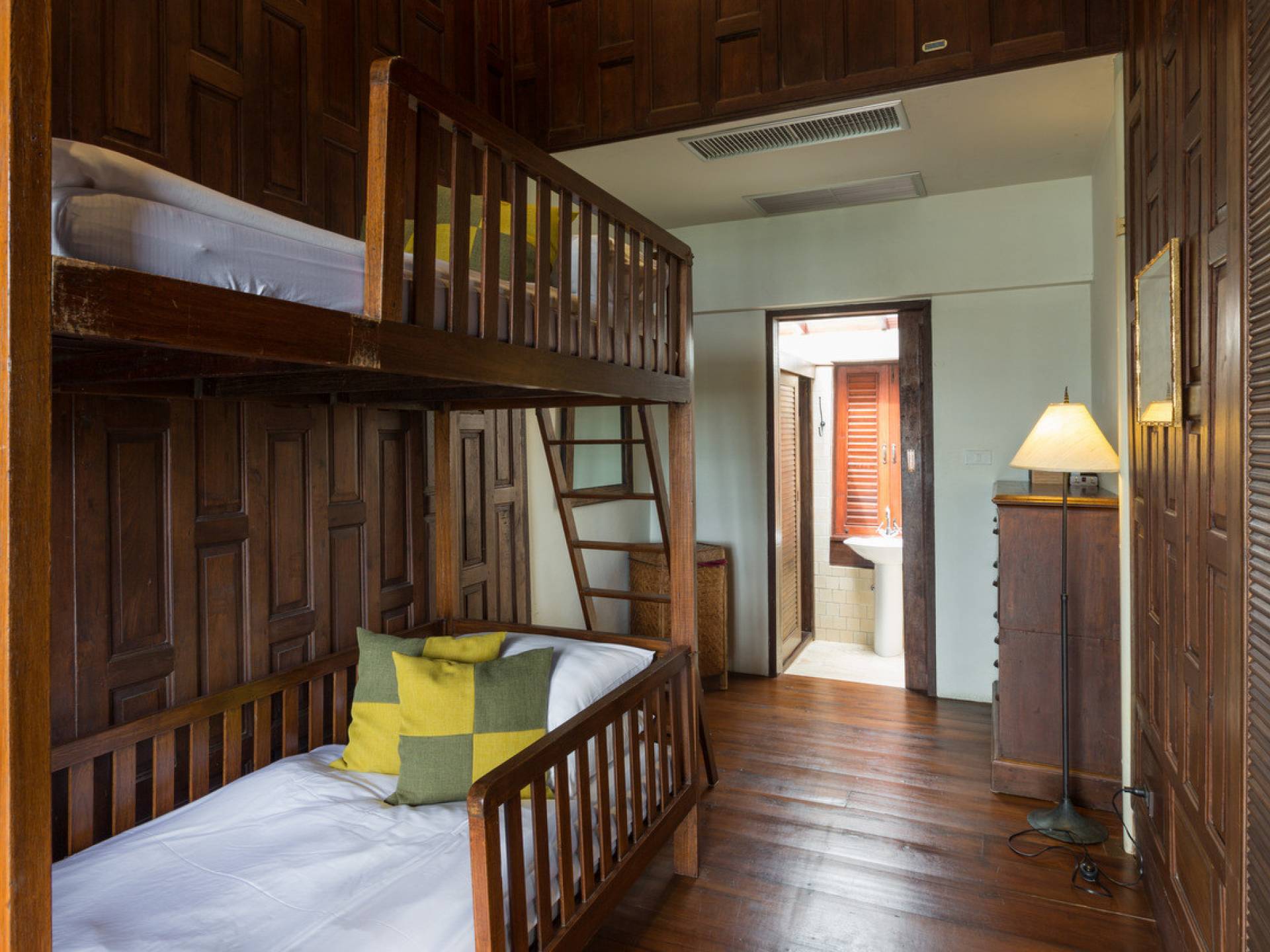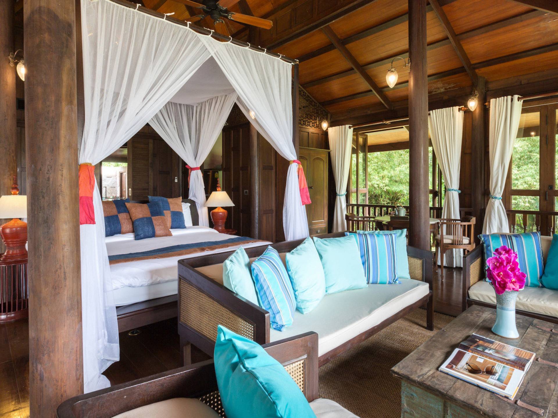 Die Hauptvilla beherbergt auch die neu renovierte Hauptsuite der Unterkunft. Gewölbte Decken mit freiliegenden Teakholzbalken und Sparren verleihen dem Raum einen authentischen thailändischen Charakter, und weiche Seidenmöbel verleihen dem Raum einen stilvollen Farbtupfer. Das Kinderzimmer in der Hauptvilla verfügt über Massivholz-Etagenbetten und ist schnell und einfach von der Master-Suite aus zugänglich und bietet einen gut angebundenen Raum für die ganze Familie. Der Schlafpavillon umfasst drei Schlafzimmer. Das erste verfügt über zwei Einzelbetten, einen geräumigen begehbaren Kleiderschrank und ein eigenes Badezimmer. Von der entspannenden Badewanne aus können Sie aussteigen und durch die Oberlichtdecke auf die umliegenden Palmen, den Mond und die Sterne blicken. Tagsüber lässt diese großflächige Überkopfverglasung auch die Sonne den Raum in natürliches Licht tauchen. Es gibt auch eine erfrischende Open-Air-Dusche. Der neu renovierte zweite Schlafbereich verfügt über zwei Einzelbetten, die zu einem Doppelbett zusammengestellt werden können. Ein brandneues Bad wurde ebenfalls integriert, wodurch diese flexible Zone perfekt für Erwachsene oder Kinder ist, die sich teilen. Angrenzend befindet sich das dritte Schlafzimmer, das über ein Doppelbett, einen begehbaren Kleiderschrank und ein komplettes Badezimmer mit einer überdachten Badewanne und einer weiteren Open-Air-Dusche verfügt. Alle Zimmer des Ban Sairee sind mit authentischen Möbeln im thailändischen Stil ausgestattet, mit einer Fülle echter Antiquitäten, die in der gesamten Unterkunft gespickt sind. Glasschiebetüren können aufgezogen werden, um den spektakulären Meerblick zu maximieren und die Gäste können die erfrischende Meeresbrise genießen, auch wenn sie sich im Haus entspannen.