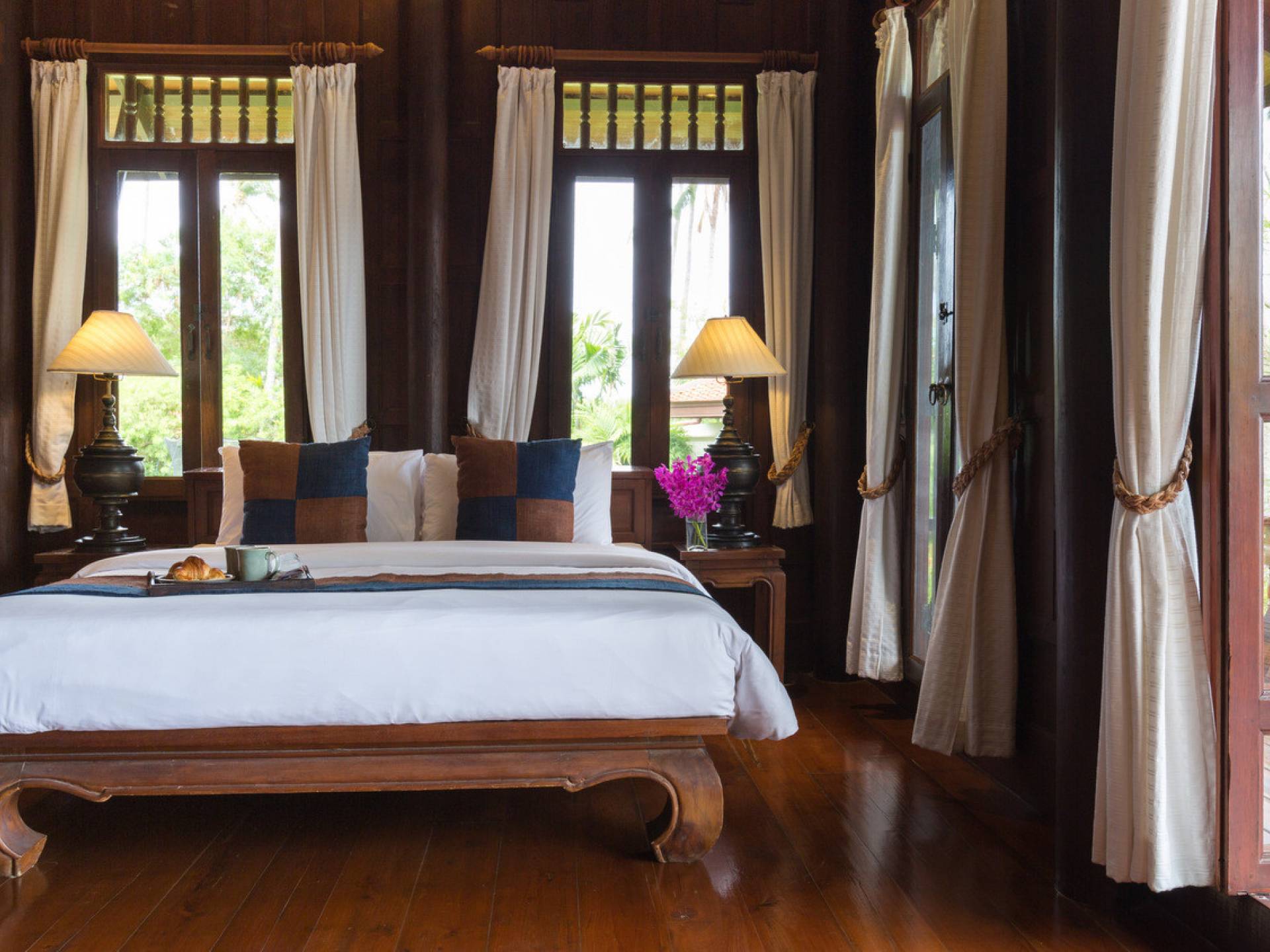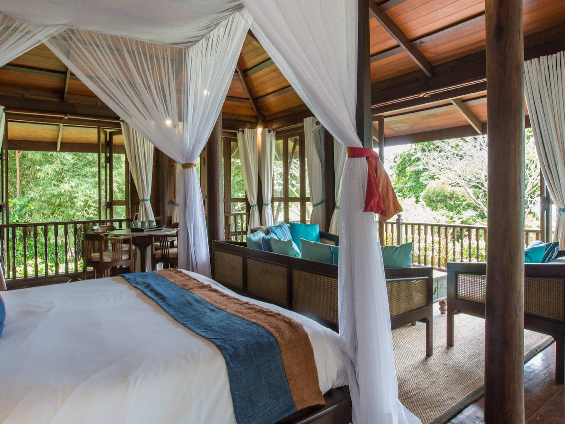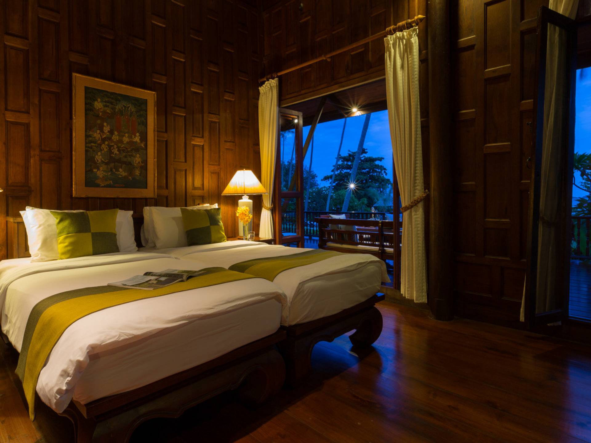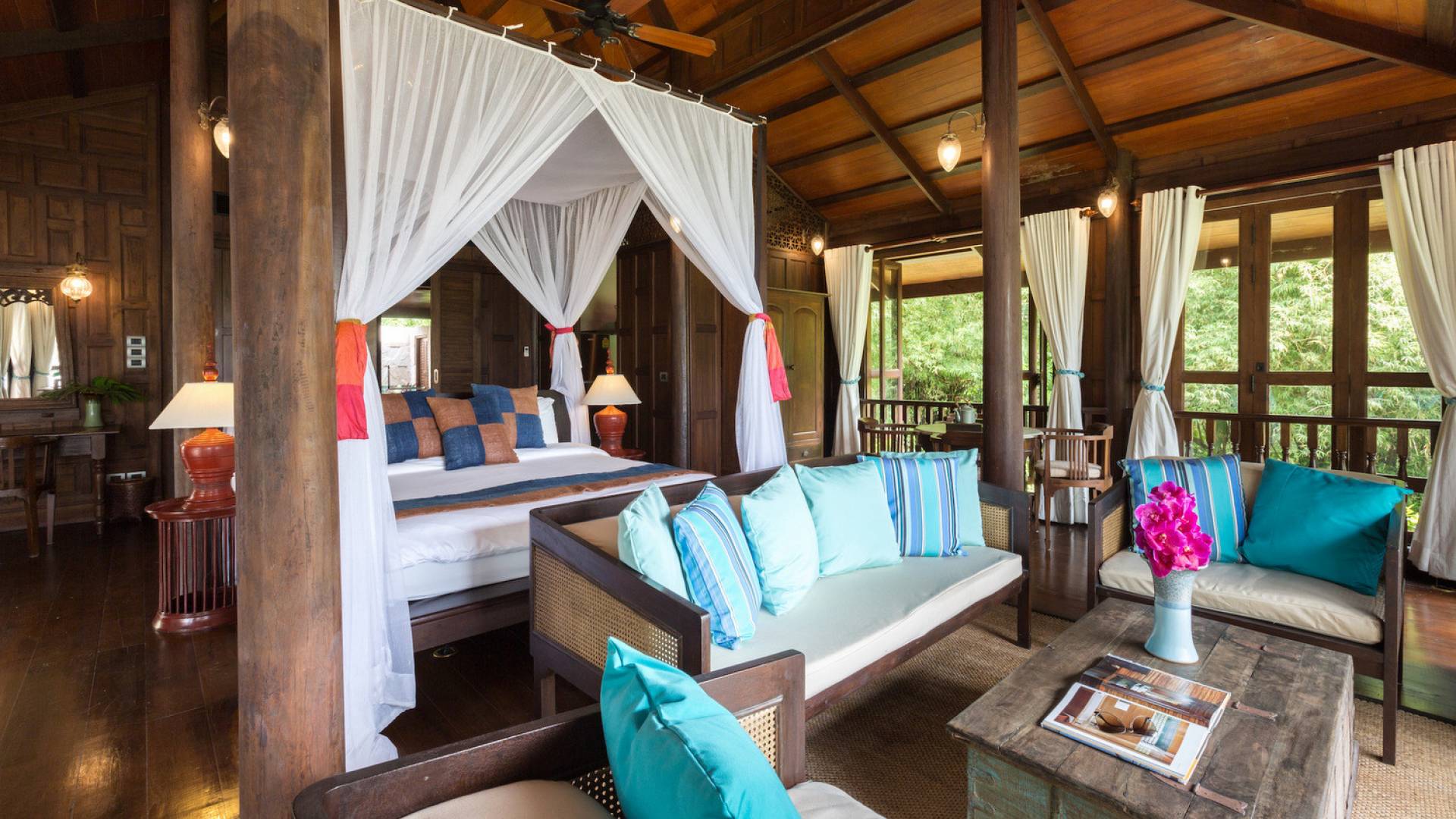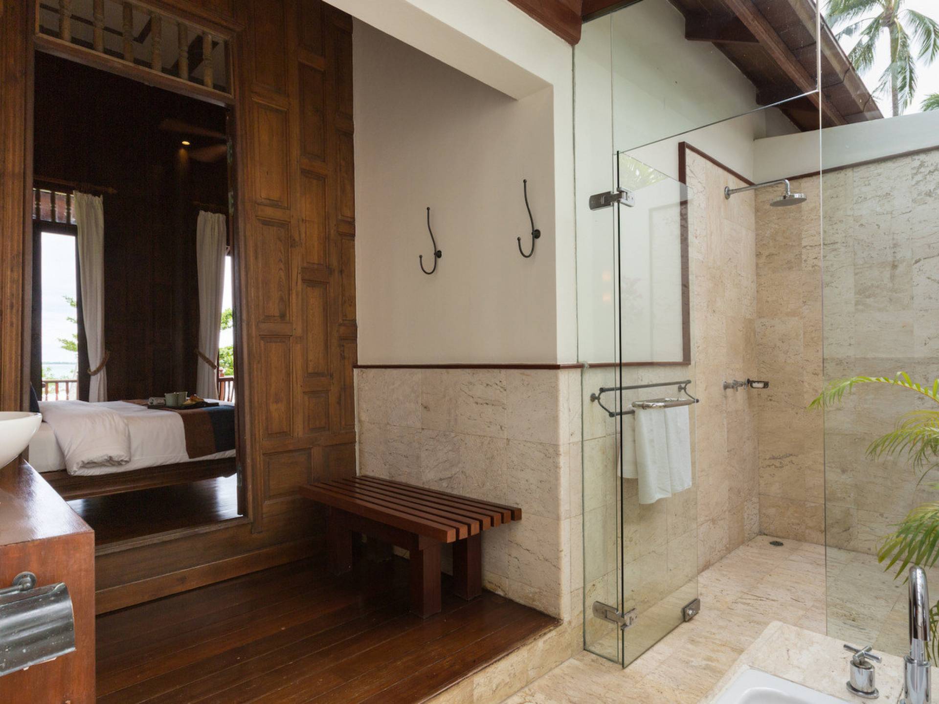 Die Hauptvilla beherbergt auch die neu renovierte Hauptsuite der Unterkunft. Gewölbte Decken mit freiliegenden Teakholzbalken und Sparren verleihen dem Raum einen authentischen thailändischen Charakter, und weiche Seidenmöbel verleihen dem Raum einen stilvollen Farbtupfer. Das Kinderzimmer in der Hauptvilla verfügt über Massivholz-Etagenbetten und ist schnell und einfach von der Master-Suite aus zugänglich und bietet einen gut angebundenen Raum für die ganze Familie. Der Schlafpavillon umfasst drei Schlafzimmer. Das erste verfügt über zwei Einzelbetten, einen geräumigen begehbaren Kleiderschrank und ein eigenes Badezimmer. Von der entspannenden Badewanne aus können Sie aussteigen und durch die Oberlichtdecke auf die umliegenden Palmen, den Mond und die Sterne blicken. Tagsüber lässt diese großflächige Überkopfverglasung auch die Sonne den Raum in natürliches Licht tauchen. Es gibt auch eine erfrischende Open-Air-Dusche. Der neu renovierte zweite Schlafbereich verfügt über zwei Einzelbetten, die zu einem Doppelbett zusammengestellt werden können. Ein brandneues Bad wurde ebenfalls integriert, wodurch diese flexible Zone perfekt für Erwachsene oder Kinder ist, die sich teilen. Angrenzend befindet sich das dritte Schlafzimmer, das über ein Doppelbett, einen begehbaren Kleiderschrank und ein komplettes Badezimmer mit einer überdachten Badewanne und einer weiteren Open-Air-Dusche verfügt. Alle Zimmer des Ban Sairee sind mit authentischen Möbeln im thailändischen Stil ausgestattet, mit einer Fülle echter Antiquitäten, die in der gesamten Unterkunft gespickt sind. Glasschiebetüren können aufgezogen werden, um den spektakulären Meerblick zu maximieren und die Gäste können die erfrischende Meeresbrise genießen, auch wenn sie sich im Haus entspannen.