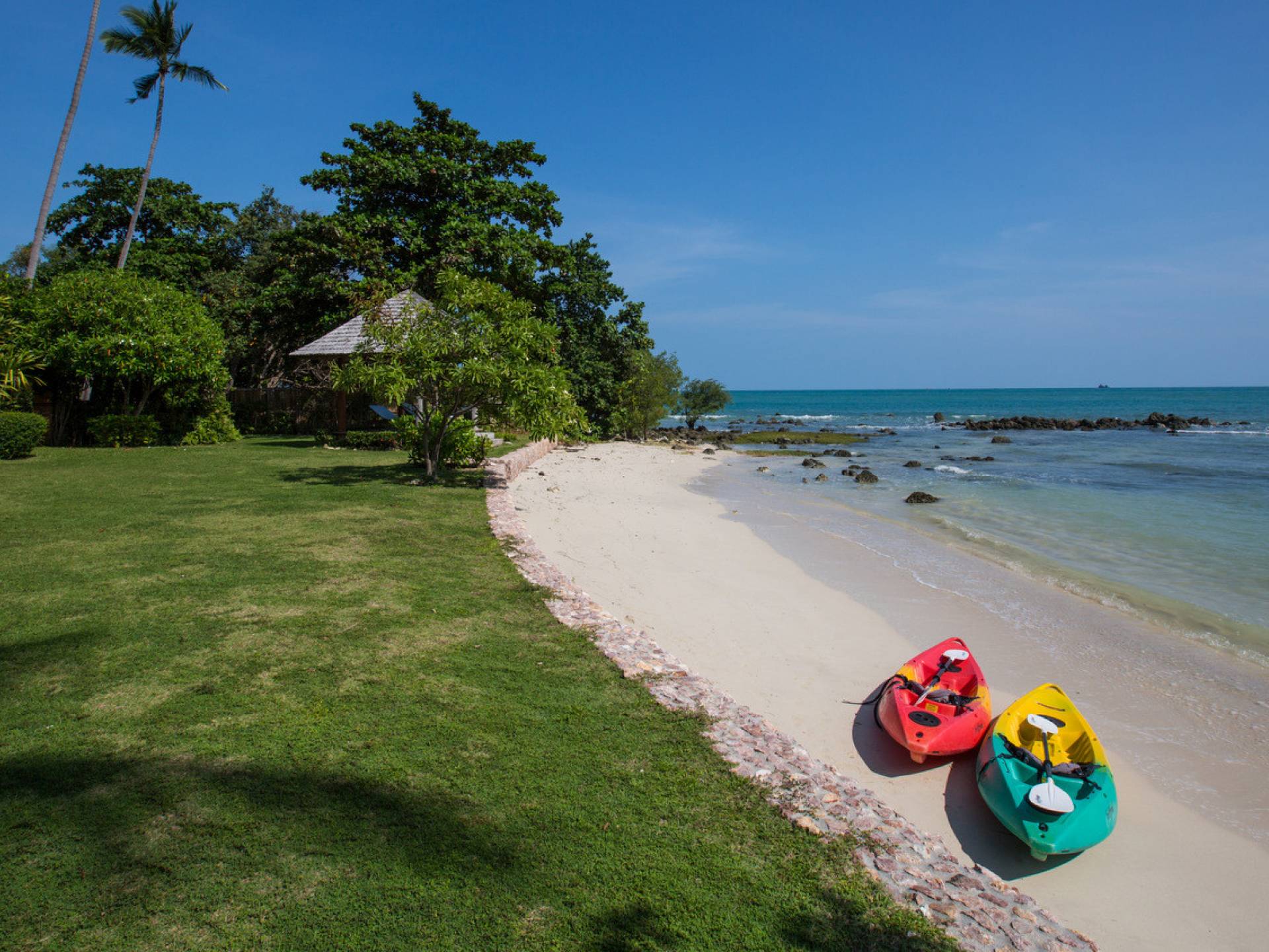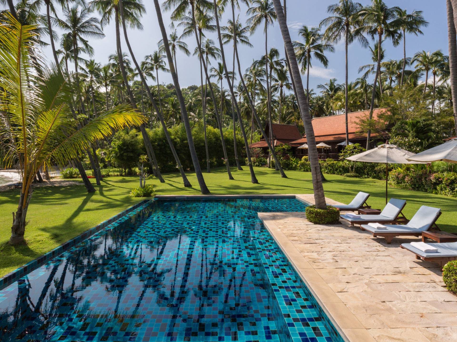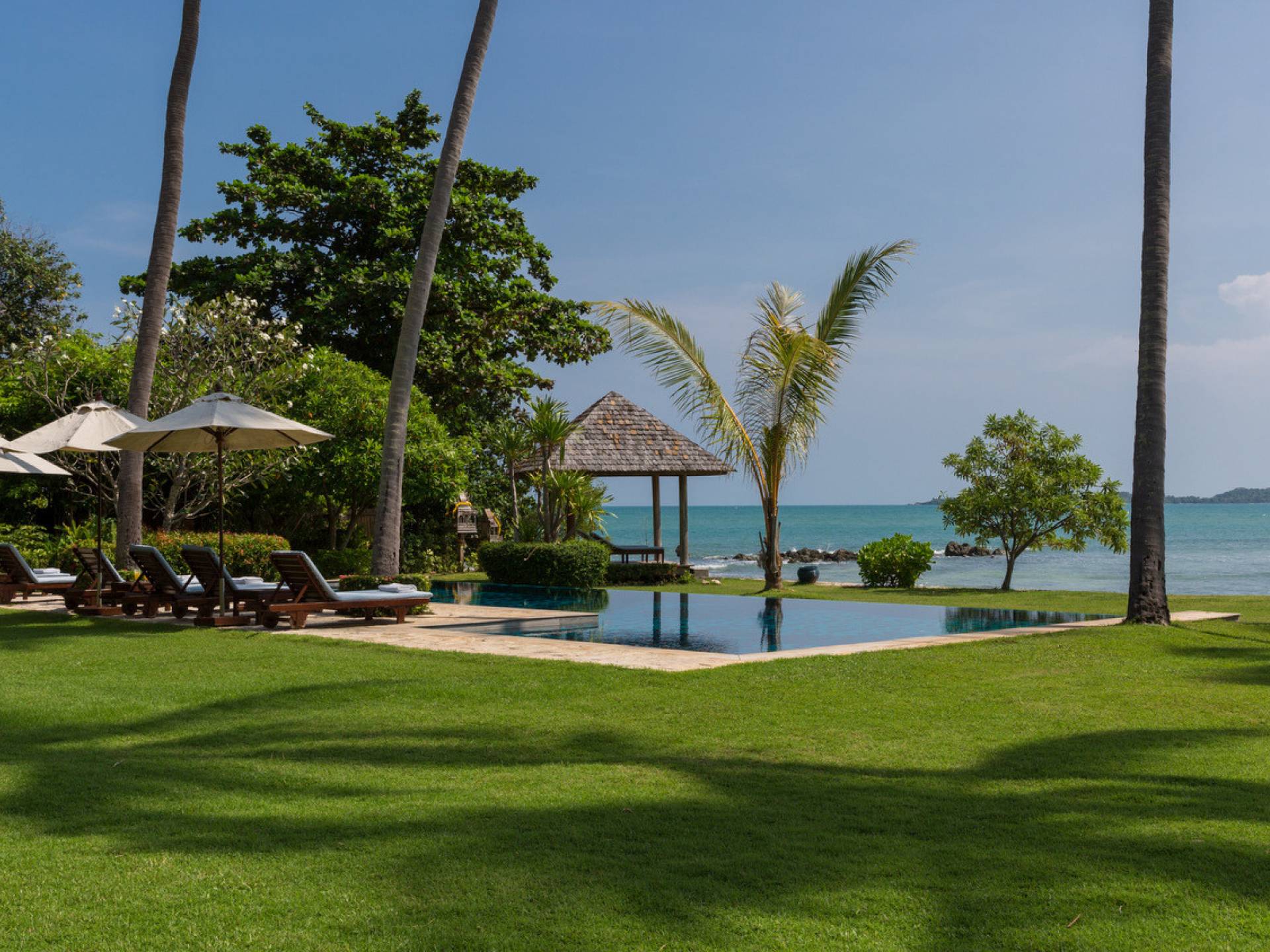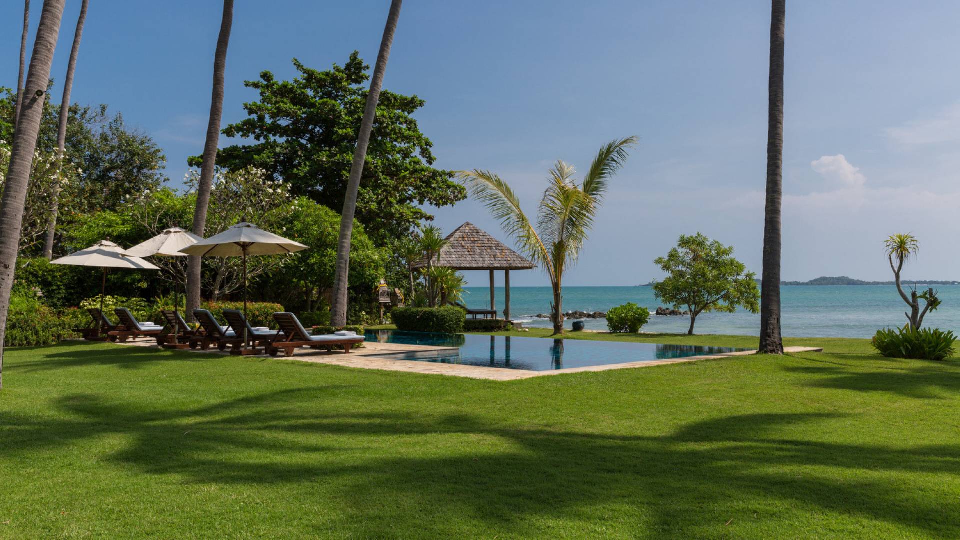 Beide Pavillons bieten direkten Zugang zum weitläufigen Garten der Villa mit Rasen, der sich zu einem einsamen Strand in einer halbmondförmigen, von Palmen gesäumten Bucht öffnet. Der Garten verfügt auch über einen großzügigen privaten Swimmingpool und ein privater Tennisplatz befindet sich hinter dem Haupthaus, den die Gäste nutzen können, wann immer sie Lust auf ein oder zwei haben.