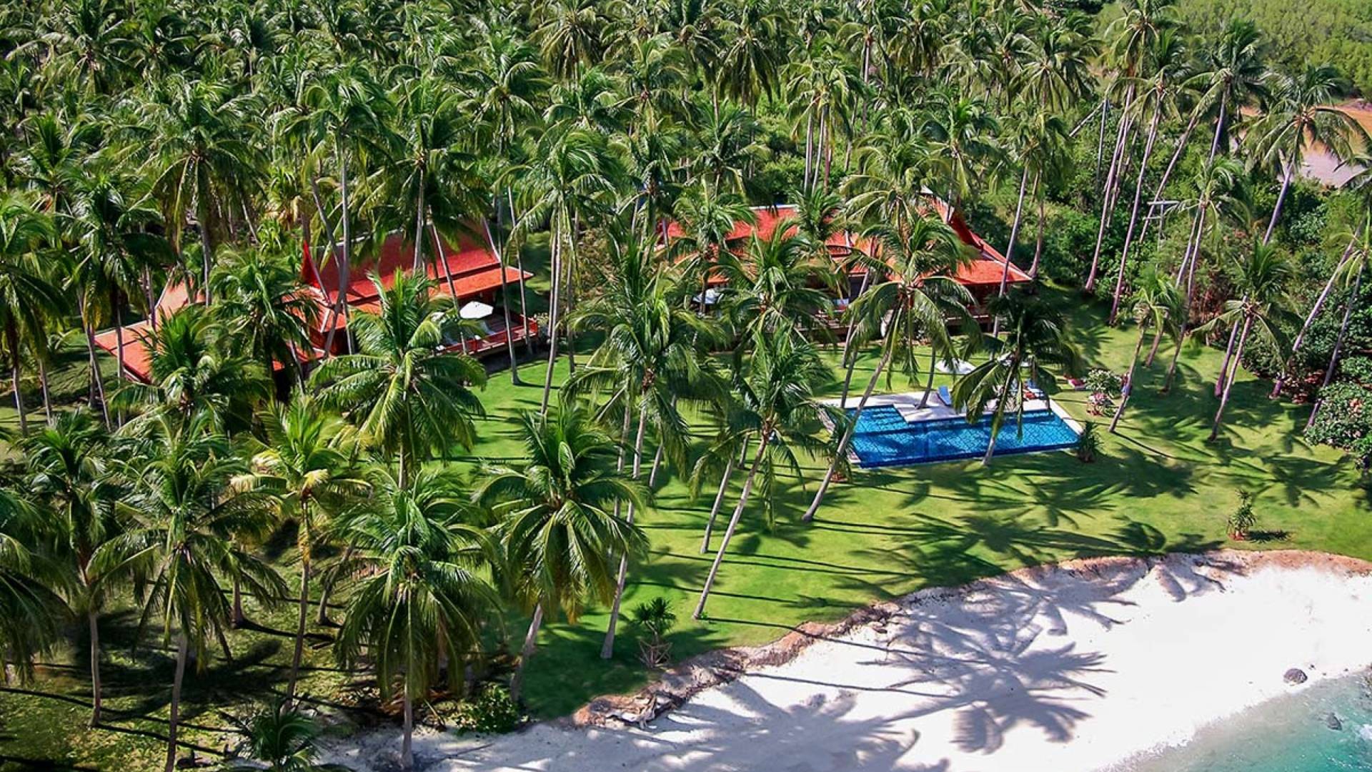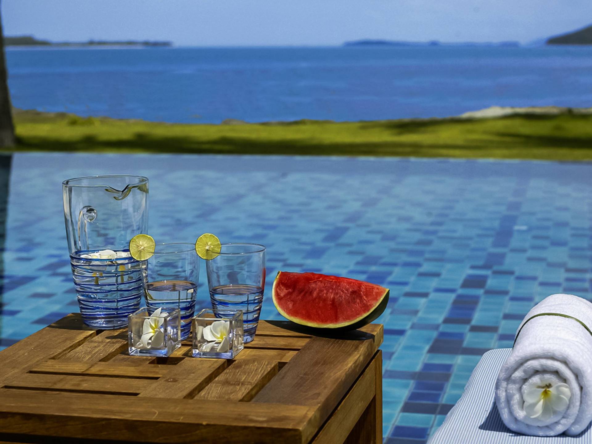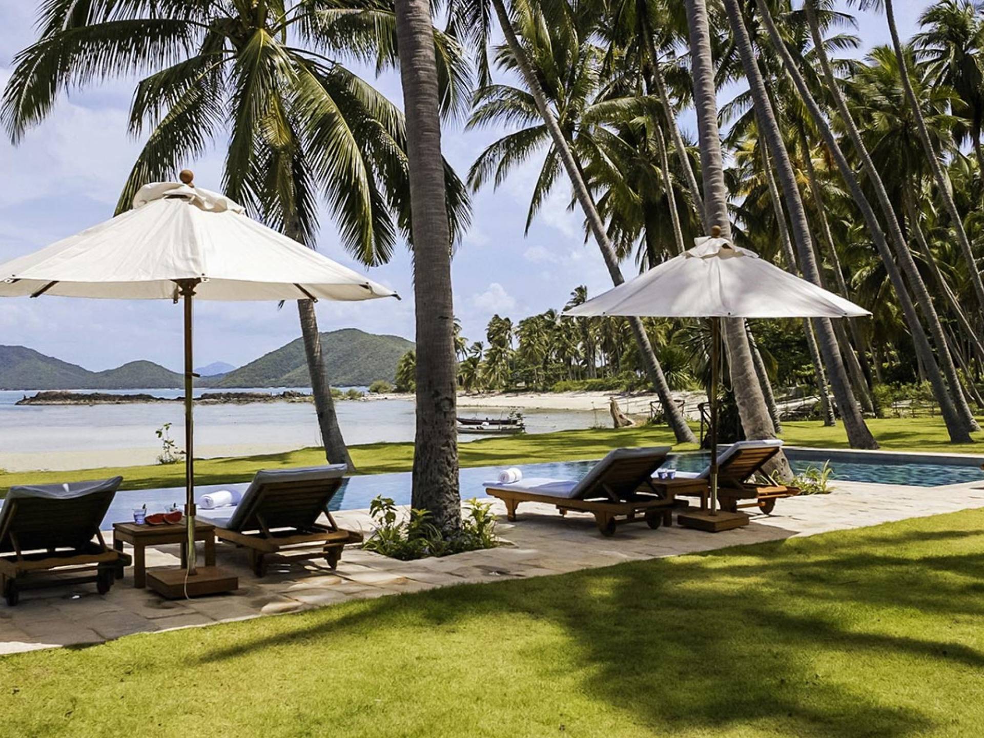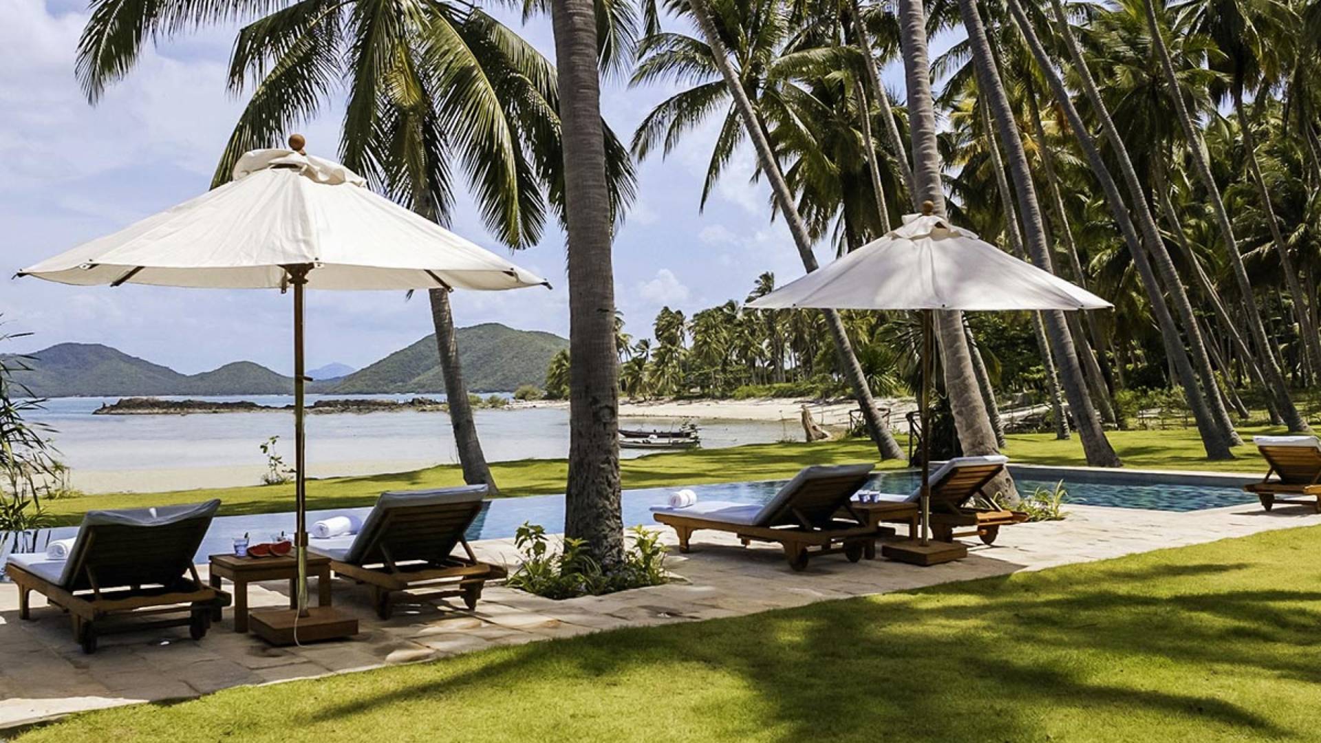 Beide Pavillons bieten direkten Zugang zum weitläufigen Garten der Villa mit Rasen, der sich zu einem einsamen Strand in einer halbmondförmigen, von Palmen gesäumten Bucht öffnet. Der Garten verfügt auch über einen großzügigen privaten Swimmingpool und ein privater Tennisplatz befindet sich hinter dem Haupthaus, den die Gäste nutzen können, wann immer sie Lust auf ein oder zwei haben.