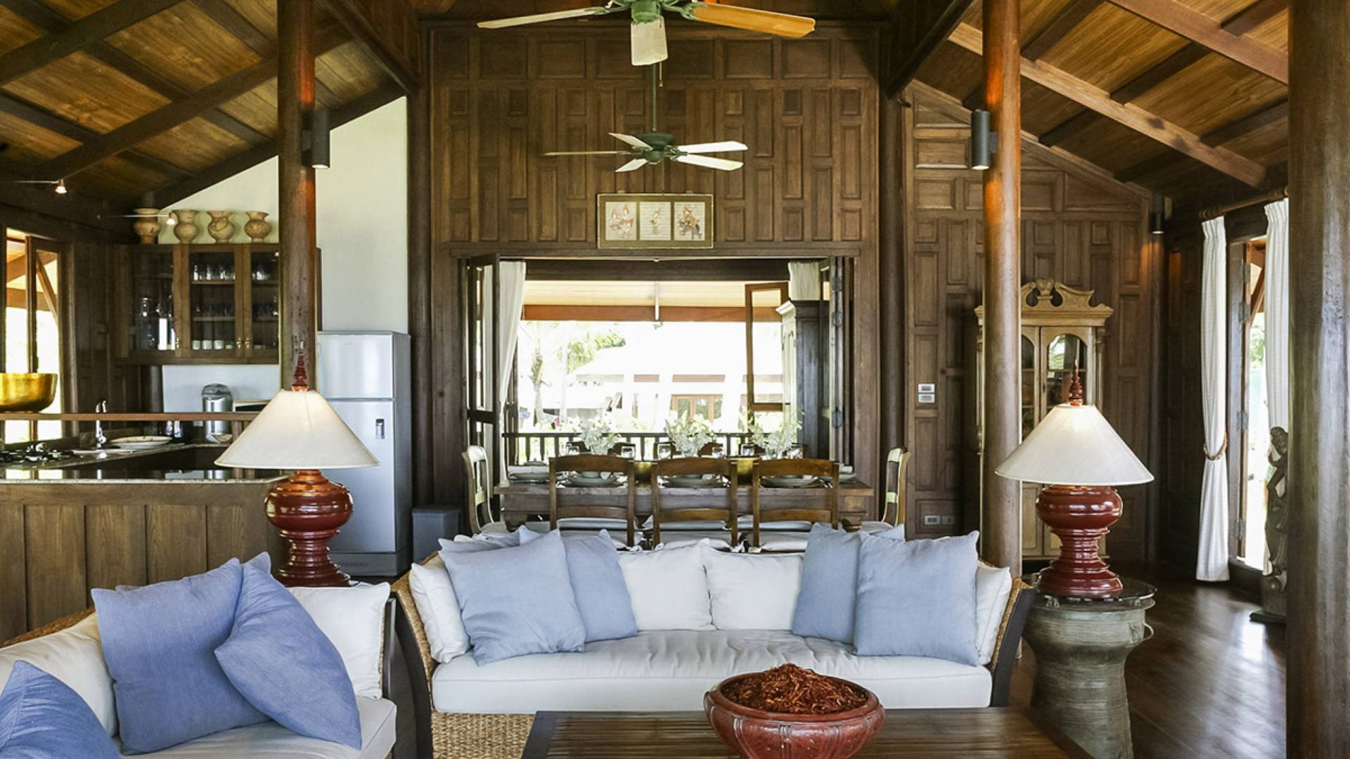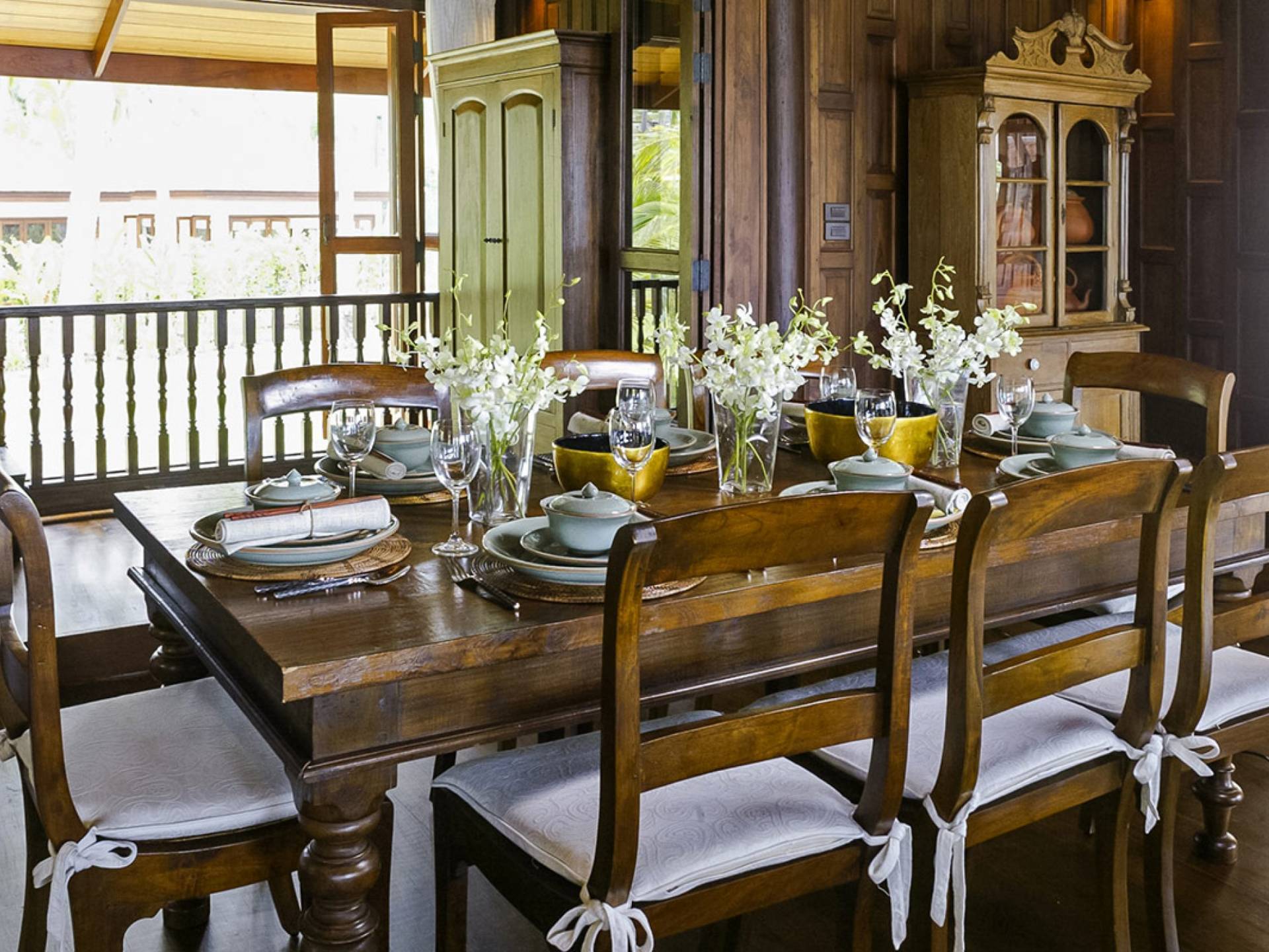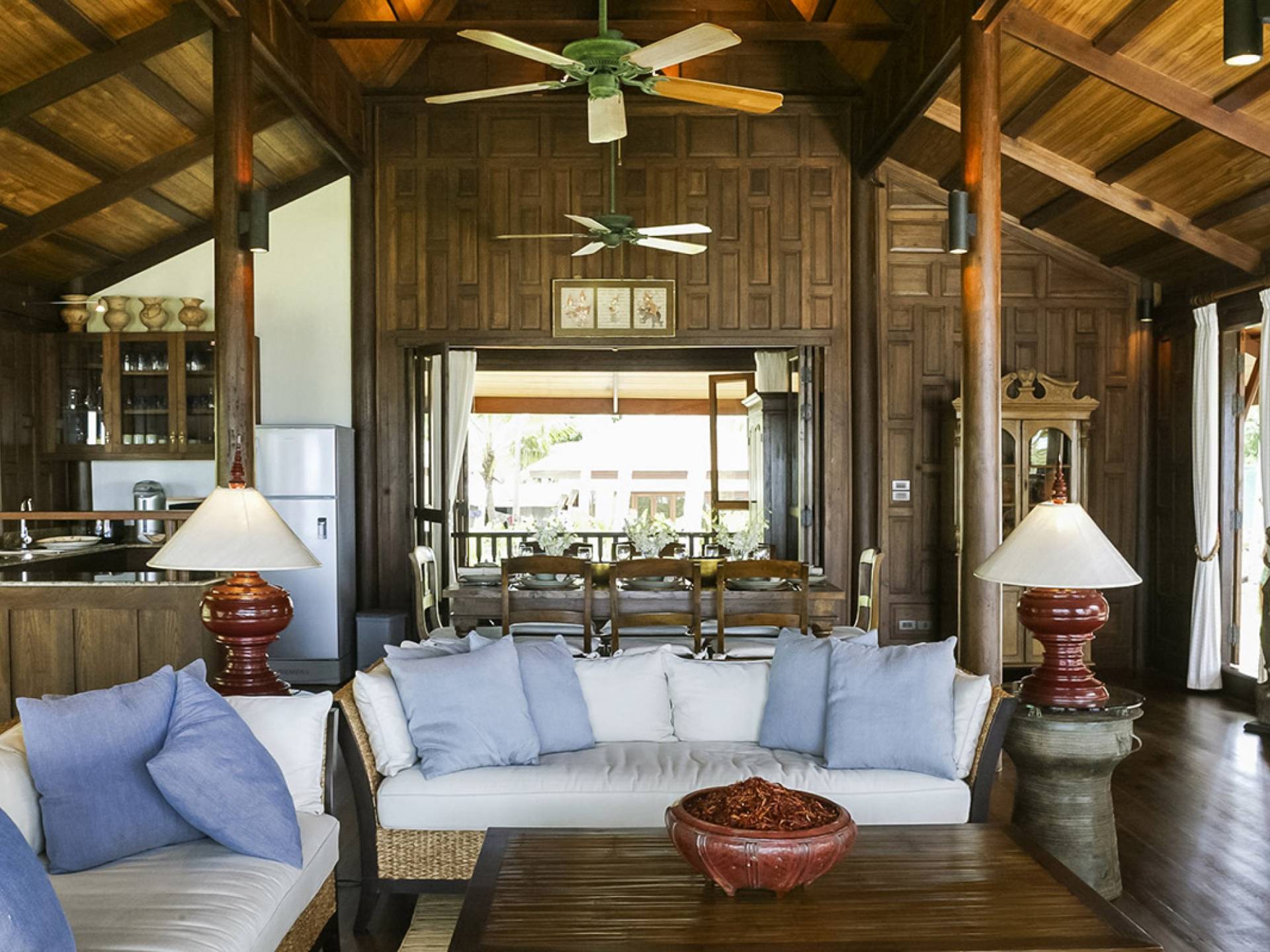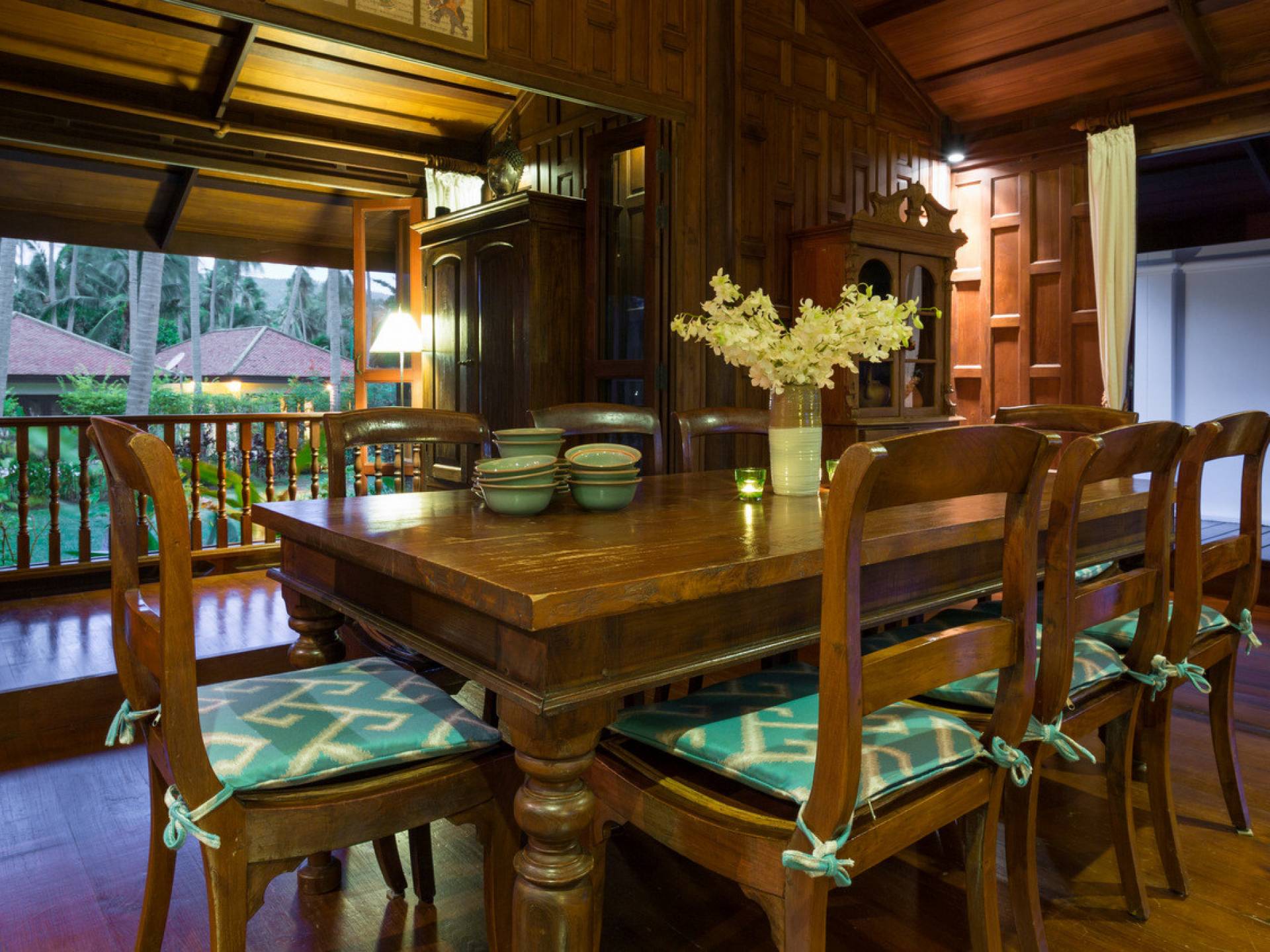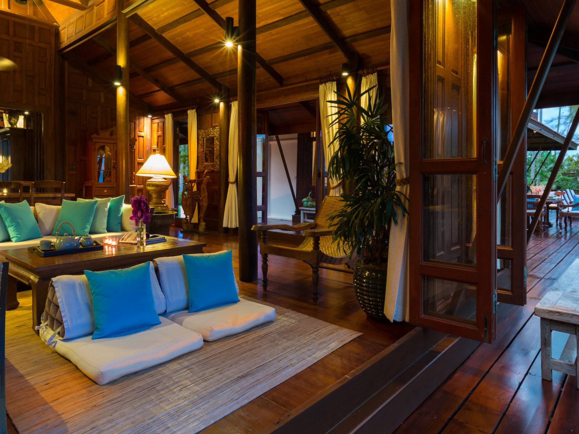 Der Wohnbereich mit offenem Schnitt ist komplett im original thailändischen Stil eingerichtet und verfügt über eine hohe Holzdecke. Es ist elegant mit schönen Wasserhyazinthensofas und einem langen klassischen Esstisch aus massivem Teakholz ausgestattet. Es gibt auch eine voll ausgestattete Küche und einen angrenzenden Fernsehraum, wenn die Gäste sich zurücklehnen und entspannen möchten. Auf der großen Holzterrasse finden Sie einen markanten antiken Esstisch sowie entspannende Sonnenliegen mit Blick auf die tropischen Gärten und das Meer. Wenn es Zeit zum Essen ist, haben die Gäste eine große Auswahl, sei es ein Candle-Light-Dinner im Wohnzimmer oder ein BBQ auf der Terrasse mit Meerblick.