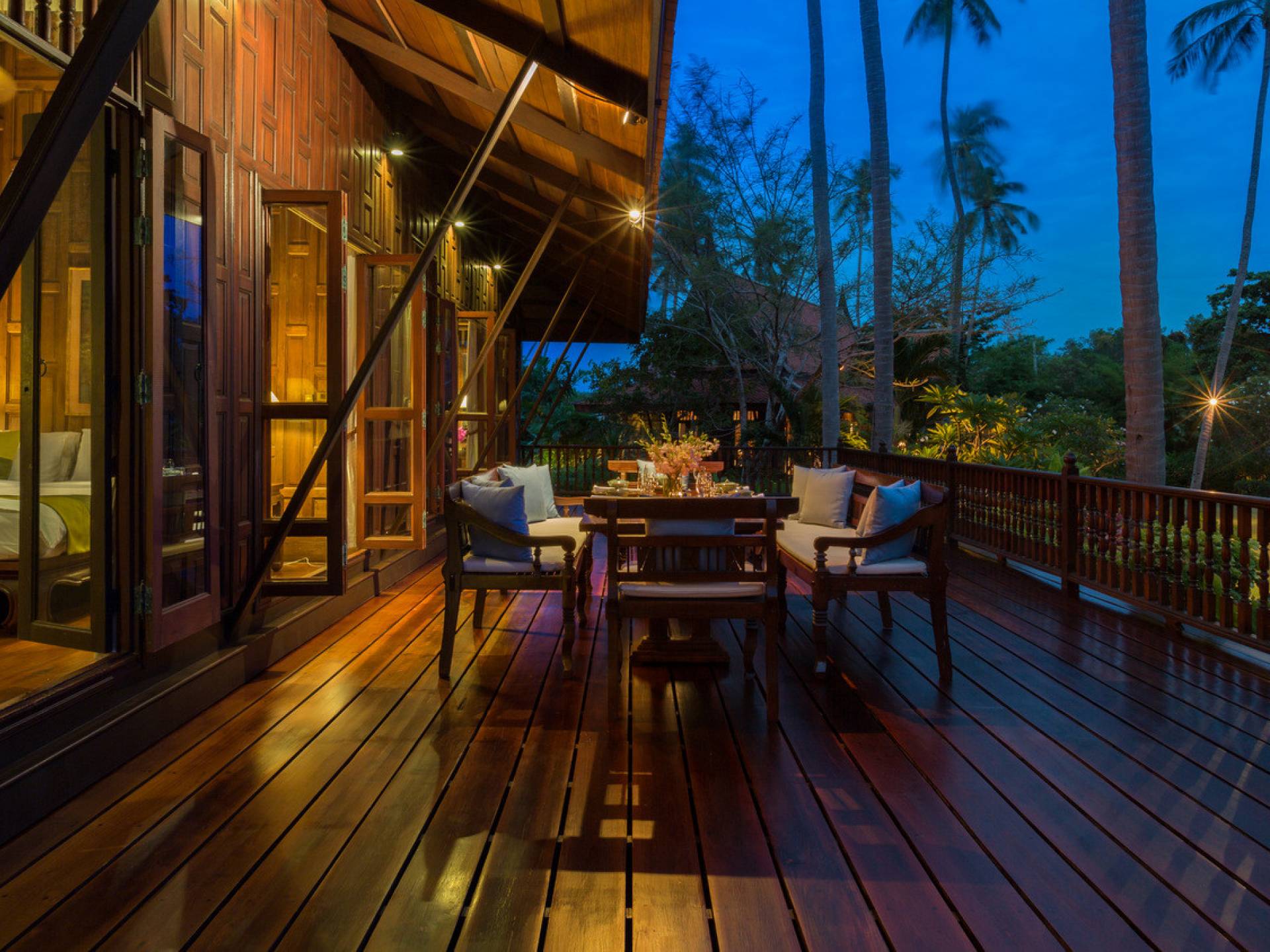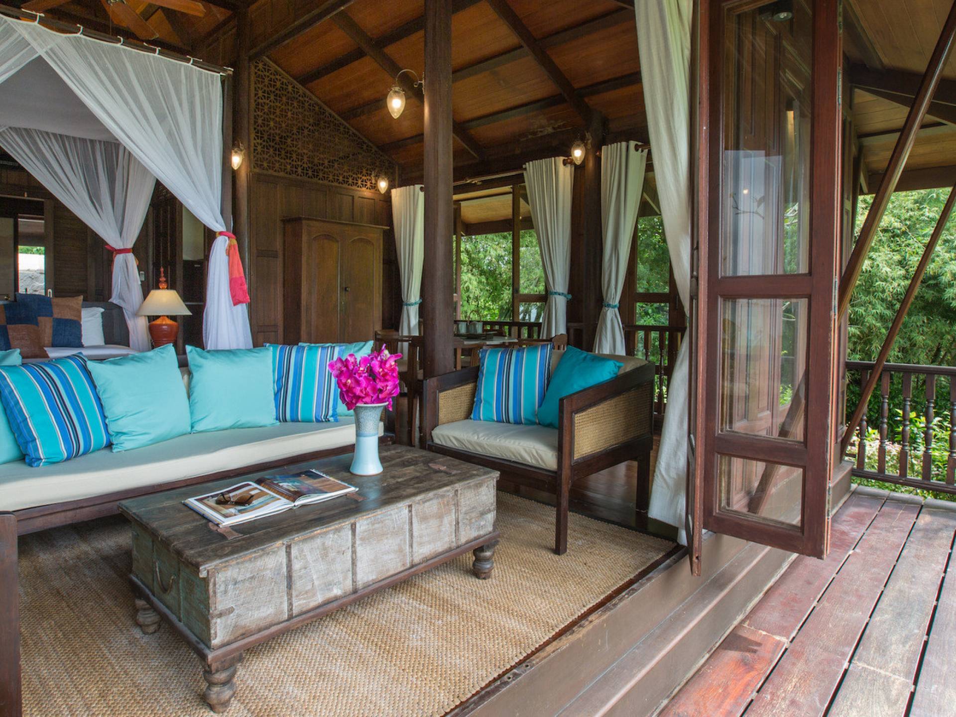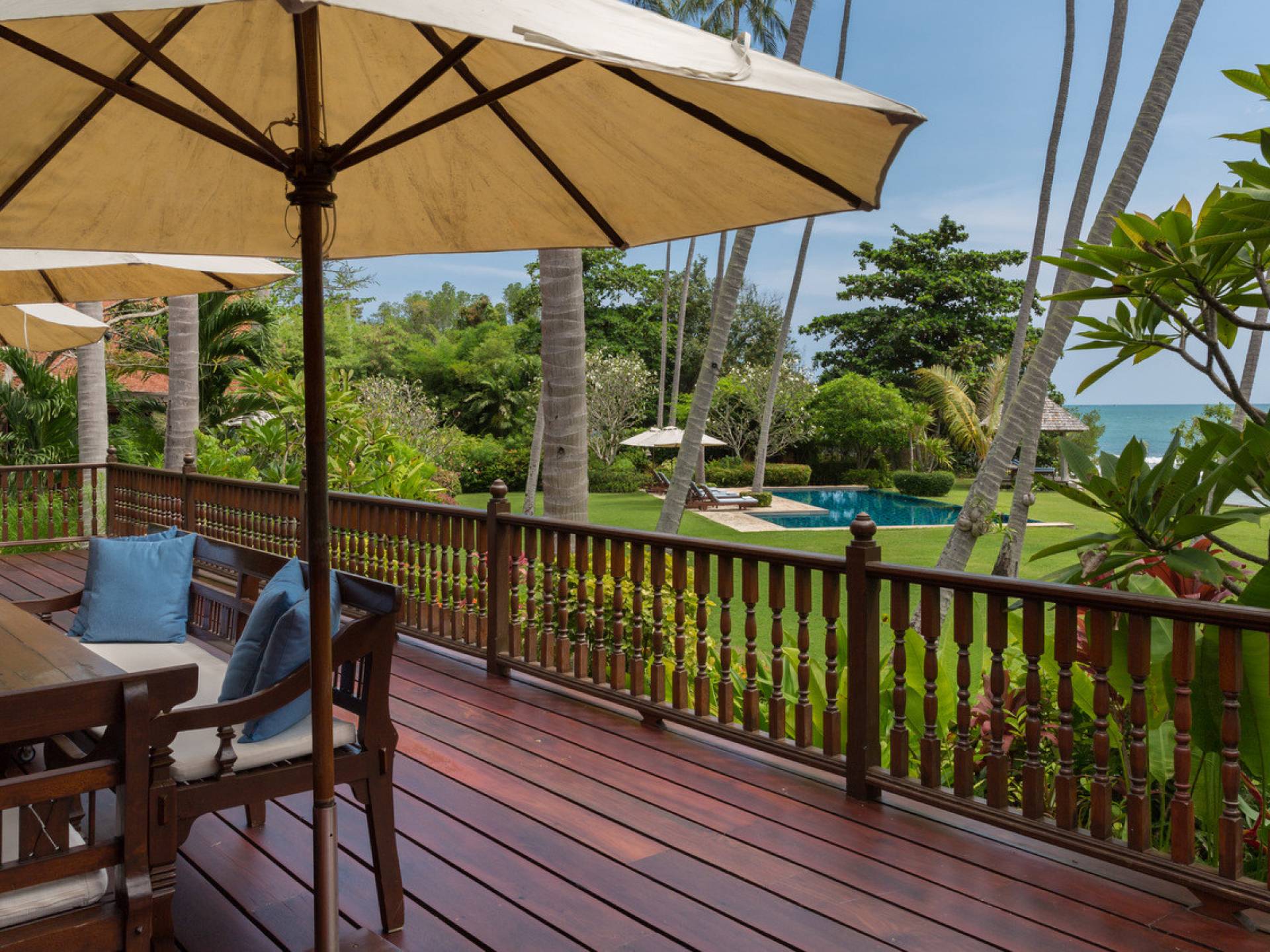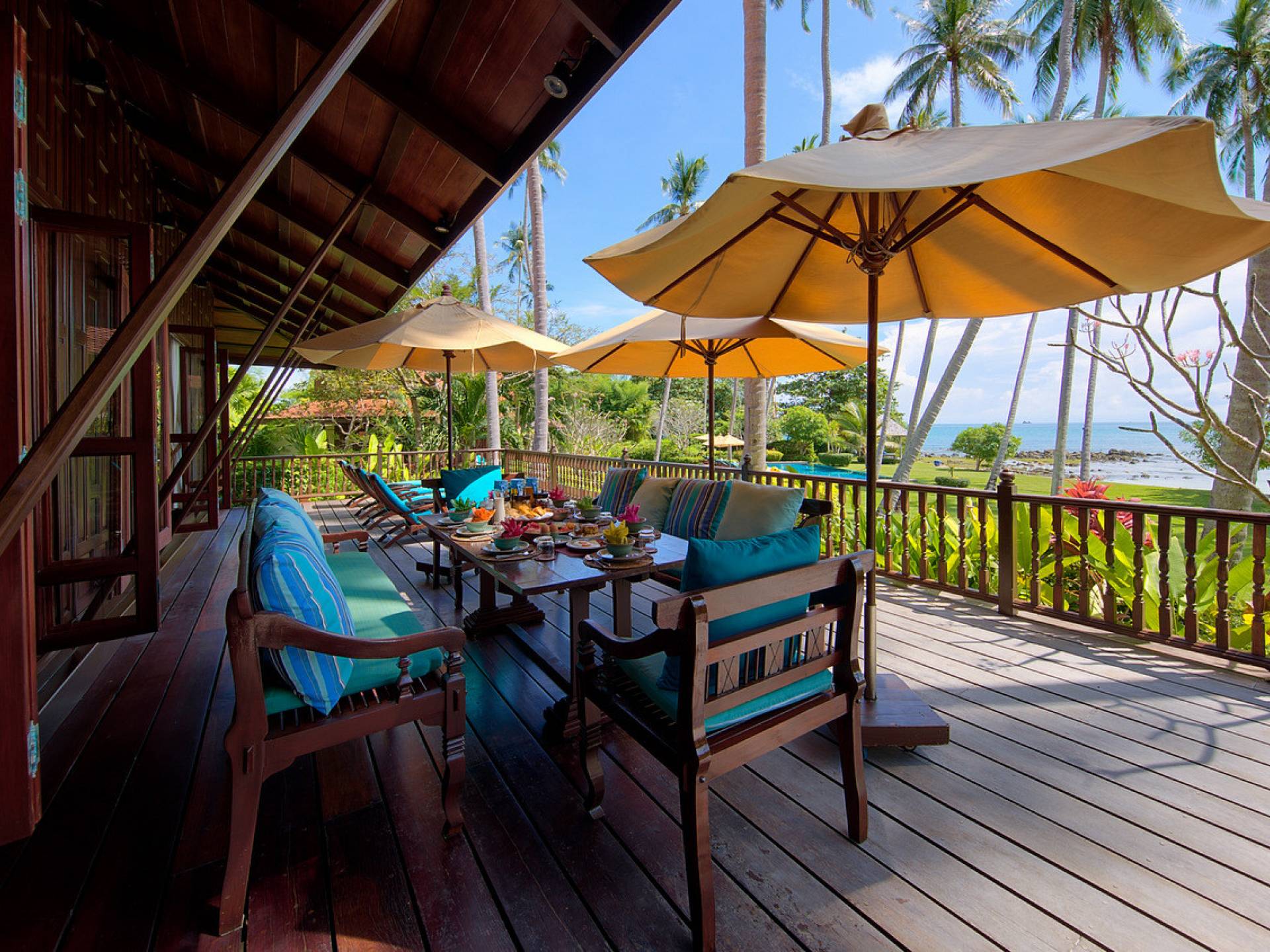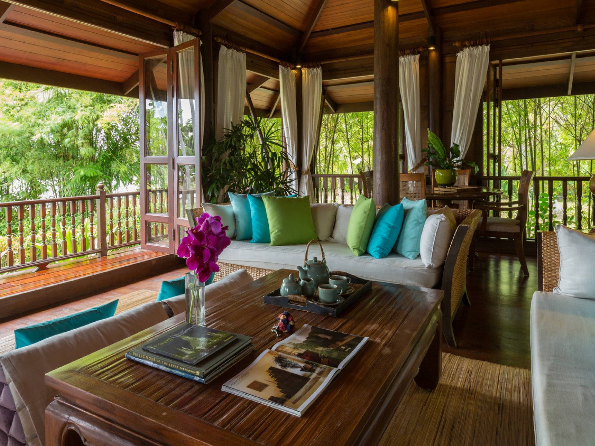 Der Wohnbereich mit offenem Schnitt ist komplett im original thailändischen Stil eingerichtet und verfügt über eine hohe Holzdecke. Es ist elegant mit schönen Wasserhyazinthensofas und einem langen klassischen Esstisch aus massivem Teakholz ausgestattet. Es gibt auch eine voll ausgestattete Küche und einen angrenzenden Fernsehraum, wenn die Gäste sich zurücklehnen und entspannen möchten. Auf der großen Holzterrasse finden Sie einen markanten antiken Esstisch sowie entspannende Sonnenliegen mit Blick auf die tropischen Gärten und das Meer. Wenn es Zeit zum Essen ist, haben die Gäste eine große Auswahl, sei es ein Candle-Light-Dinner im Wohnzimmer oder ein BBQ auf der Terrasse mit Meerblick.
