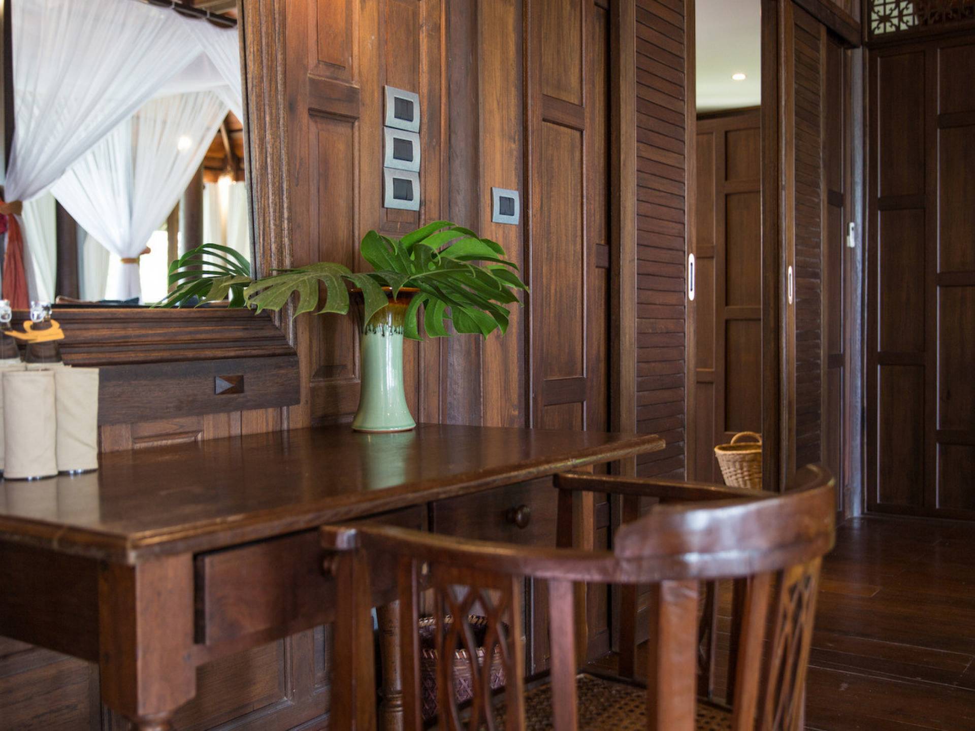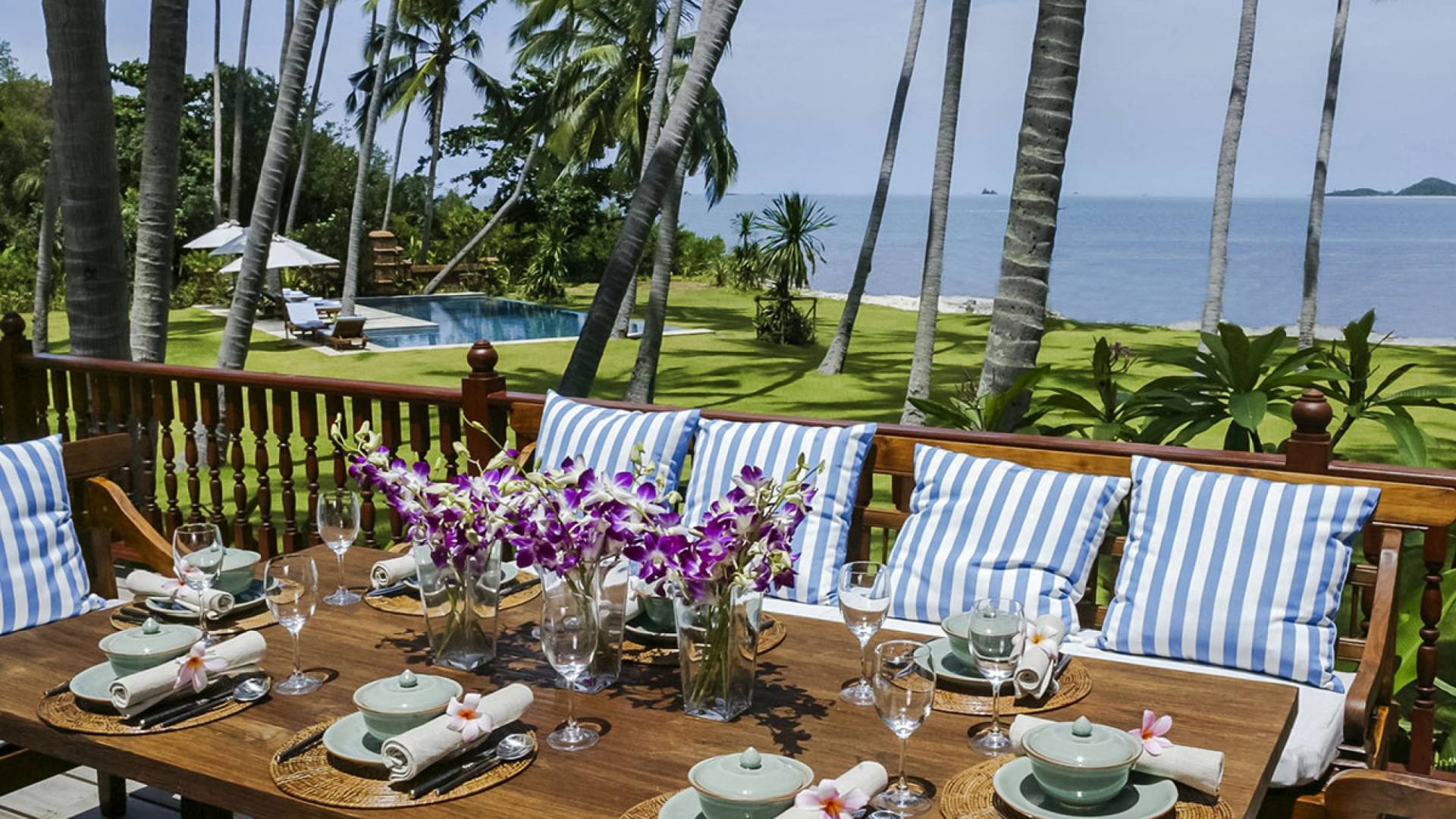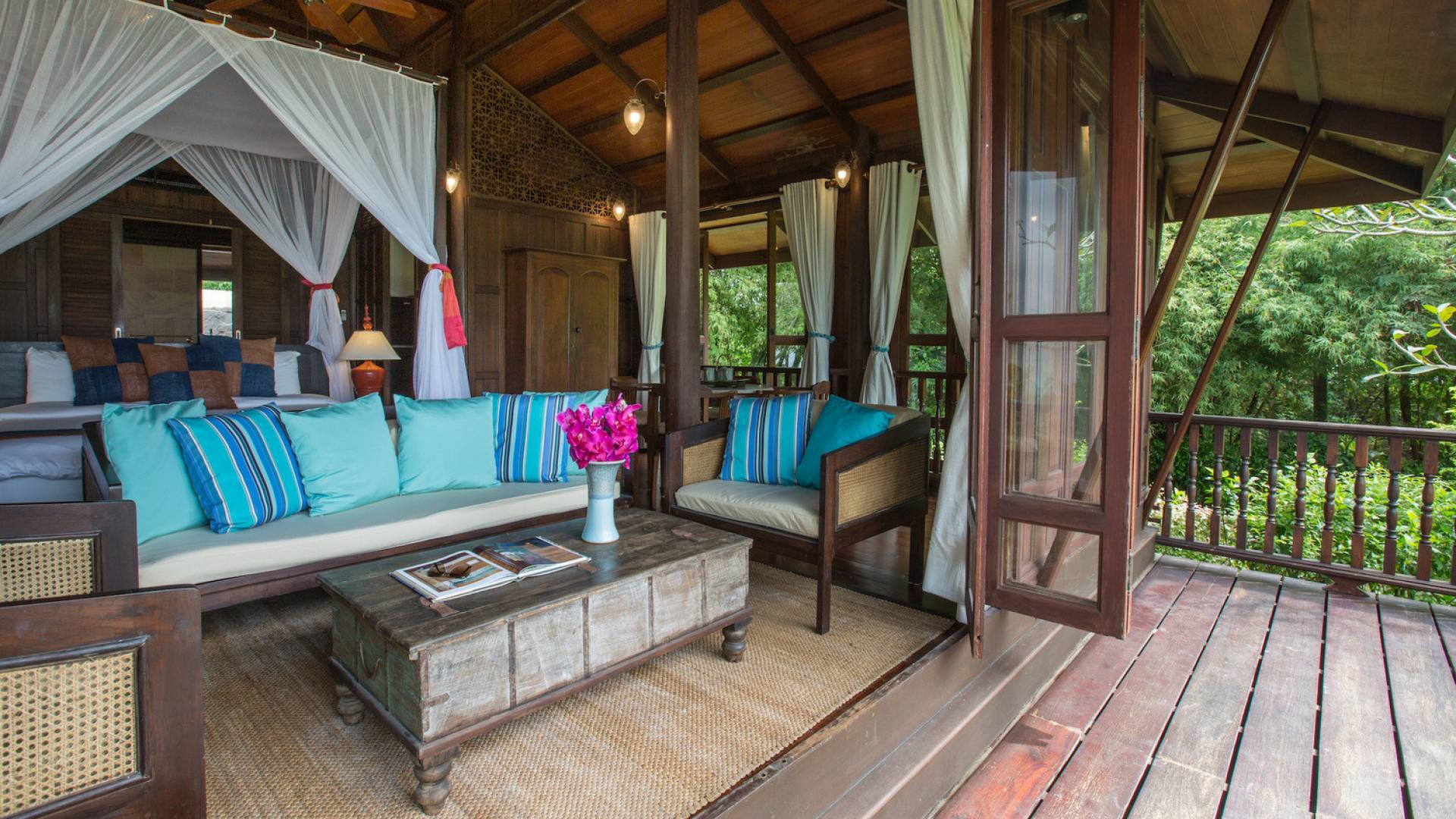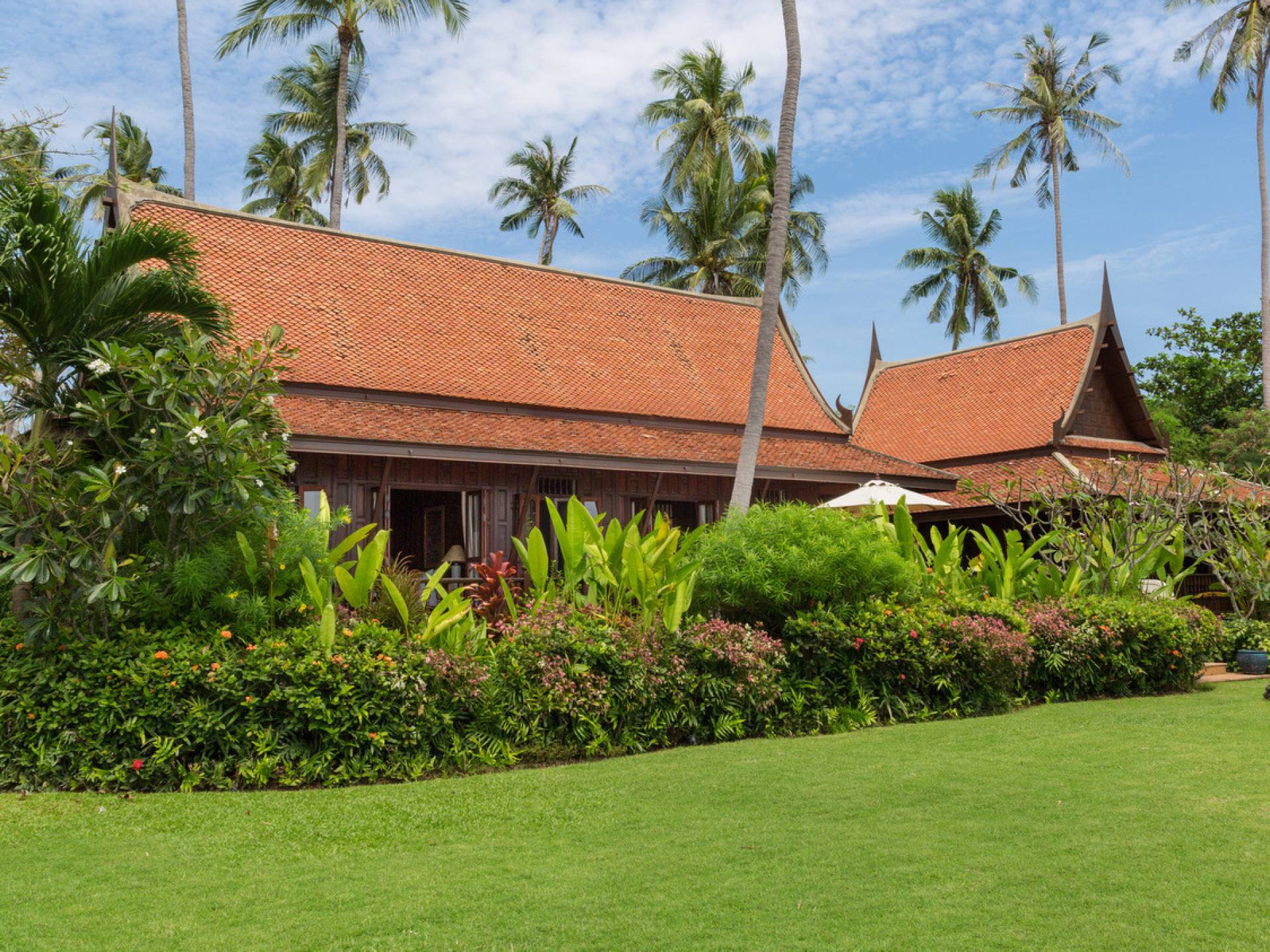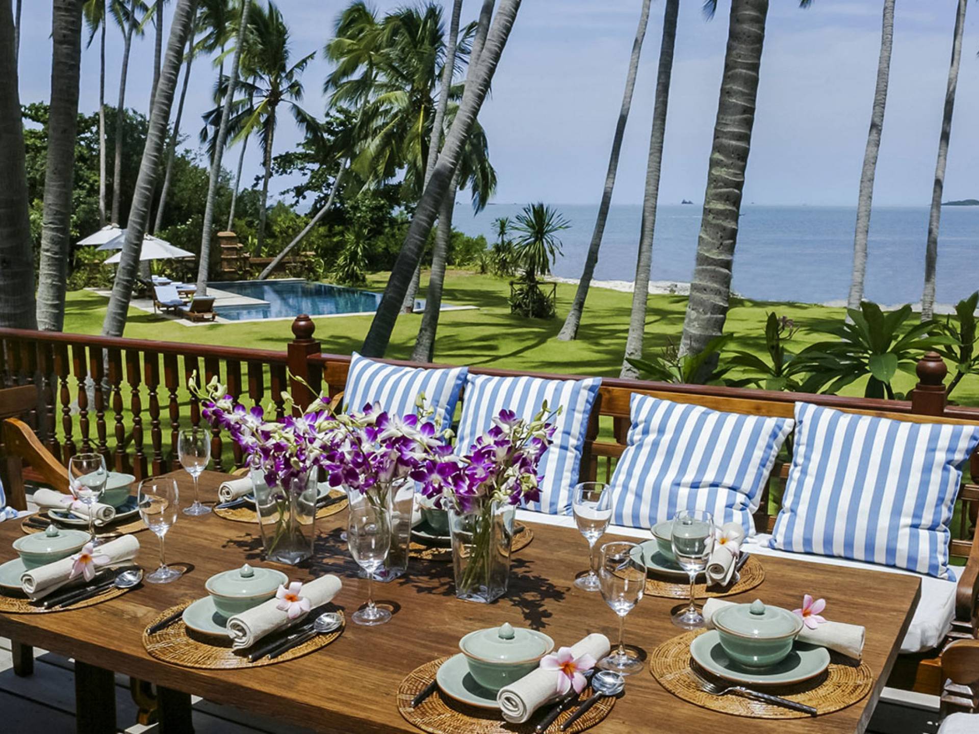 Der Wohnbereich mit offenem Schnitt ist komplett im original thailändischen Stil eingerichtet und verfügt über eine hohe Holzdecke. Es ist elegant mit schönen Wasserhyazinthensofas und einem langen klassischen Esstisch aus massivem Teakholz ausgestattet. Es gibt auch eine voll ausgestattete Küche und einen angrenzenden Fernsehraum, wenn die Gäste sich zurücklehnen und entspannen möchten. Auf der großen Holzterrasse finden Sie einen markanten antiken Esstisch sowie entspannende Sonnenliegen mit Blick auf die tropischen Gärten und das Meer. Wenn es Zeit zum Essen ist, haben die Gäste eine große Auswahl, sei es ein Candle-Light-Dinner im Wohnzimmer oder ein BBQ auf der Terrasse mit Meerblick.