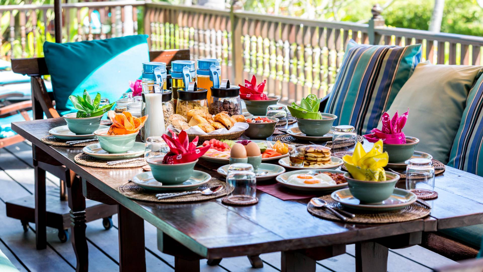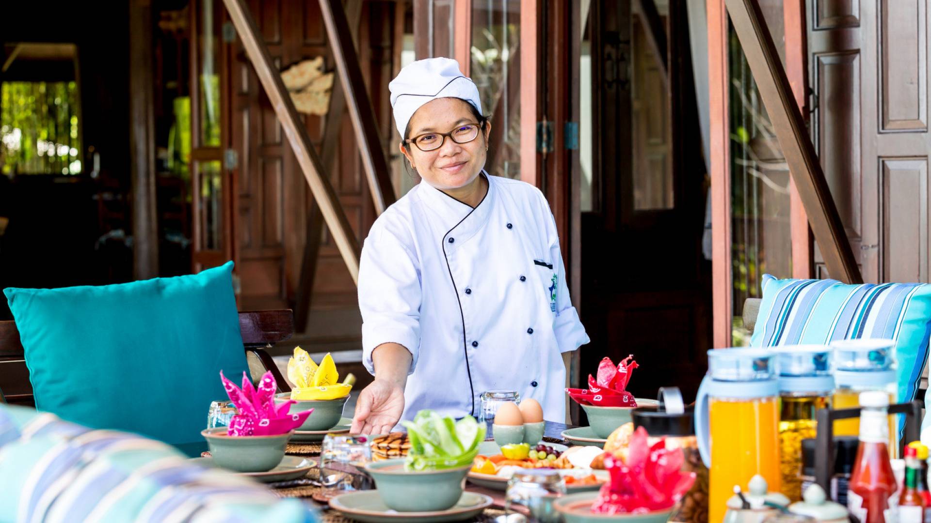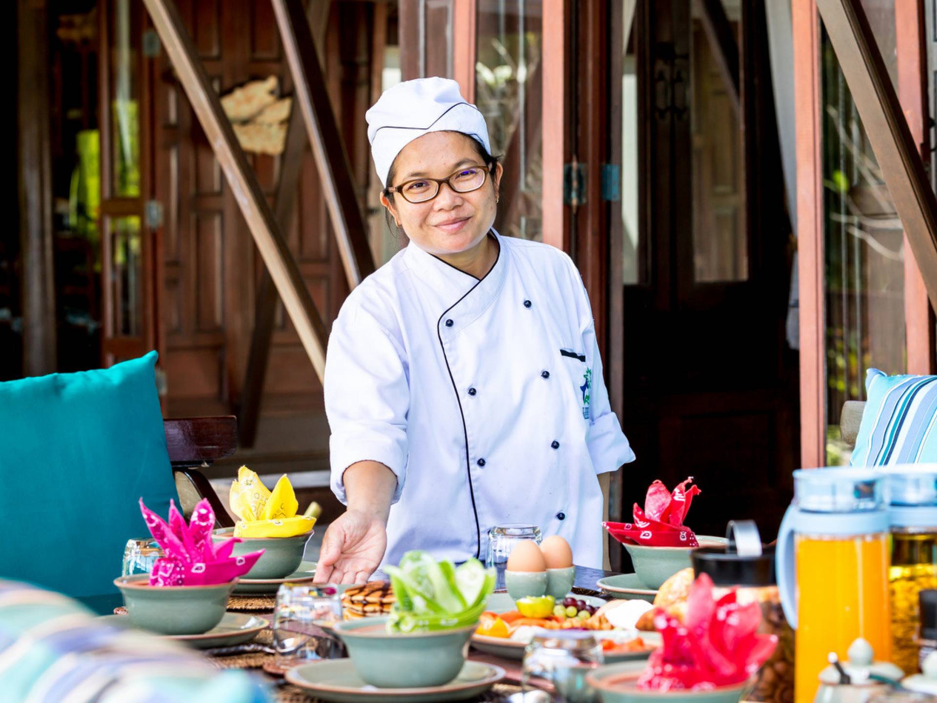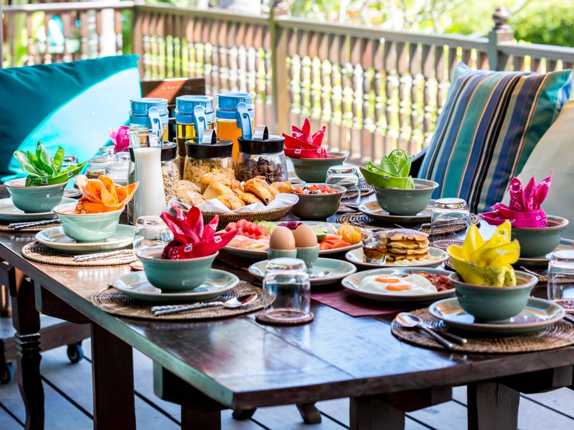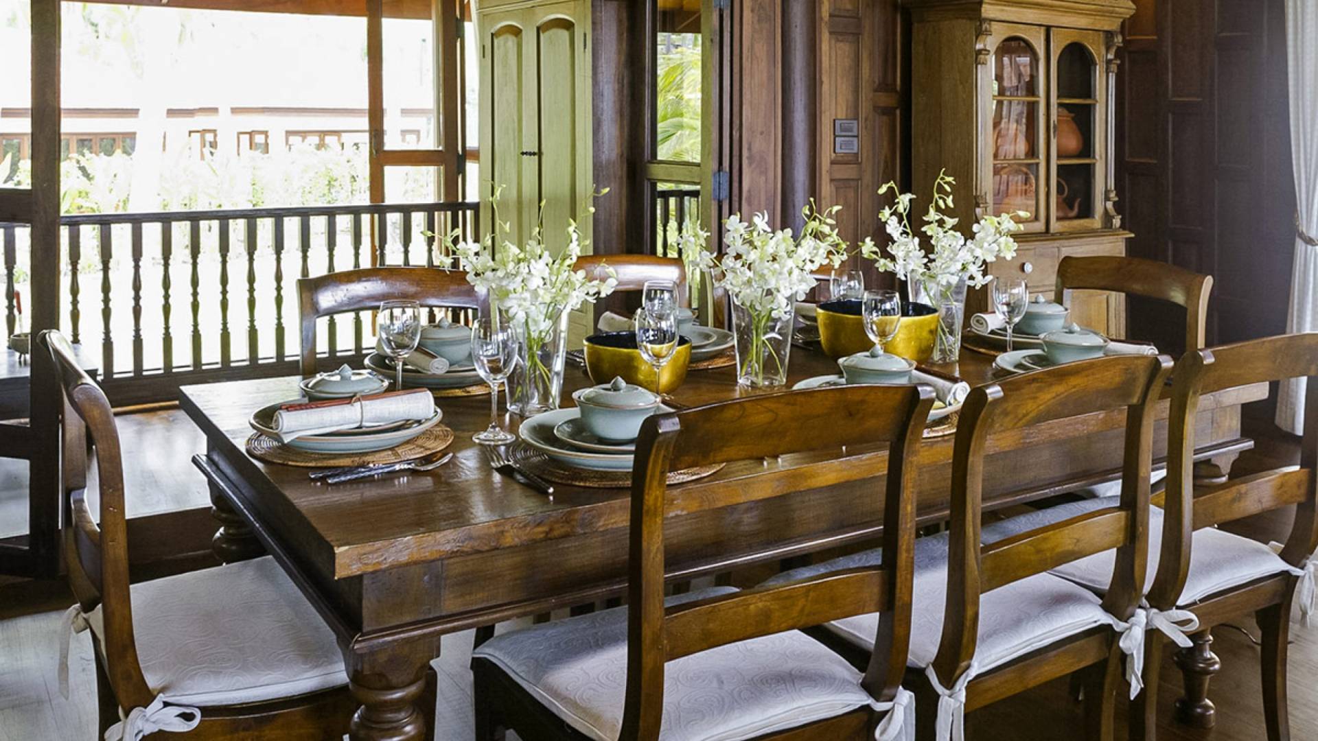 Der Wohnbereich mit offenem Schnitt ist komplett im original thailändischen Stil eingerichtet und verfügt über eine hohe Holzdecke. Es ist elegant mit schönen Wasserhyazinthensofas und einem langen klassischen Esstisch aus massivem Teakholz ausgestattet. Es gibt auch eine voll ausgestattete Küche und einen angrenzenden Fernsehraum, wenn die Gäste sich zurücklehnen und entspannen möchten. Auf der großen Holzterrasse finden Sie einen markanten antiken Esstisch sowie entspannende Sonnenliegen mit Blick auf die tropischen Gärten und das Meer. Wenn es Zeit zum Essen ist, haben die Gäste eine große Auswahl, sei es ein Candle-Light-Dinner im Wohnzimmer oder ein BBQ auf der Terrasse mit Meerblick.