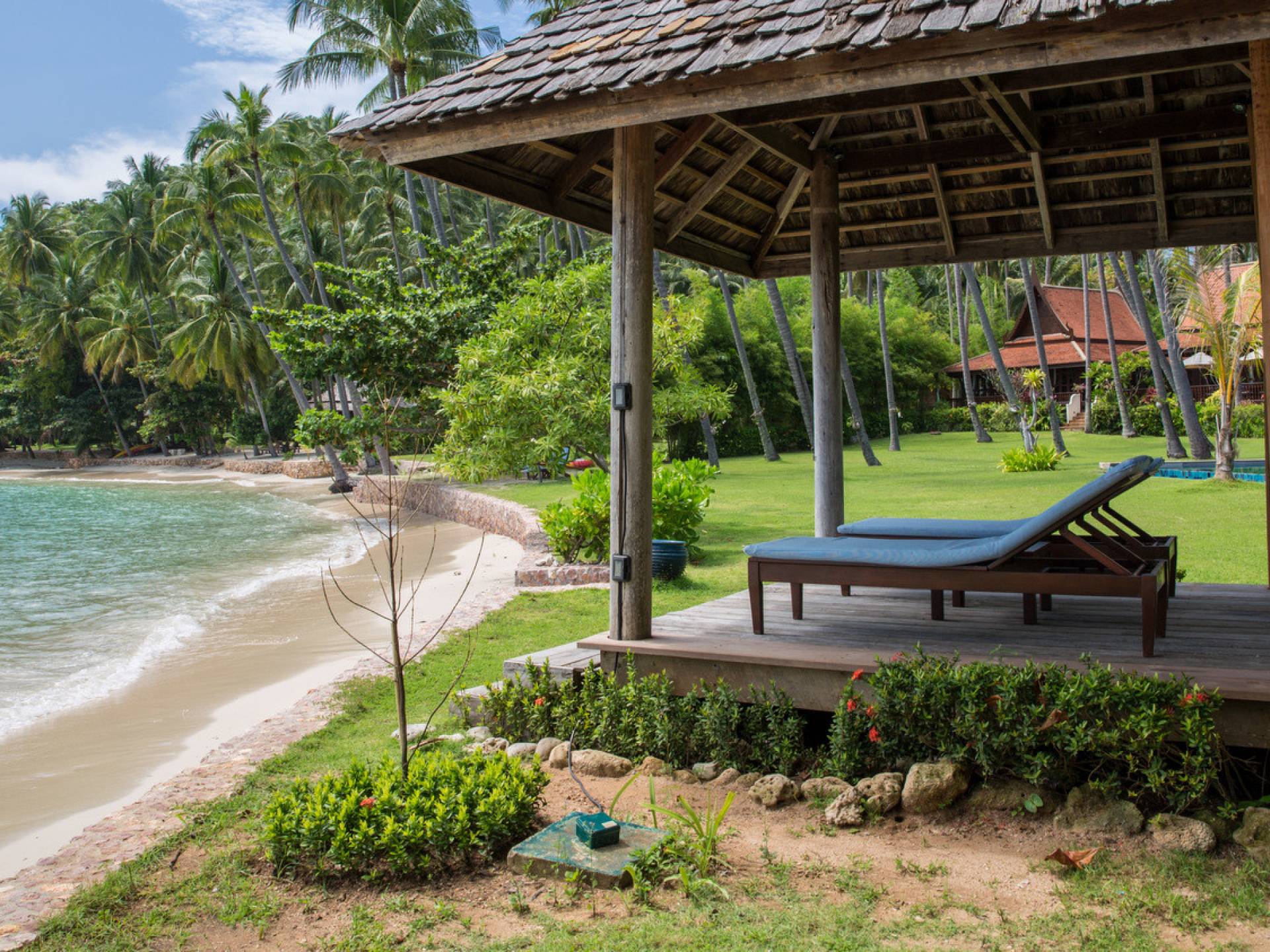 Ban Sairee Samui besteht aus zwei großen, miteinander verbundenen Wohn- und Schlafzimmerpavillons, von denen jeder von der Nähe zum Meer profitiert und von den weiten Terrassen einen atemberaubenden Blick auf die malerischen vorgelagerten Inseln Koh Matsum und Koh Taen bietet. Ein zusätzlicher umgebauter Reisstall dient als privater Gästepavillon. Wenn Sie die schönen Teakholzhäuser betreten, betreten Sie das weitläufige Deck, das sich um die beiden Pavillons schlängelt. Ein Pavillon beherbergt die Hauptschlafräume des Anwesens, während der andere einen geräumigen Wohnbereich sowie zwei Schlafzimmer beherbergt, von denen eines die Master-Suite ist.