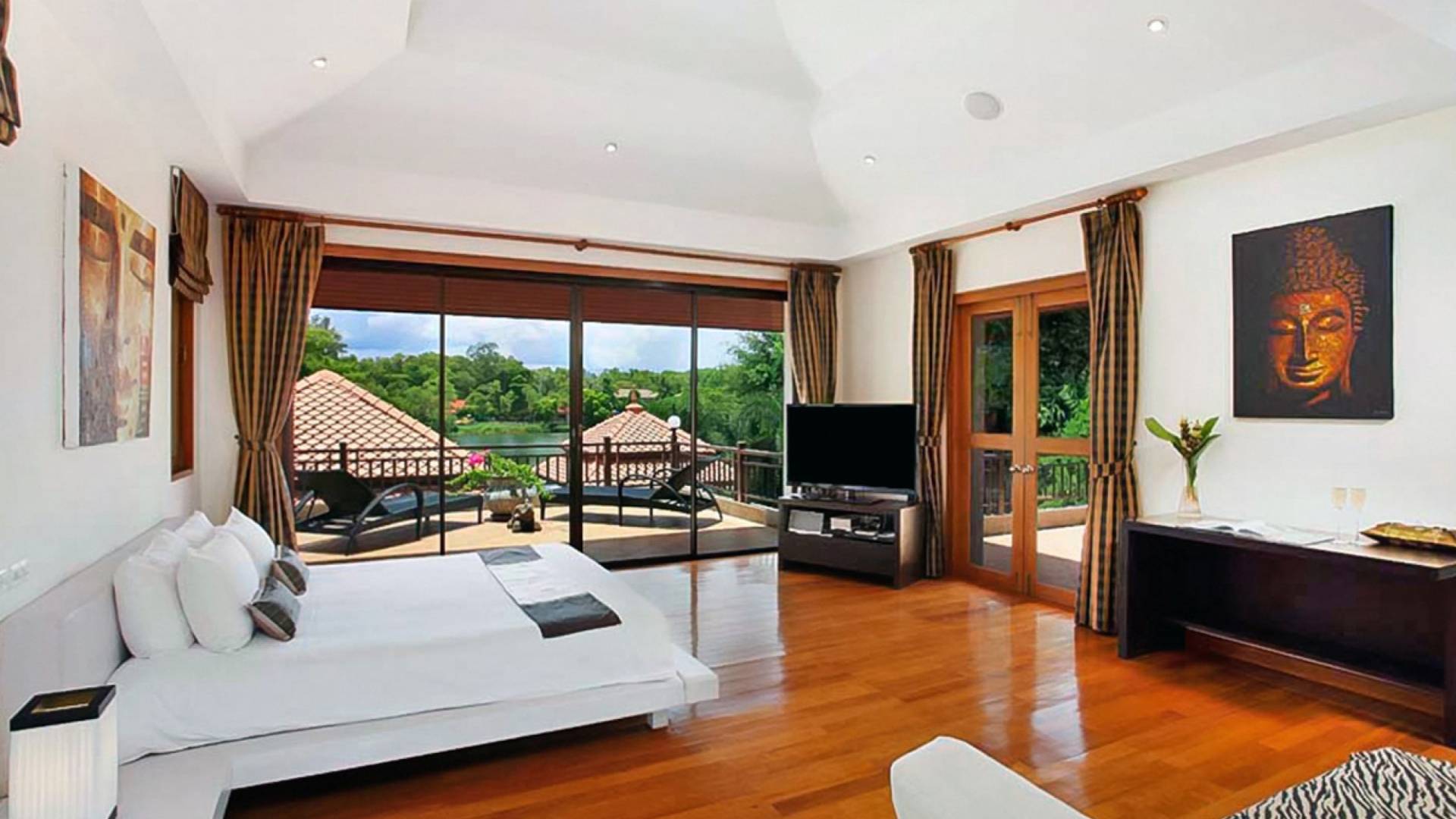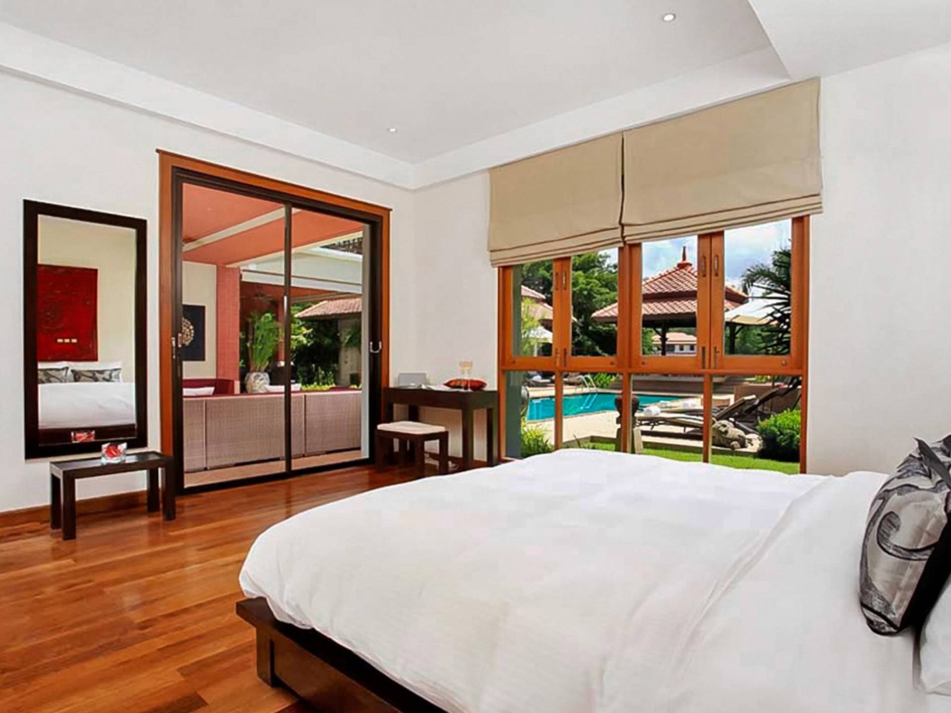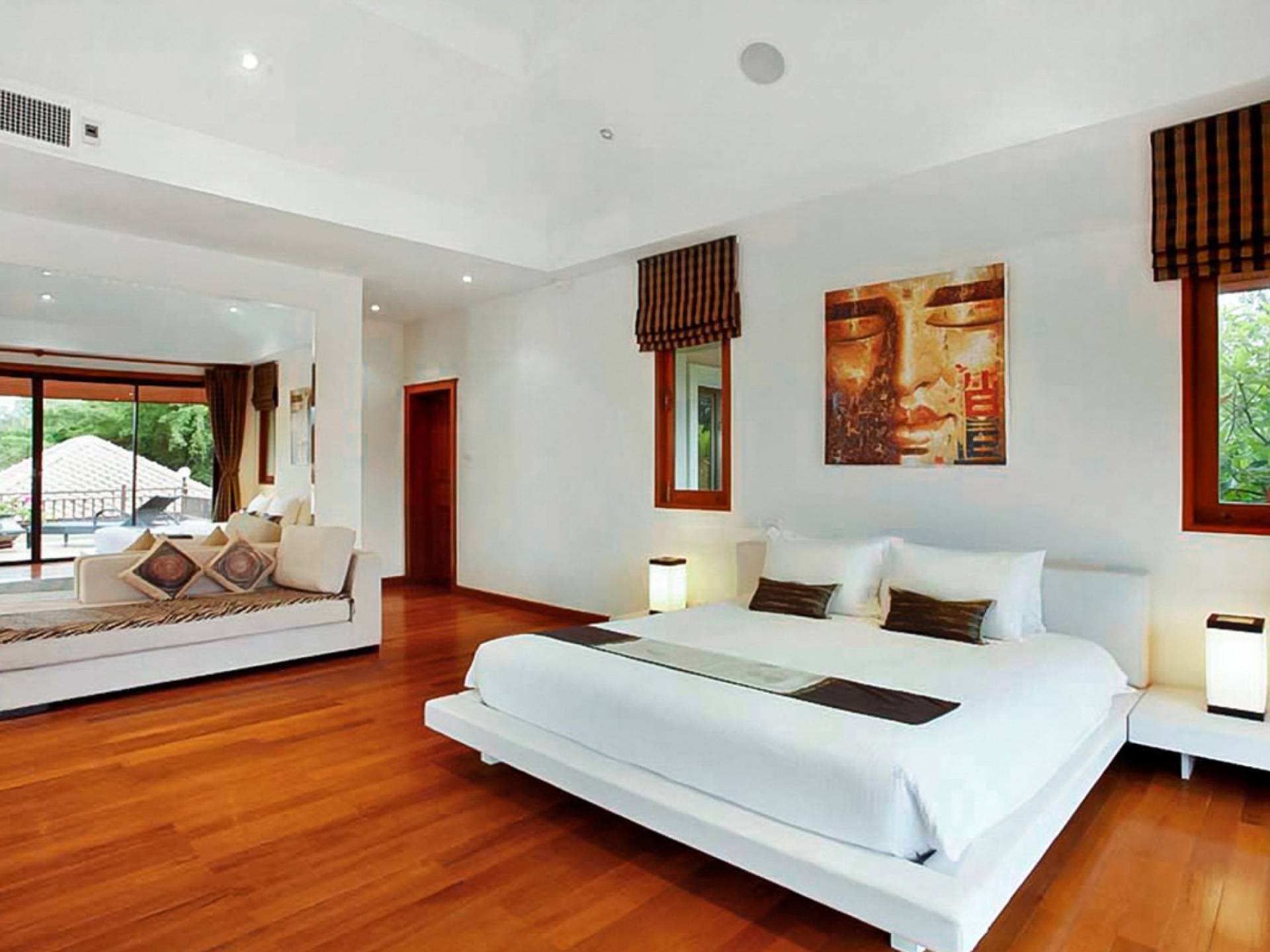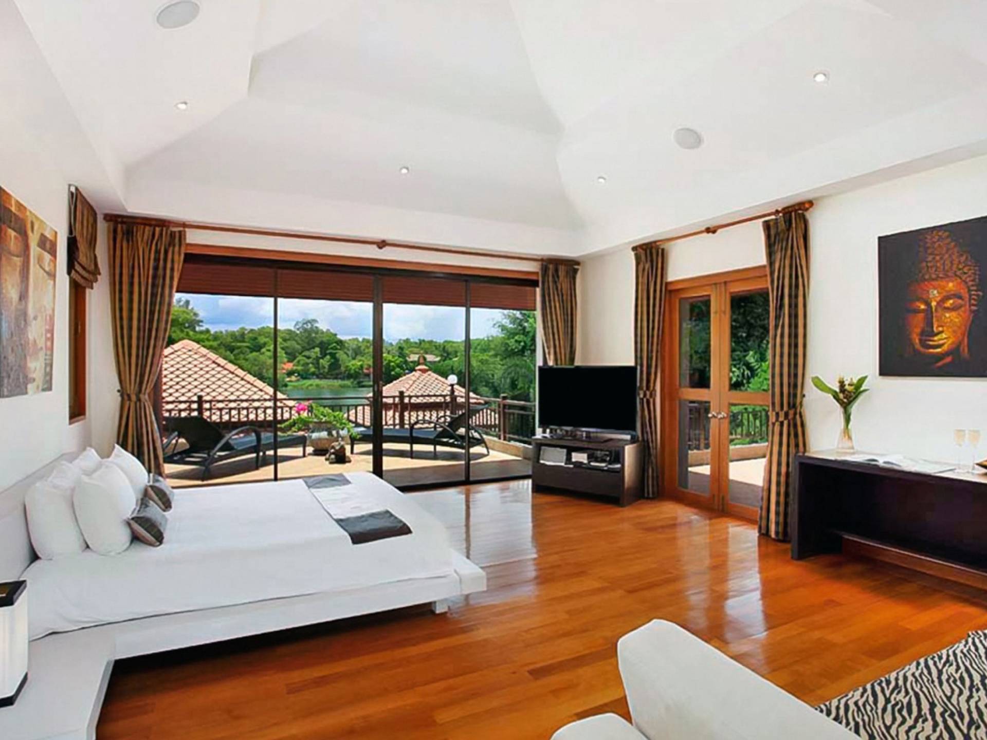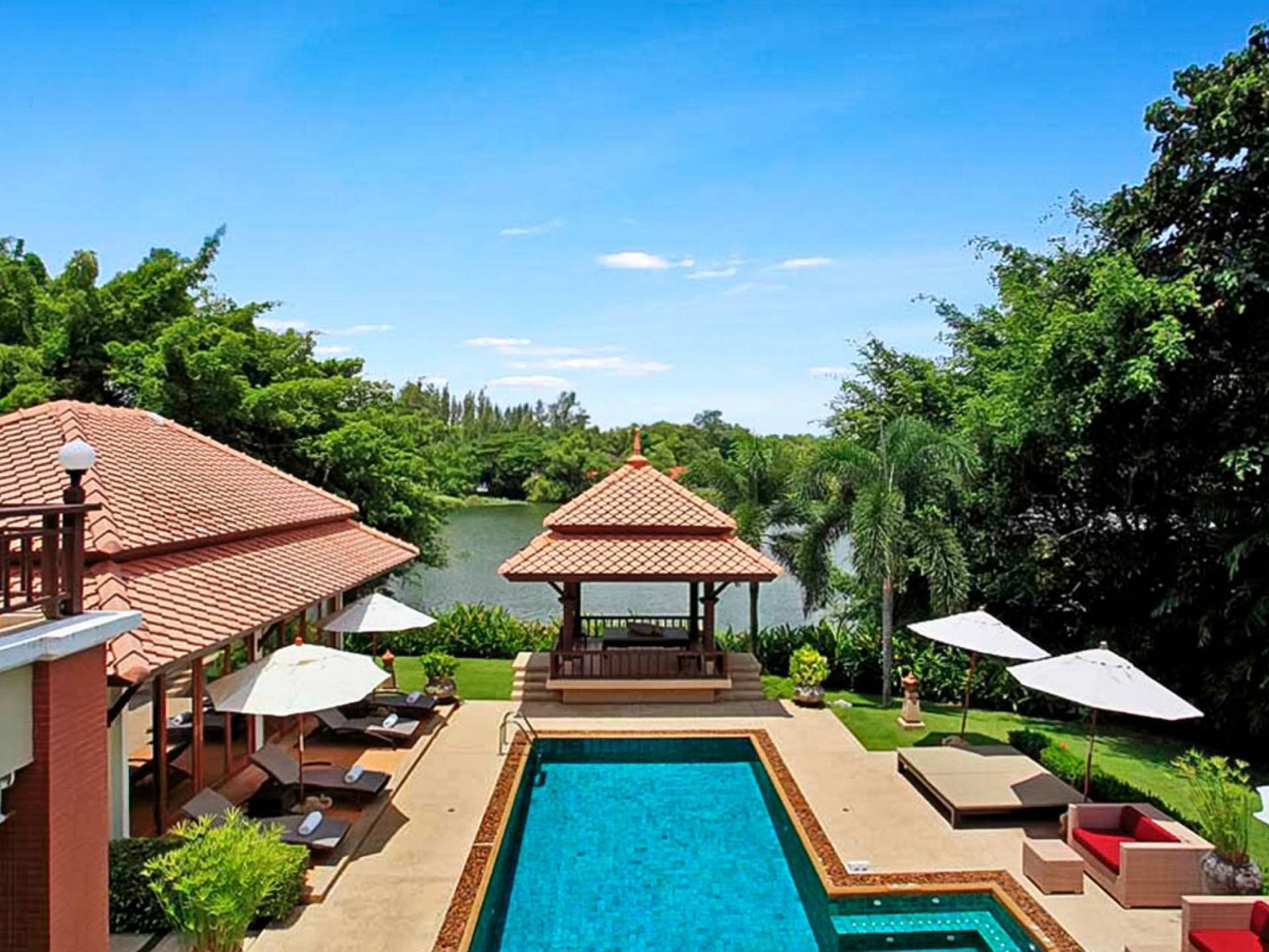 Die Doppelzimmer im Hauptgebäude verfügen alle über Kingsize-Betten, komfortable Möbel und eigene Badezimmer. Das Gästezimmer im Untergeschoss öffnet sich auf die Terrasse am Pool, während die großzügige Master-Suite im Obergeschoss über einen eigenen privaten Balkon verfügt, der mit Sonnenliegen ausgestattet ist und einen entspannenden Blick auf den See bietet. Ein eigenständiger Gästezimmer-Pavillon befindet sich am Pool, ebenfalls mit eigenem Bad und Türen, die sich auf die Sonnenterrasse öffnen. Der geräumige Innenraum verfügt über ein Sofa und einen Couchtisch zur Entspannung tagsüber. Die Hinzufügung von Flachbildfernsehern, einer Badewanne im Hauptbadezimmer und beruhigenden asiatischen Kunstwerken an den Wänden in den Schlafzimmern sorgen für ein ansprechendes Gefühl von privatem Luxus. Aktivere oder gemeinschaftliche Aktivitäten sind dank des zusätzlichen Spielzimmers und Fitnessraums im Obergeschoss mit Billardtisch, Gewichten und Fitnessgeräten gleichermaßen gut möglich.