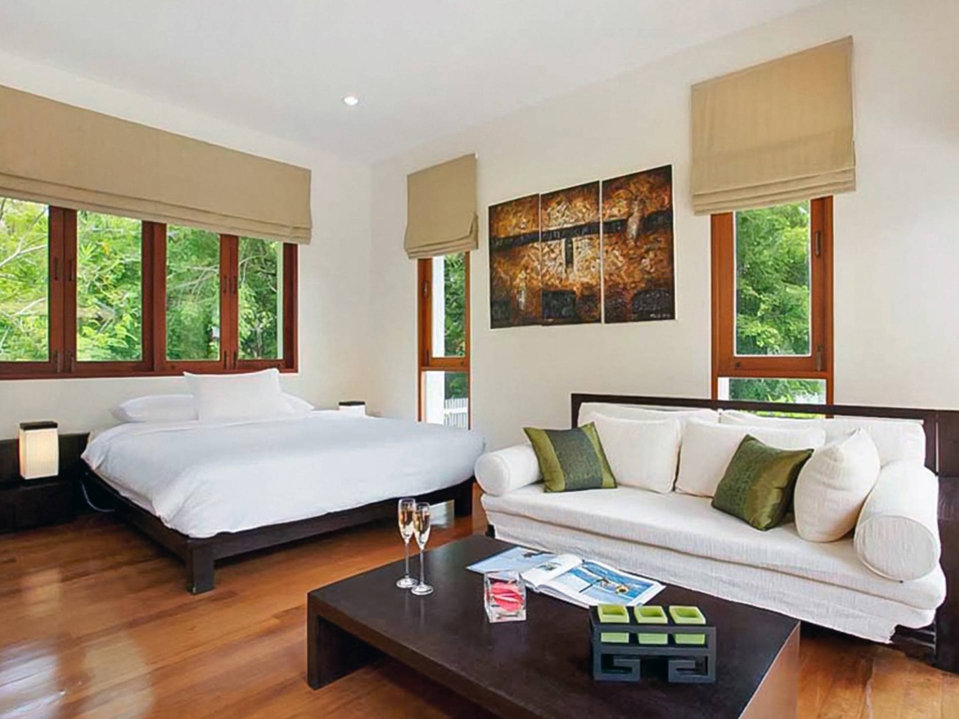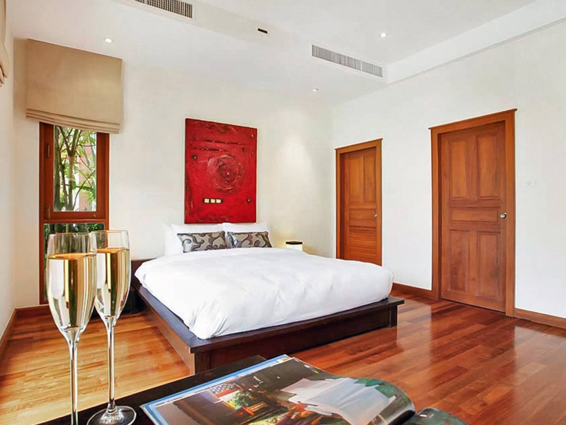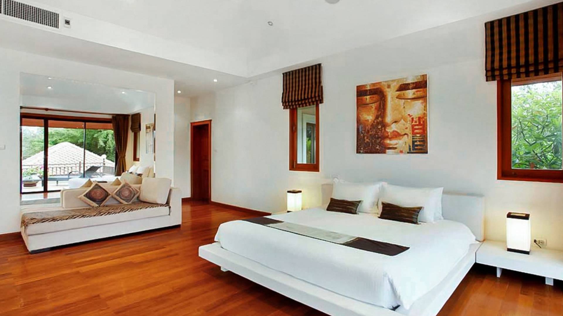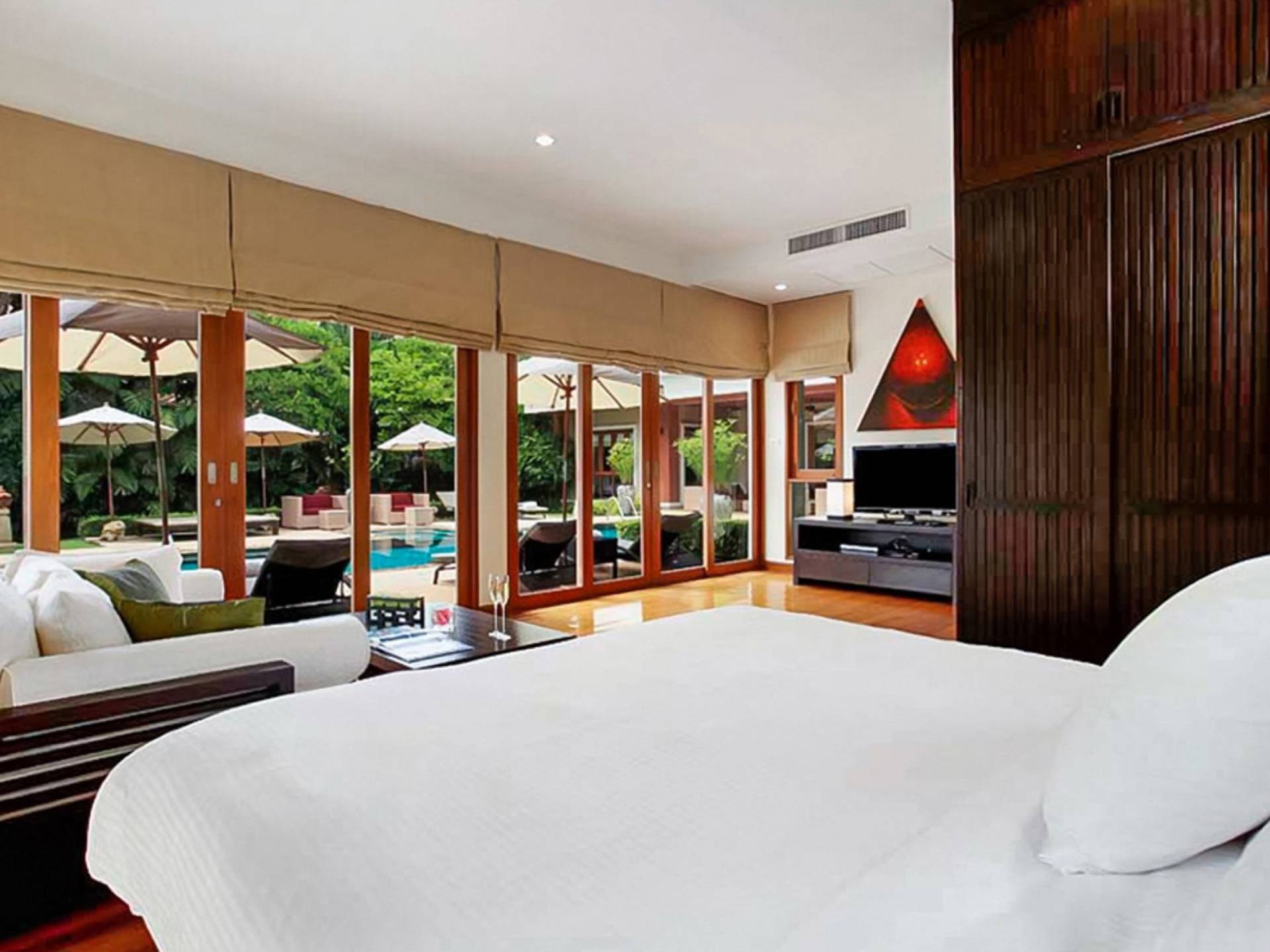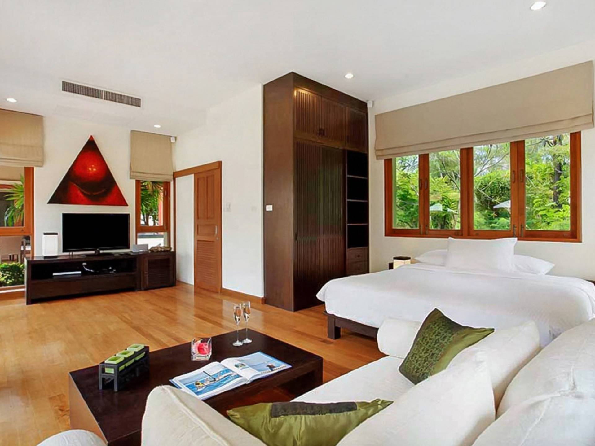 Die Doppelzimmer im Hauptgebäude verfügen alle über Kingsize-Betten, komfortable Möbel und eigene Badezimmer. Das Gästezimmer im Untergeschoss öffnet sich auf die Terrasse am Pool, während die großzügige Master-Suite im Obergeschoss über einen eigenen privaten Balkon verfügt, der mit Sonnenliegen ausgestattet ist und einen entspannenden Blick auf den See bietet. Ein eigenständiger Gästezimmer-Pavillon befindet sich am Pool, ebenfalls mit eigenem Bad und Türen, die sich auf die Sonnenterrasse öffnen. Der geräumige Innenraum verfügt über ein Sofa und einen Couchtisch zur Entspannung tagsüber. Die Hinzufügung von Flachbildfernsehern, einer Badewanne im Hauptbadezimmer und beruhigenden asiatischen Kunstwerken an den Wänden in den Schlafzimmern sorgen für ein ansprechendes Gefühl von privatem Luxus. Aktivere oder gemeinschaftliche Aktivitäten sind dank des zusätzlichen Spielzimmers und Fitnessraums im Obergeschoss mit Billardtisch, Gewichten und Fitnessgeräten gleichermaßen gut möglich.