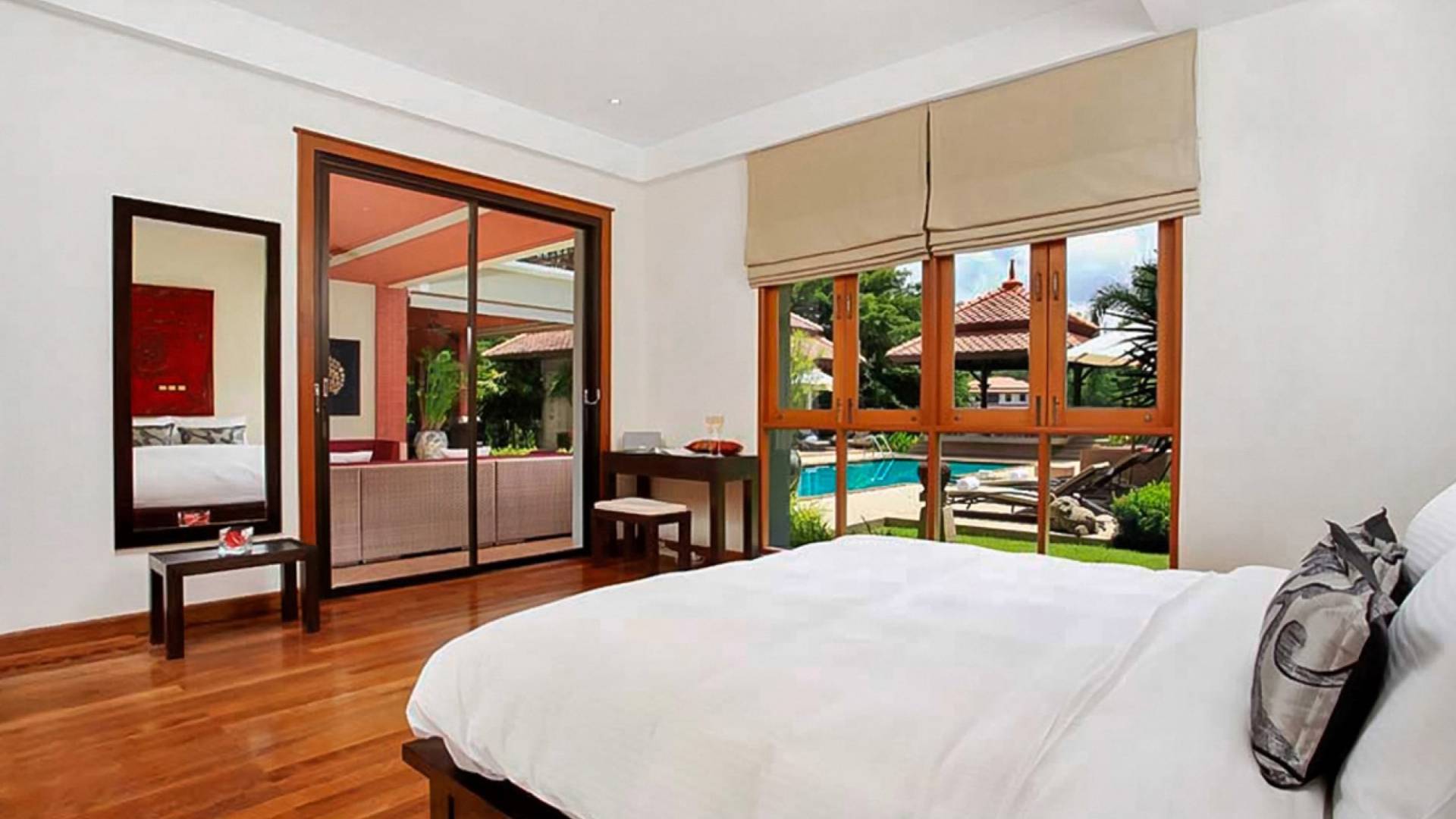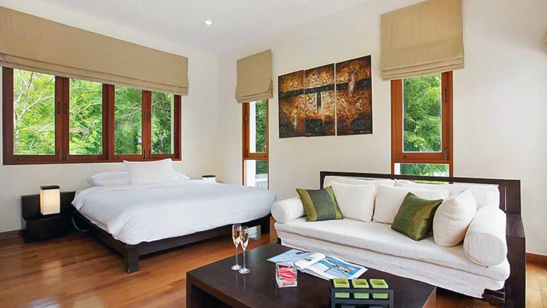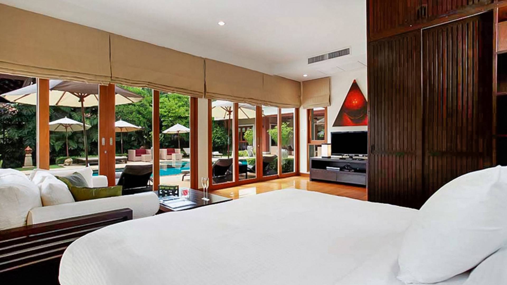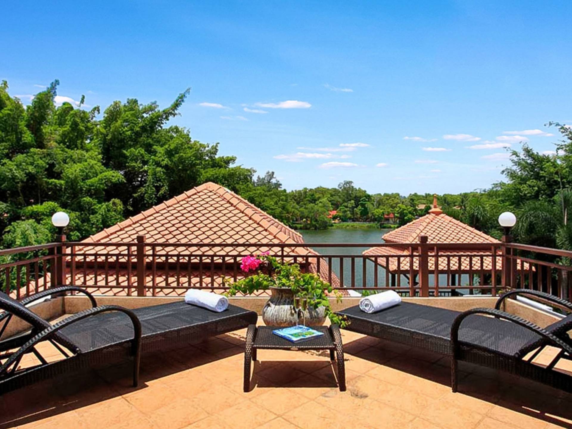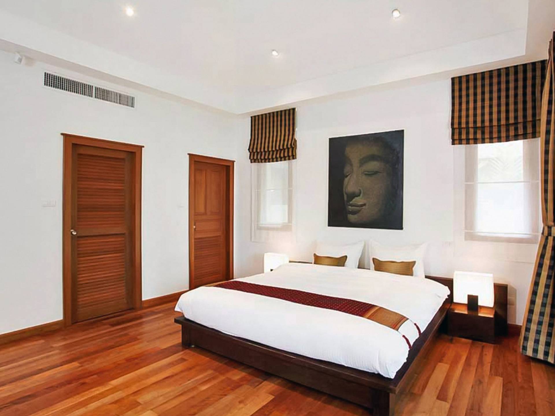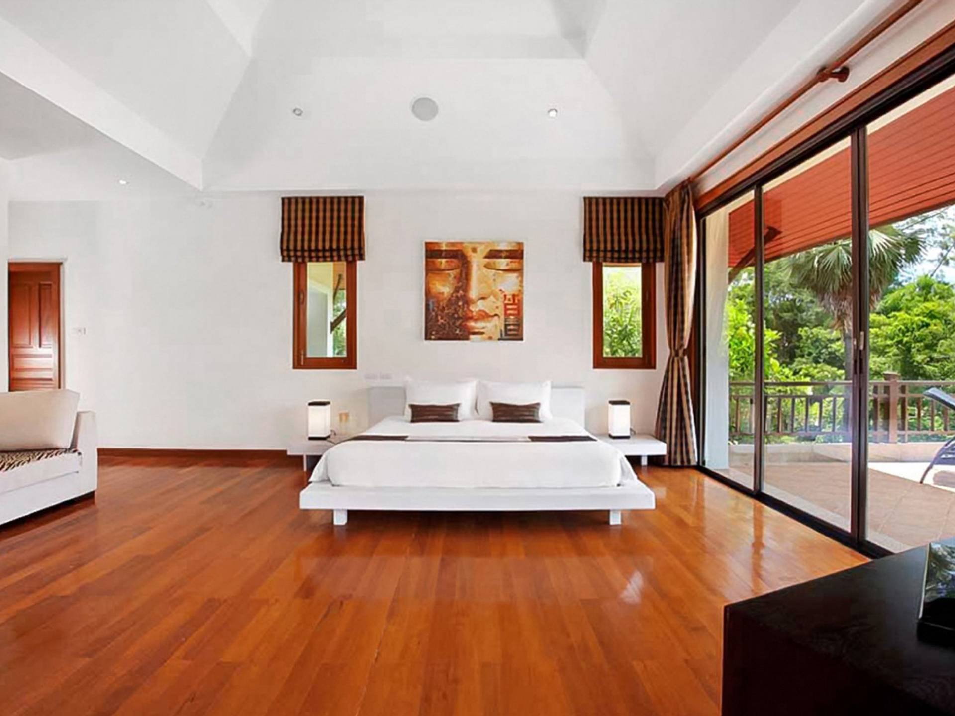 Die Doppelzimmer im Hauptgebäude verfügen alle über Kingsize-Betten, komfortable Möbel und eigene Badezimmer. Das Gästezimmer im Untergeschoss öffnet sich auf die Terrasse am Pool, während die großzügige Master-Suite im Obergeschoss über einen eigenen privaten Balkon verfügt, der mit Sonnenliegen ausgestattet ist und einen entspannenden Blick auf den See bietet. Ein eigenständiger Gästezimmer-Pavillon befindet sich am Pool, ebenfalls mit eigenem Bad und Türen, die sich auf die Sonnenterrasse öffnen. Der geräumige Innenraum verfügt über ein Sofa und einen Couchtisch zur Entspannung tagsüber. Die Hinzufügung von Flachbildfernsehern, einer Badewanne im Hauptbadezimmer und beruhigenden asiatischen Kunstwerken an den Wänden in den Schlafzimmern sorgen für ein ansprechendes Gefühl von privatem Luxus. Aktivere oder gemeinschaftliche Aktivitäten sind dank des zusätzlichen Spielzimmers und Fitnessraums im Obergeschoss mit Billardtisch, Gewichten und Fitnessgeräten gleichermaßen gut möglich.